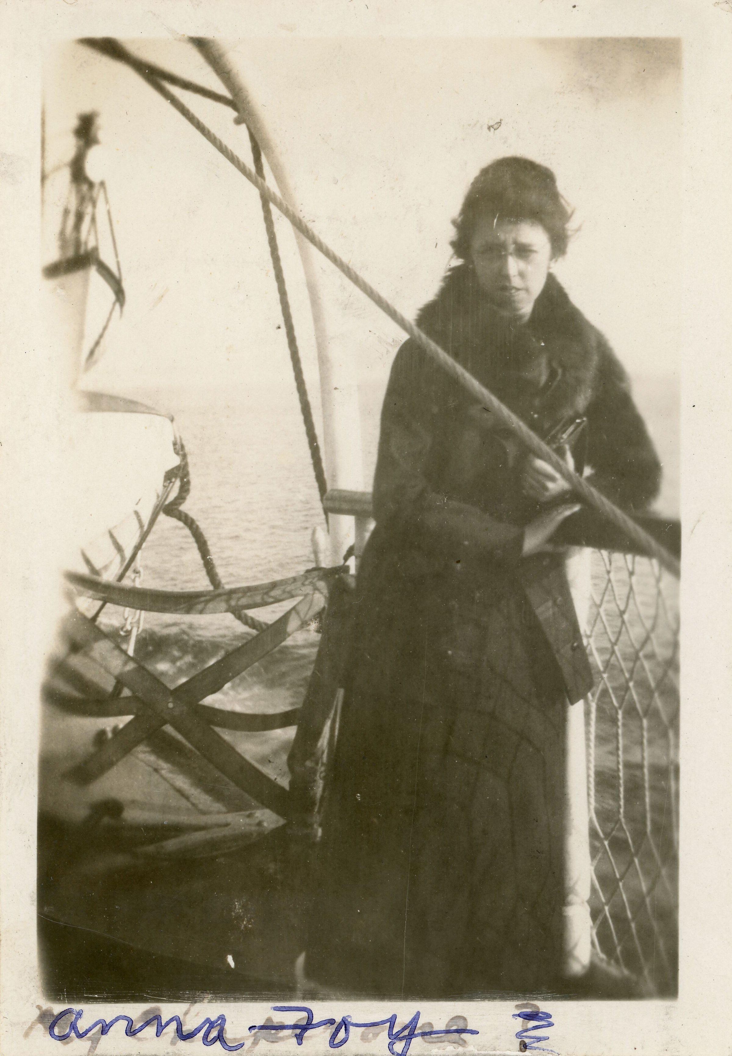 Anna Foy on a boat traveling to Victoria, B.C. Black and white photographic print with a 1/4" white border. Image of a middle-aged woman wearing a long dark dress and a woolen winter coat with a fur collar, glasses and a hat. She is holding a clutch purse and leaning on a boat railing. The ocean can be seen in the background. On the bottom edge is written "Anna Foy" in blue ink covering the original inscription "My Chaperone?"