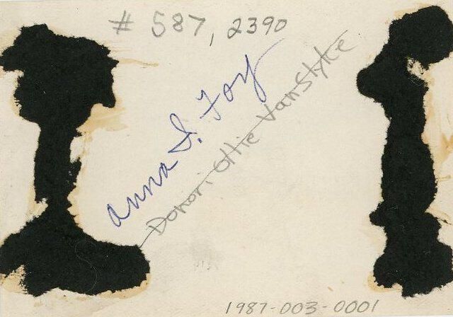 The reverse side has remnants of black paper and adhesive suggesting it came from a photo album. Written at the top in pencil is "#587, 2390" which refers to museum negative numbers. Diagonally across the center in blue pen is "Anna I. Foy" and below this crossed out in pencil, "Donor: Ollie Van Slyke."