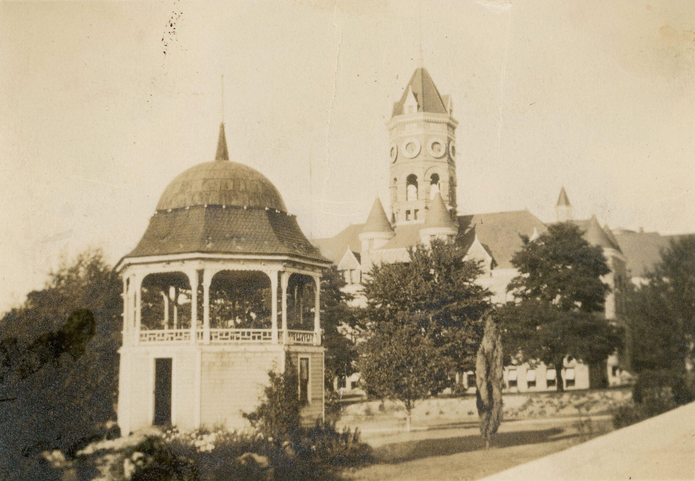 Photograph of the bandstand in Sylvester Park and the Old Capitol building in the background. Black and white 2" x 3" photographic print is brown-toned. The two-story domed bandstand is prominent with a manicured lawn and pathway. A few trees are visible in the park.