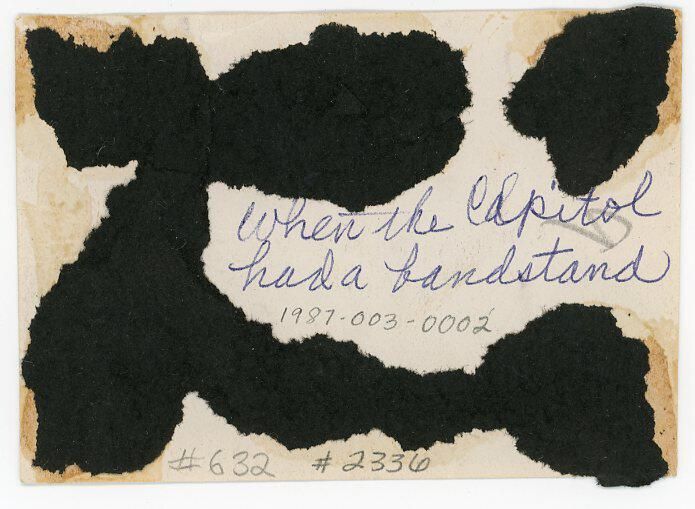 The back of this photograph has remnants of black paper and adhesive residue indicating that it was likely removed from a photograph album. Written in blue pen: "When the Capitol had a bandstand" and in pencil: "#632" and "#2336".Made/Created