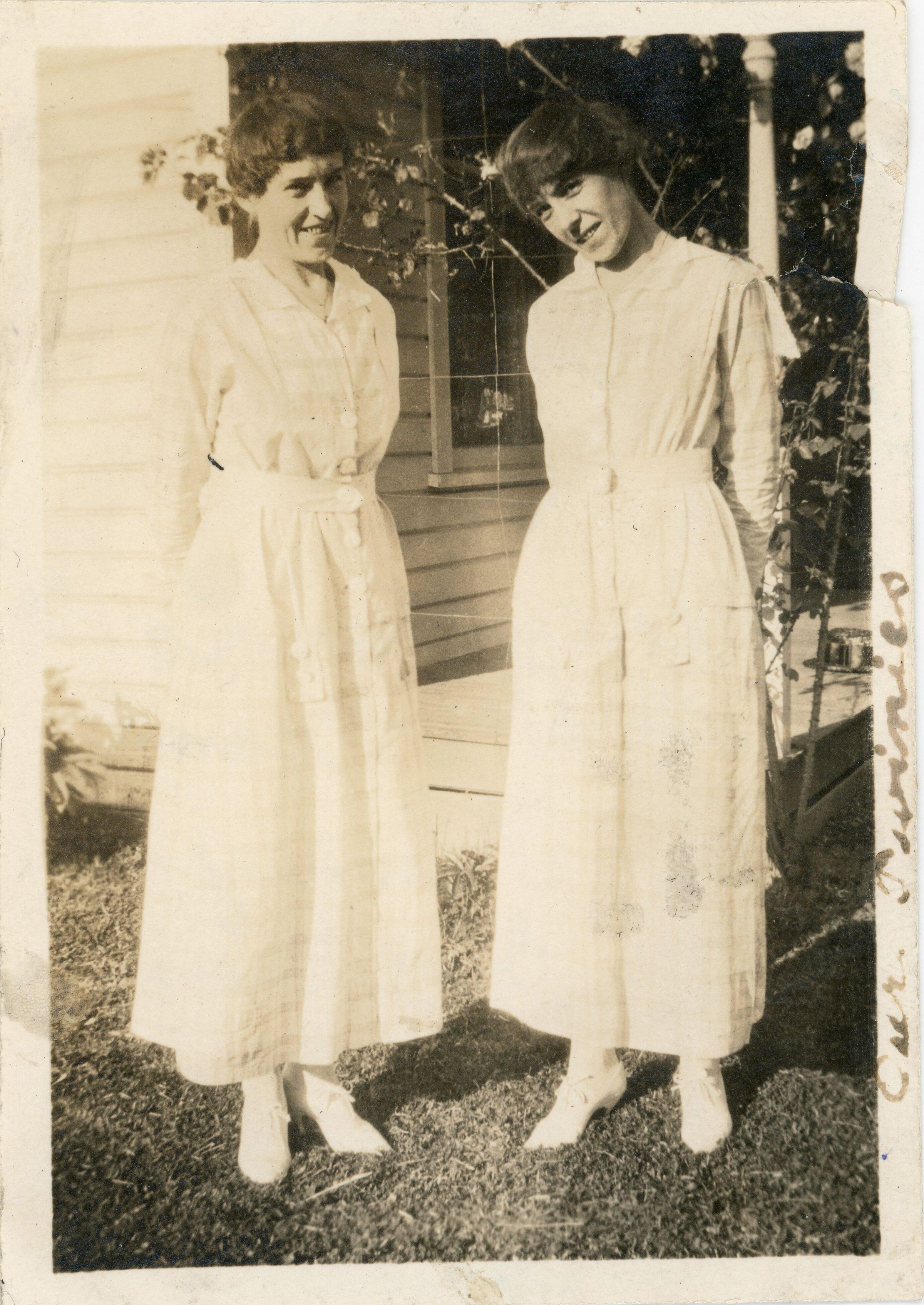 Irene and Eveline Kenney. Black and white brown-toned 2" x 3" photograph of the Kenney twins. They are wearning matching light-colored lightweight dresses and shoes. They both have the same short haircut and have their hands behind their back. The front porch of a house is visible in the background. There appears to be a hat laying on the porch. On the right edge of the image is written, "Our Twinnies."