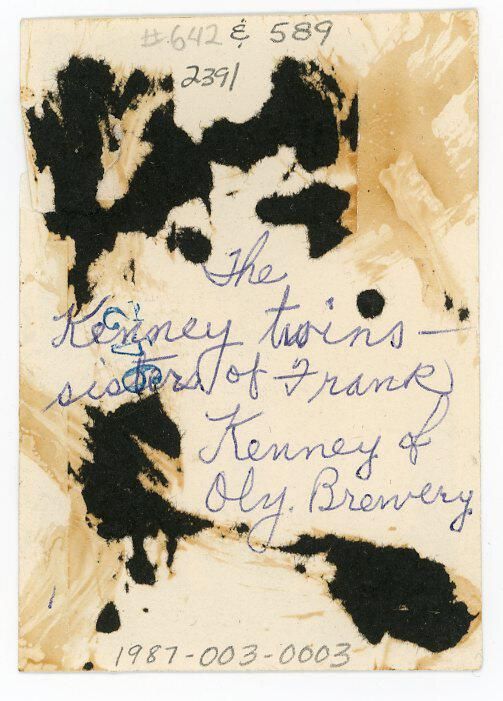On the back of the photo are remnants of adhesive and black paper suggesting that it was removed from an album. At the top is written: "#642 & 589 2391" in pencil and black pen. At center in blue: "The Kenney twins -- sisters of Frank Kenney of Oly. Brewery." A blue stamped number: "942" is visible underneath the writing.