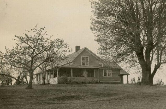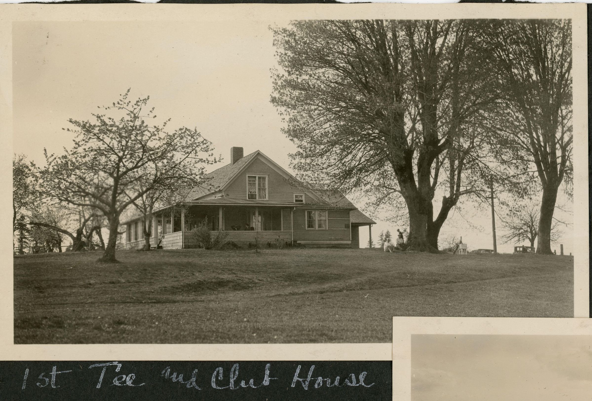 First tee and Clubhouse at Mountain View Golf and Country Club. Black and white photographic print is adhered to a black album page with 1987-003-0007 through -0009 on one side and 1987-003-0004 and -0005 on the other. The print, located at the top left is partially separated from the page. There is an unprinted border all the way around. The clubhouse view is from the side and giant cherry trees loom over it on both side. There are two men under the largest tree at right and two women are strolling behind them. The wraparound porch of the clubhouse features people sitting in chairs.