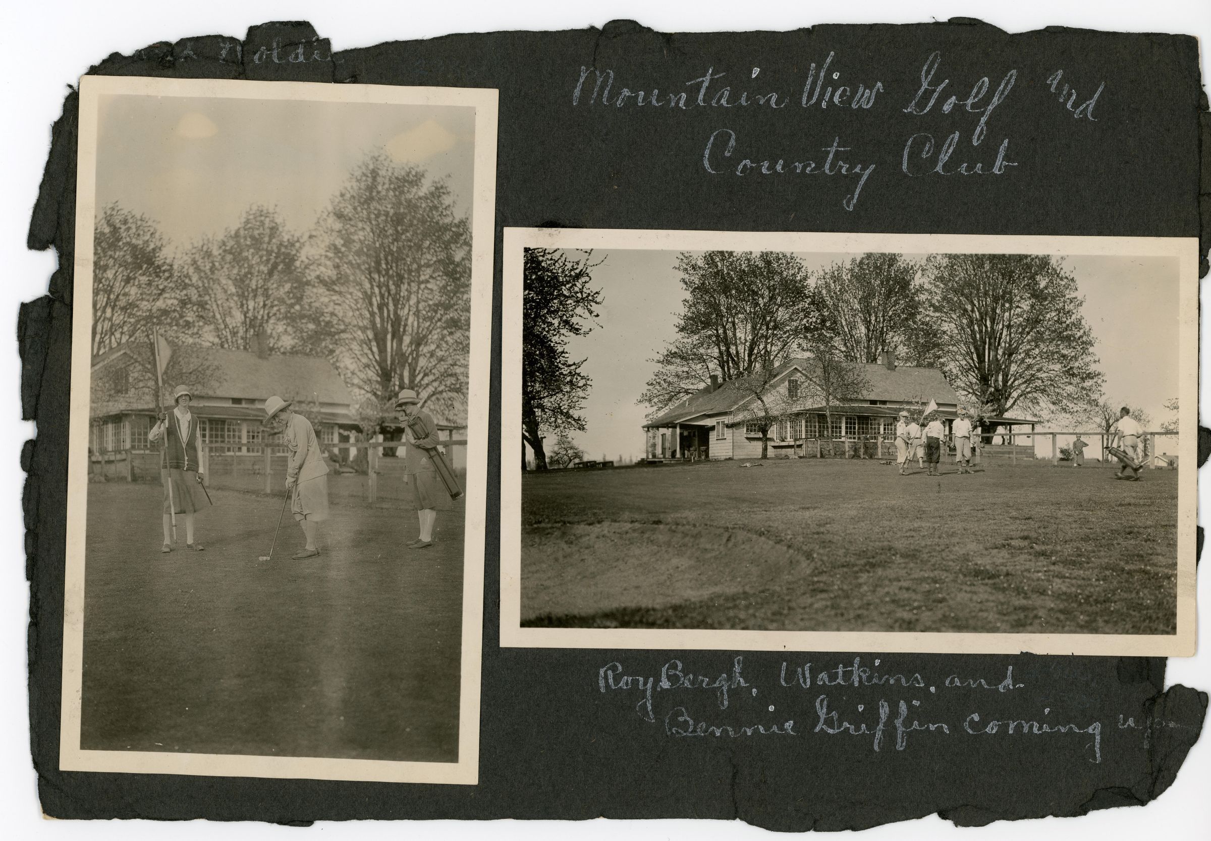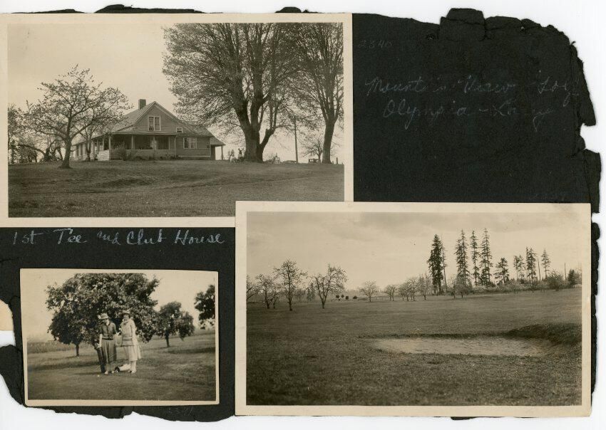 On the album page: "Mountain View Golf Olympia - Lacey." An inscription below the print reads: "1st Tee and Club House."Made/Created