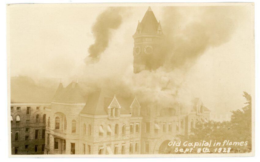 The old Capitol Building on fire on September 8, 1928. Warm-toned black and white postcard features a photographic print on the front of smoke engulfing the building. In the lower right in white: "Old Capitol in flames, September 8, 1928."