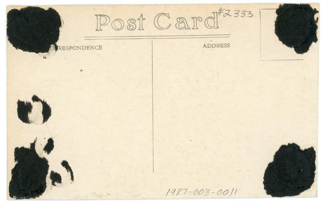 On the back of the postcard there are remnants of black paper and adhesive revenue, suggesting this image came from an album. At top right in pencil: "#2333" and printed "Post Card" with "Correspondence" on the left and "Address" on the right with a line separating the two down the middle.Made/Created