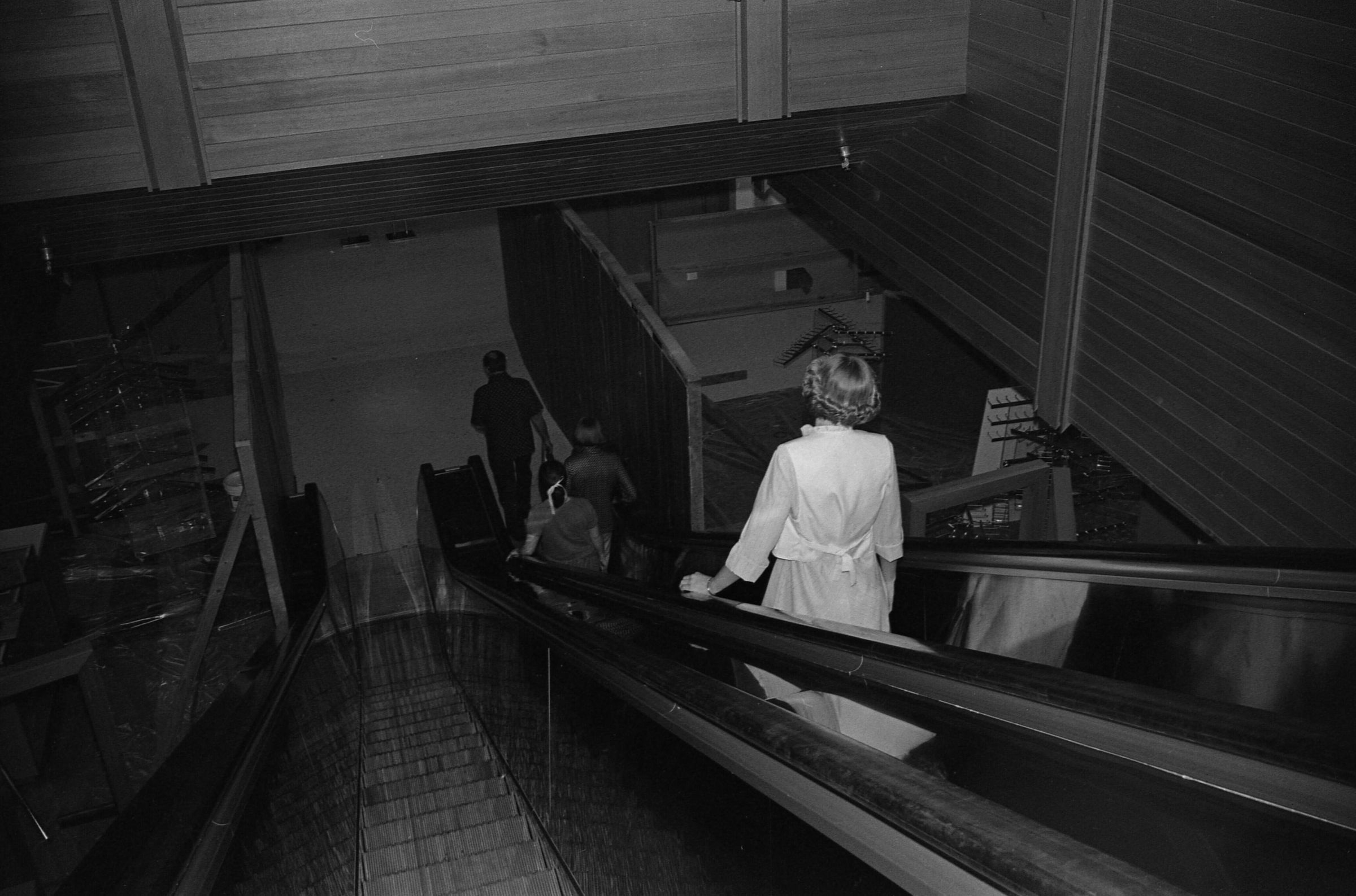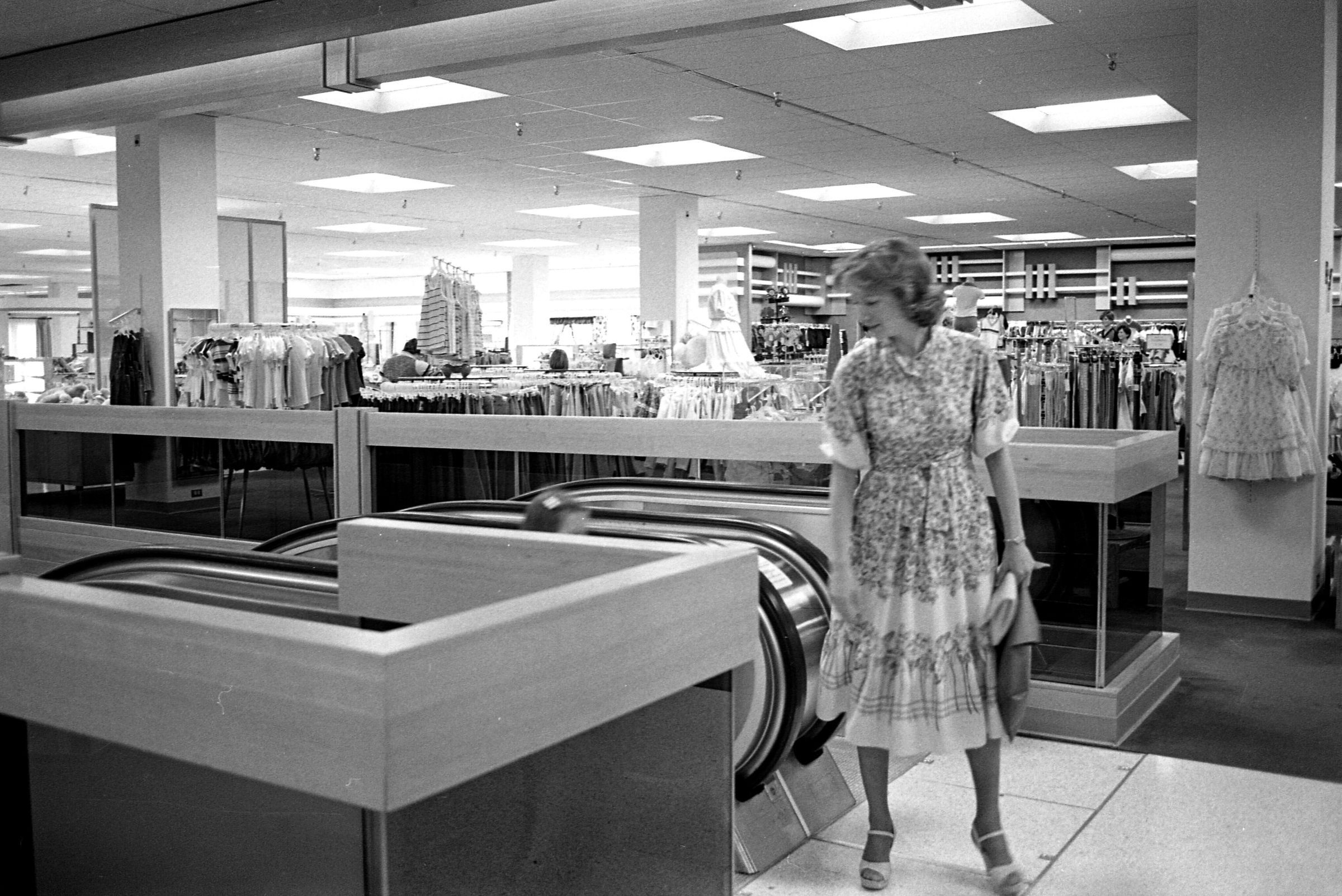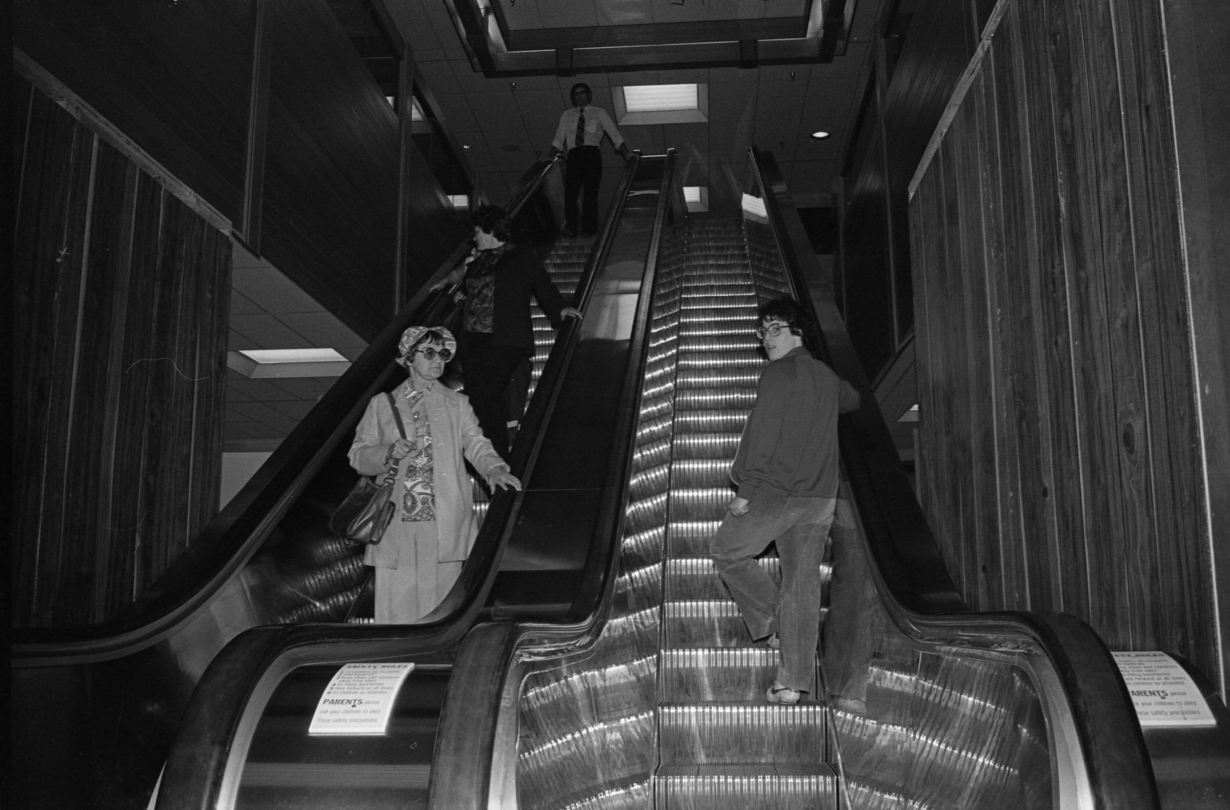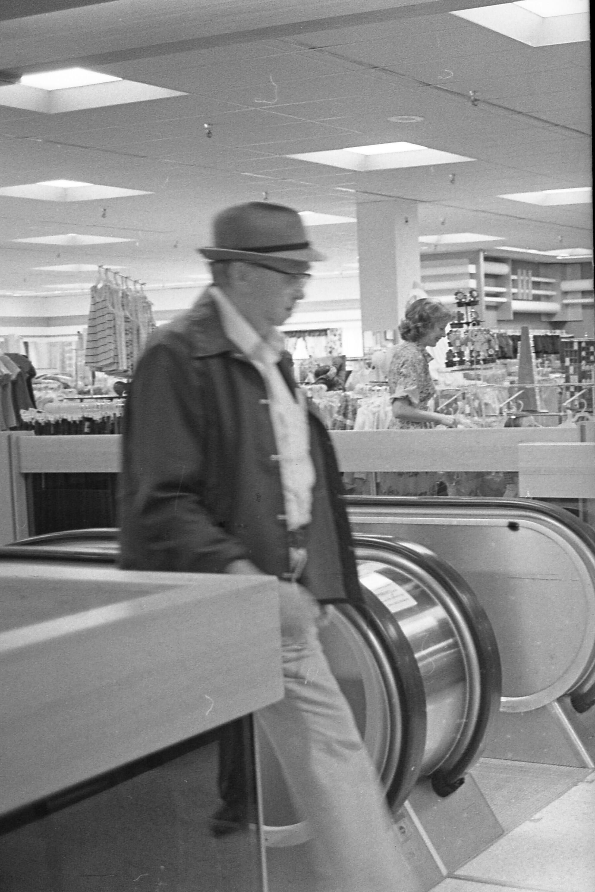 B: Three additional photos showing the interior of an unknown clothing store (possibly Peoples?), two showing an interior escalator and one (plus a partial negative) showing shoppers arriving at the top of the escalator near the clothing store.Made/Created