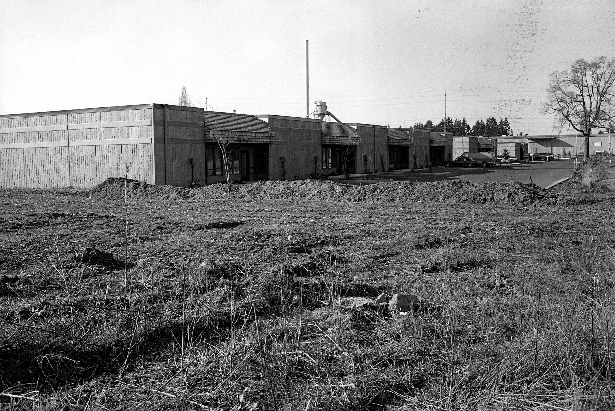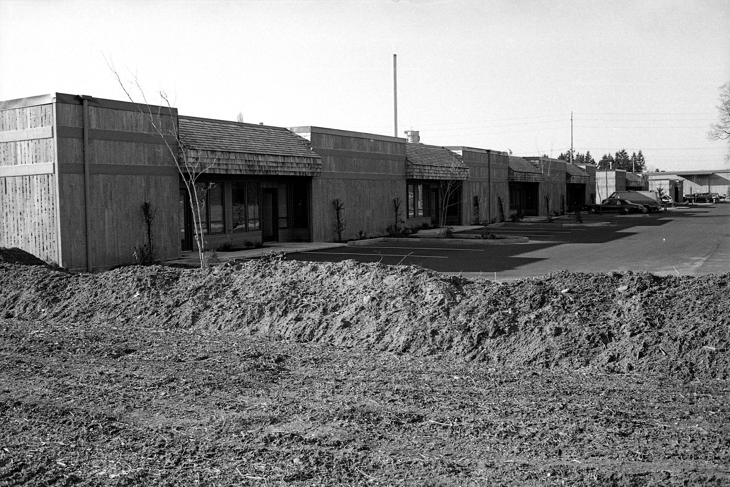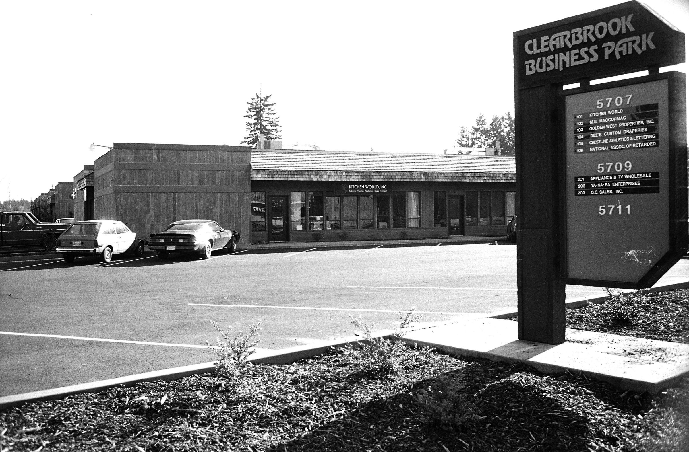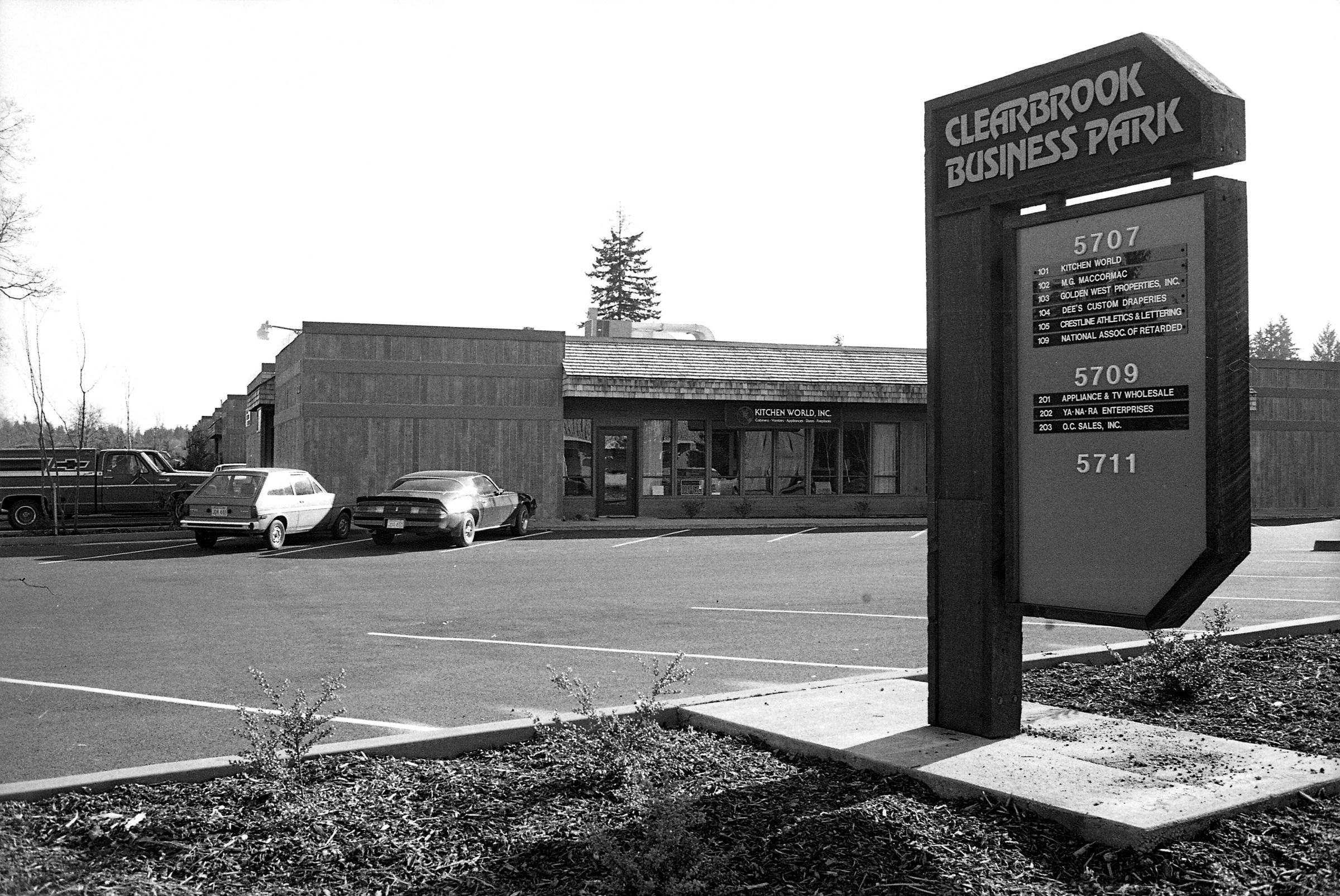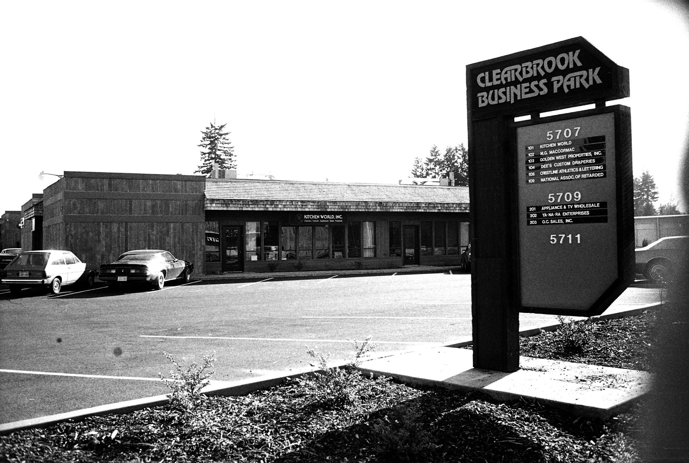A: Five photographs of the outside of the Clearbrook Business Park, three showing a sign indicating the businesses housed by the Park and two the length of the building and a service station in the background.
