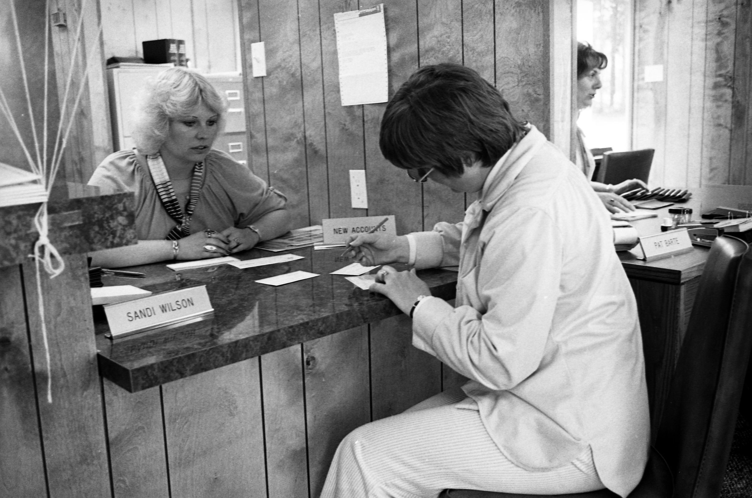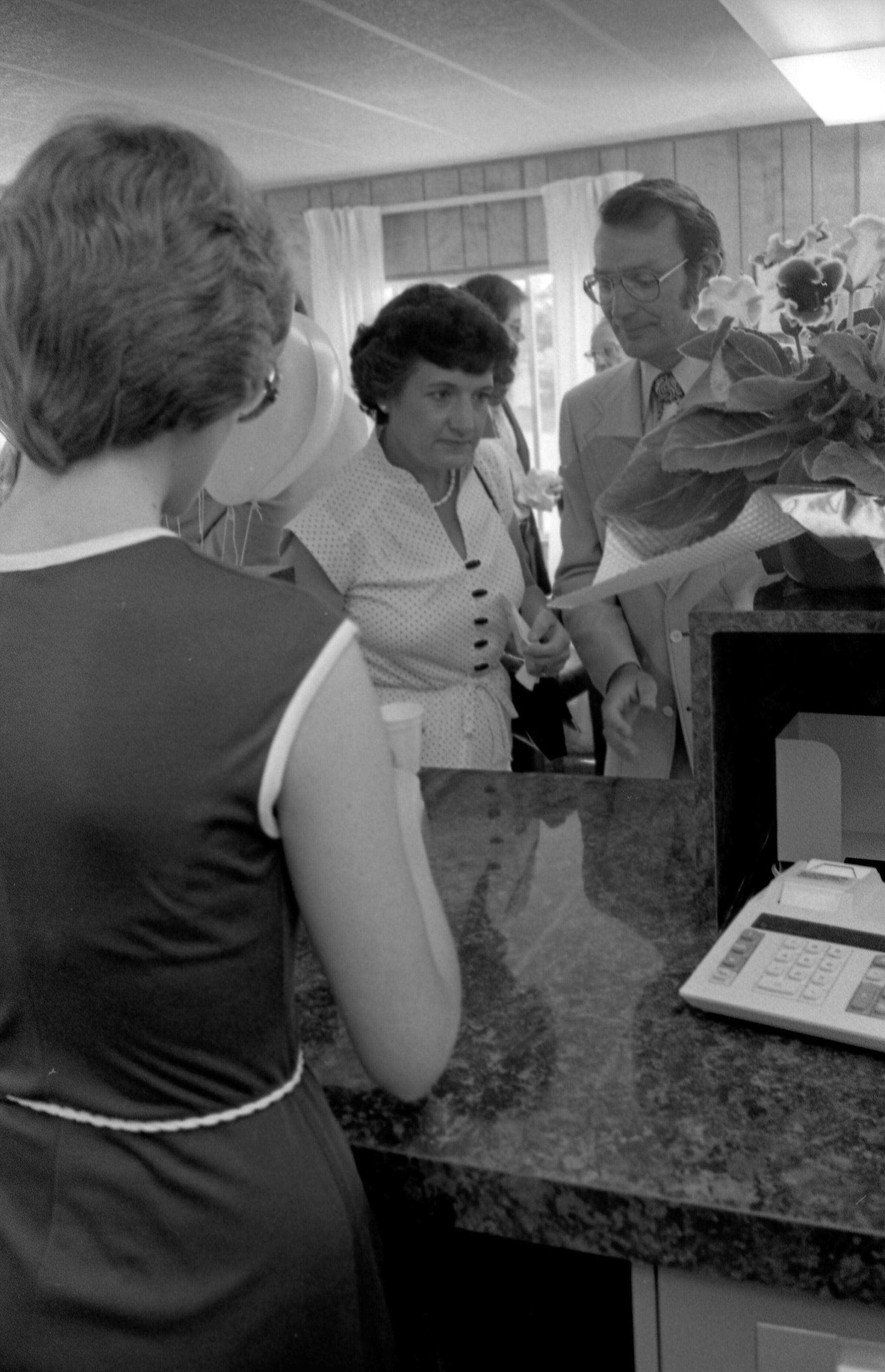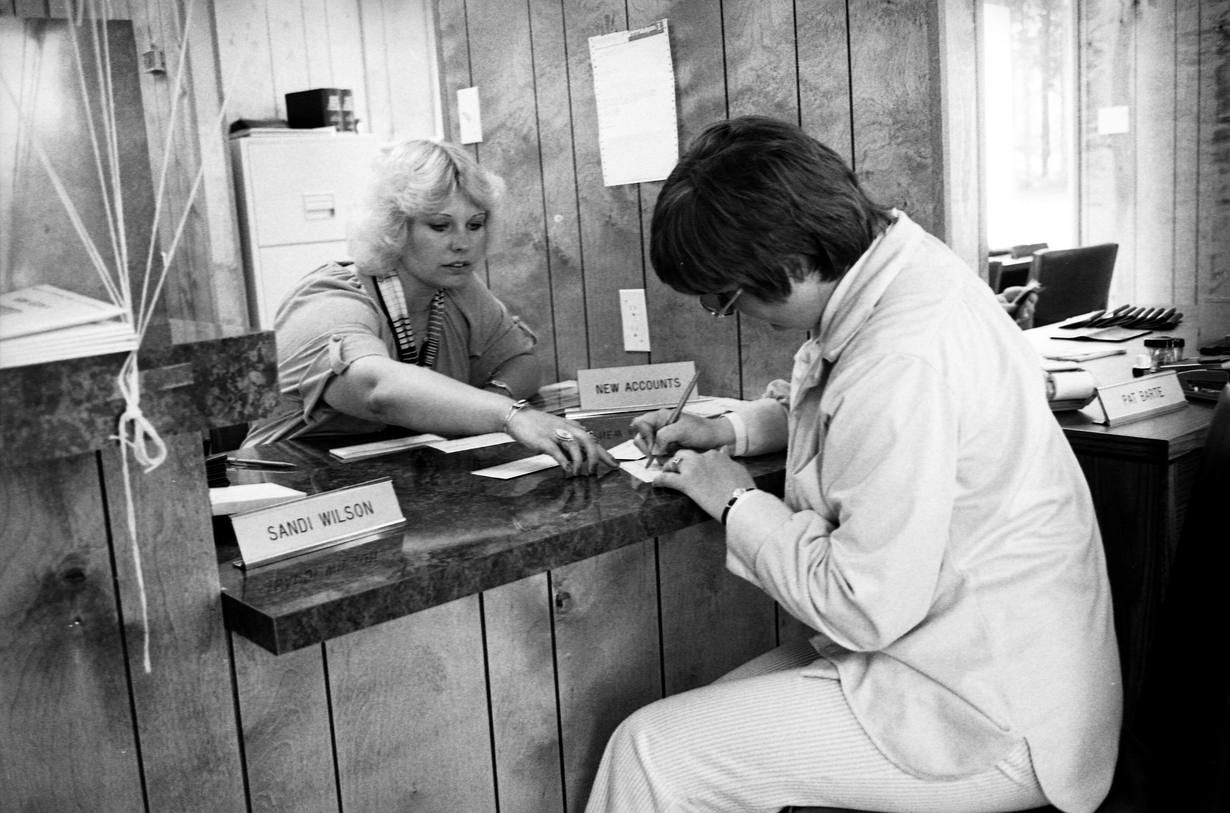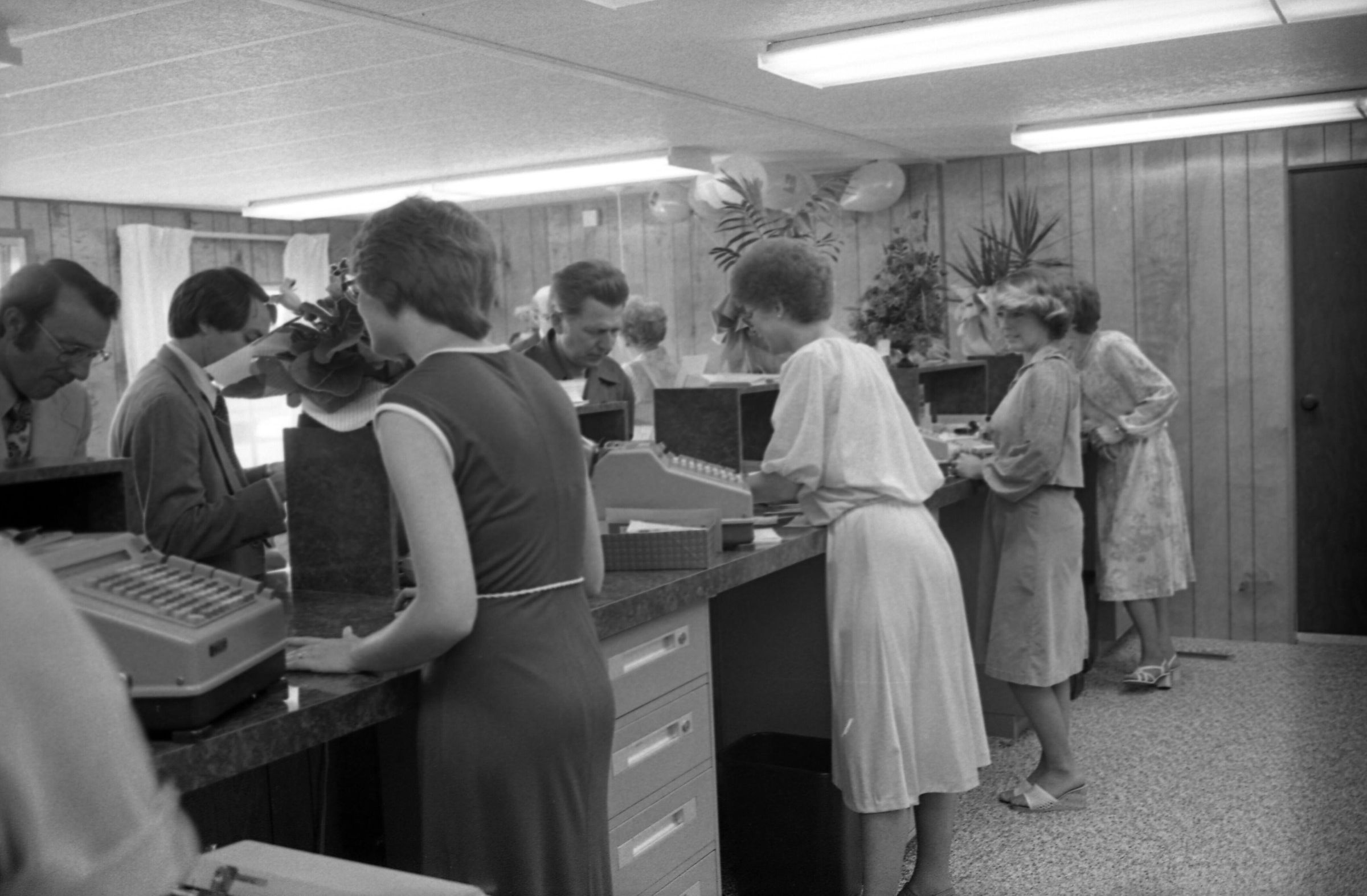 Lacey Bank, 1979. These four black and white film negative strips were created for the Lacey Leader newspaper. These images show various people inside Lacey Bank.Made/Created