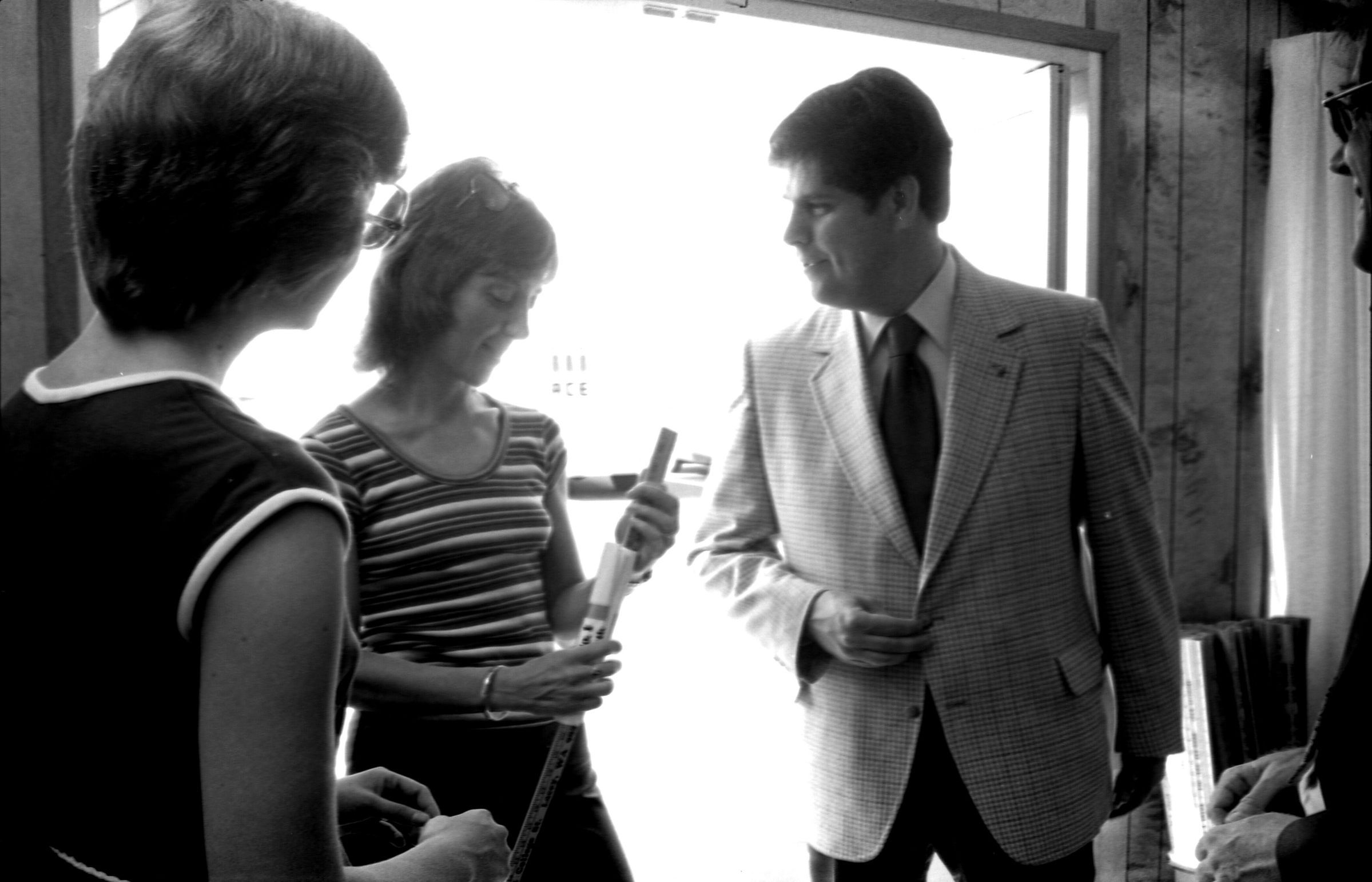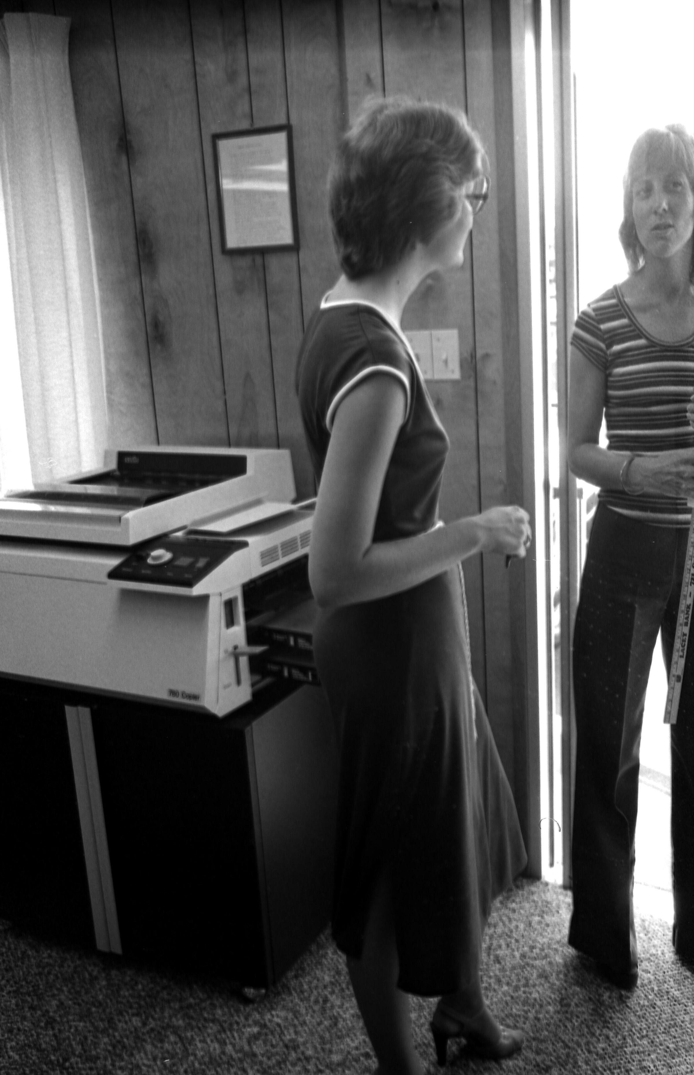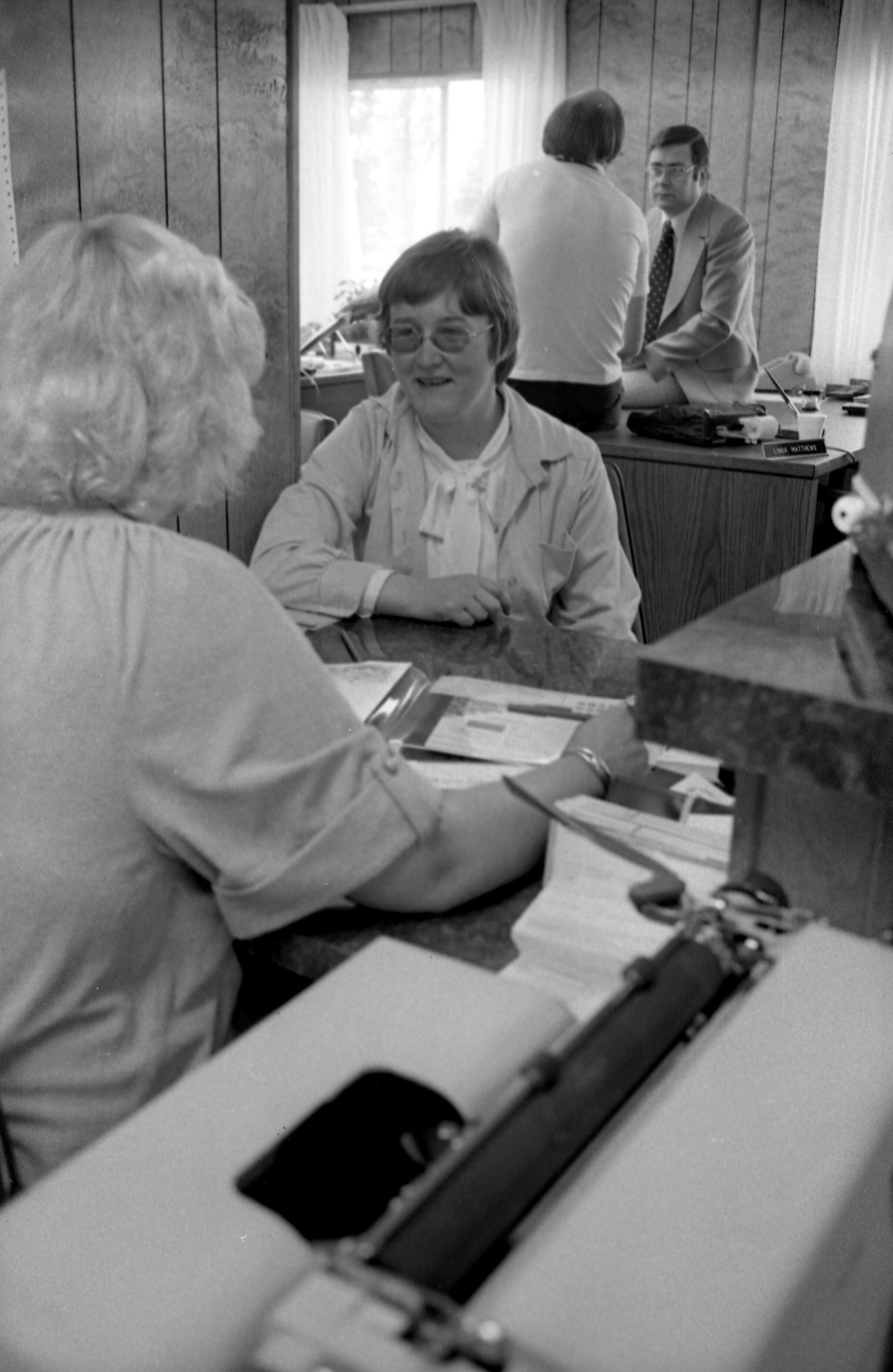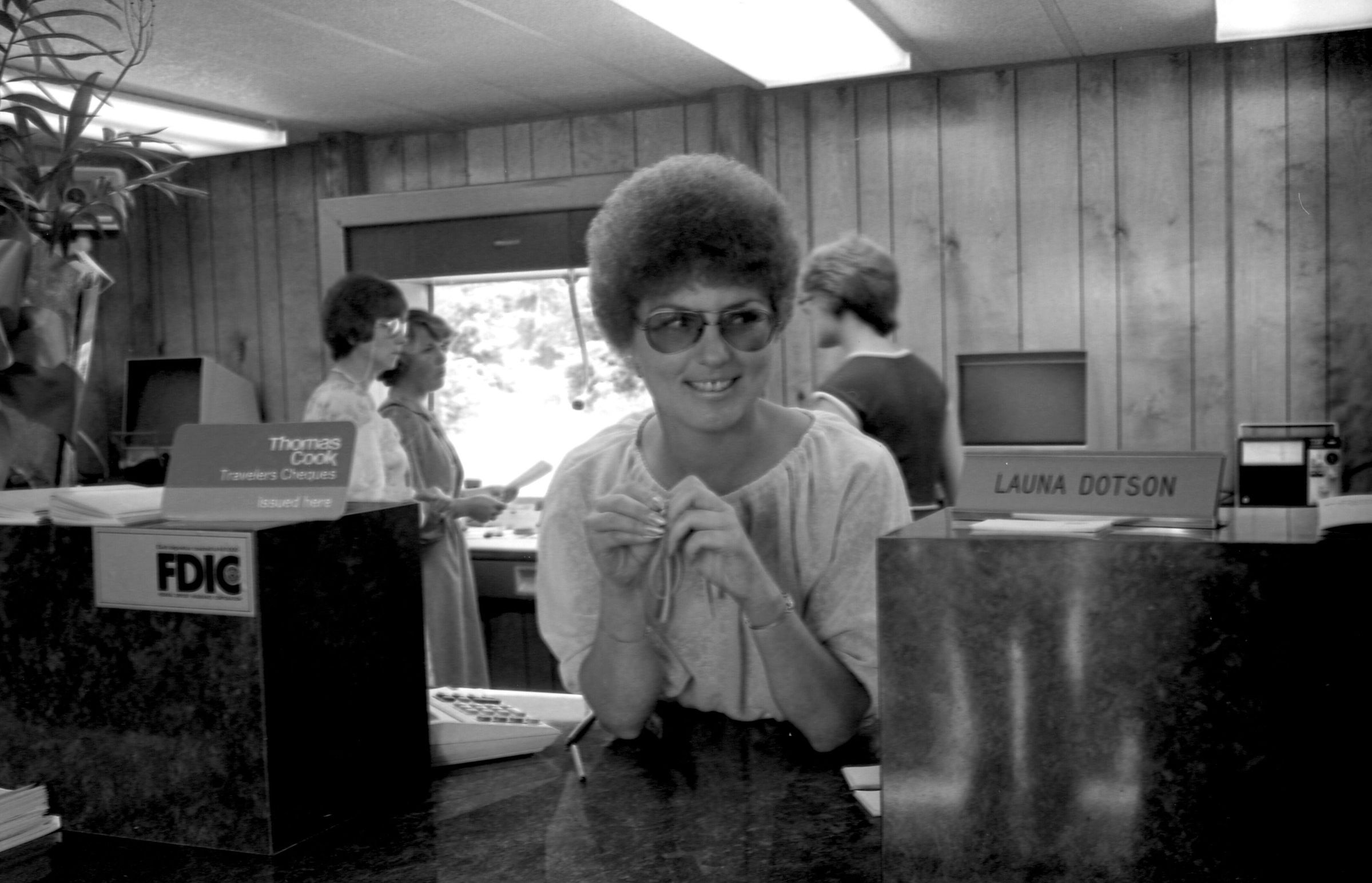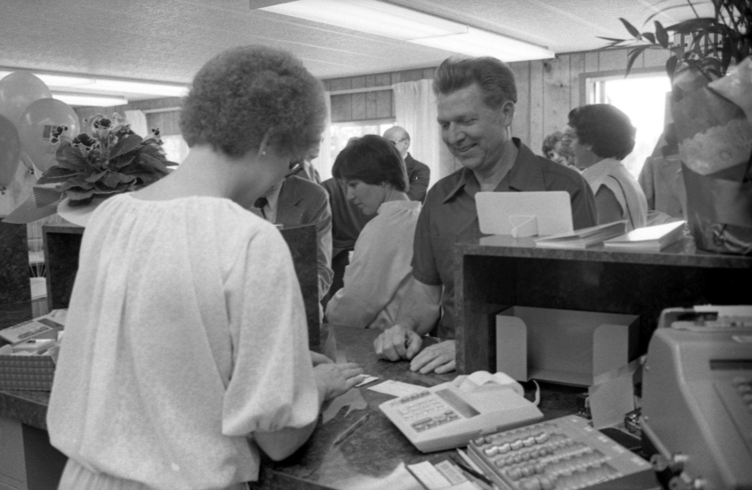Lacey Bank, 1979. These four black and white film negative strips were created for the Lacey Leader newspaper. These images show various people inside Lacey Bank.Made/Created