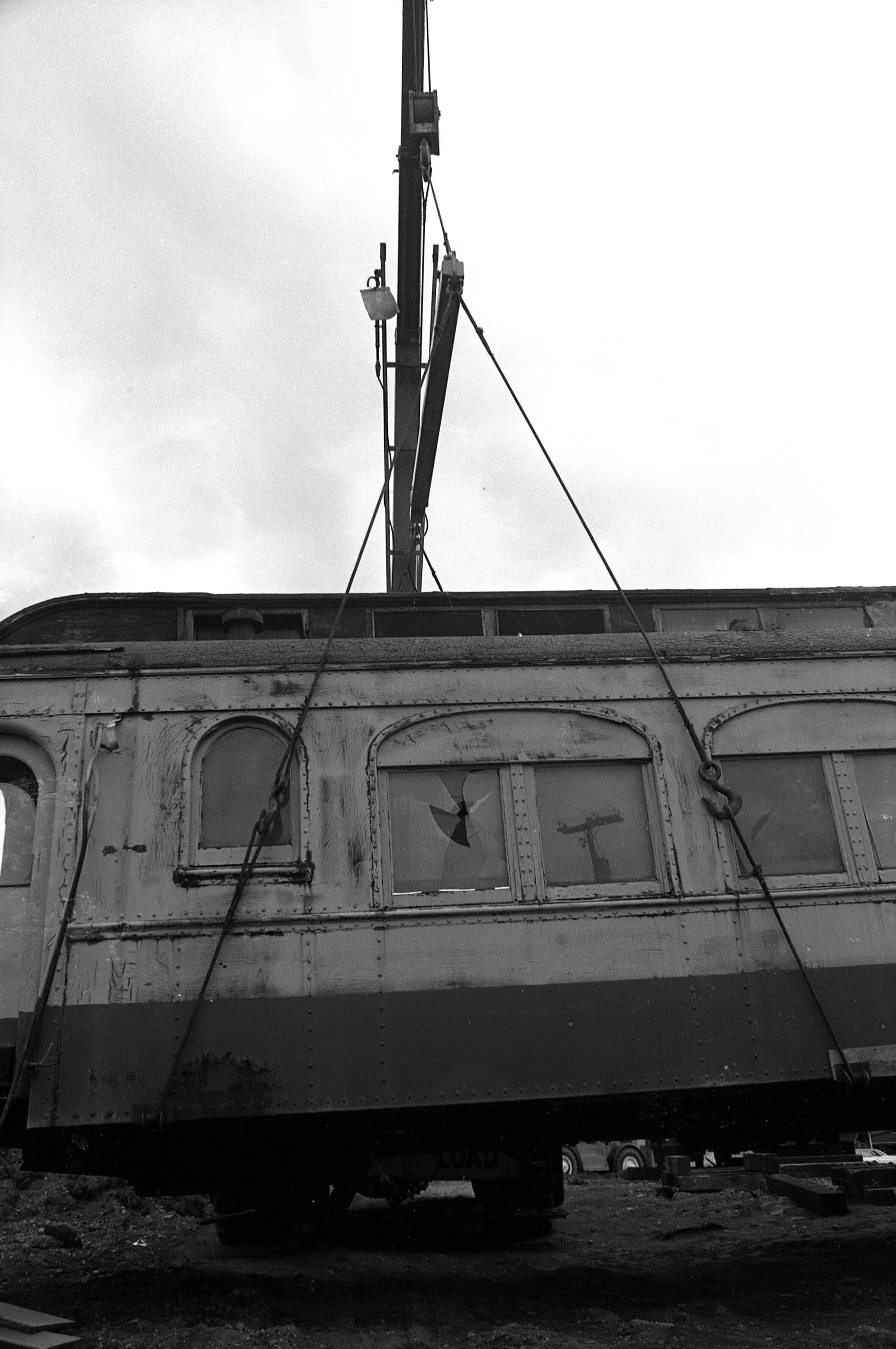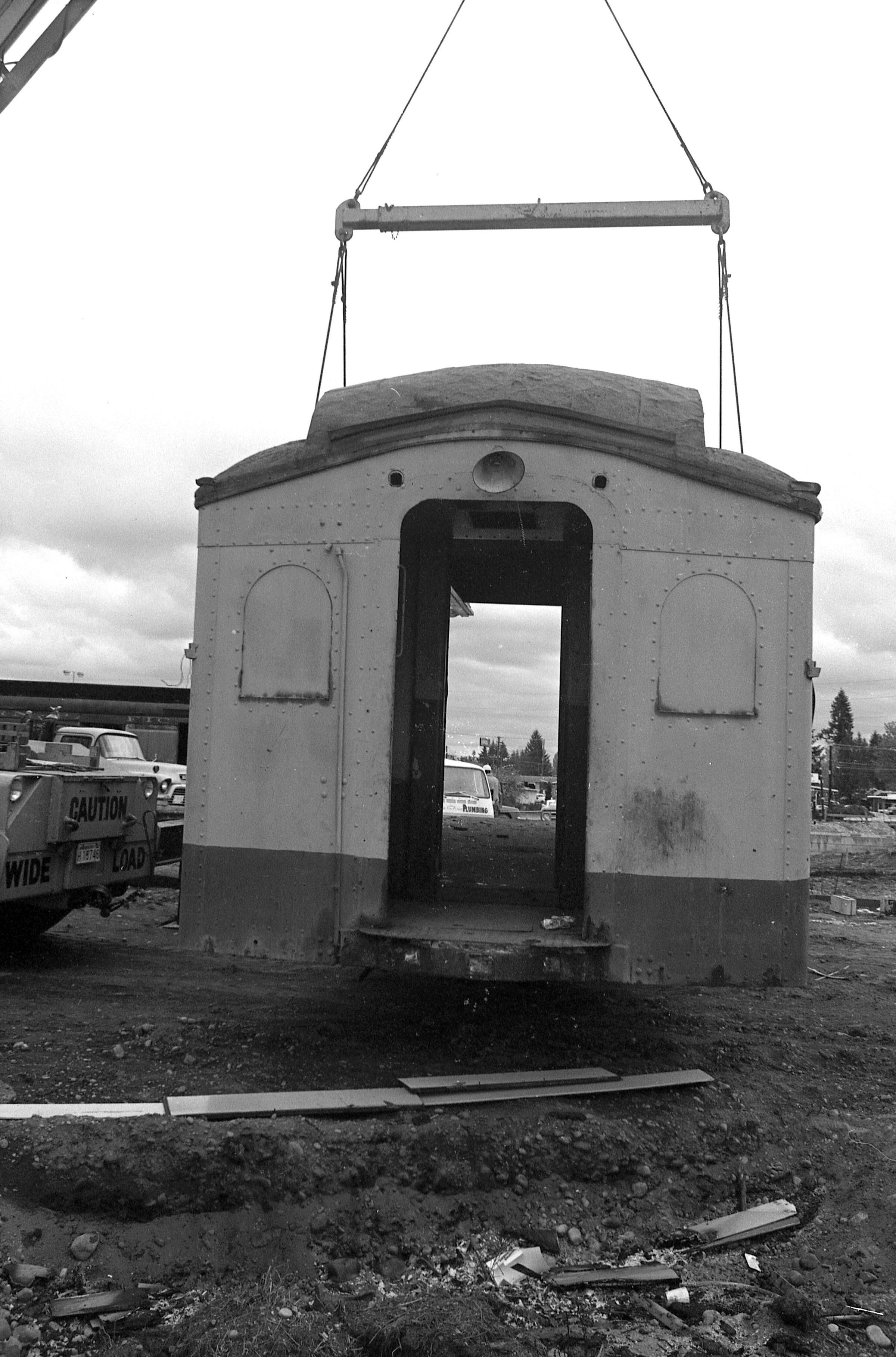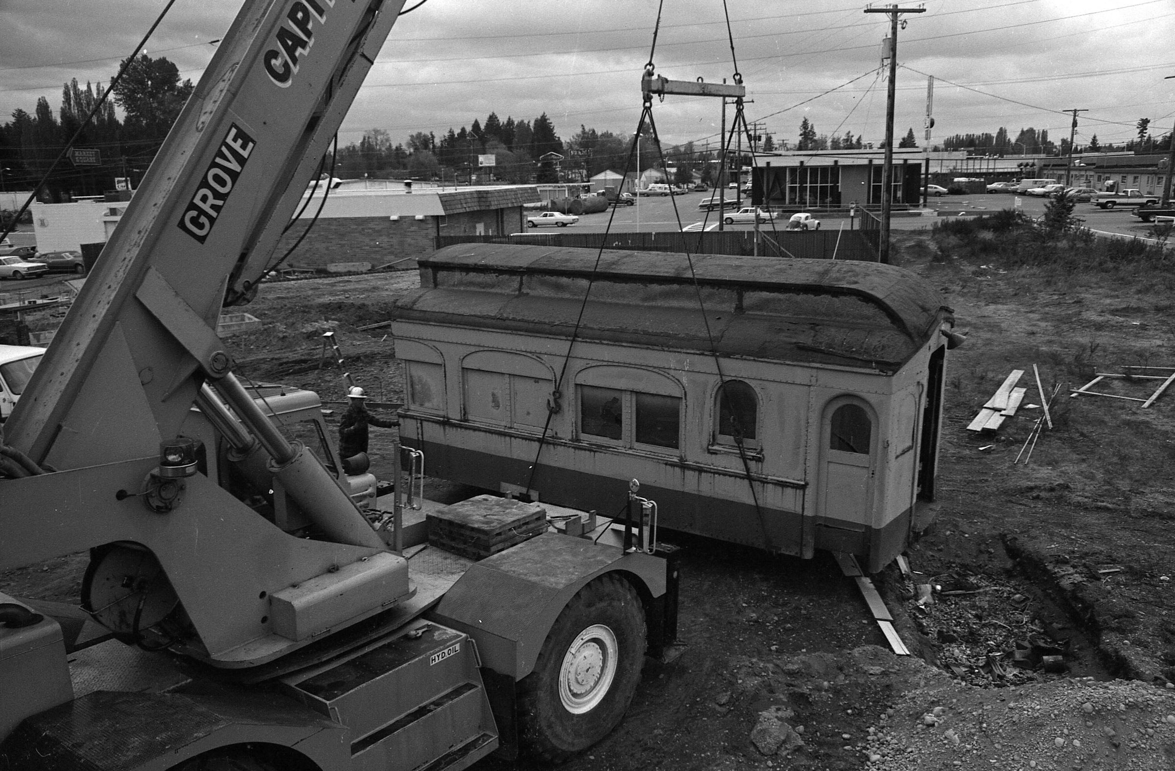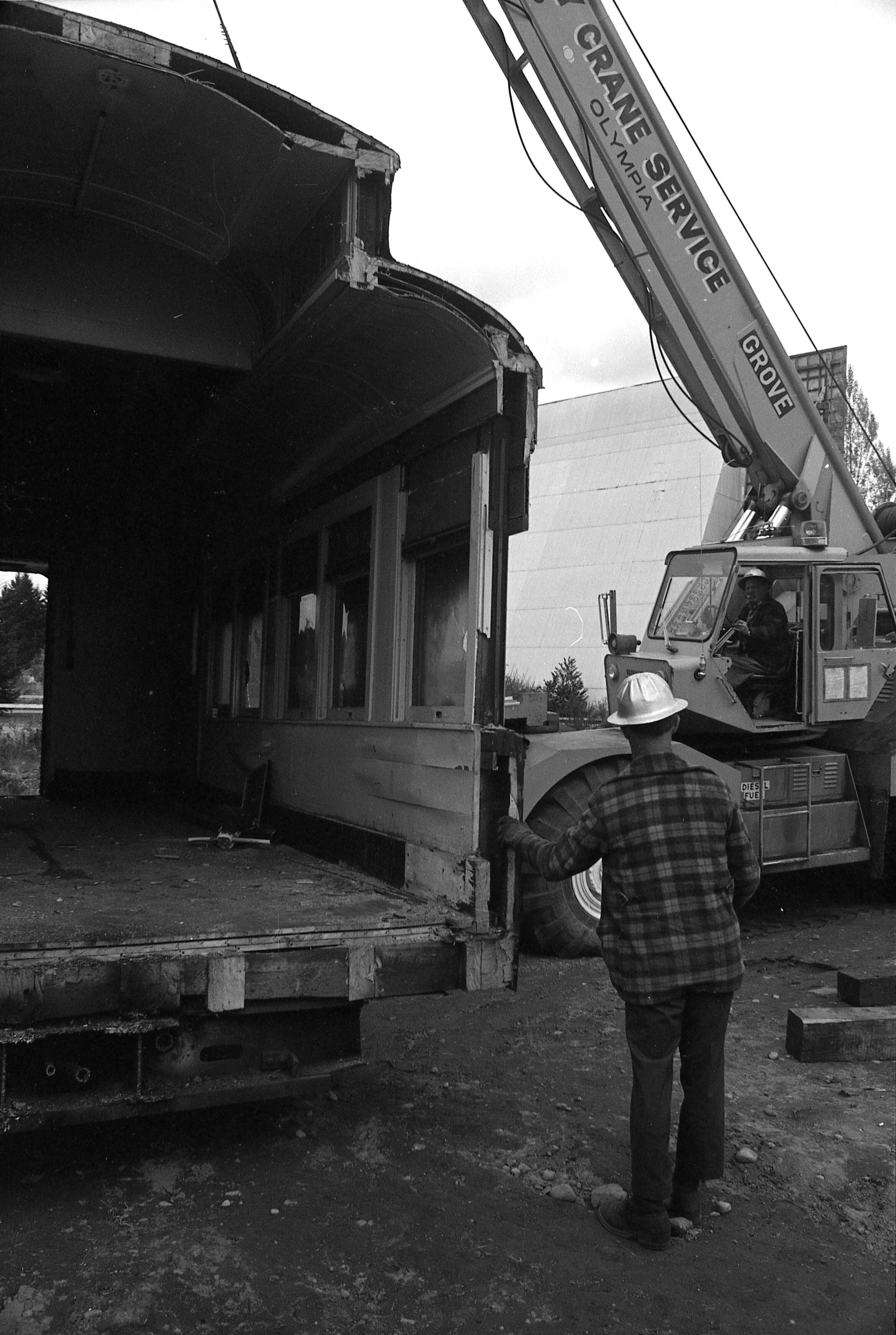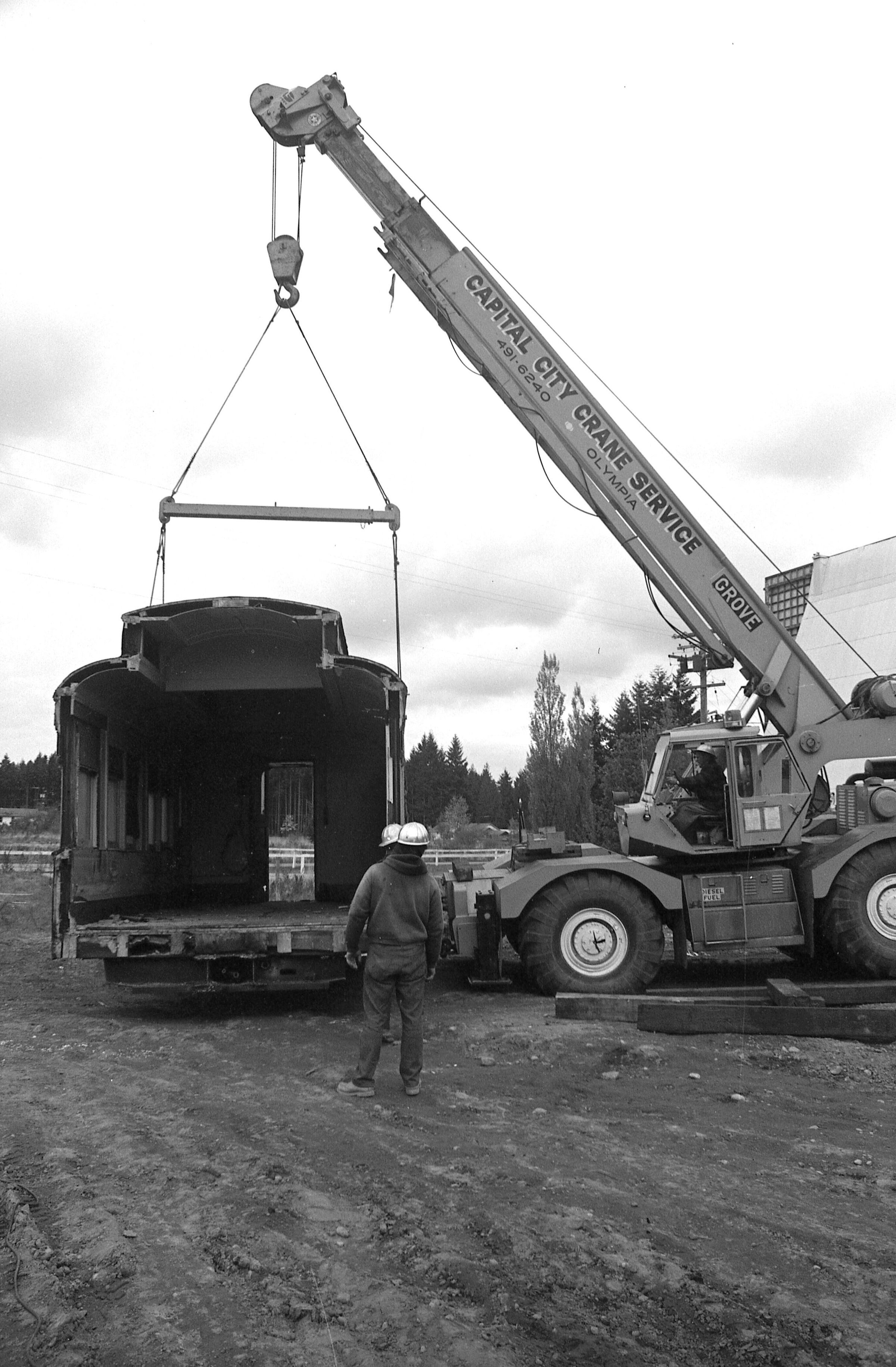 Capital City Crane Service. Ten photos showing a Capital City crane lifting and moving what appear to be former train cars. The operator and one person directing the move are visible in some frames. In the background of some of these photos one can see a 4-5 story office building, what appears to be a tall, A frame building and a parking/shopping area.Made/Created