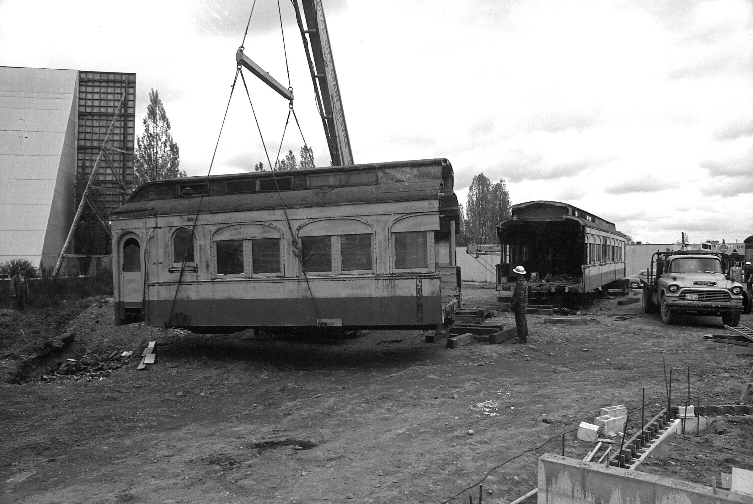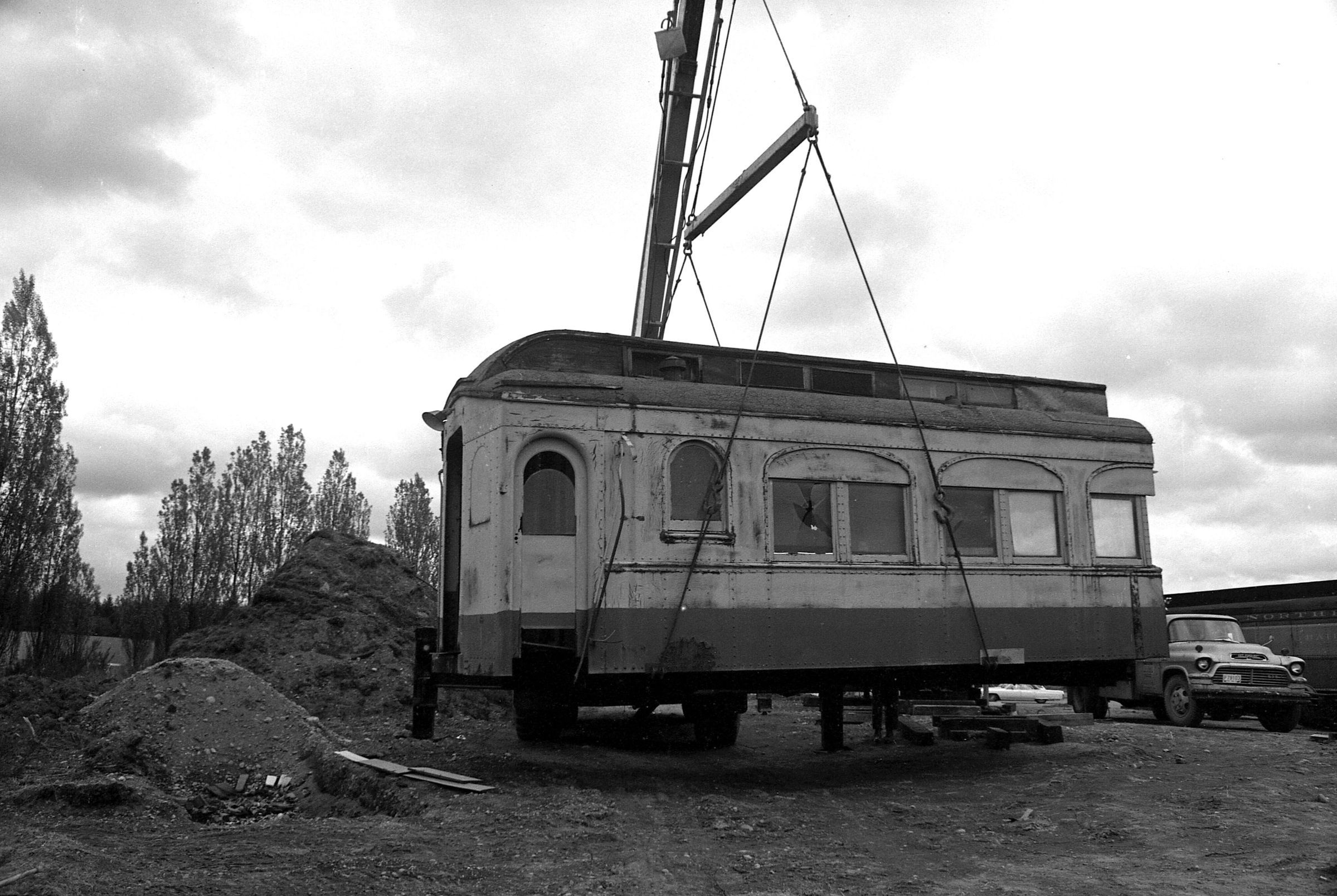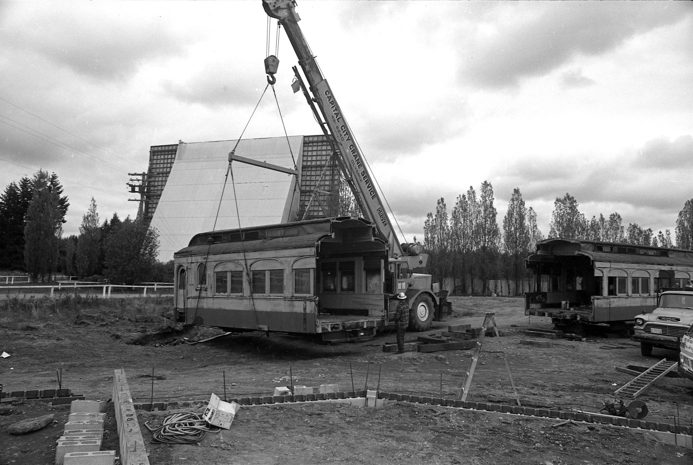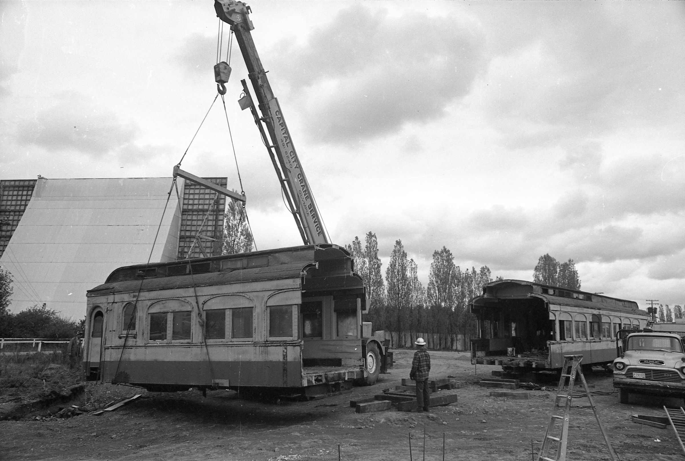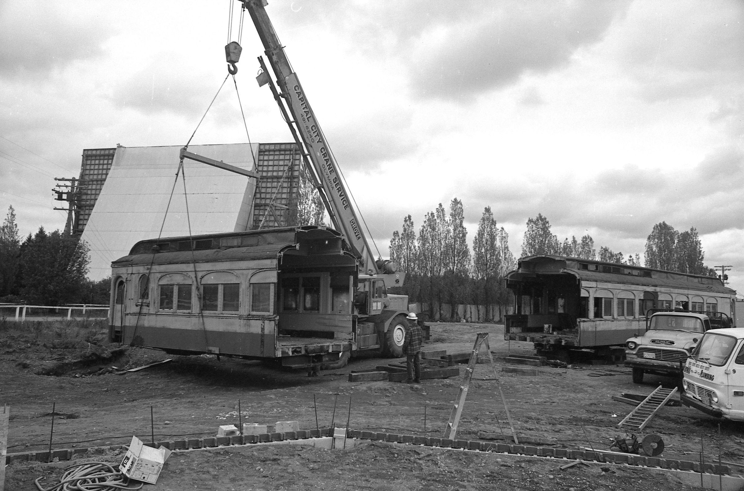 Capital City Crane Service. Ten photos showing a Capital City crane lifting and moving what appear to be former train cars. The operator and one person directing the move are visible in some frames. In the background of some of these photos one can see a 4-5 story office building, what appears to be a tall, A frame building and a parking/shopping area.Made/Created