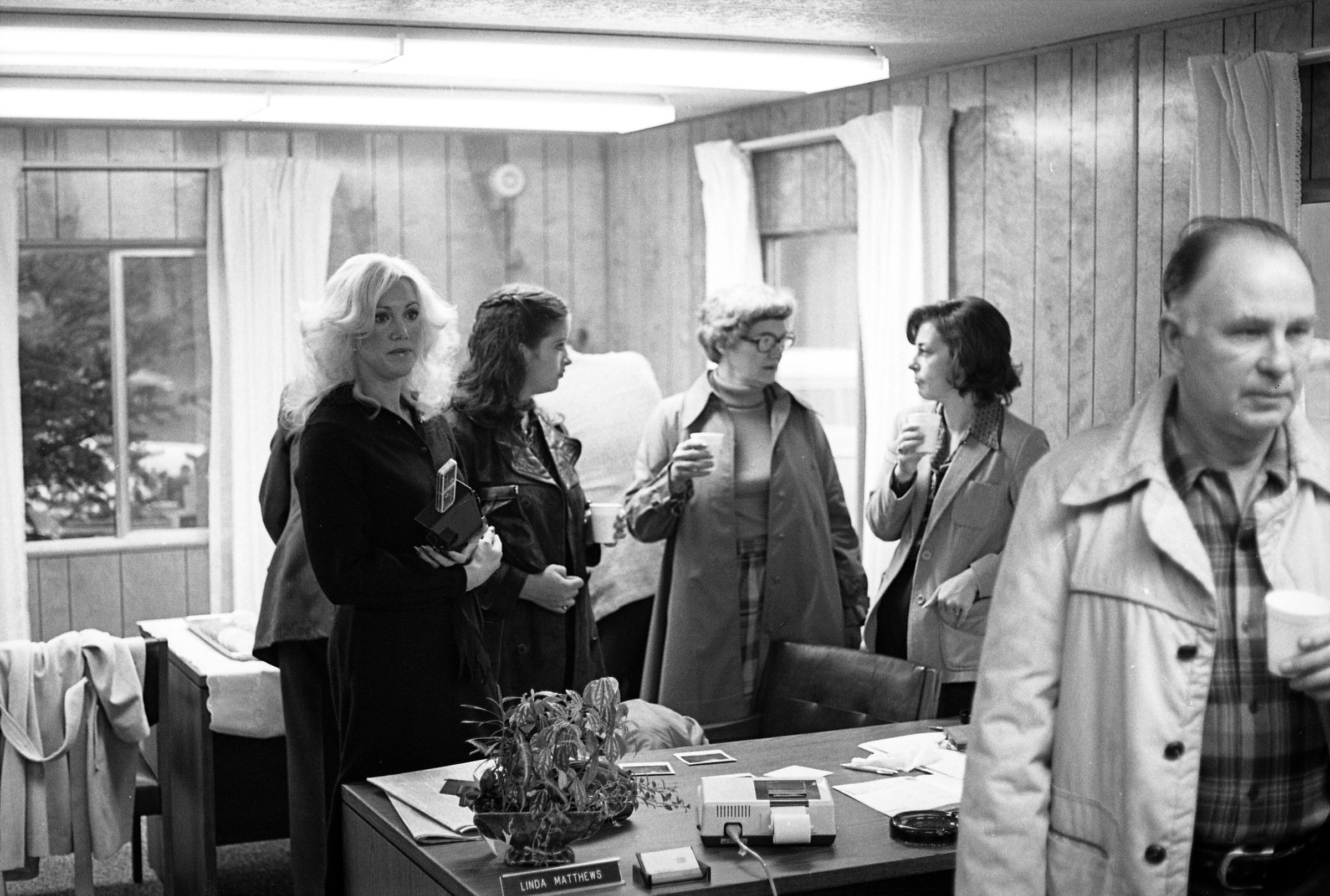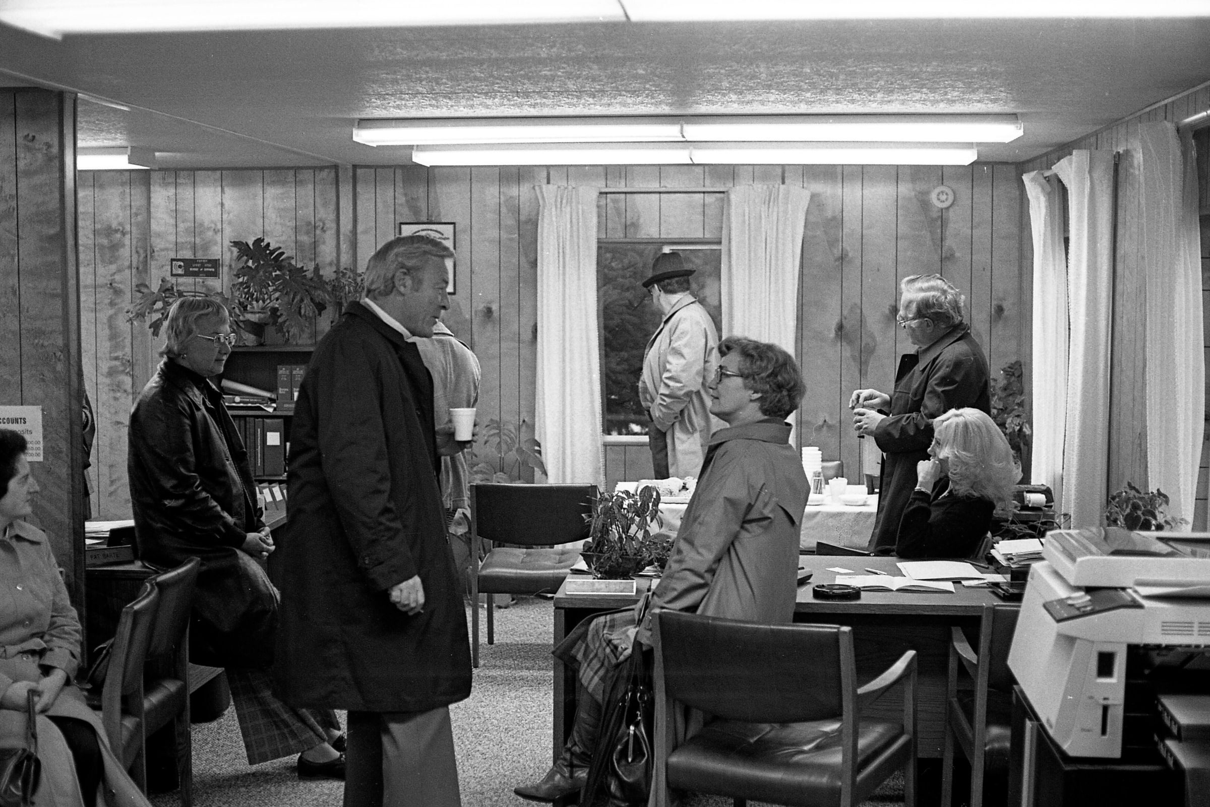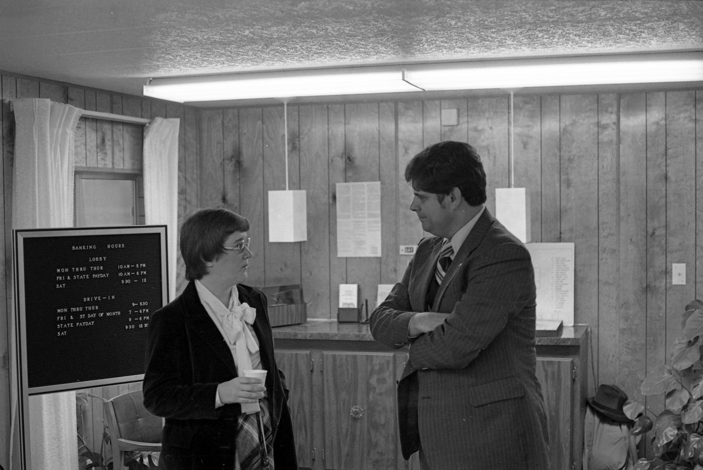 Lacey Bank Planning and Groundbreaking, 1979. These five black and white film negative strips were created for the Lacey Leader newspaper. These images show an outdoor groundbreaking ceremony for the new Lacey Bank building, and an indoor reception event taking place in the temporary building which the bank operated out of while the permanent structure was being constructed. The temporary structure was a mobile home.Made/Created