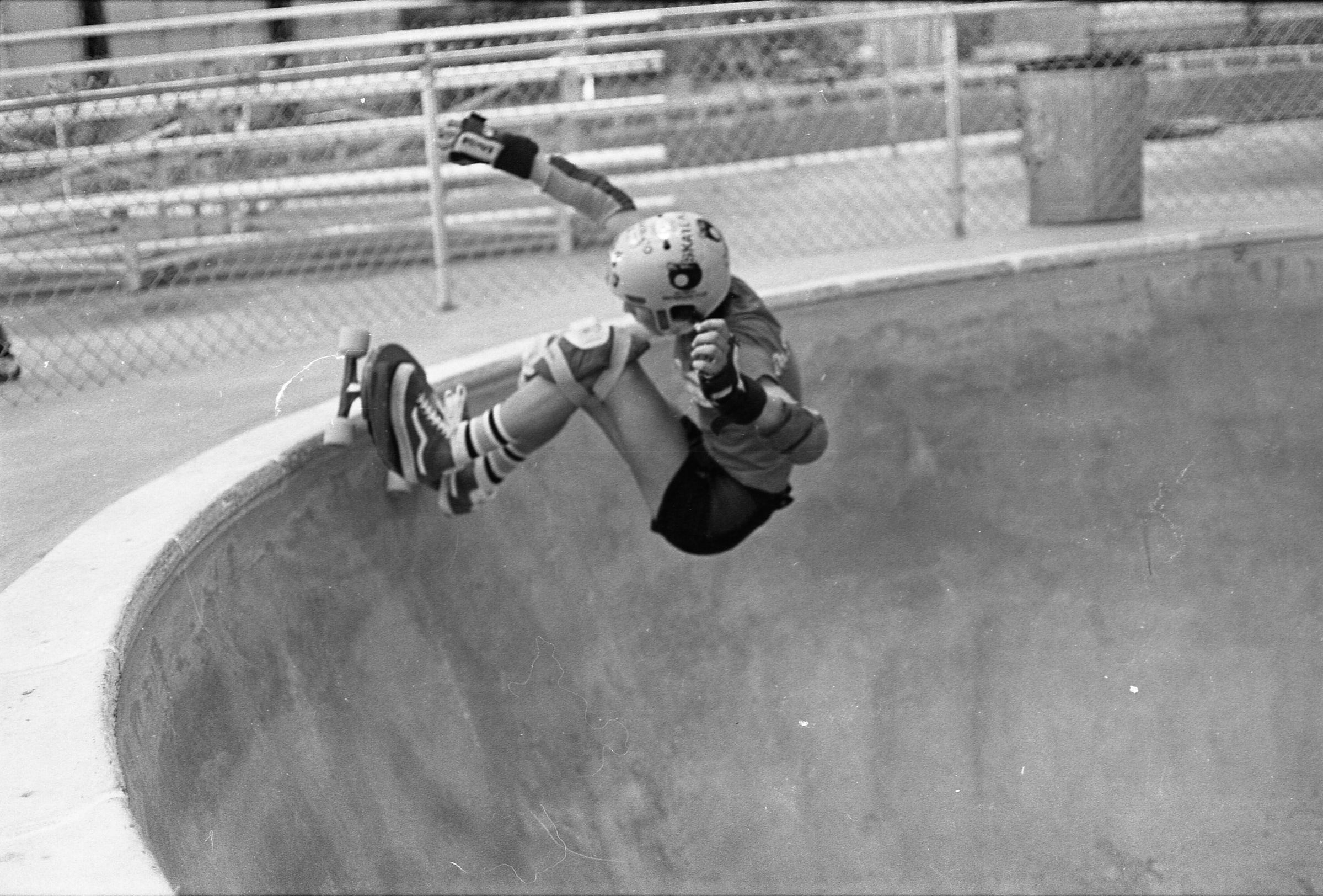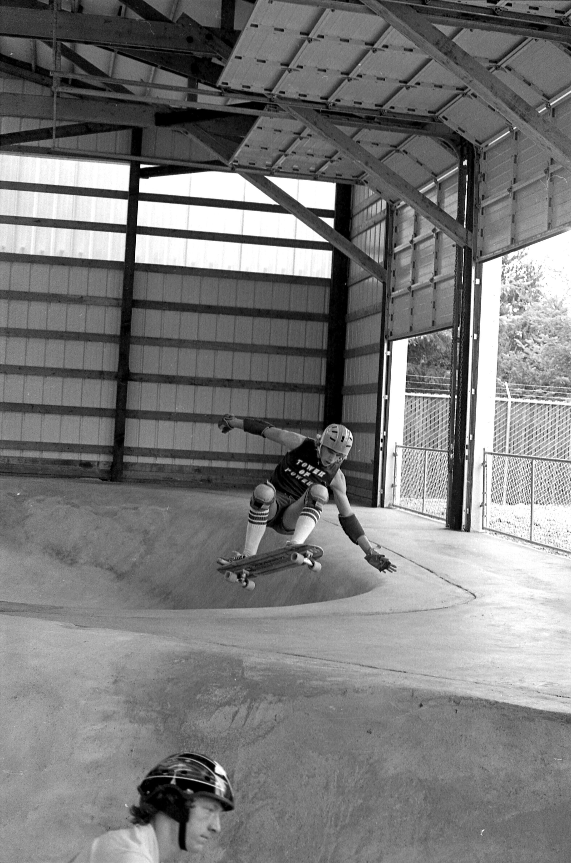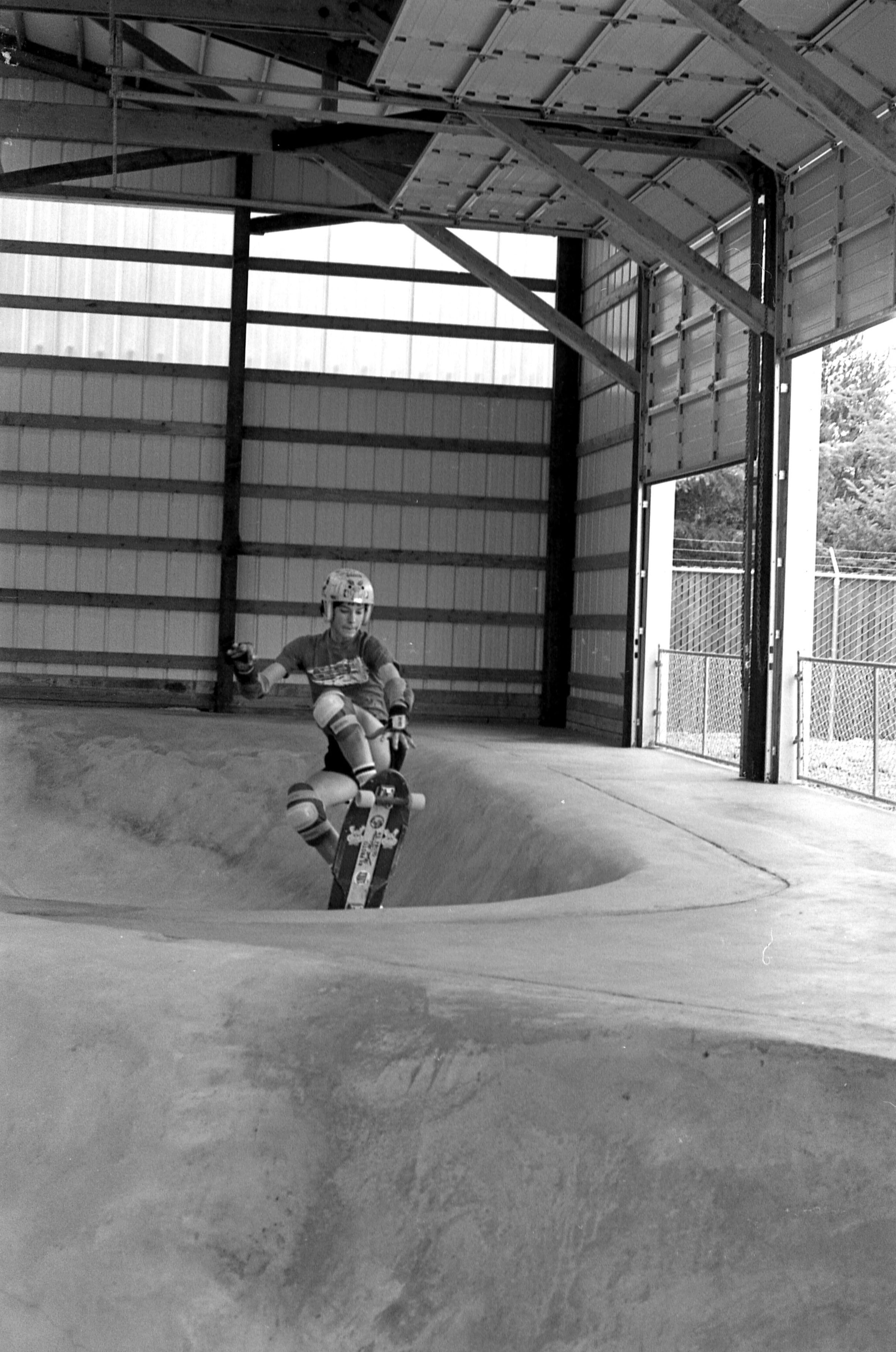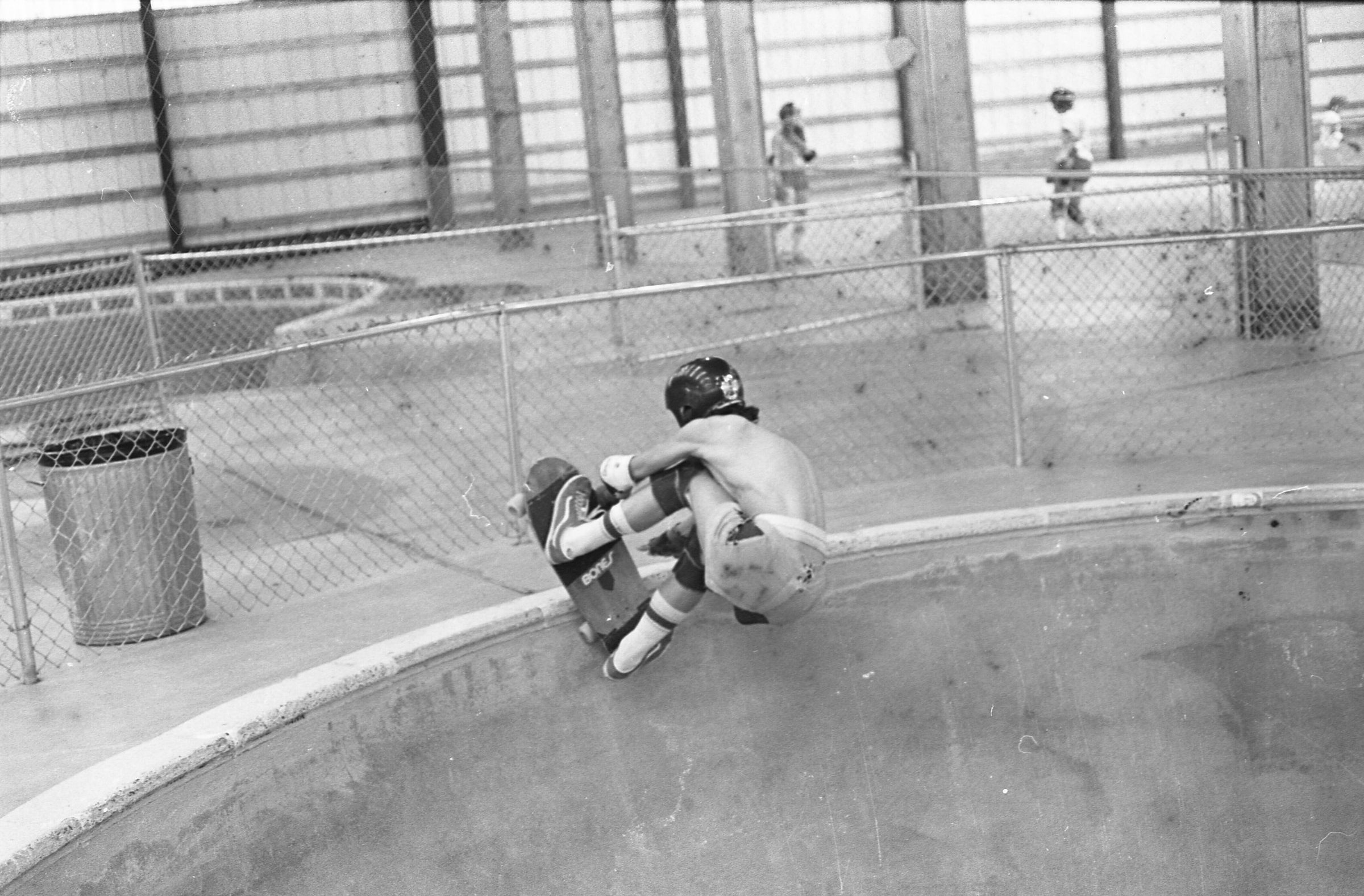 Skateboard Park 5-8-1979. These seven strips of black and white negatives were created for the Lacey Leader newspaper. They depict individuals wearing helmets and pads, skateboarding and performing tricks in the bowls of the park; and one group of people posing.