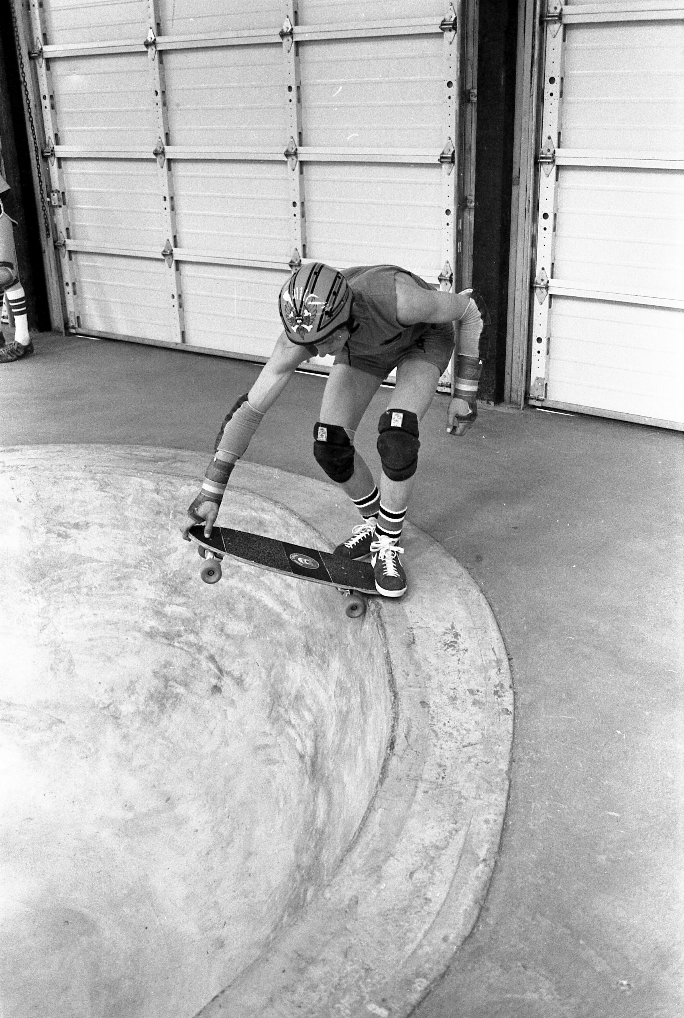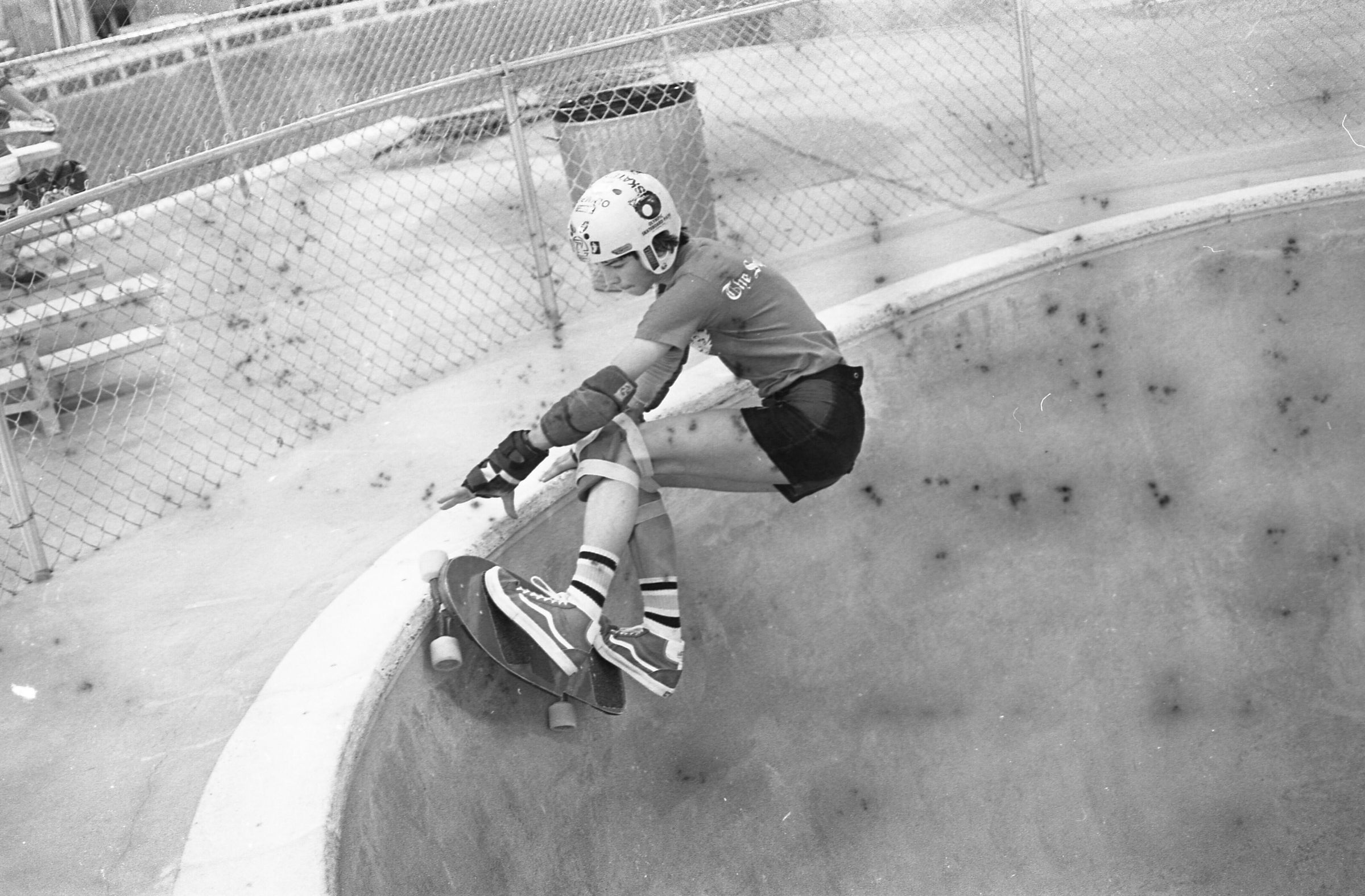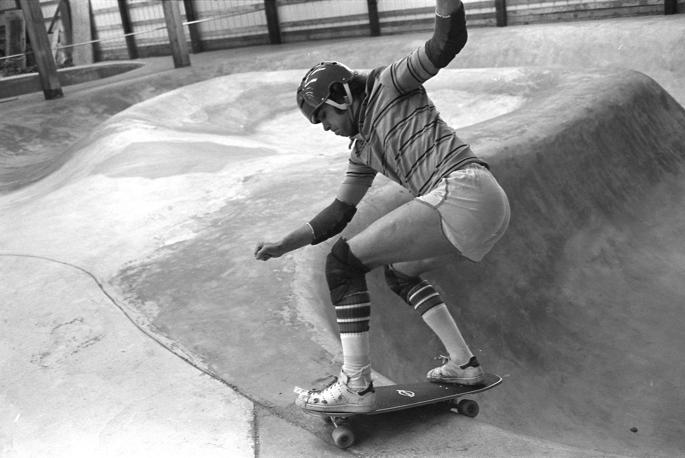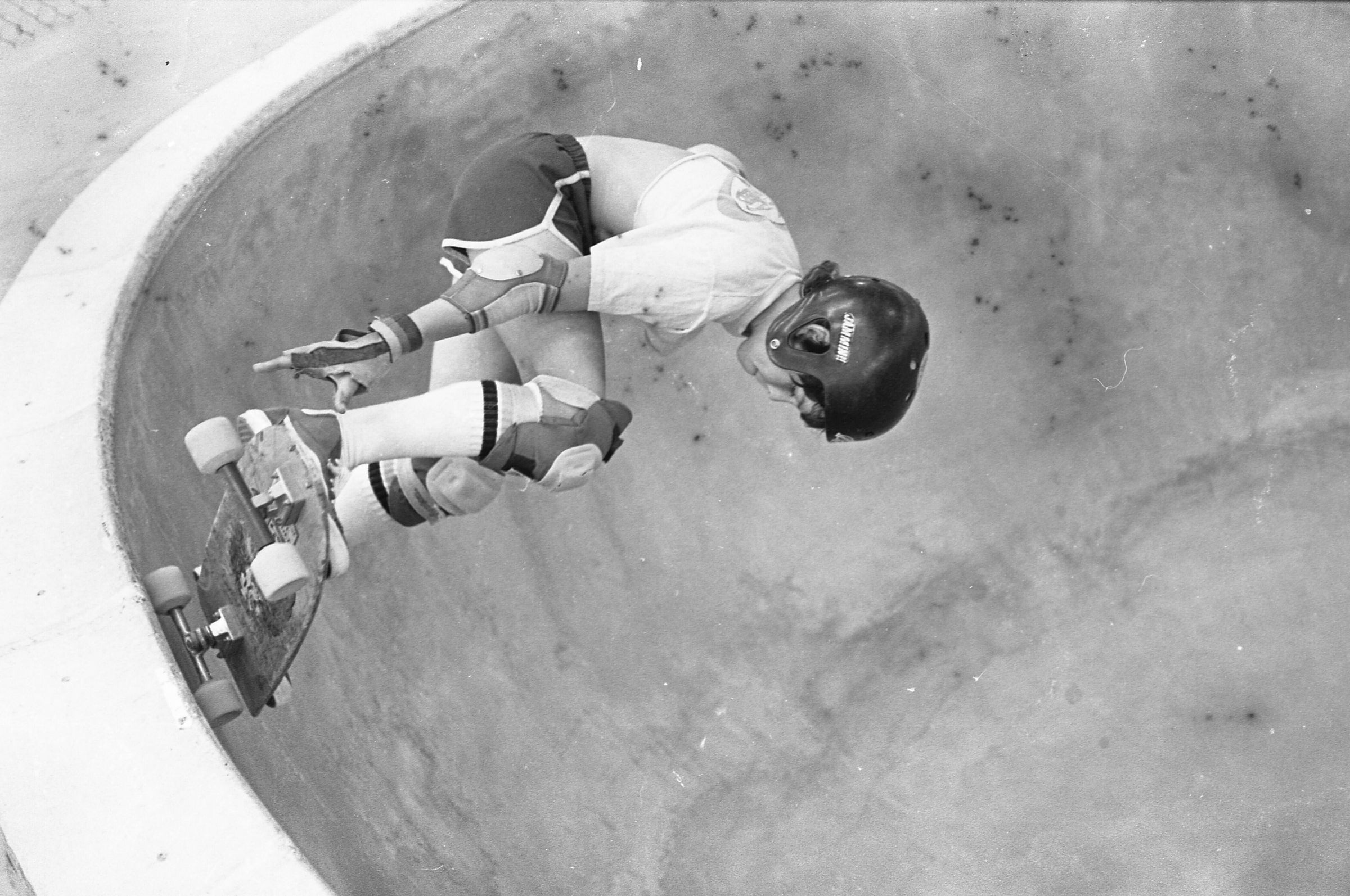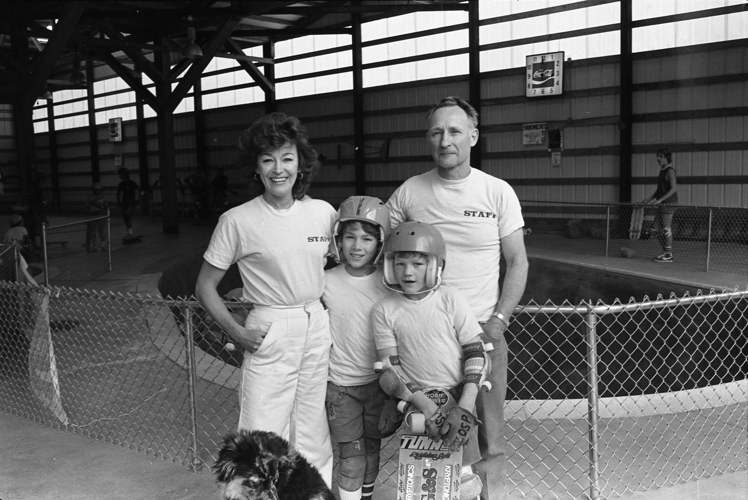 Skateboard Park 5-8-1979. These seven strips of black and white negatives were created for the Lacey Leader newspaper. They depict individuals wearing helmets and pads, skateboarding and performing tricks in the bowls of the park; and one group of people posing.