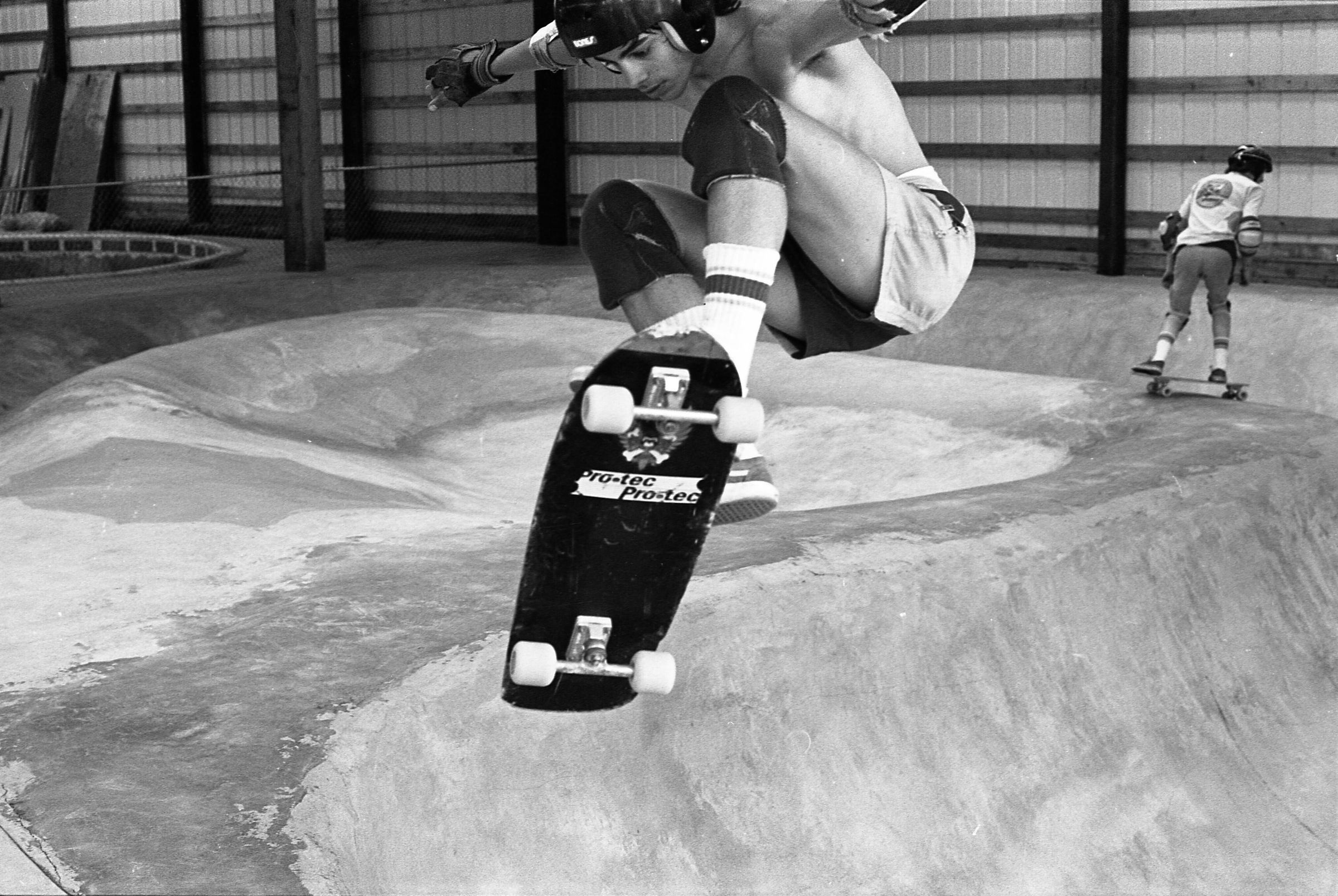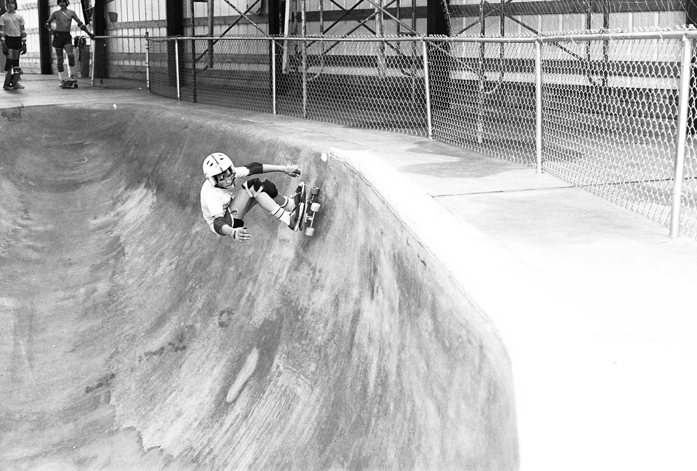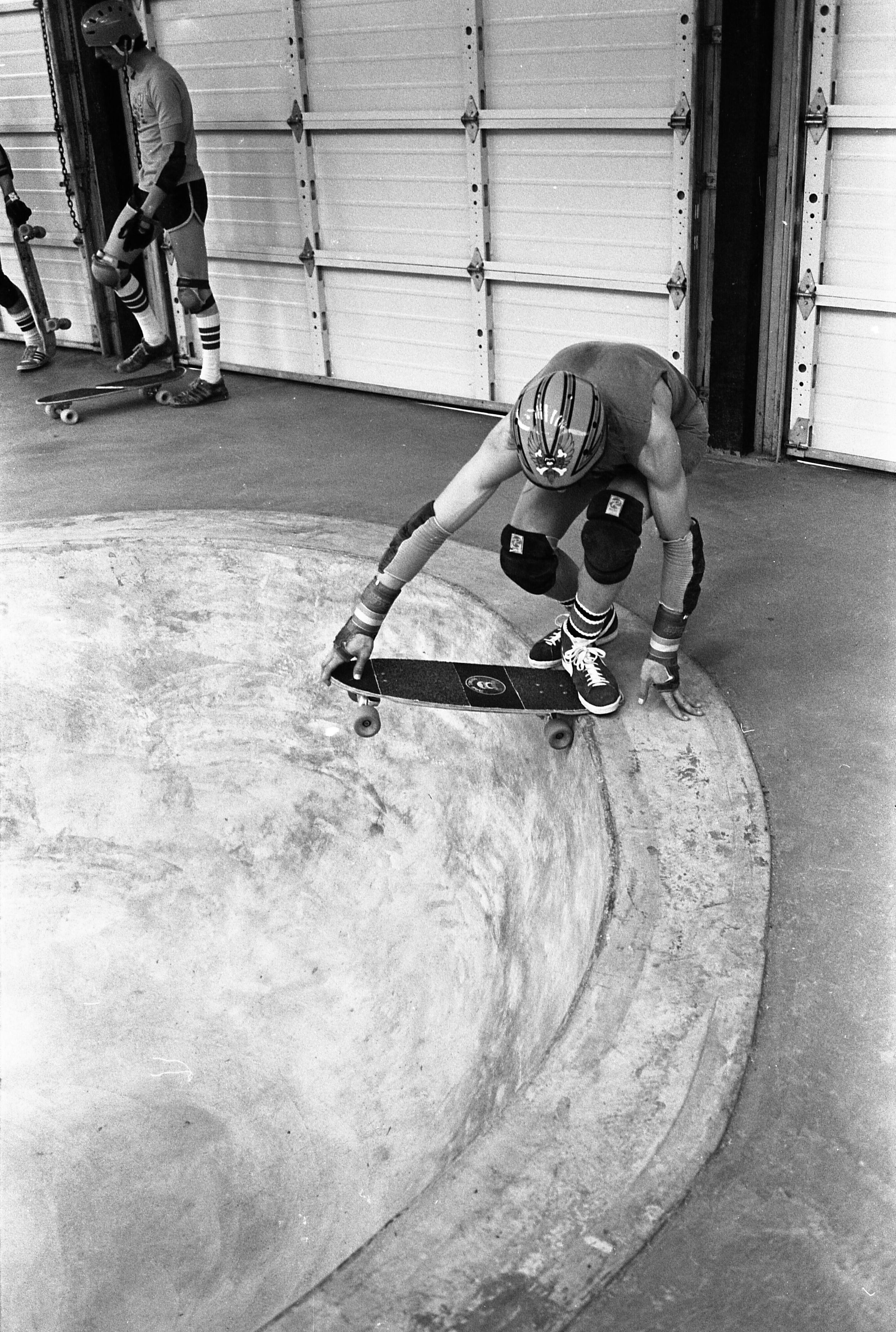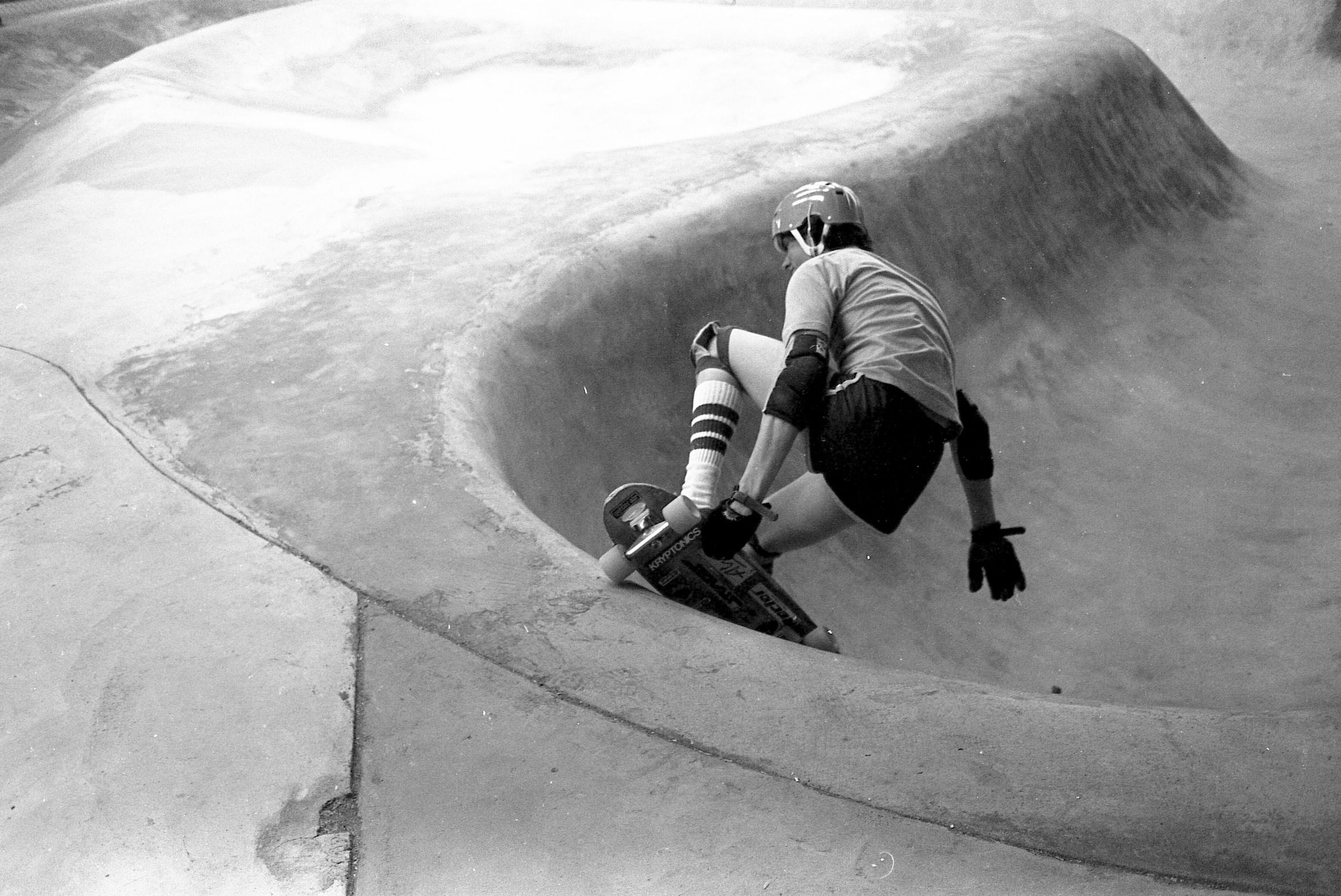 Skateboard Park 5-8-1979. These seven strips of black and white negatives were created for the Lacey Leader newspaper. They depict individuals wearing helmets and pads, skateboarding and performing tricks in the bowls of the park; and one group of people posing.