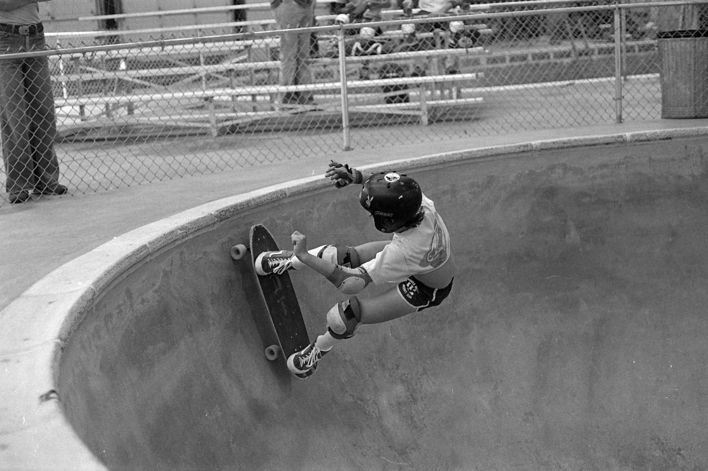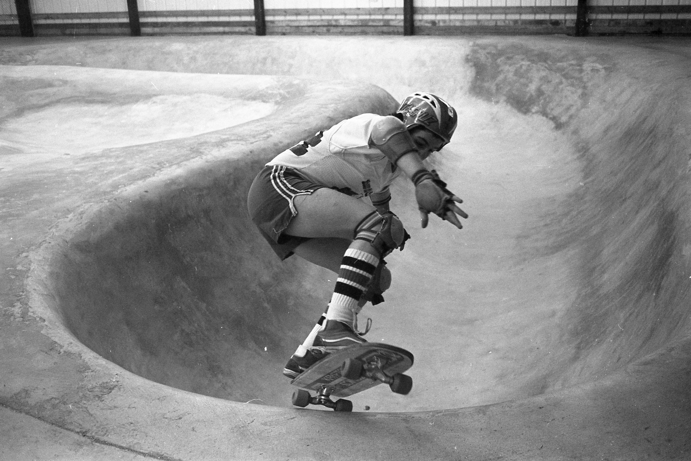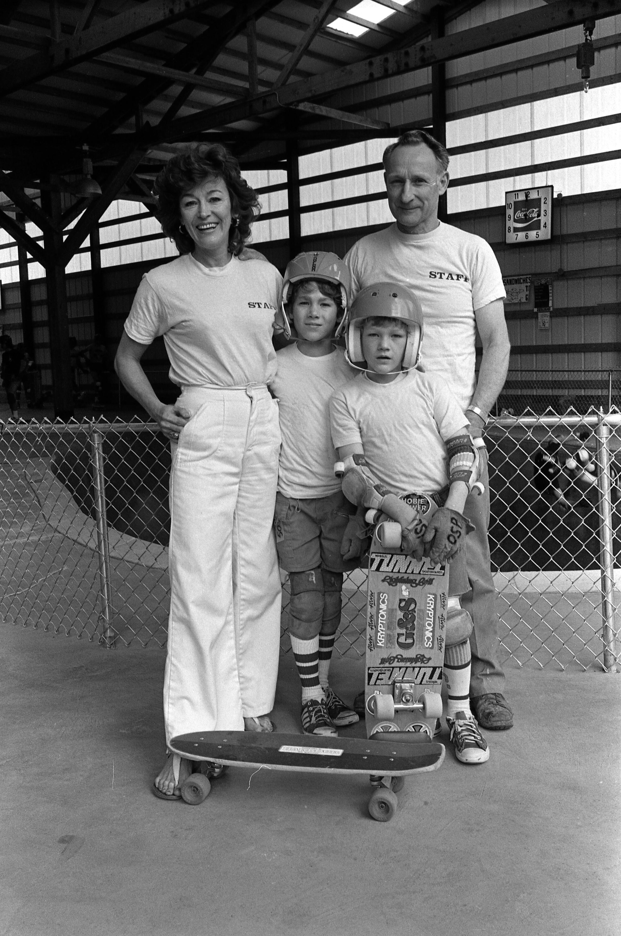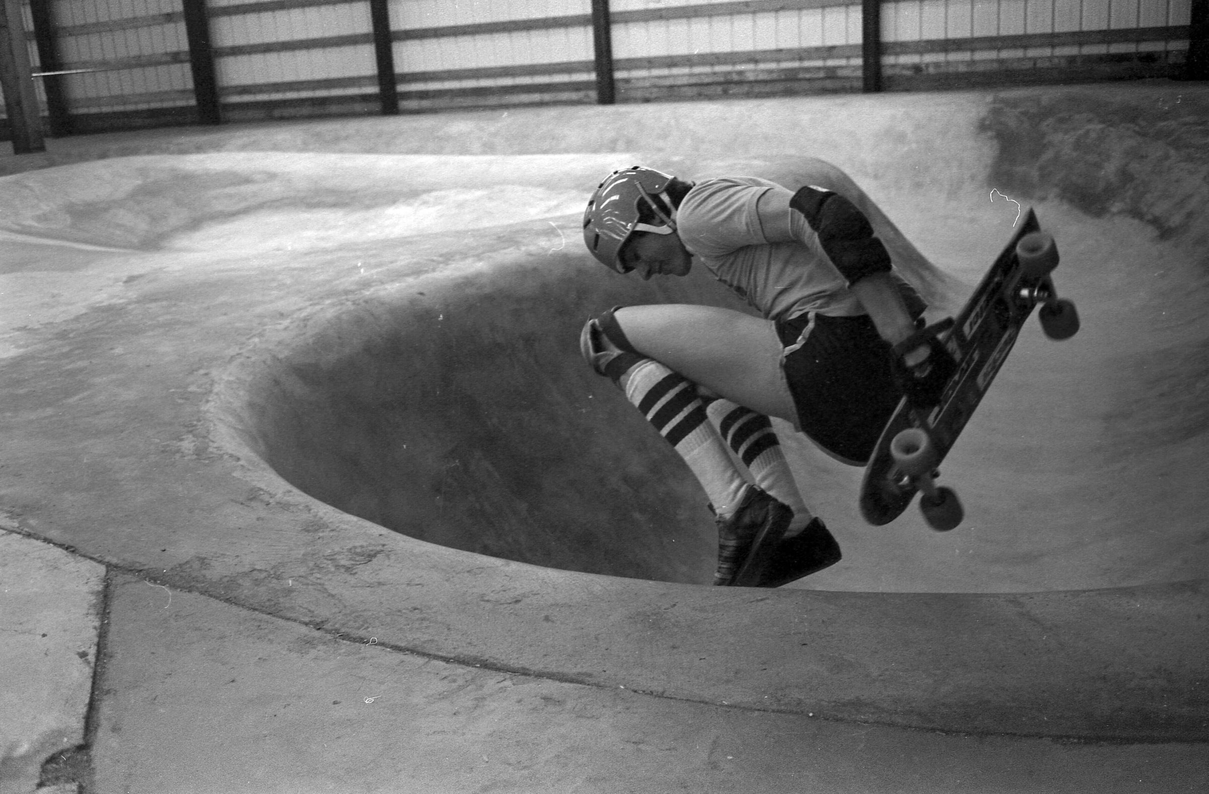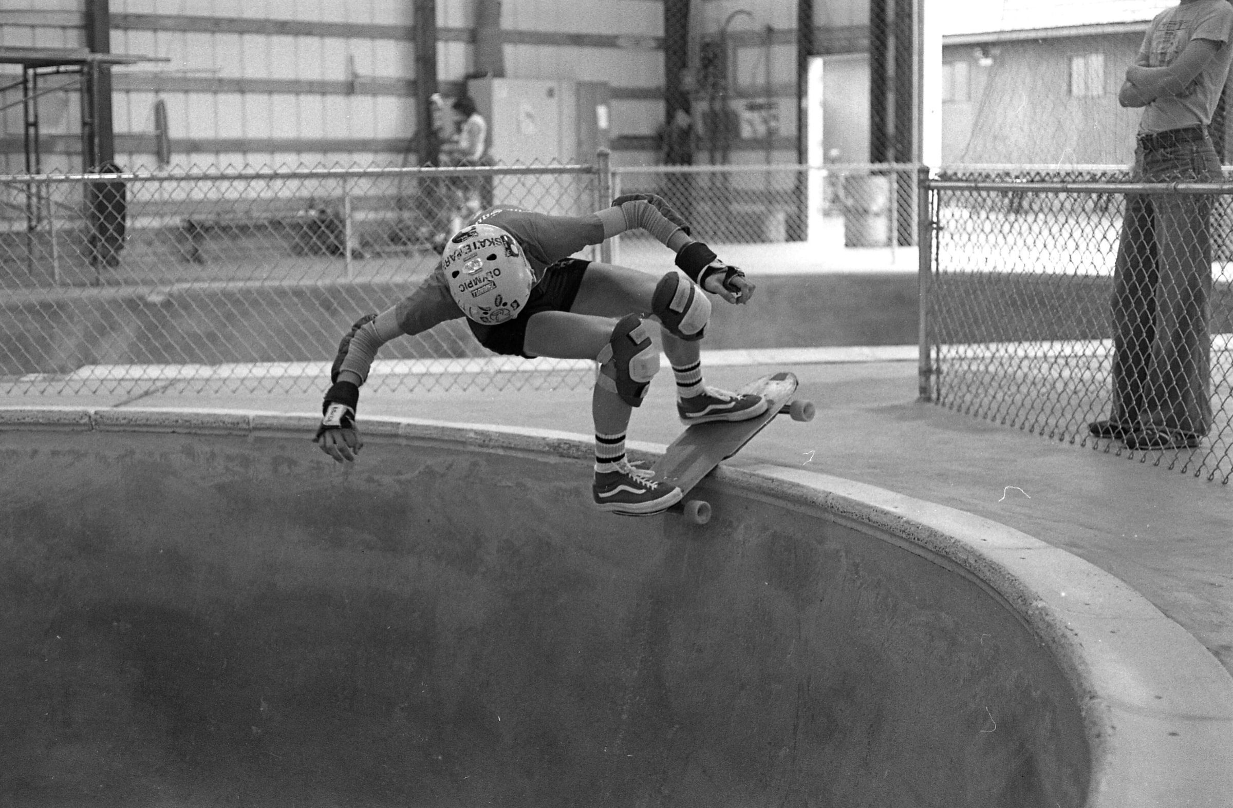 Skateboard Park 5-8-1979. These seven strips of black and white negatives were created for the Lacey Leader newspaper. They depict individuals wearing helmets and pads, skateboarding and performing tricks in the bowls of the park; and one group of people posing.