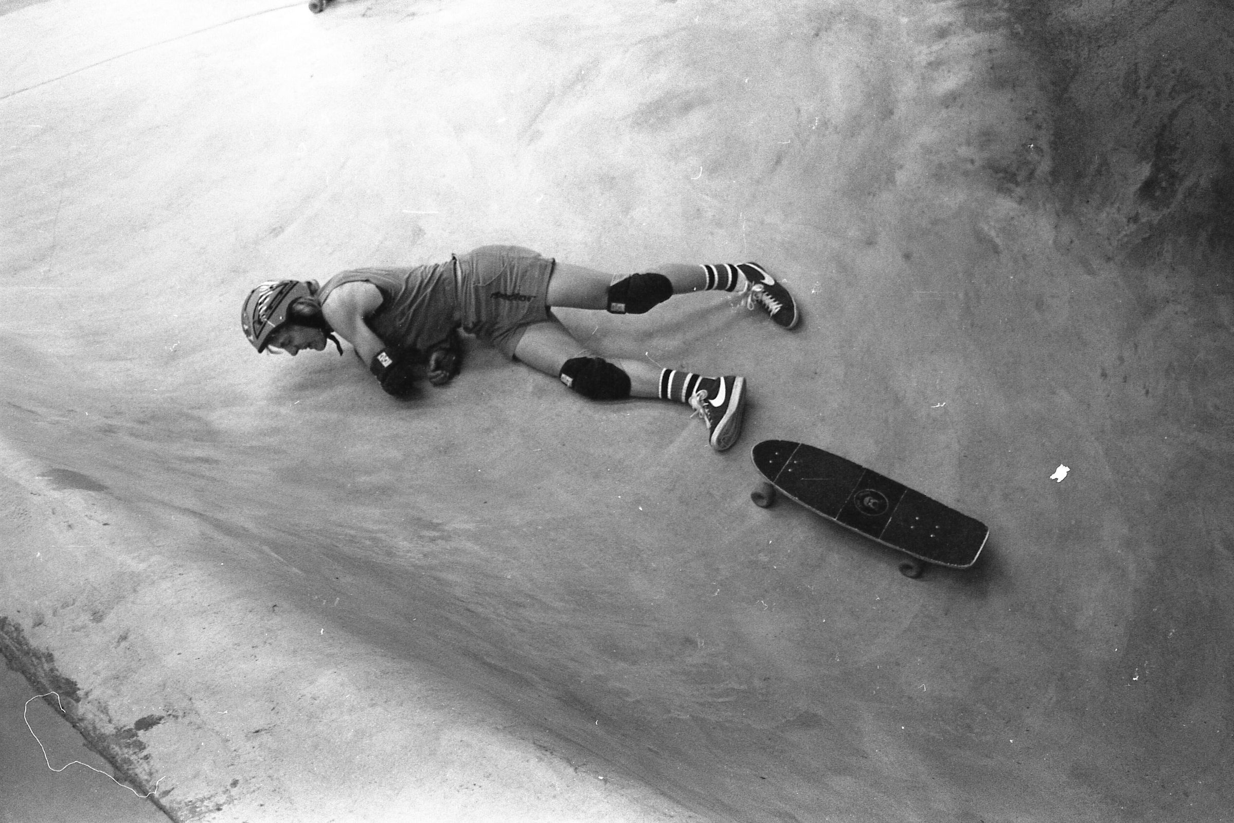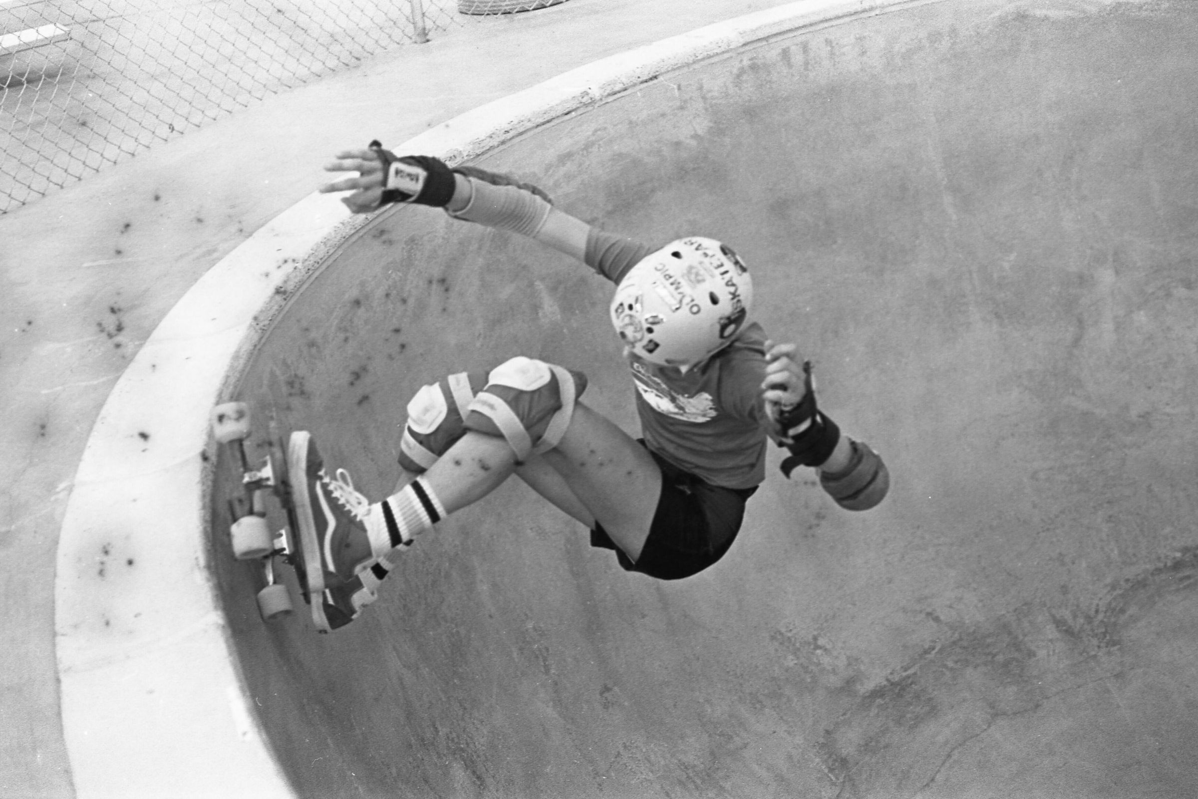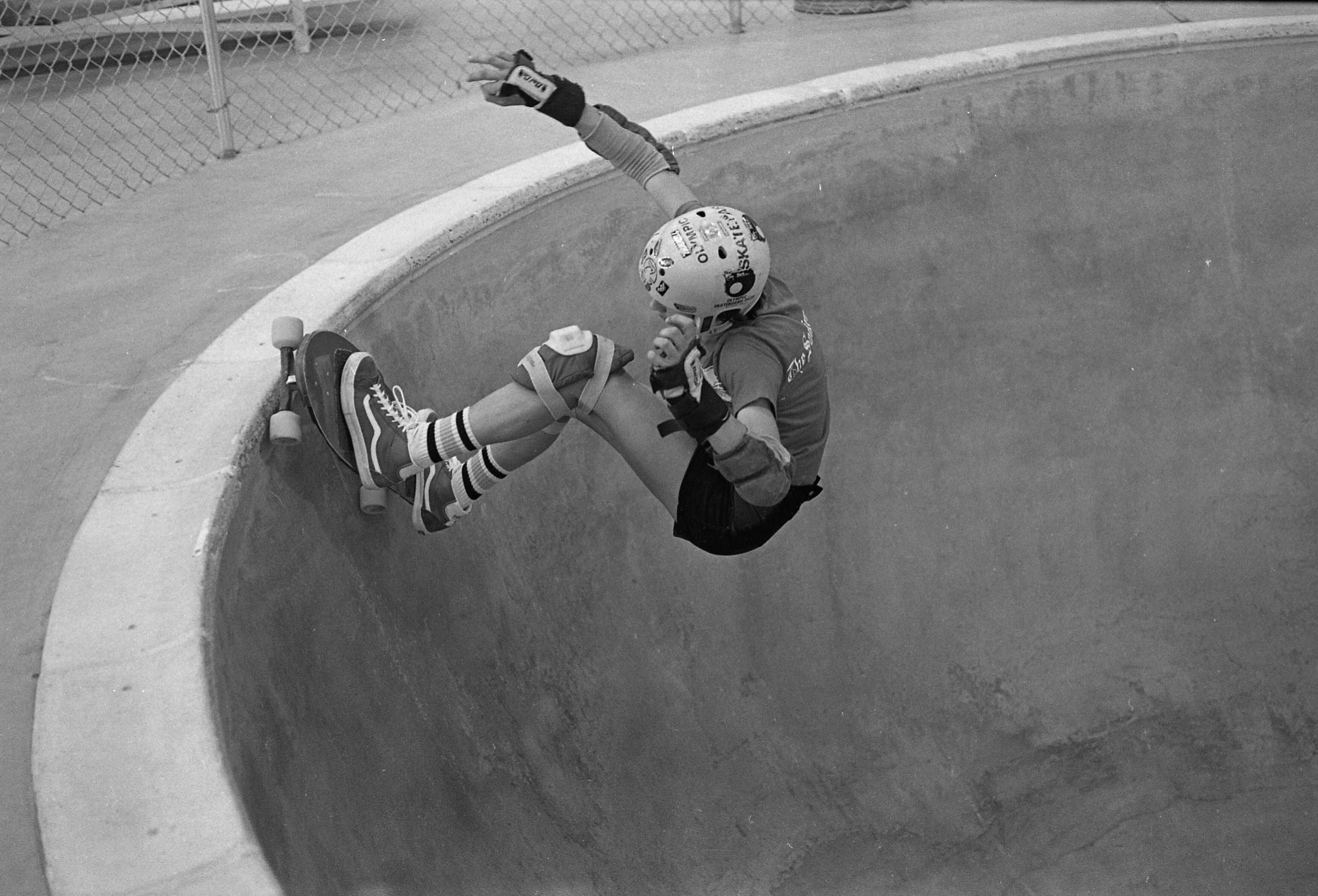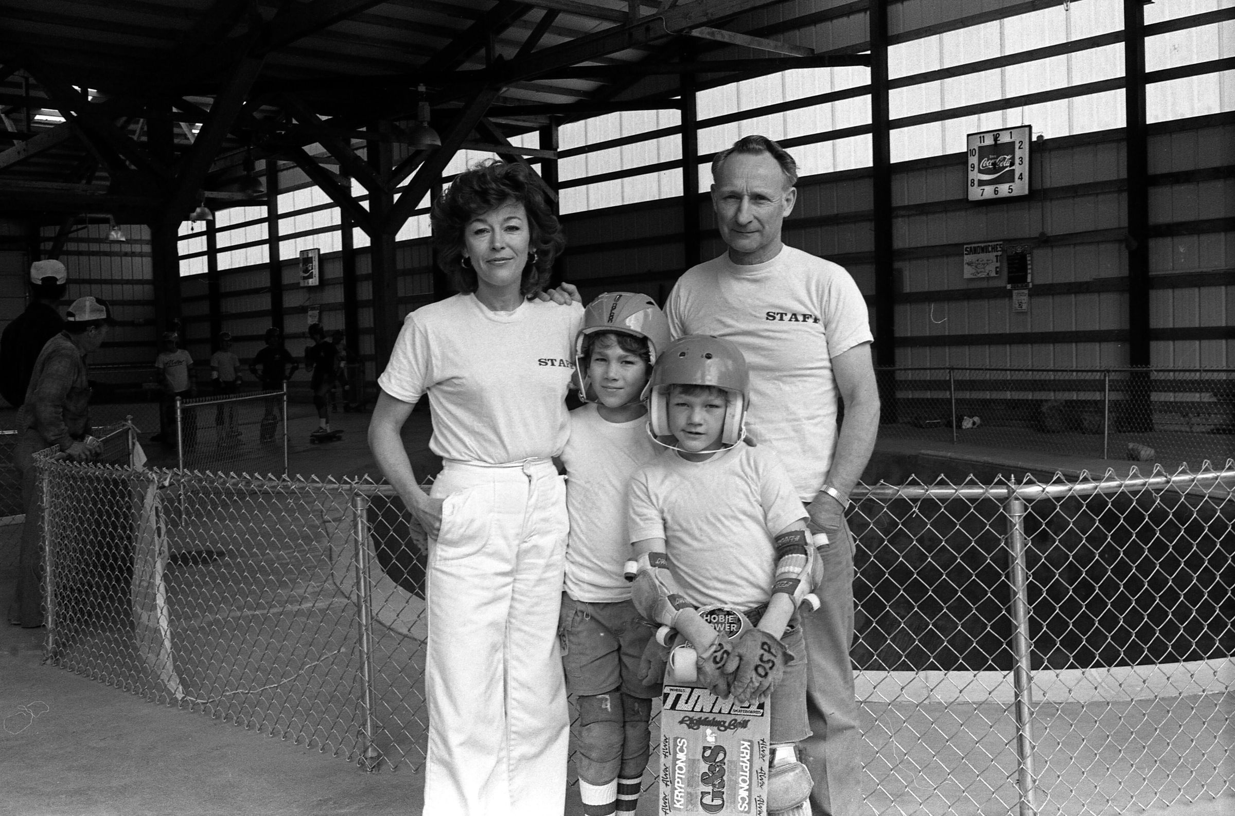 Skateboard Park 5-8-1979. These seven strips of black and white negatives were created for the Lacey Leader newspaper. They depict individuals wearing helmets and pads, skateboarding and performing tricks in the bowls of the park; and one group of people posing.