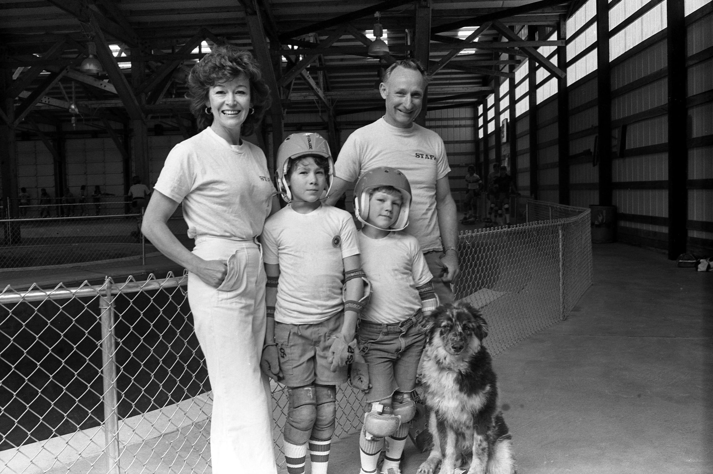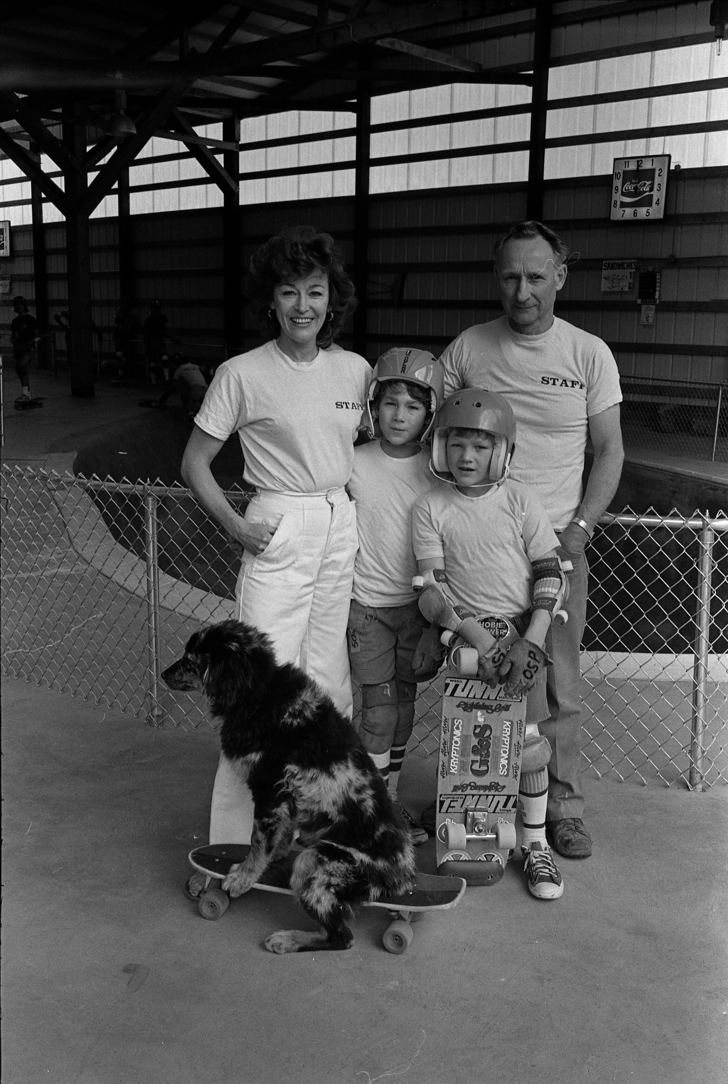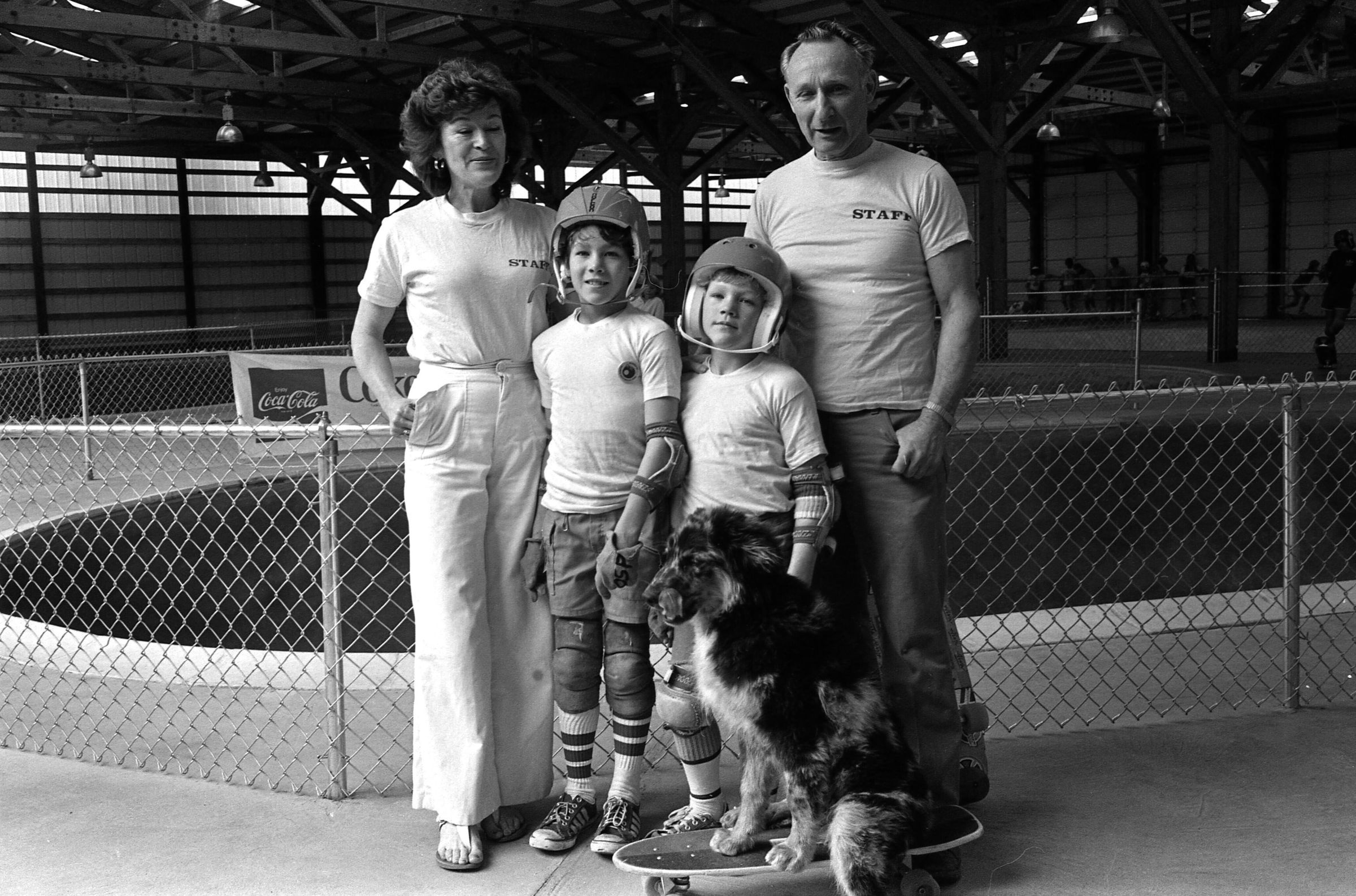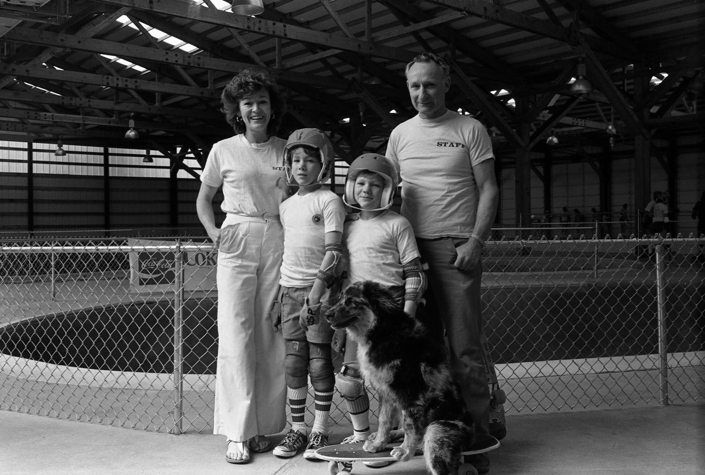 Images 35-41 are of a group of four people posed together. Two adults stand next to each other with two children standing in front of them. The child on the right holds their skateboard vertically in front of them. Another skateboard is on the ground in front of the children. A dog is sitting on the skateboard in all but Images 37 and 38.
