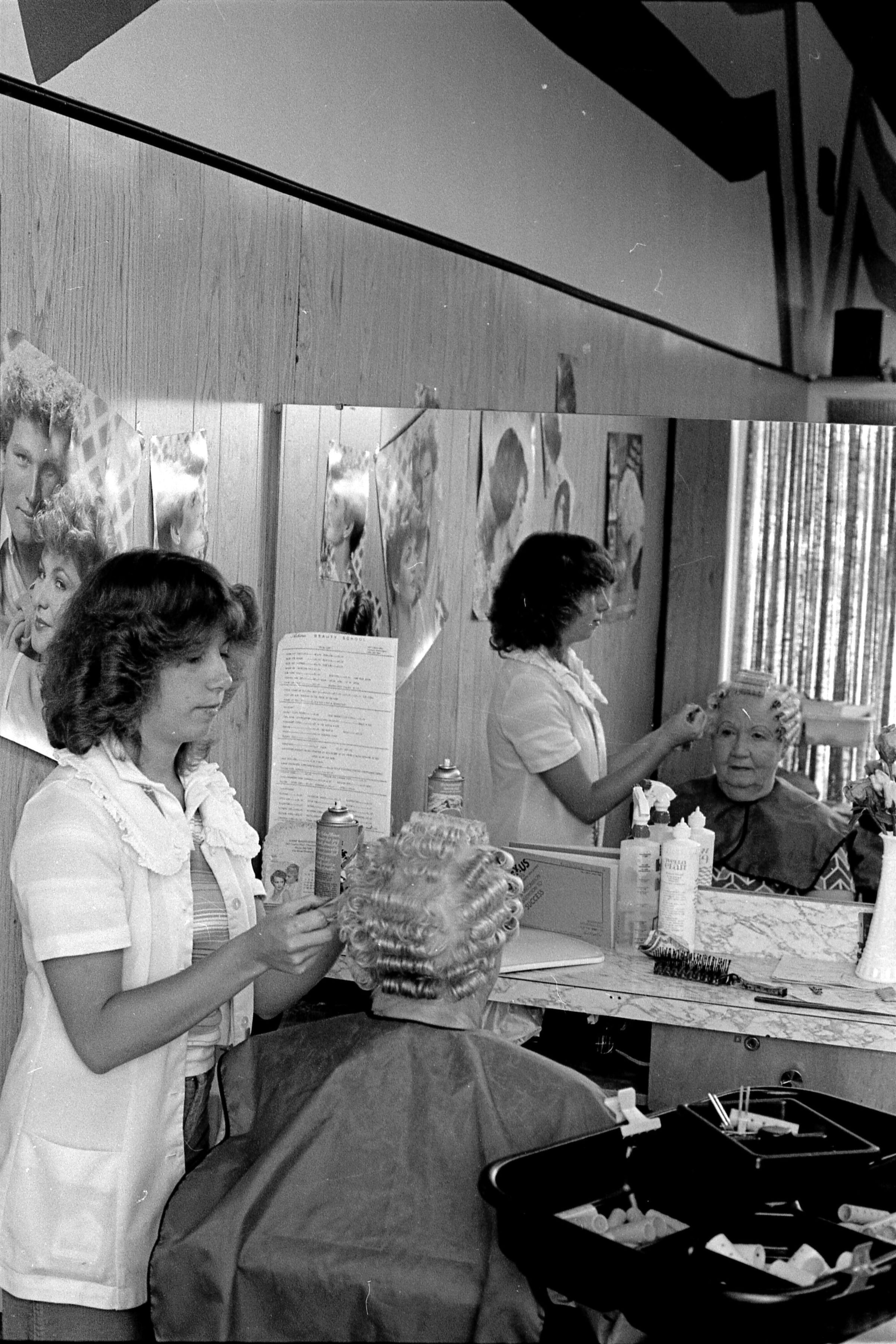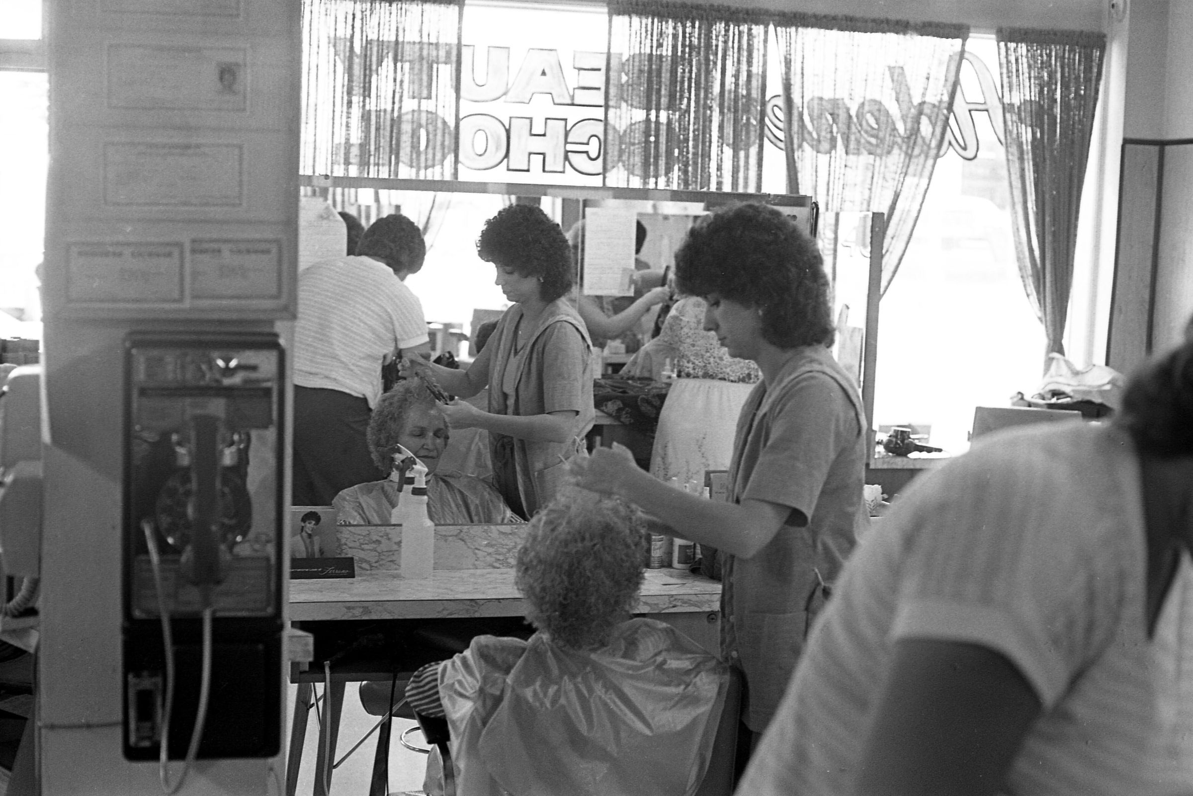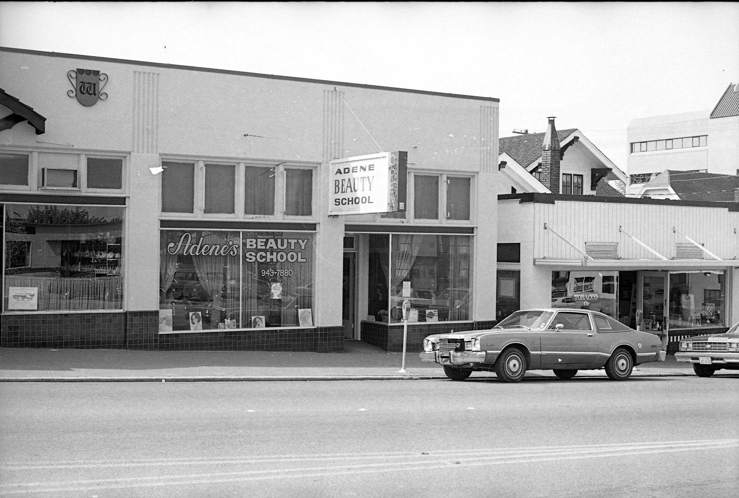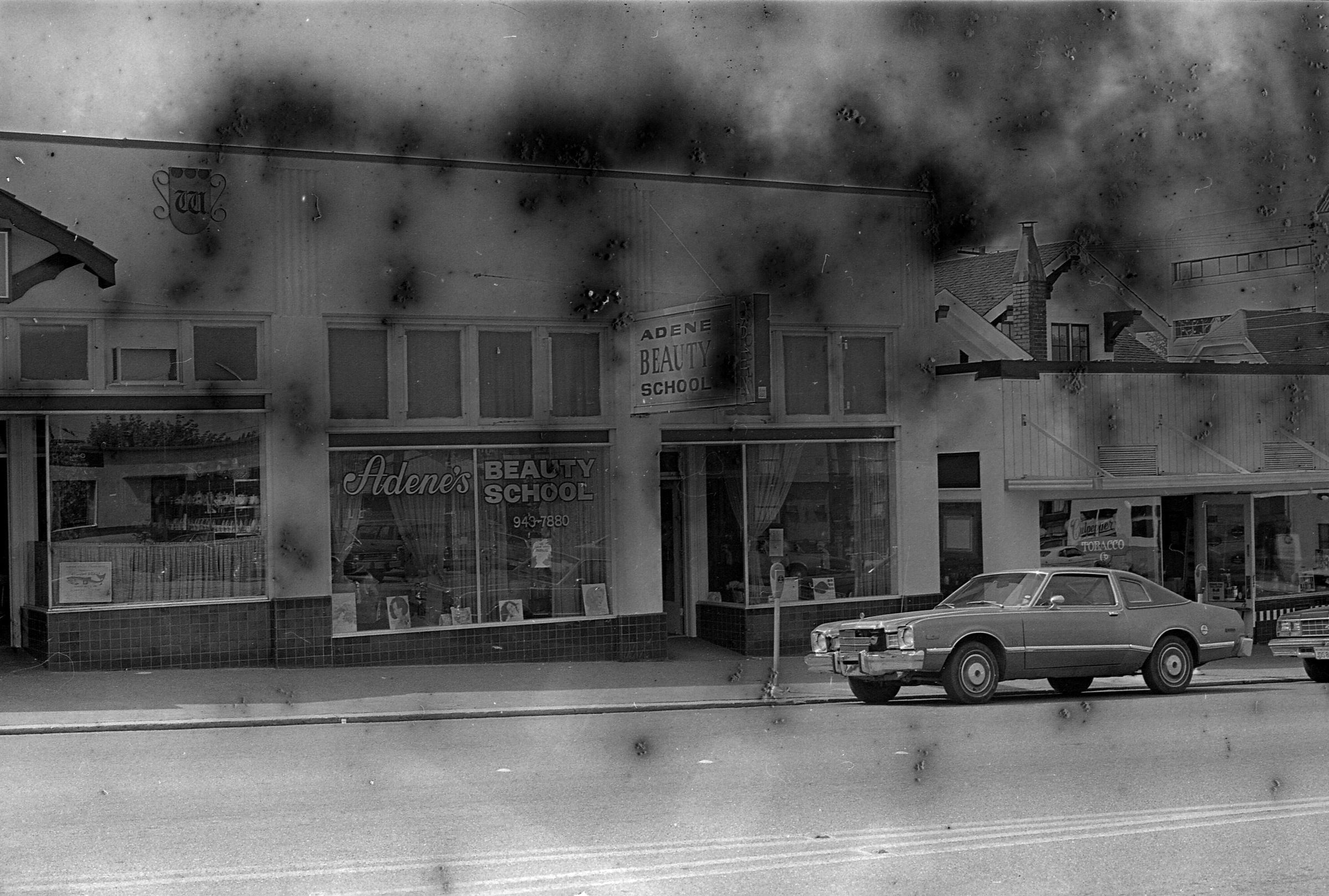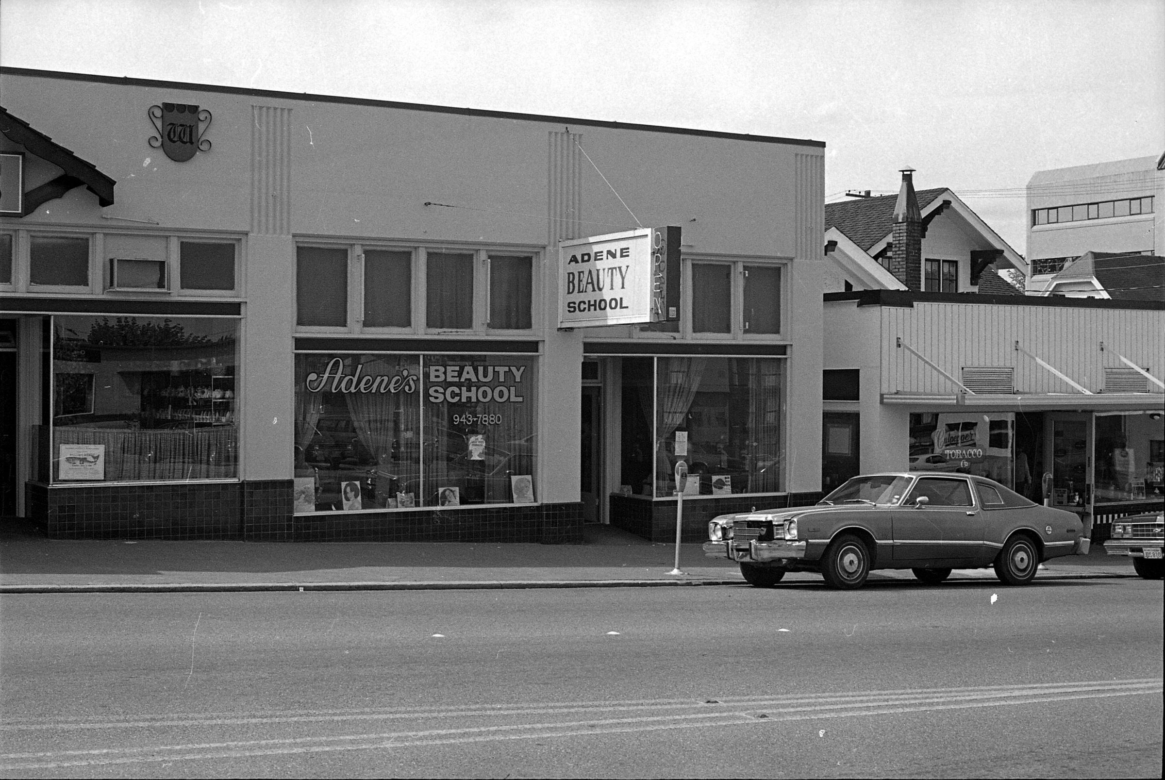 Adene's Beauty School, unknown date. These four strips and one single frame of black and white negatives were created for the Lacey Leader newspaper. They depict the storefront and interior of Adene's Beauty School, featuring individuals performing hair styling and nail manicures, and customers having their hair styled and nails manicured.