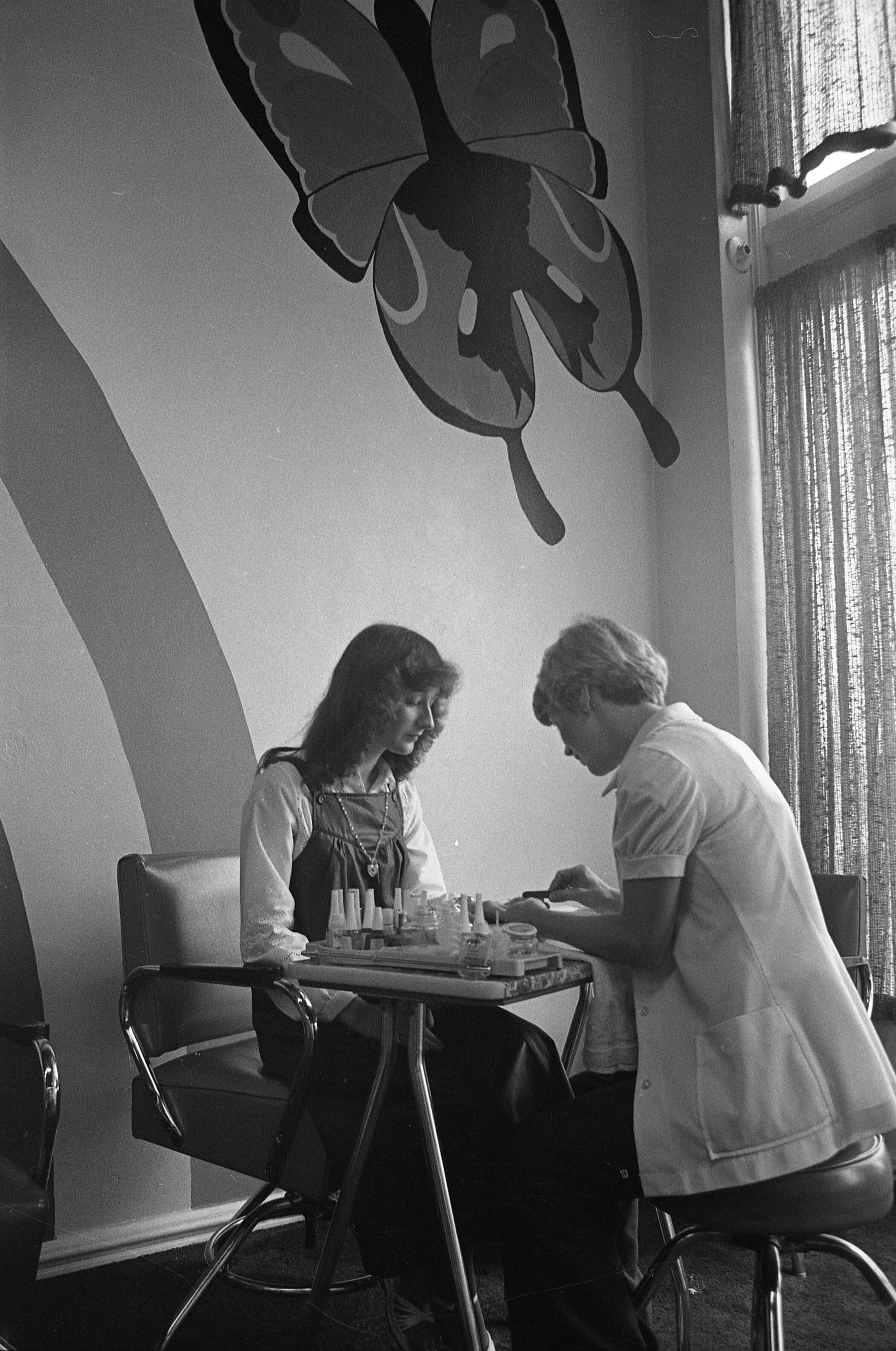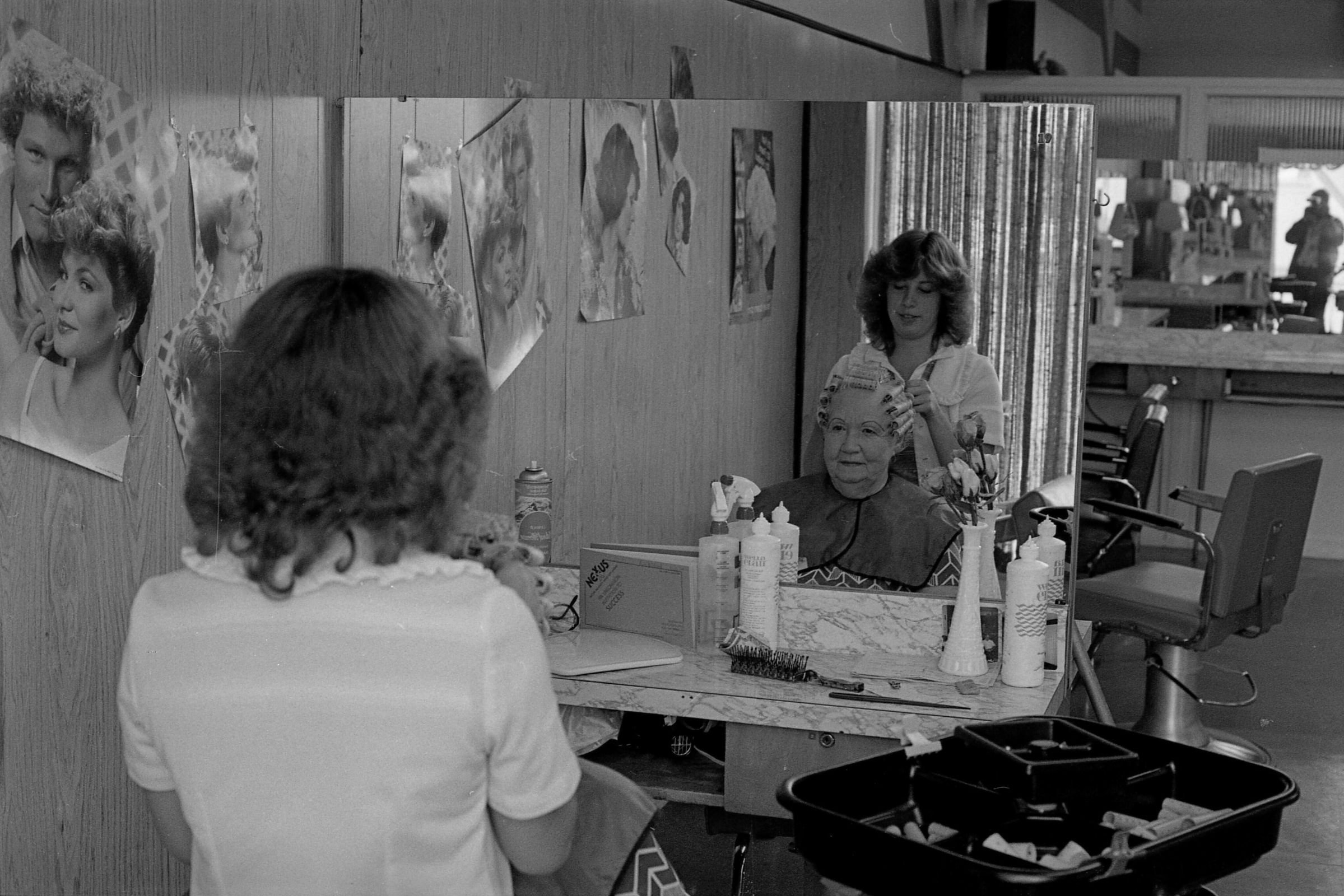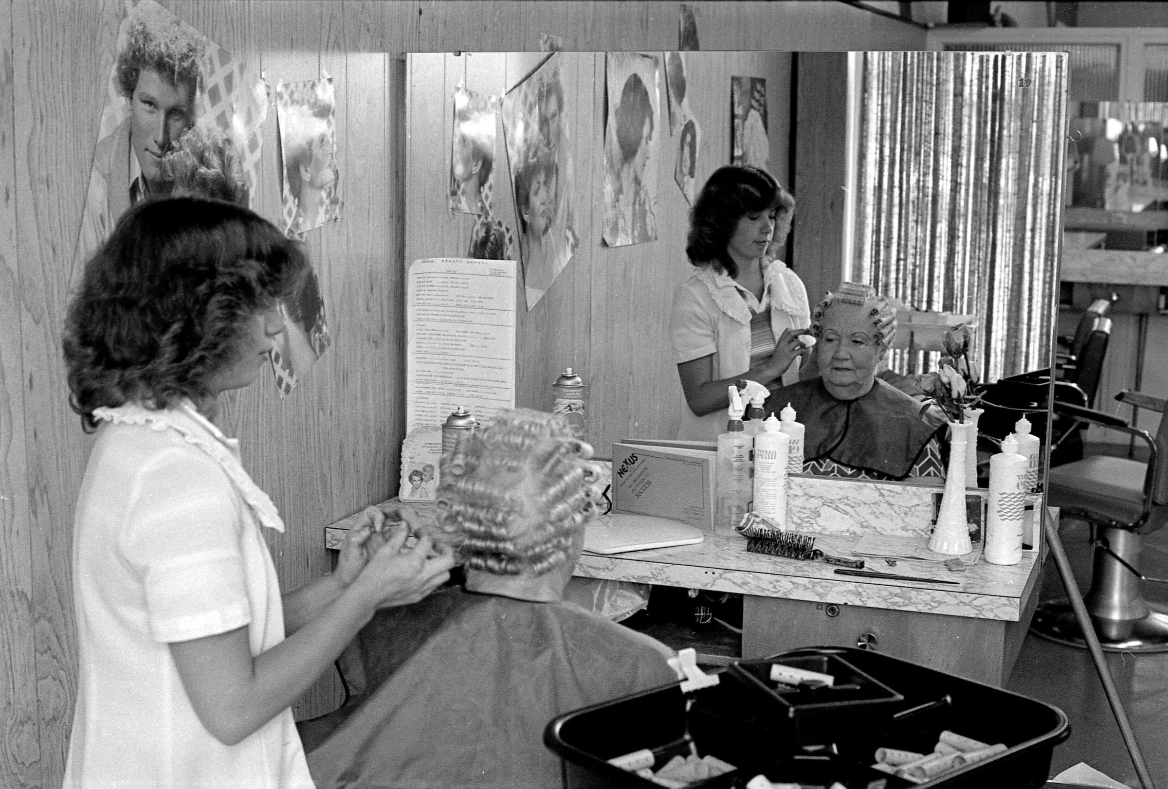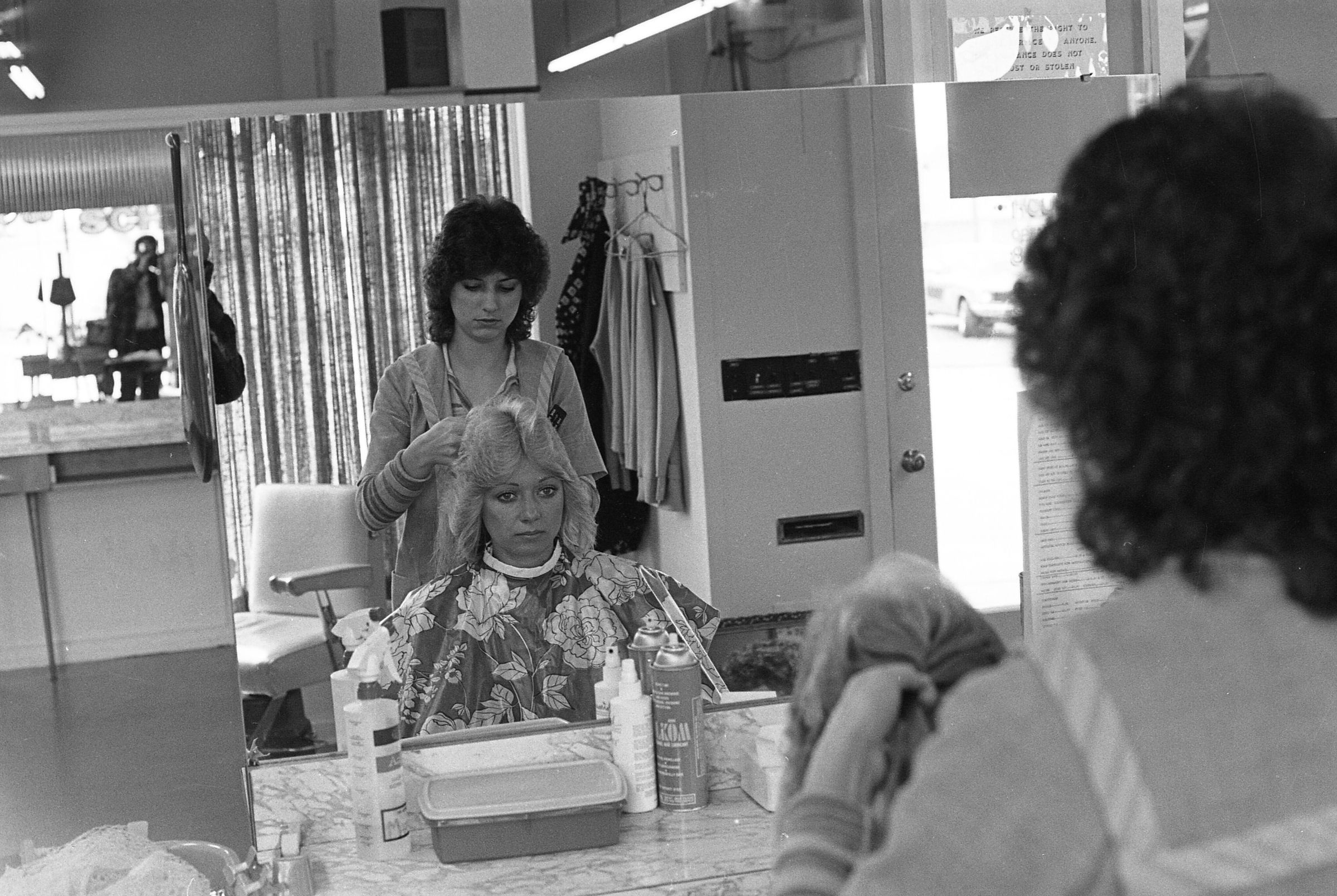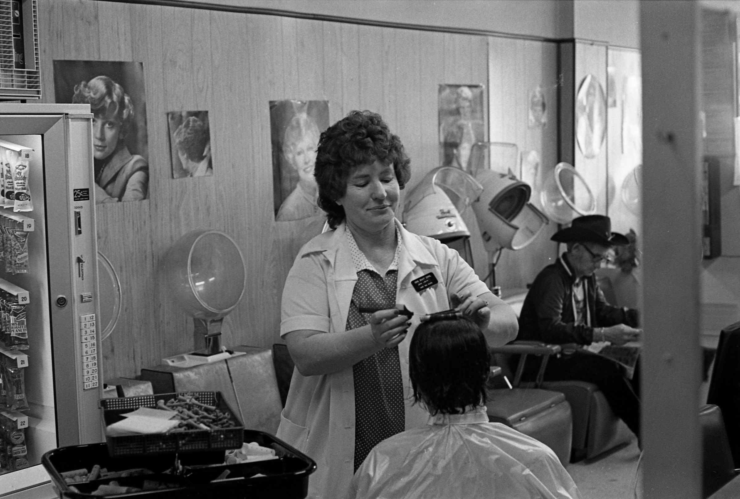 Adene's Beauty School, unknown date. These four strips and one single frame of black and white negatives were created for the Lacey Leader newspaper. They depict the storefront and interior of Adene's Beauty School, featuring individuals performing hair styling and nail manicures, and customers having their hair styled and nails manicured.