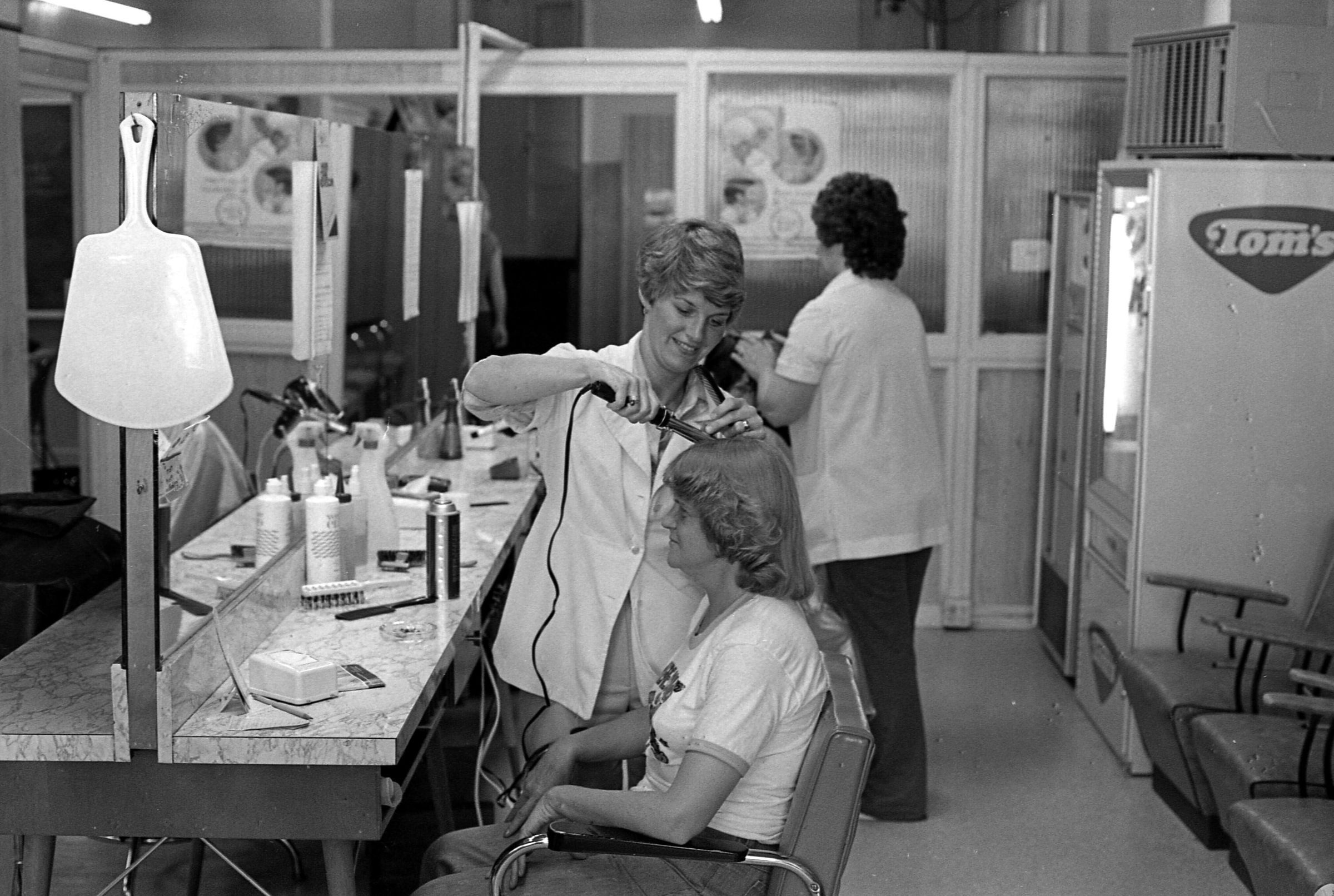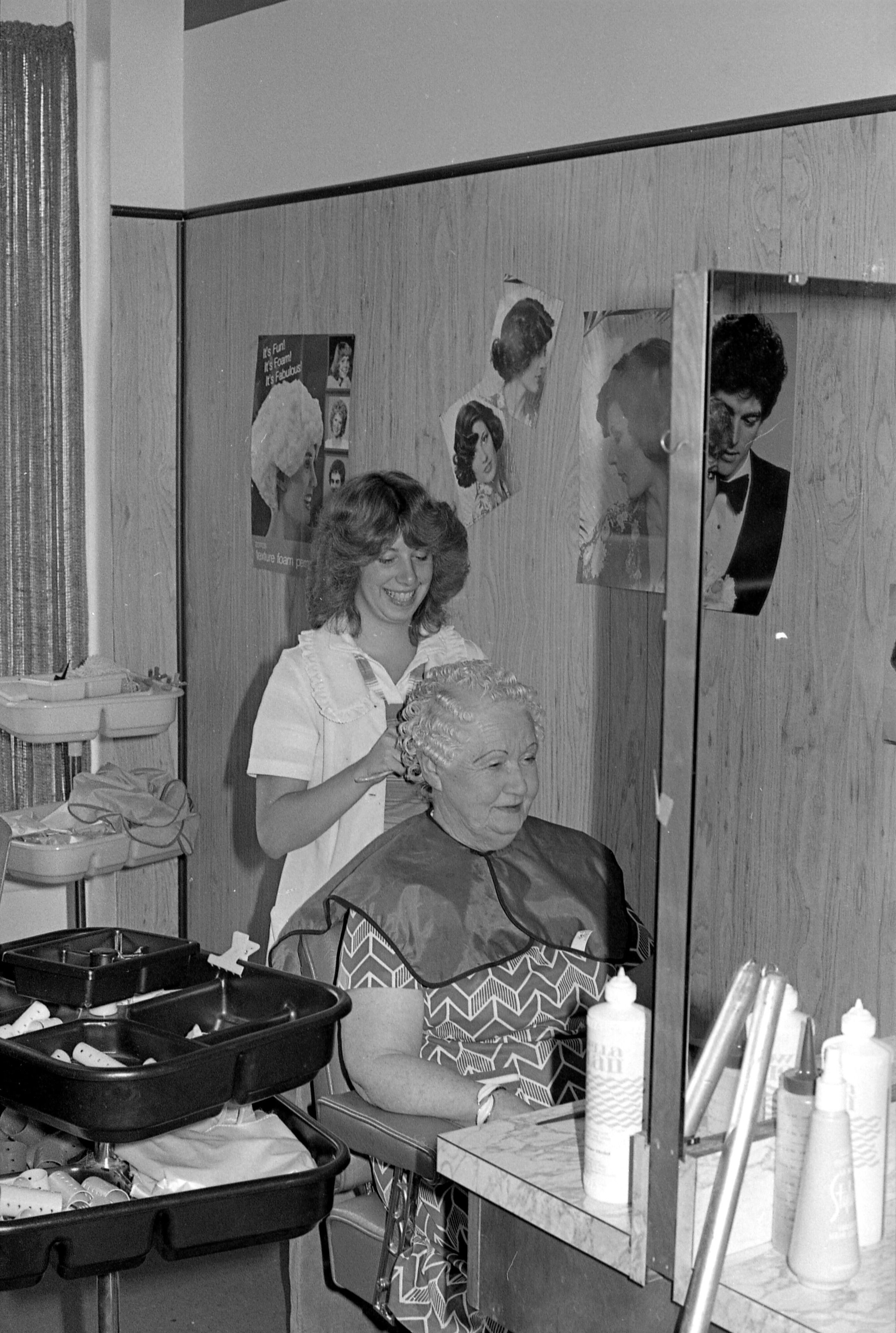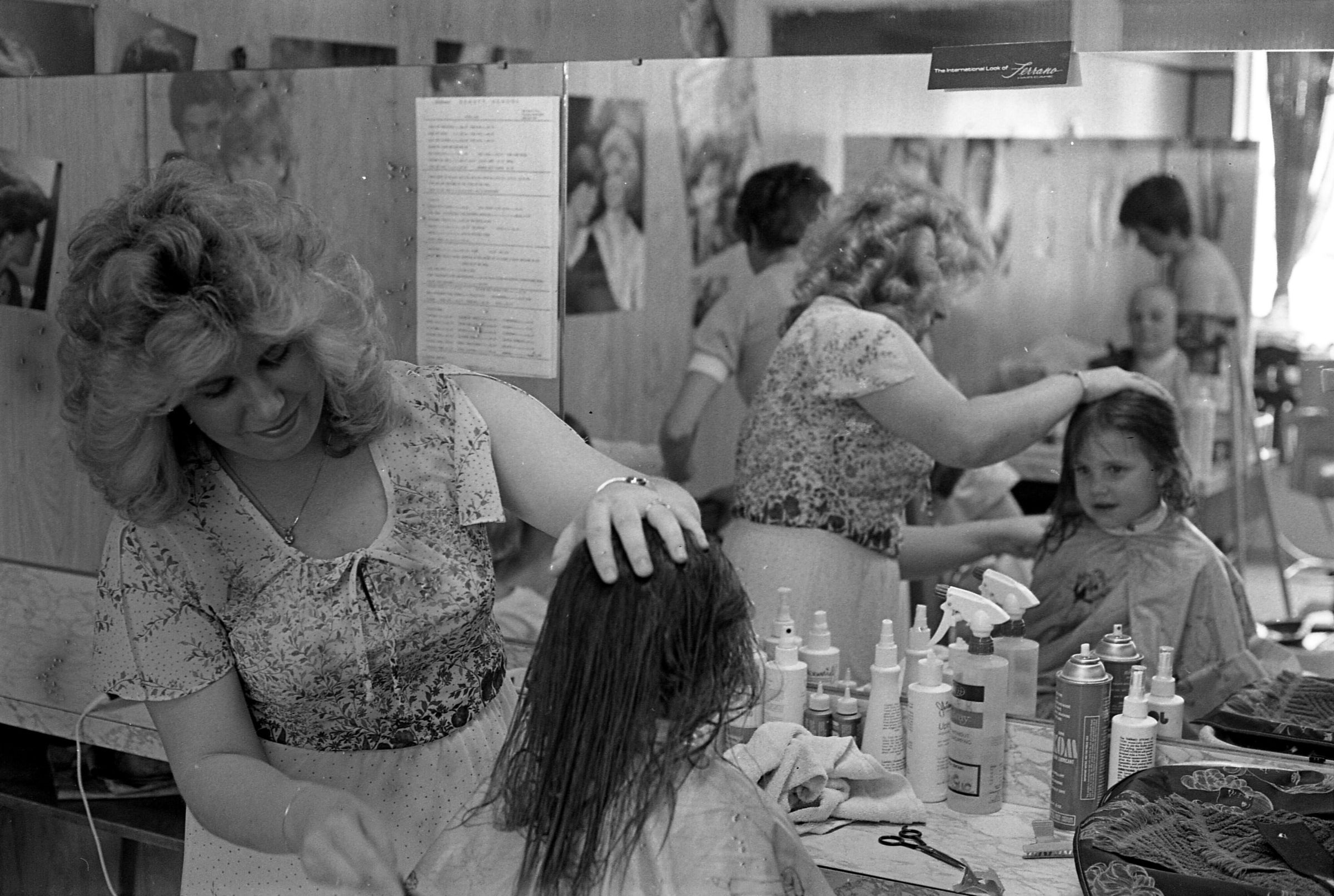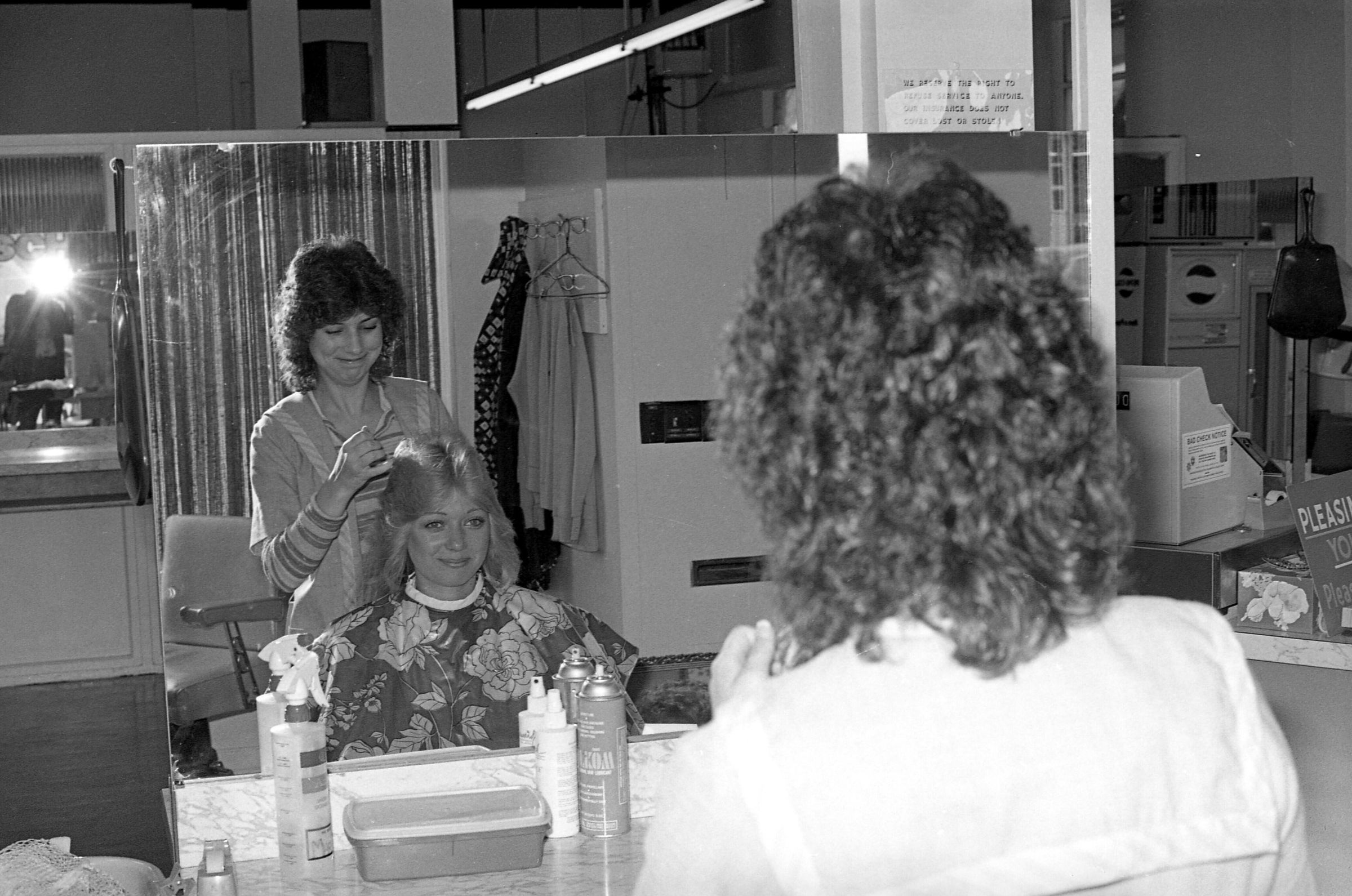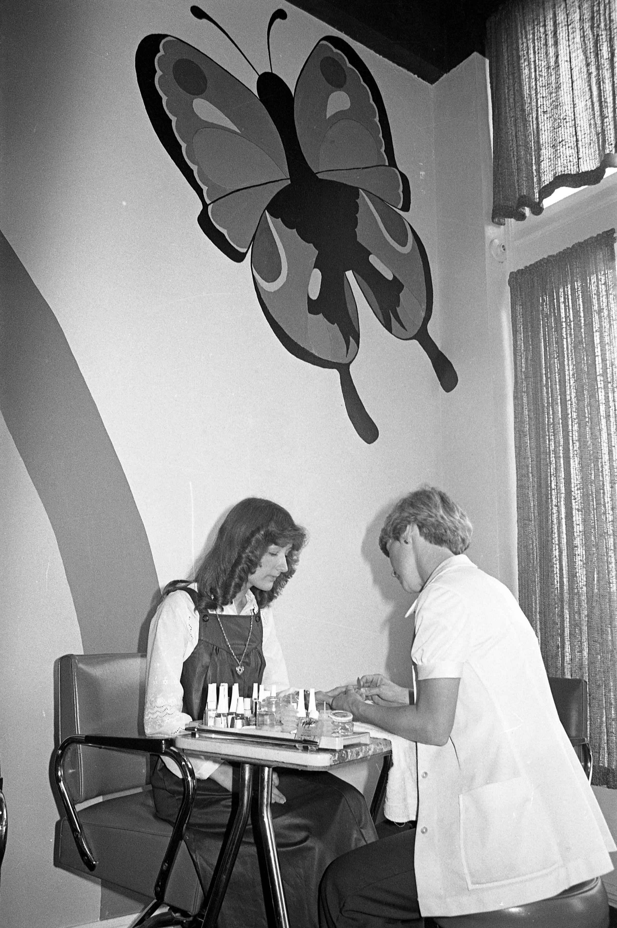 Adene's Beauty School, unknown date. These four strips and one single frame of black and white negatives were created for the Lacey Leader newspaper. They depict the storefront and interior of Adene's Beauty School, featuring individuals performing hair styling and nail manicures, and customers having their hair styled and nails manicured.