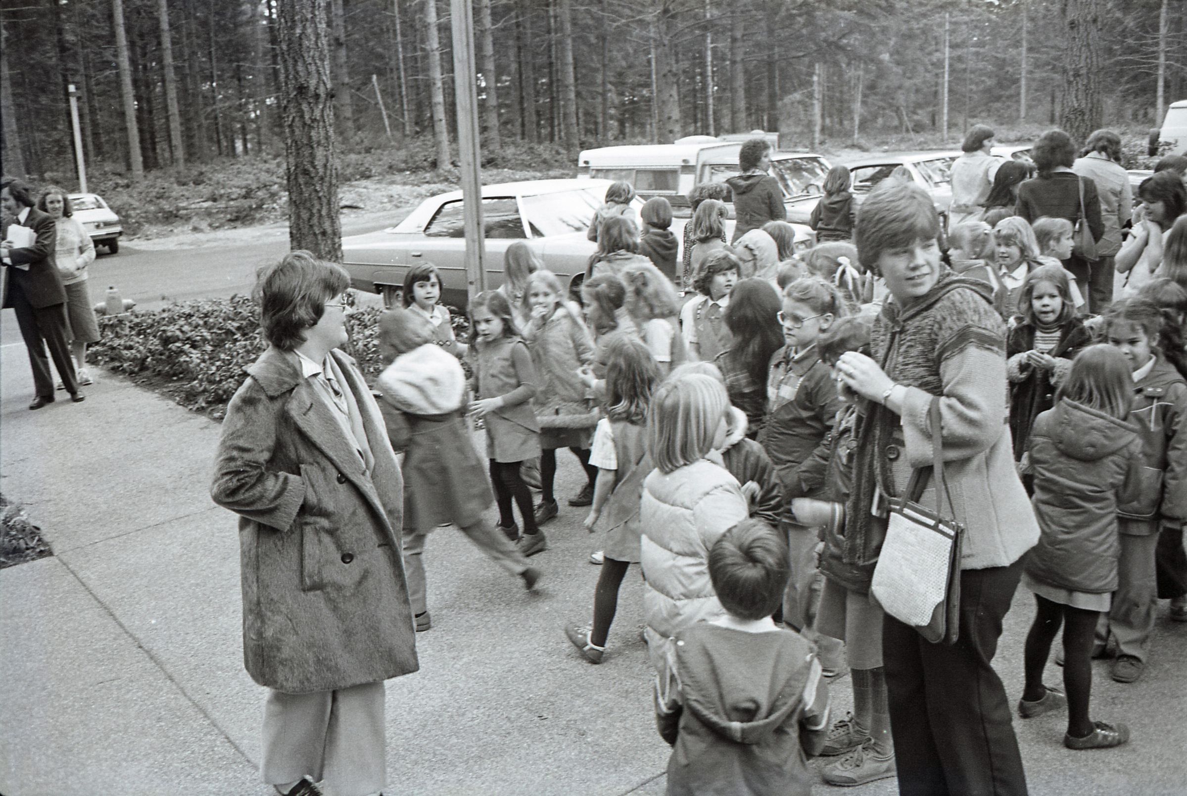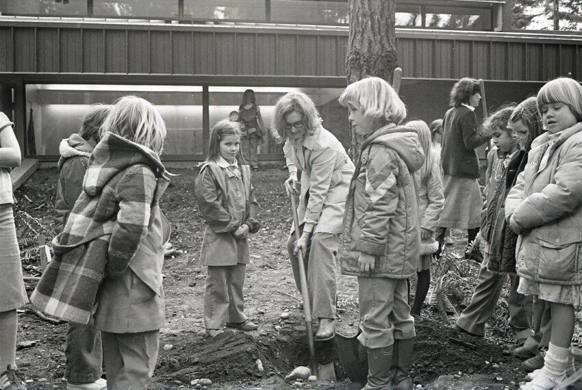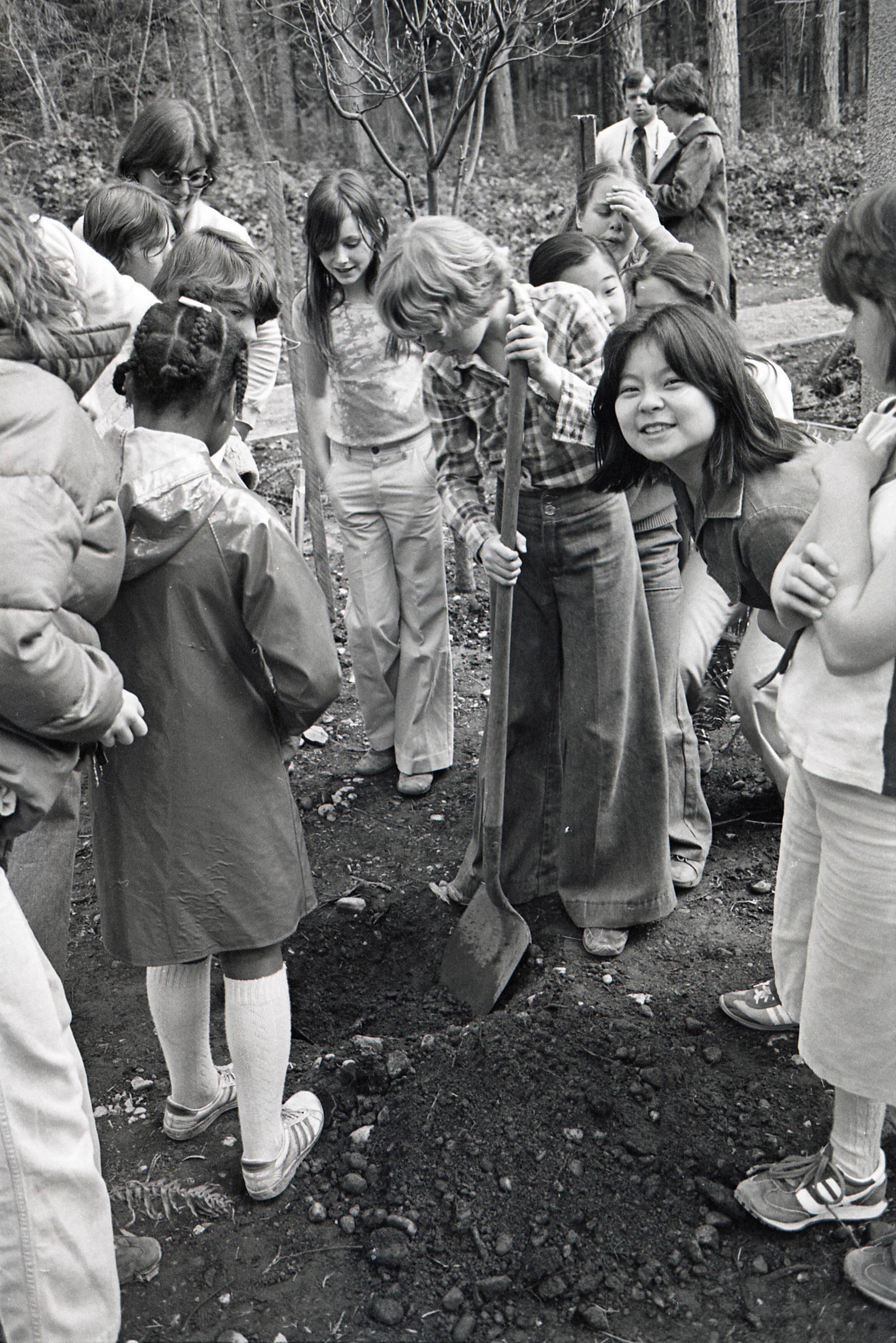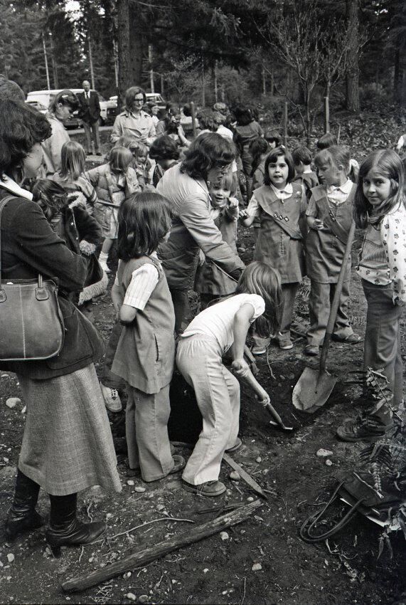 Karen Fraser, Arbor Day, 1979. These eight black and white film negative strips were created for the Lacey Leader newspaper. These images show Karen Fraser, several unknown adults and many unknown children participating in an Arbor Day tree planting project. At least most of these images were captured outside the Lacey City Hall.
