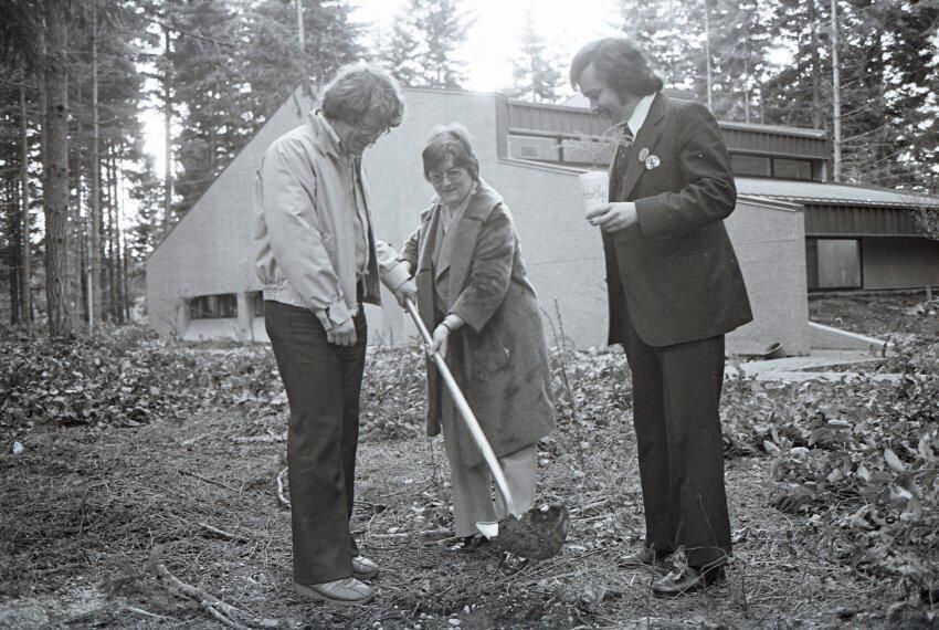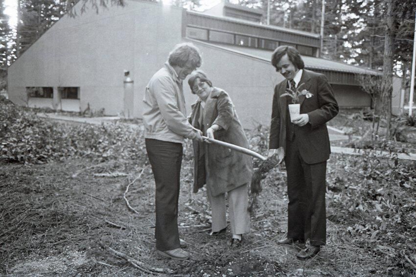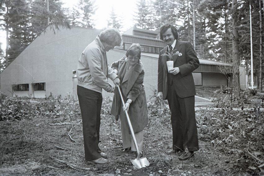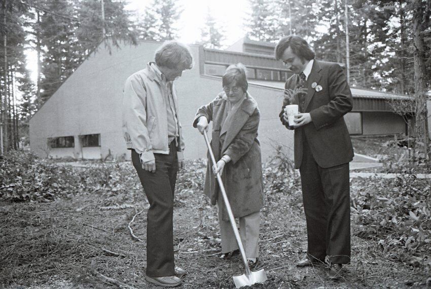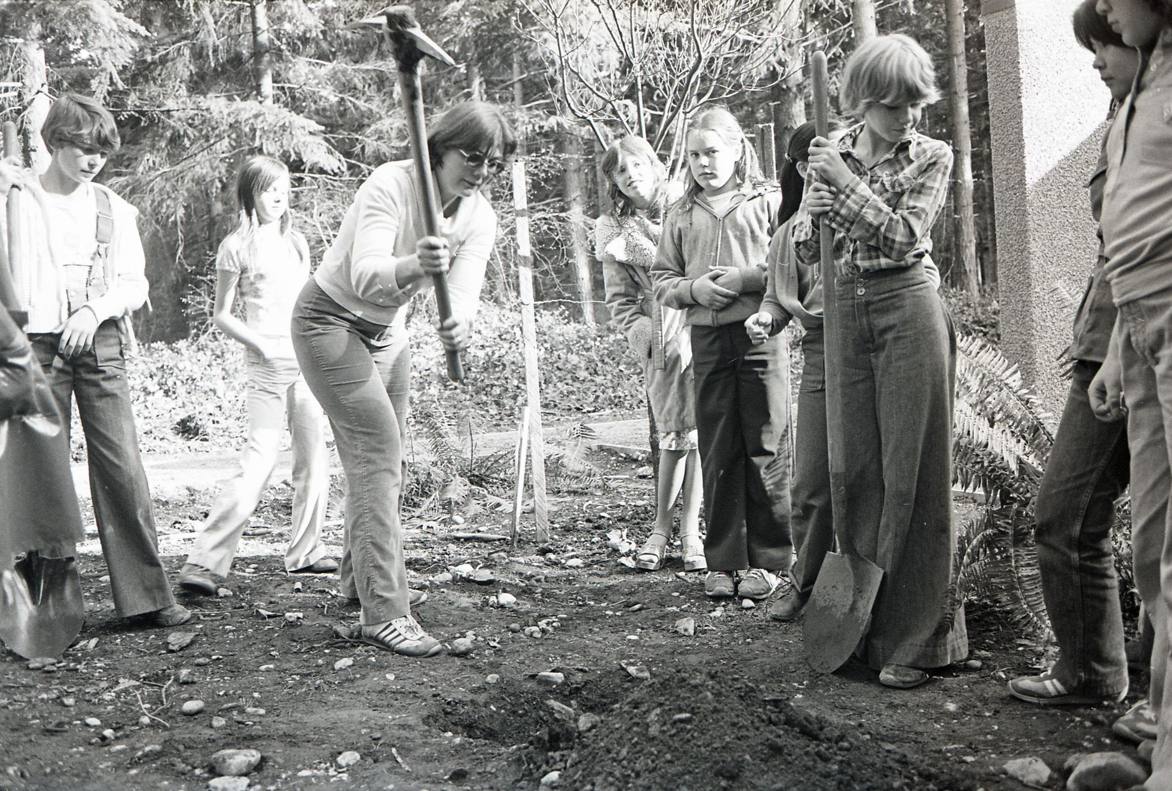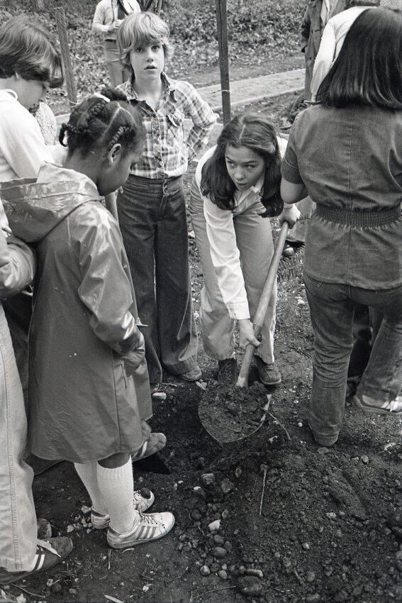 Karen Fraser, Arbor Day, 1979. These eight black and white film negative strips were created for the Lacey Leader newspaper. These images show Karen Fraser, several unknown adults and many unknown children participating in an Arbor Day tree planting project. At least most of these images were captured outside the Lacey City Hall.