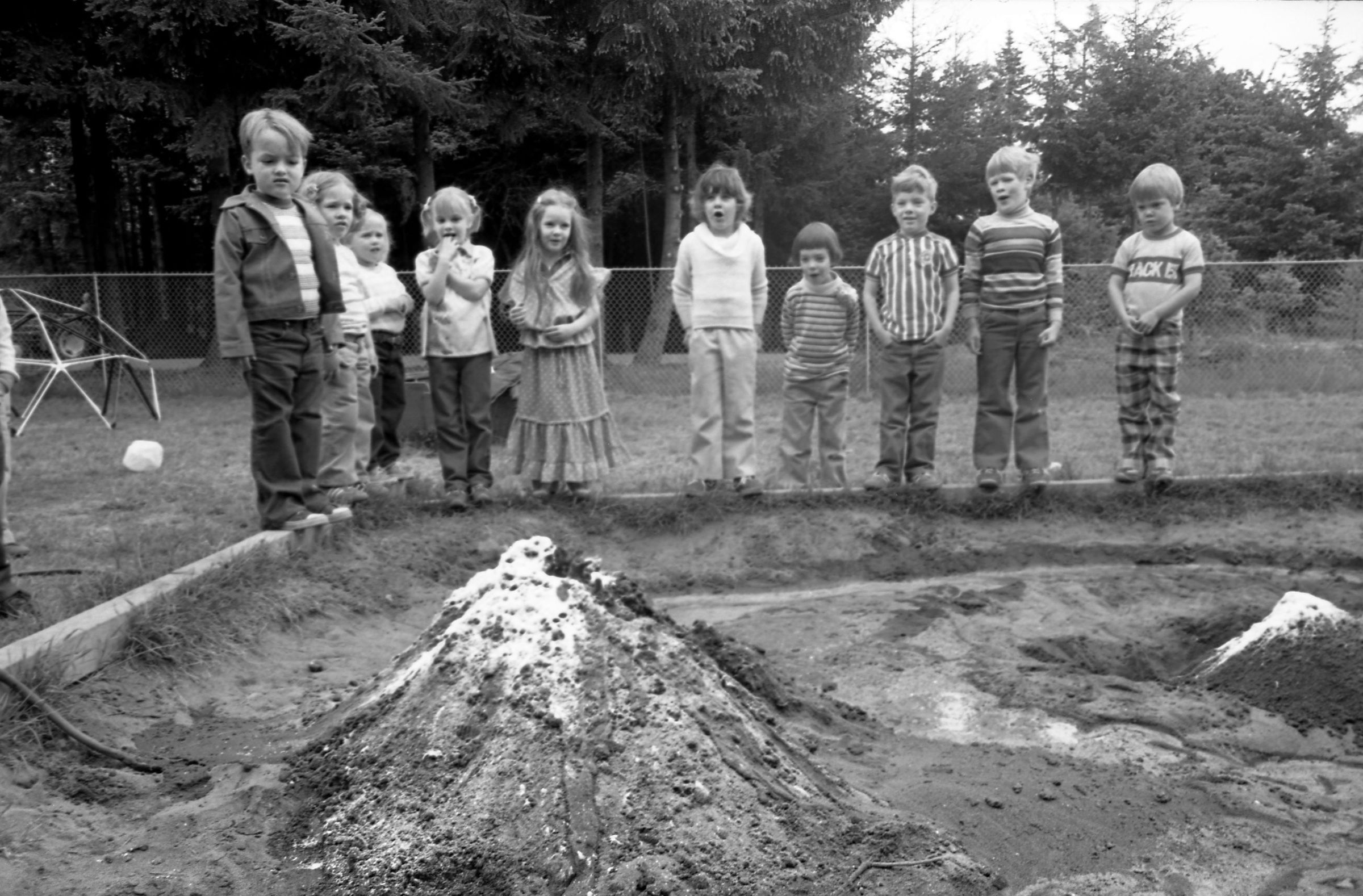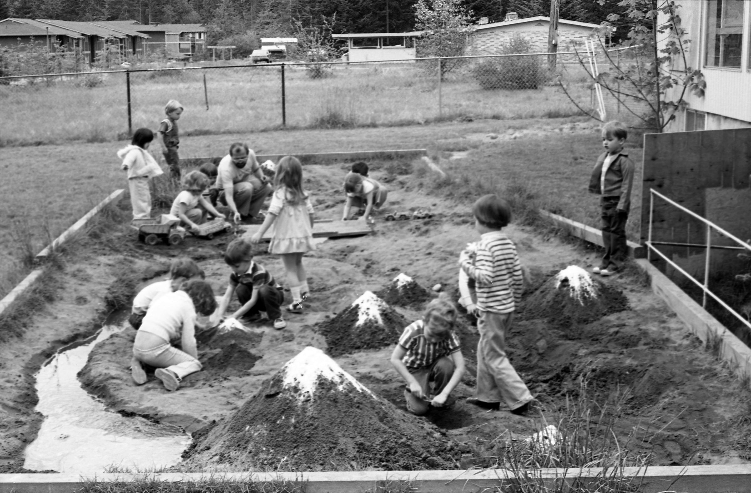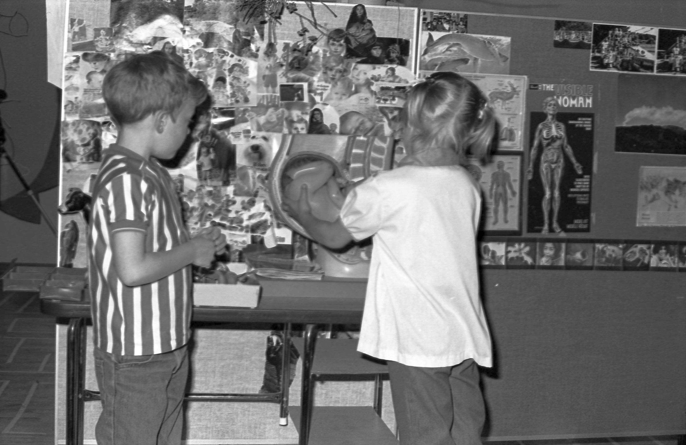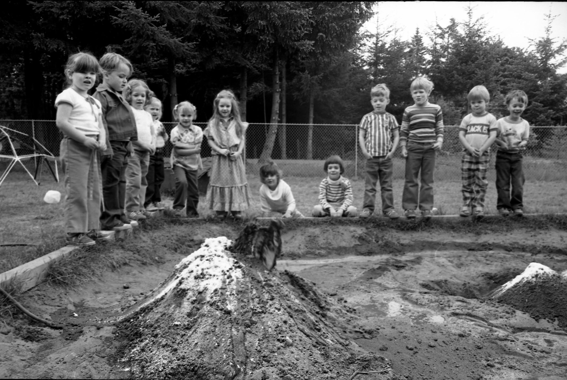 Child End Daycare (sic) Center, unknown date. These four black and white negative strips were created for the Lacey Leader newspaper. They depict several children participating in educational activities including "volcanoes" made of dirt or sand, and a model of a human baby in the uterus.Made/Created