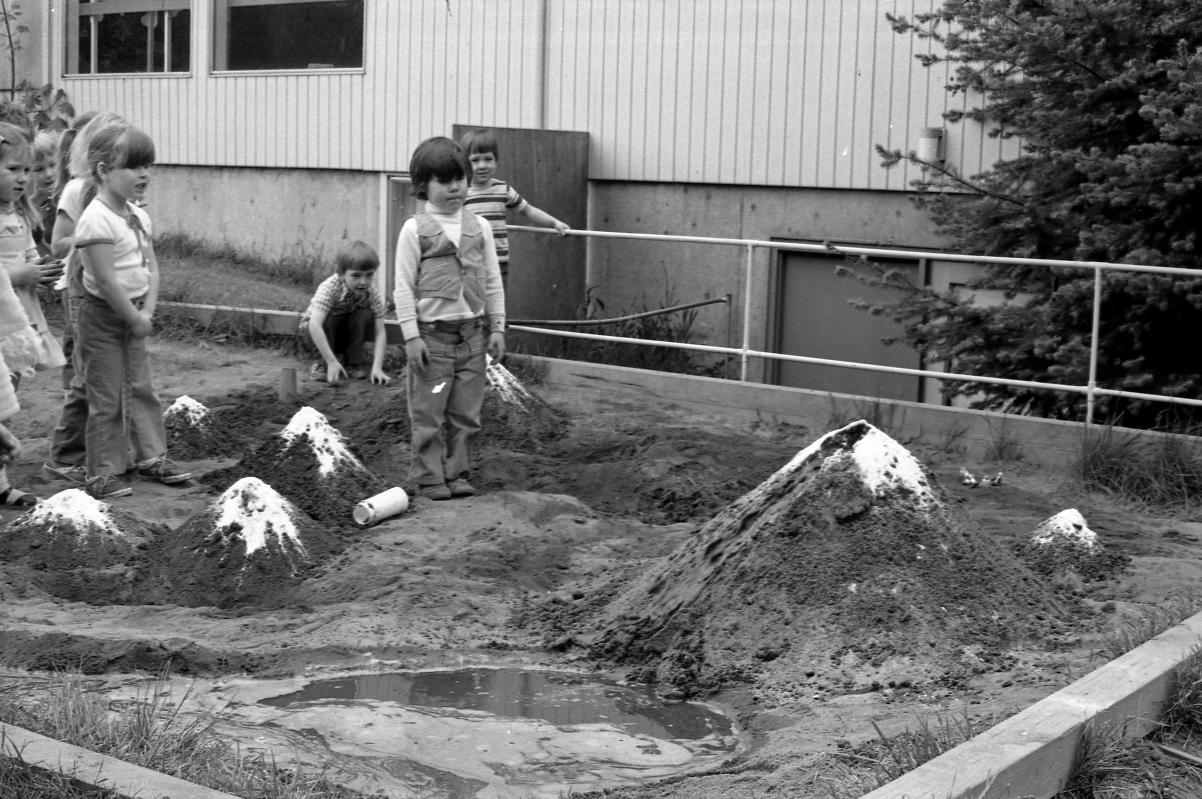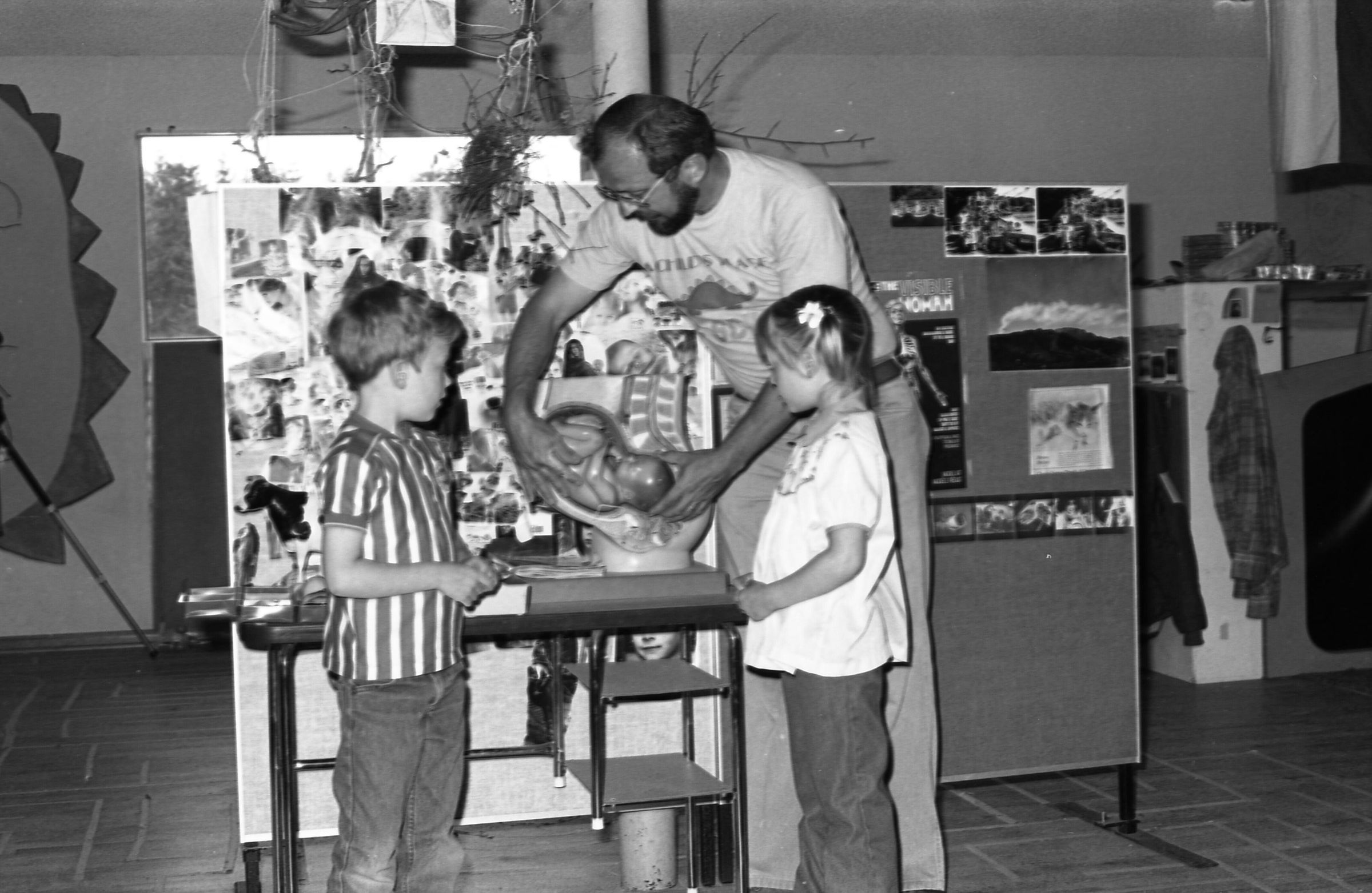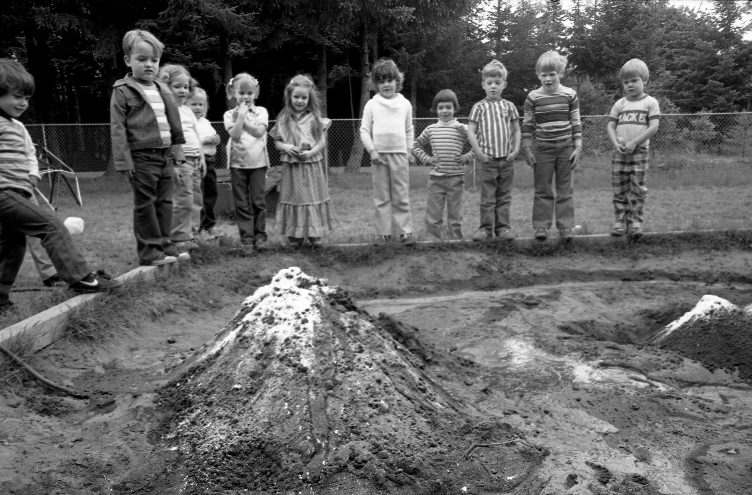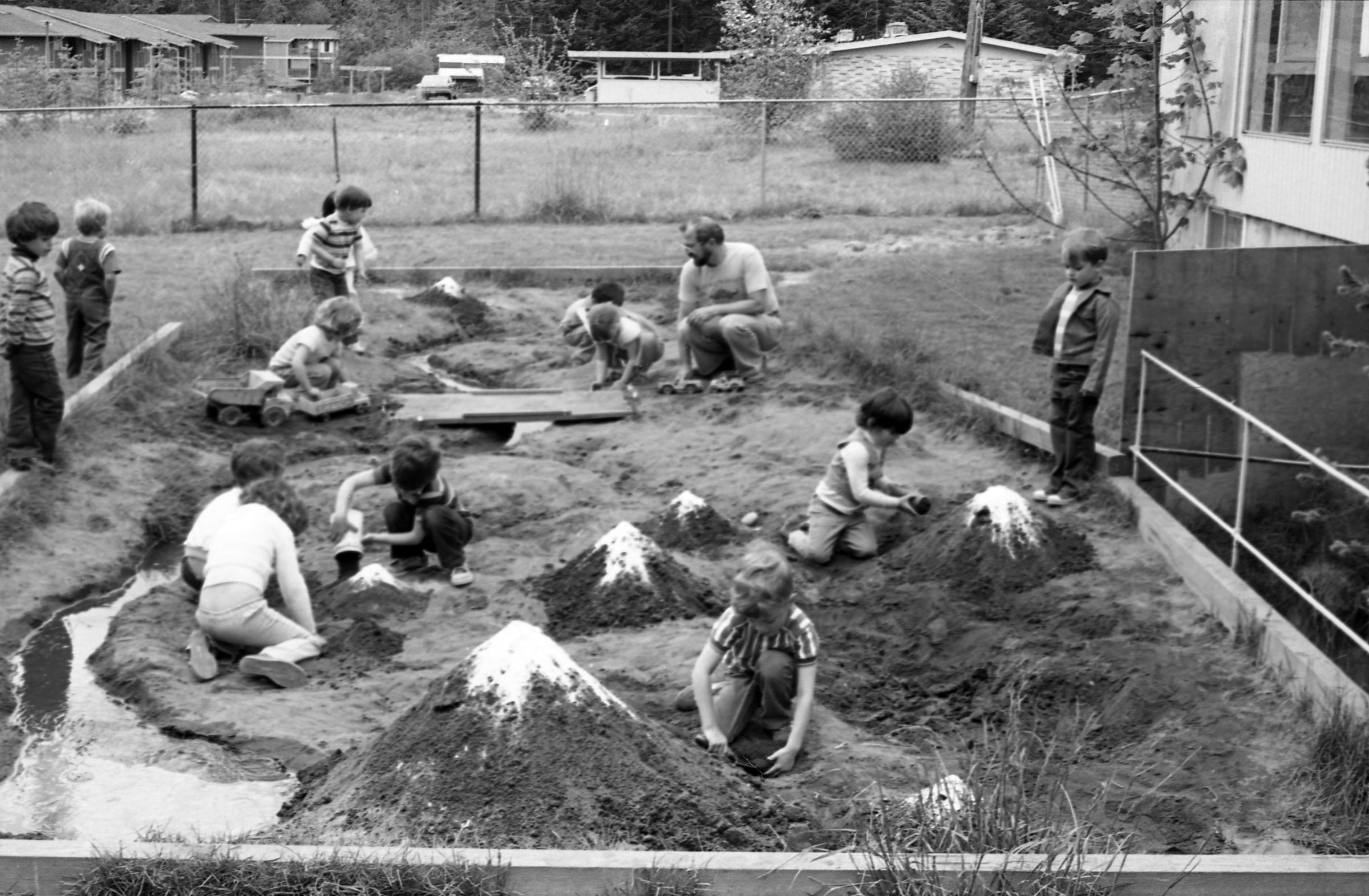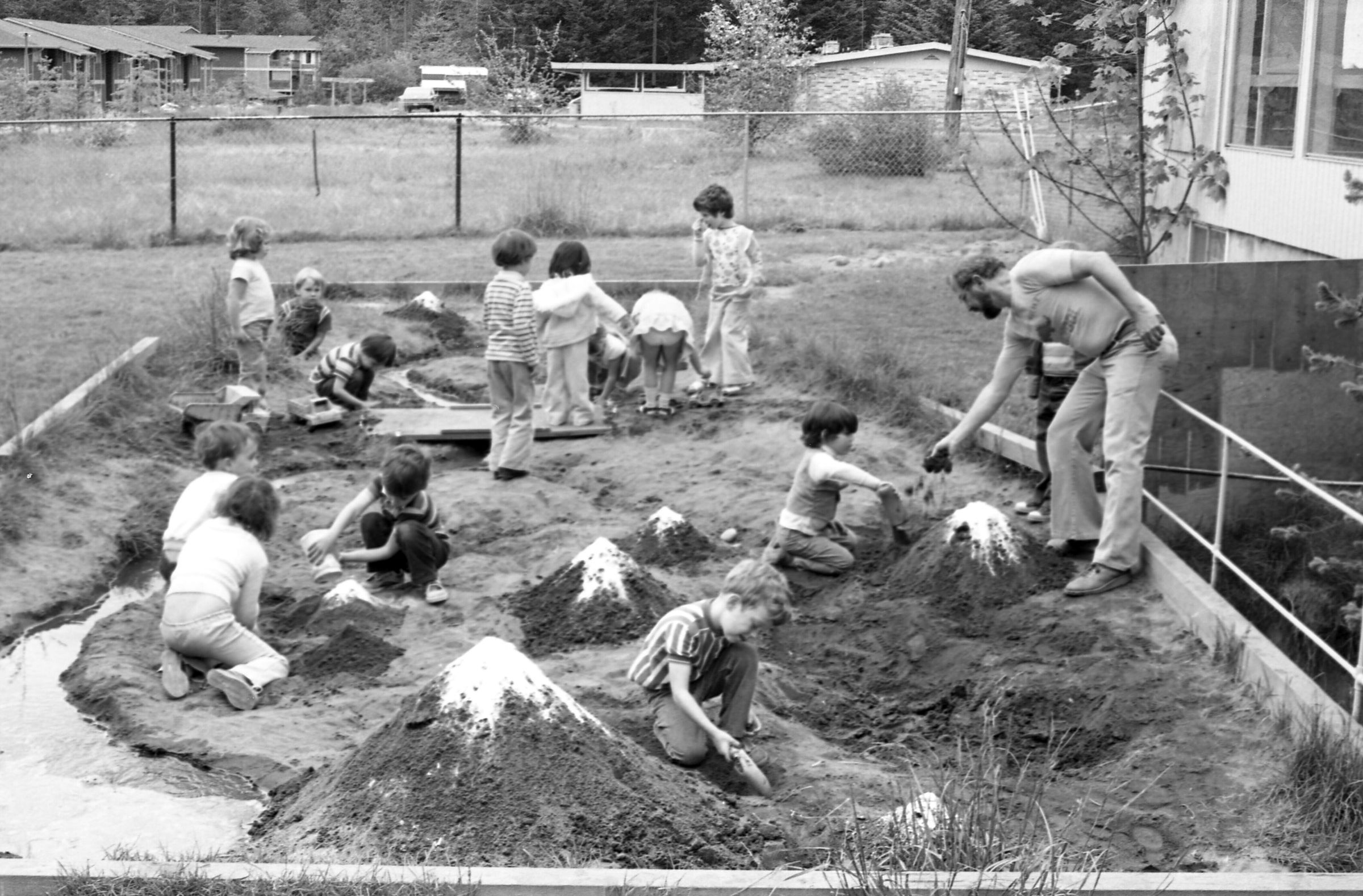 Child End Daycare (sic) Center, unknown date. These four black and white negative strips were created for the Lacey Leader newspaper. They depict several children participating in educational activities including "volcanoes" made of dirt or sand, and a model of a human baby in the uterus.Made/Created