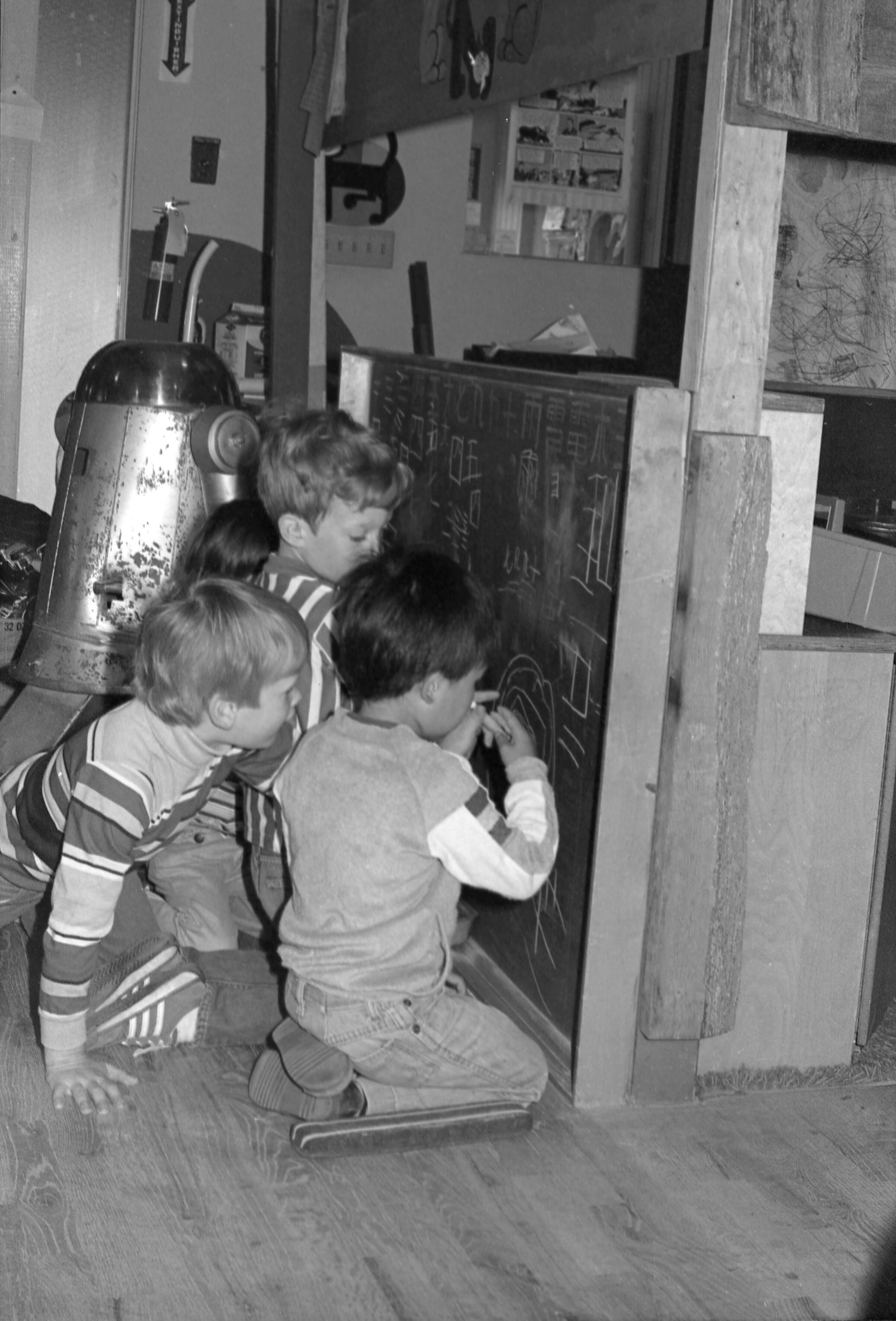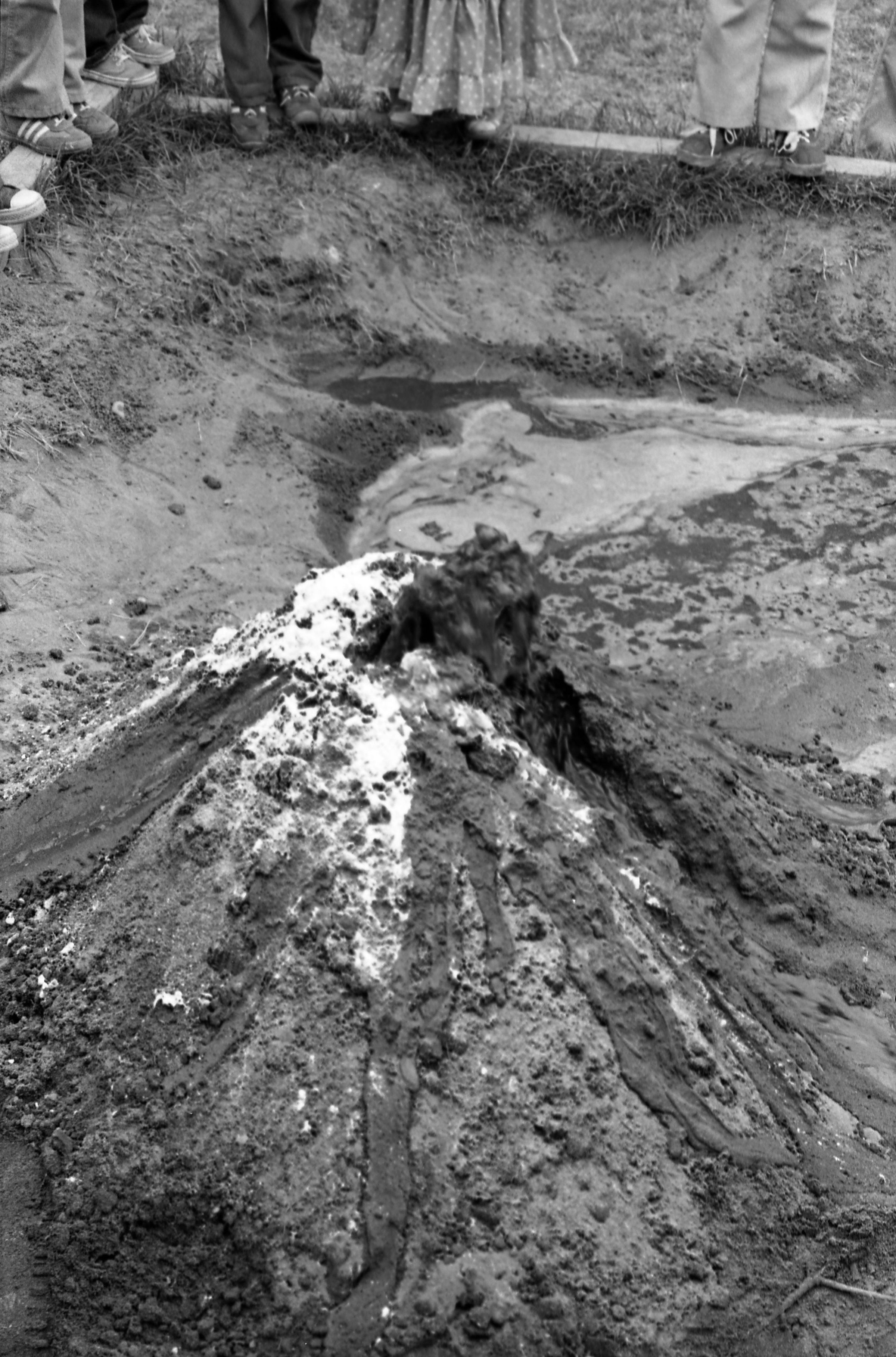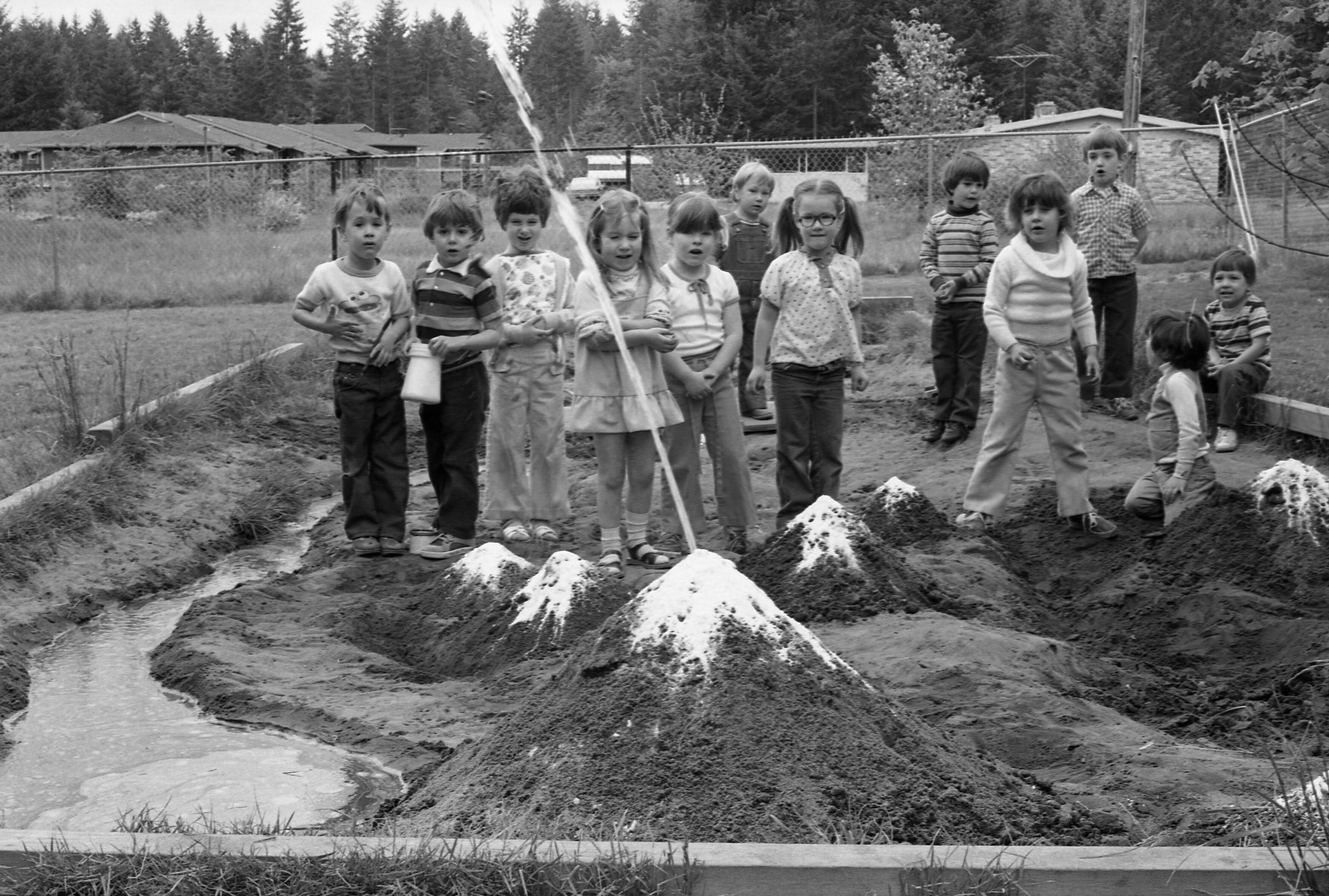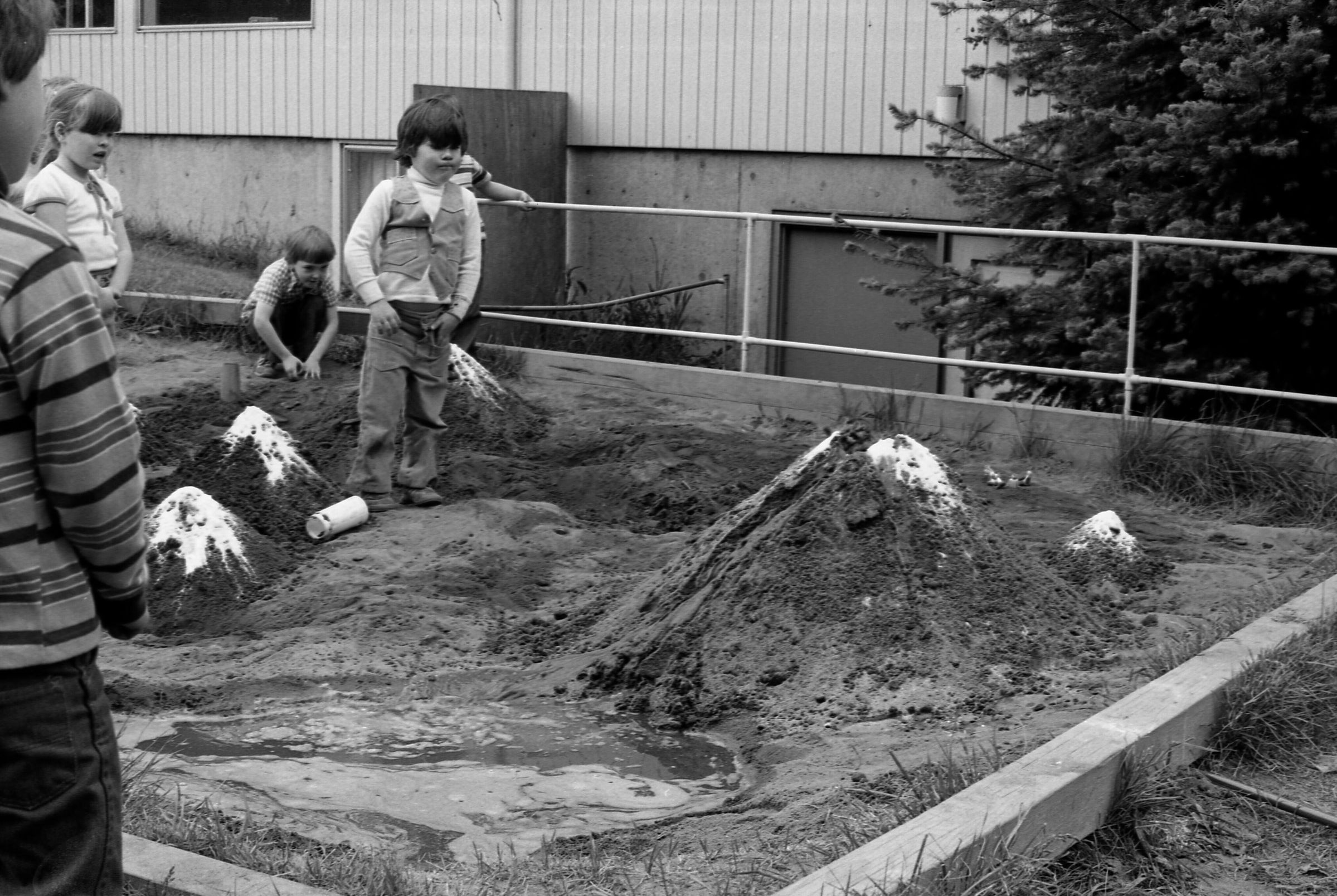 Child End Daycare (sic) Center, unknown date. These four black and white negative strips were created for the Lacey Leader newspaper. They depict several children participating in educational activities including "volcanoes" made of dirt or sand, and a model of a human baby in the uterus.Made/Created