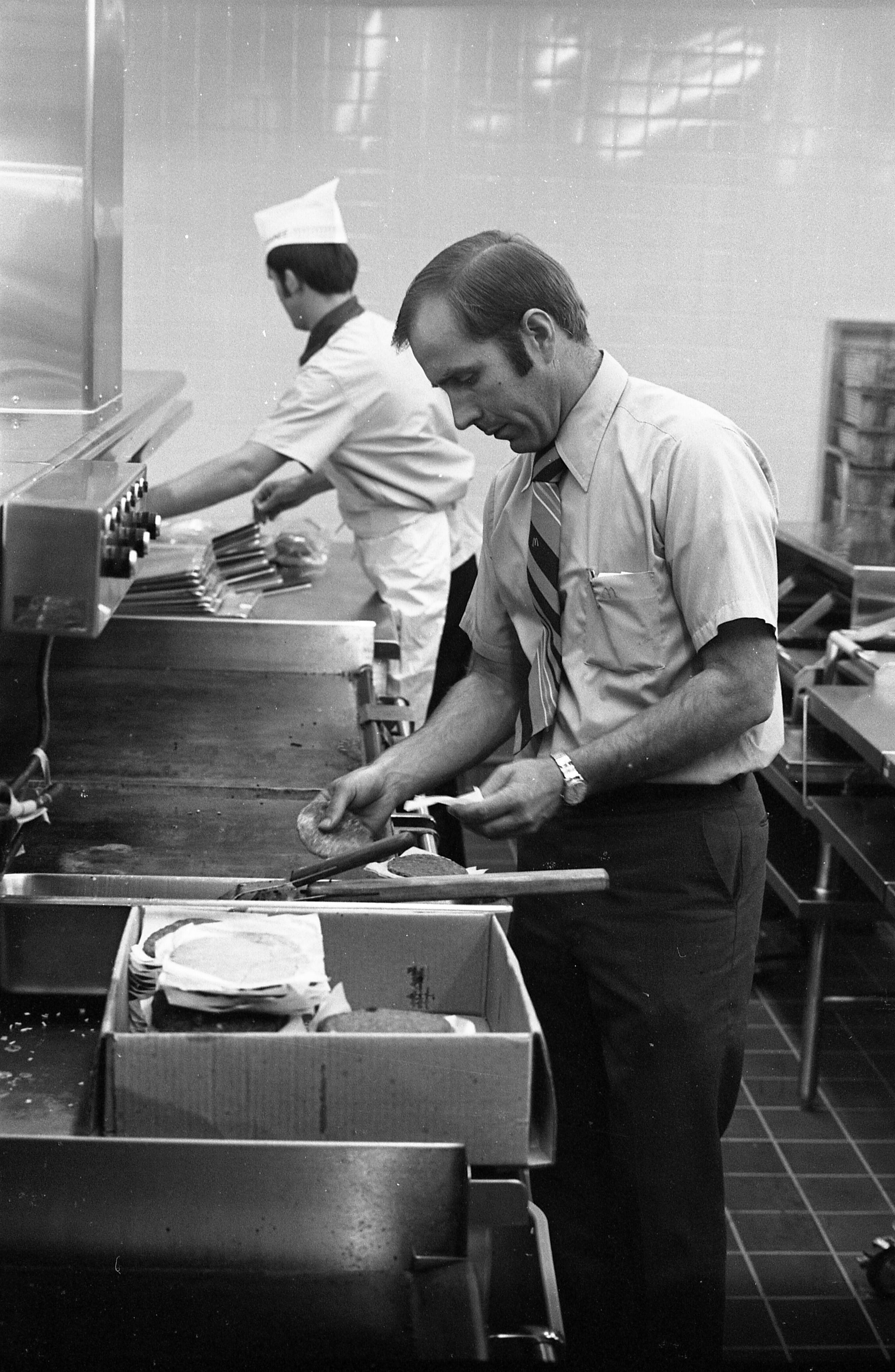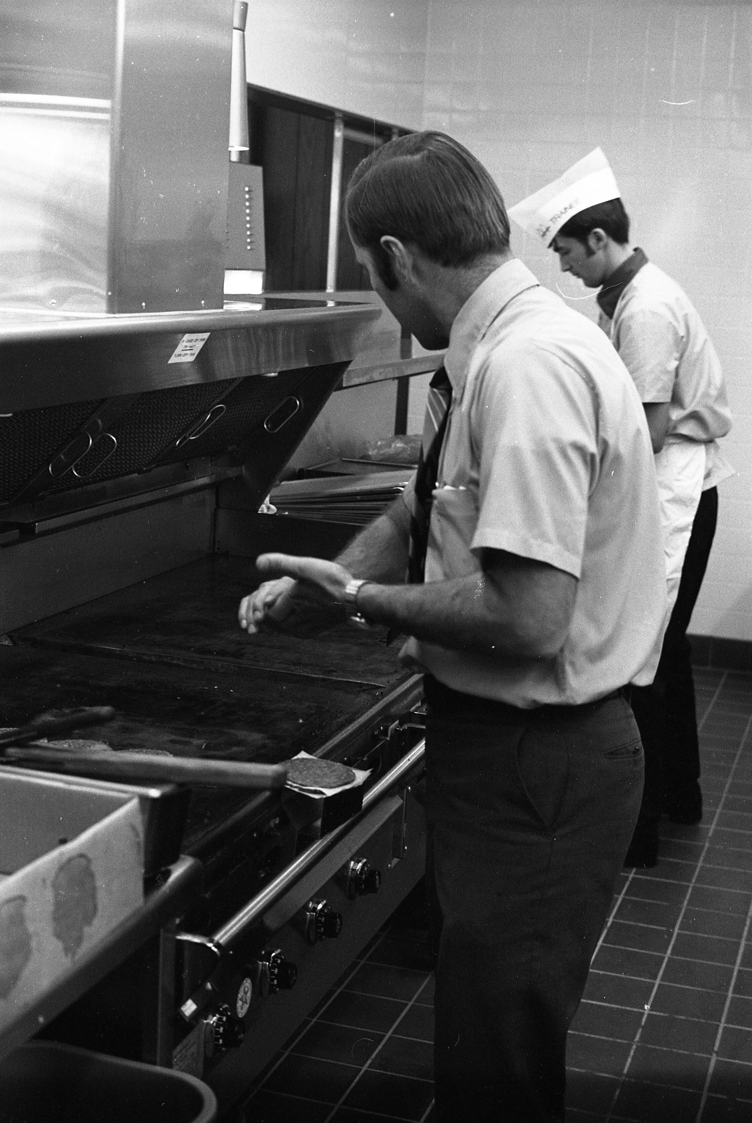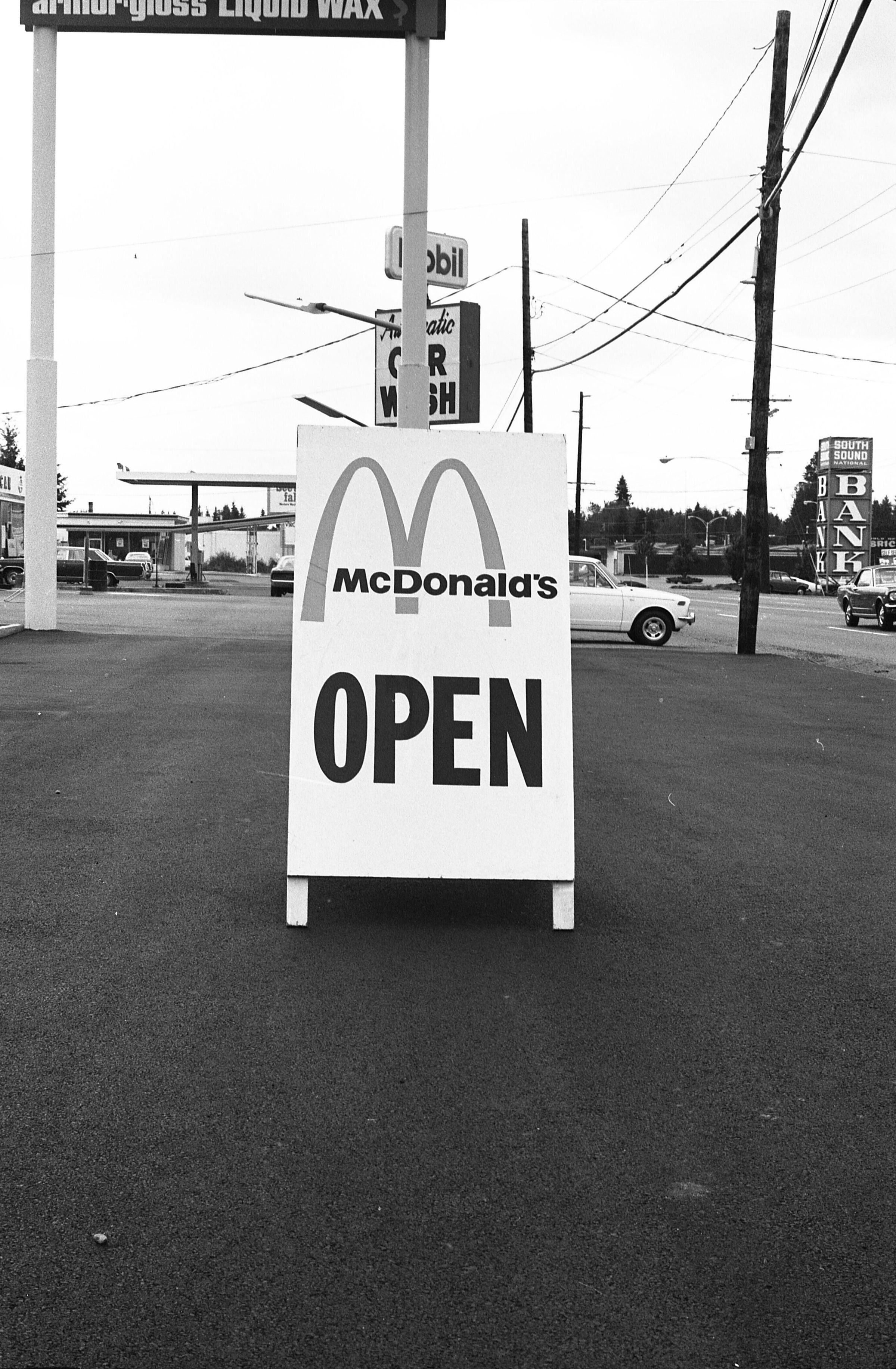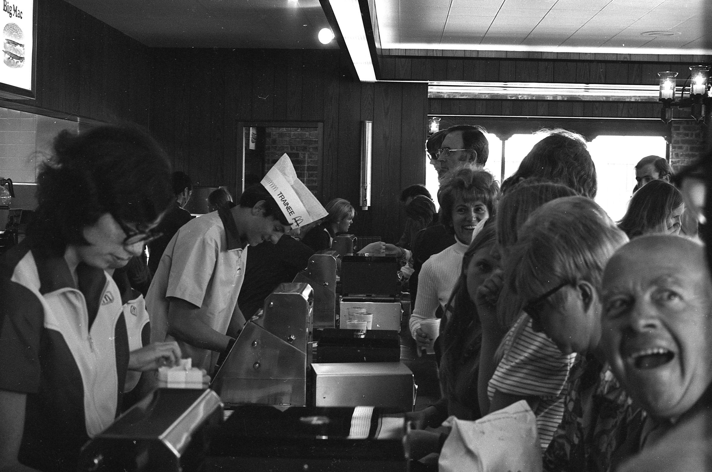 McDonalds and Phil Groff, Unknown Date. These two film negative strips were created for the Lacey Leader newspaper. These images show people waiting in line at a fast food restaurant, a man working a flat top grill at the restaurant, and a McDonald's sandwich board sign.Made/Created
