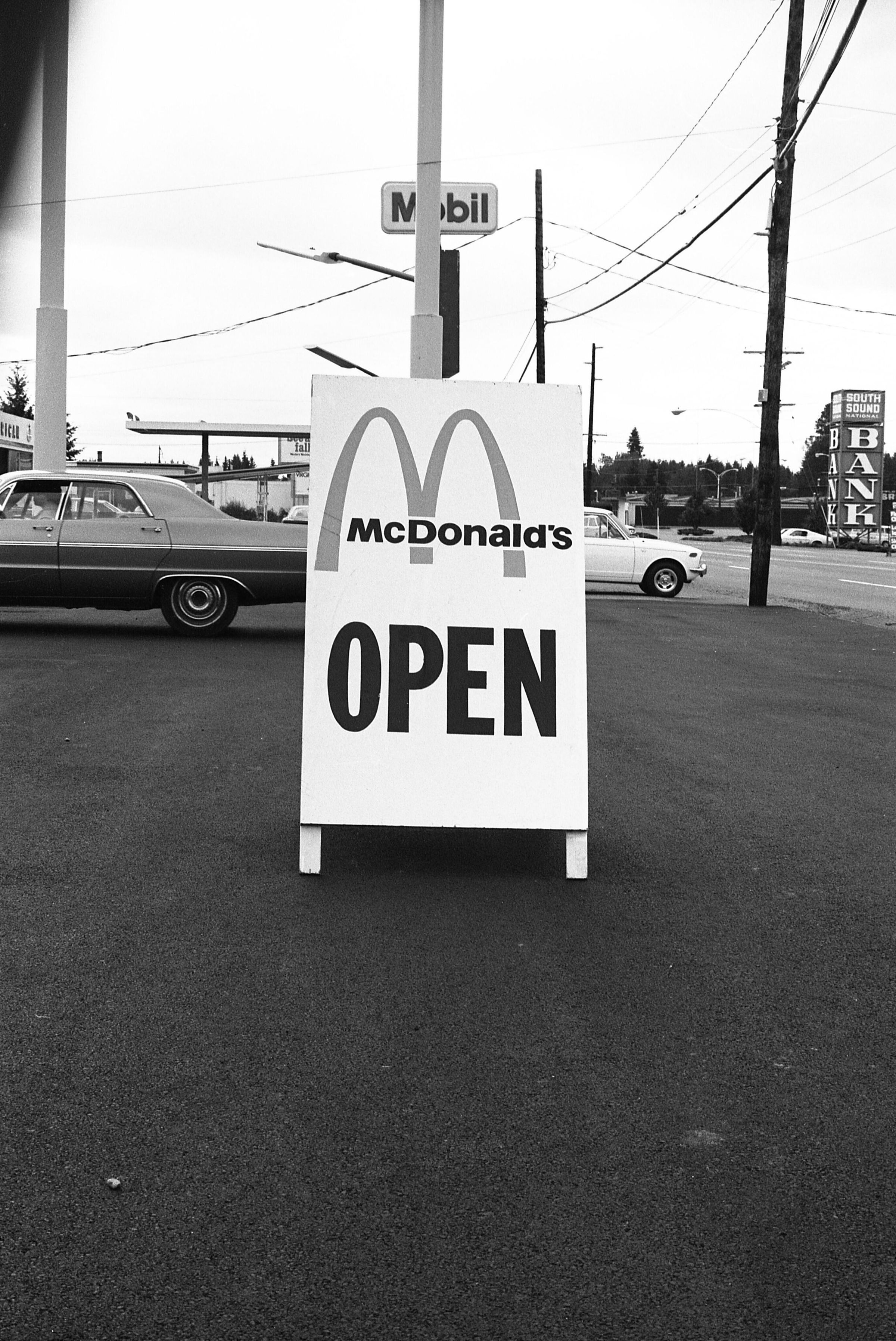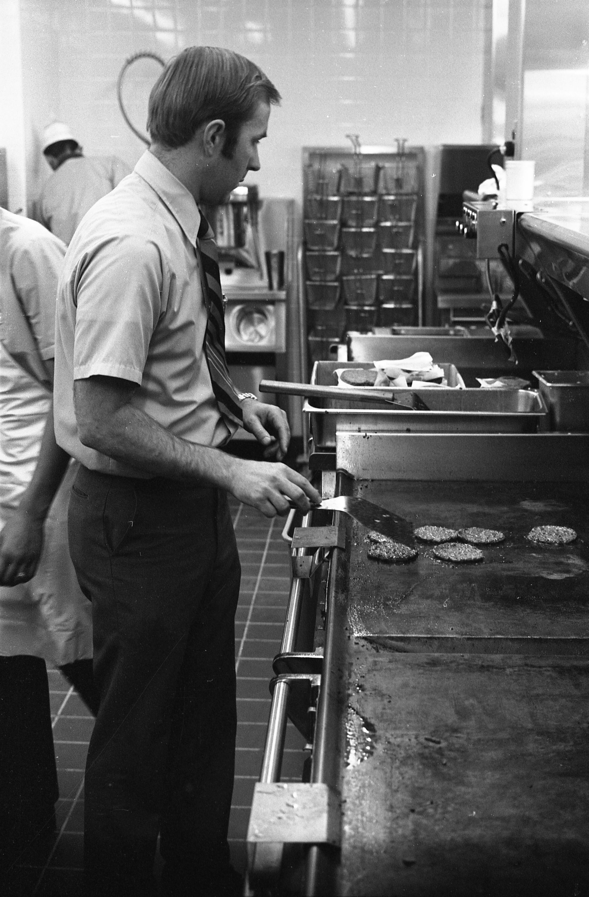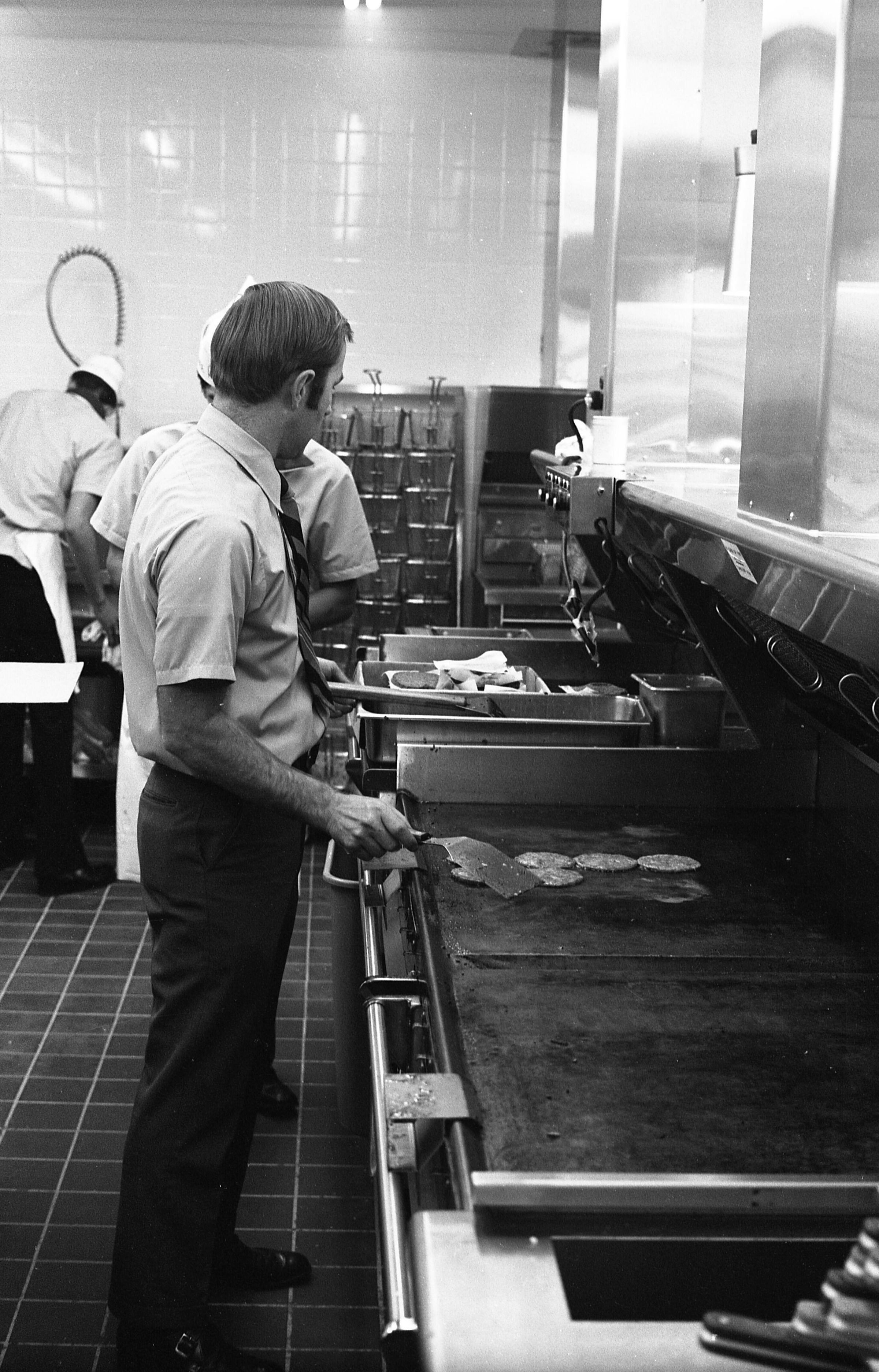 McDonalds and Phil Groff, Unknown Date. These two film negative strips were created for the Lacey Leader newspaper. These images show people waiting in line at a fast food restaurant, a man working a flat top grill at the restaurant, and a McDonald's sandwich board sign.Made/Created