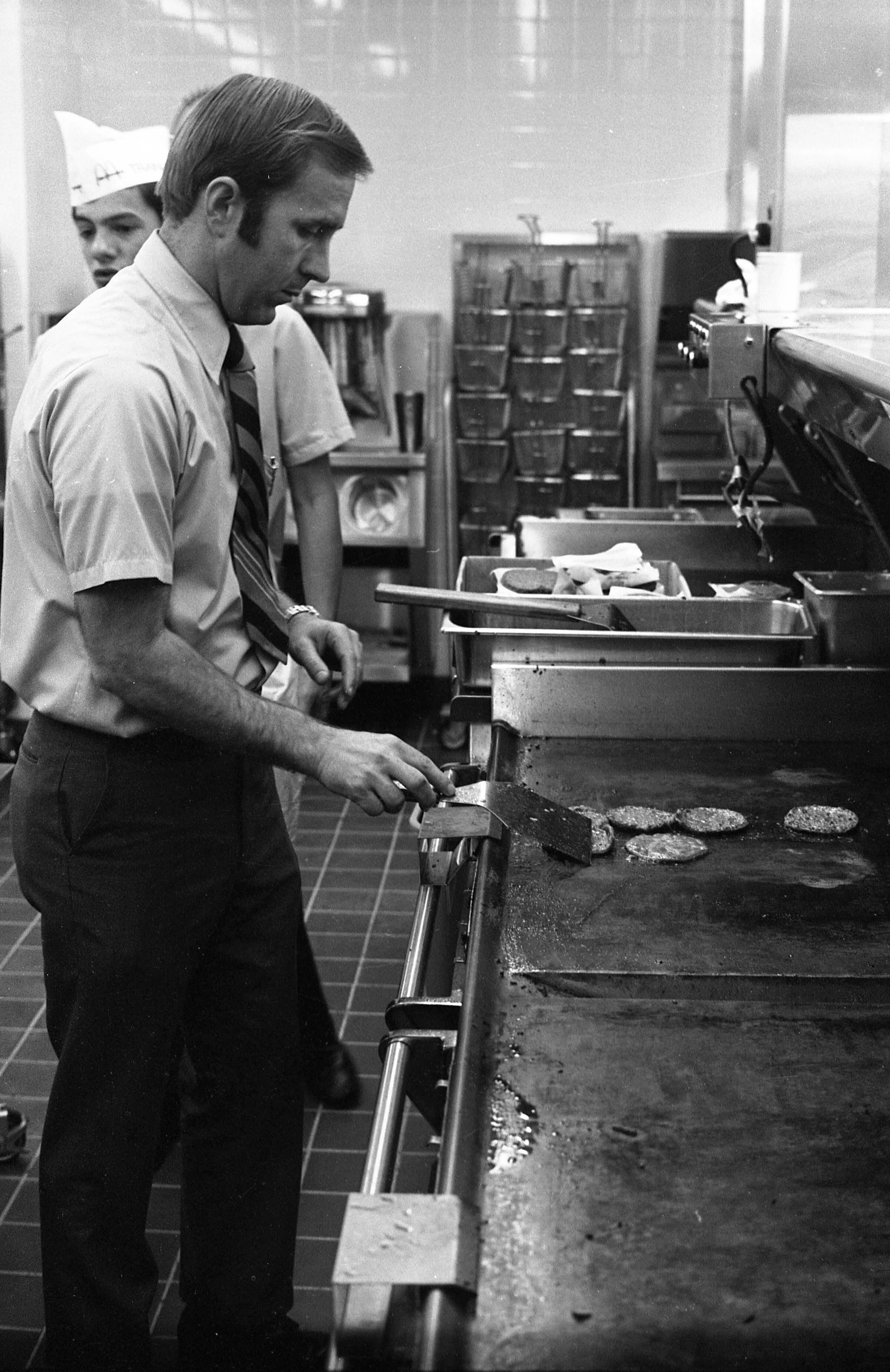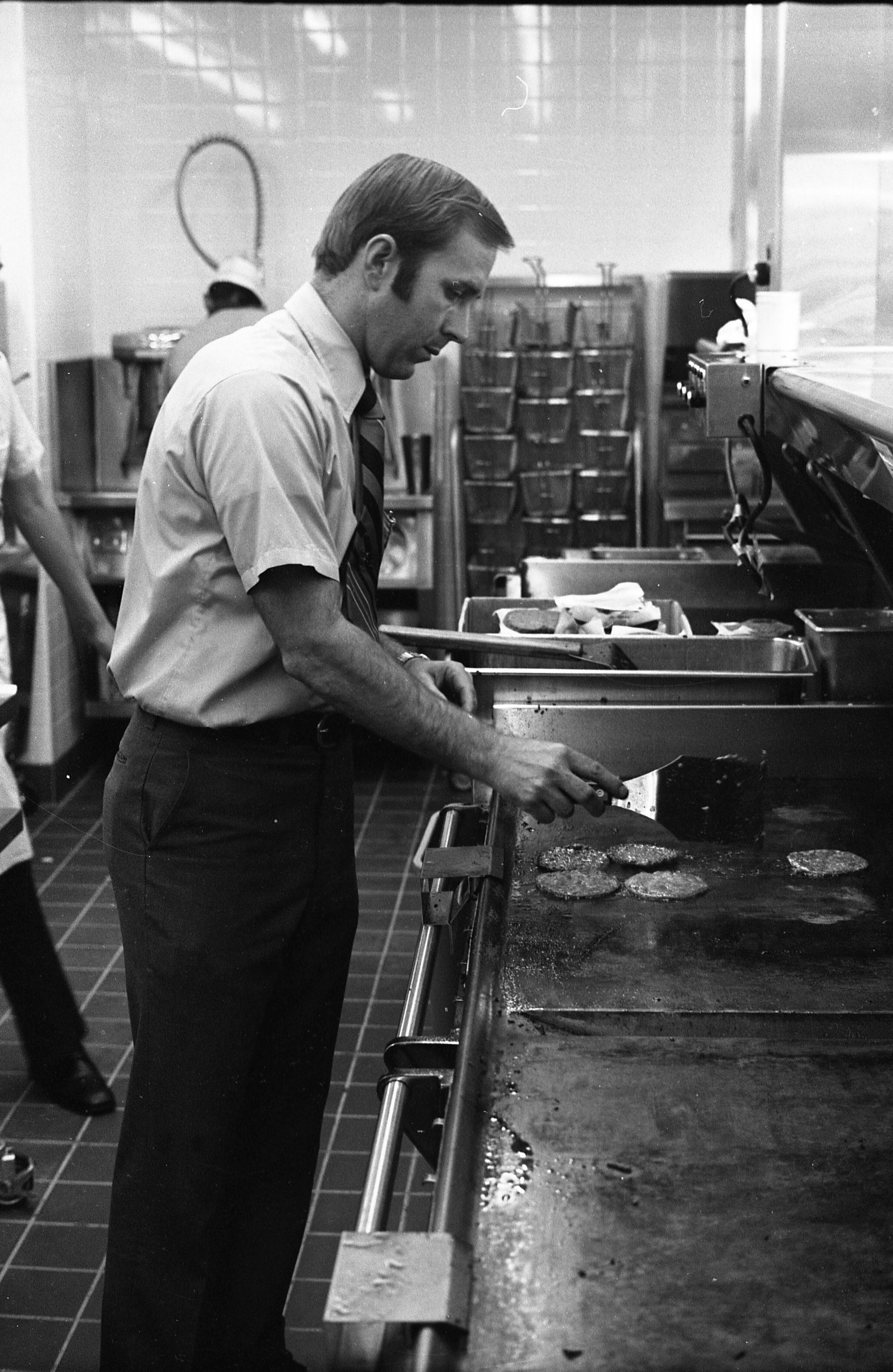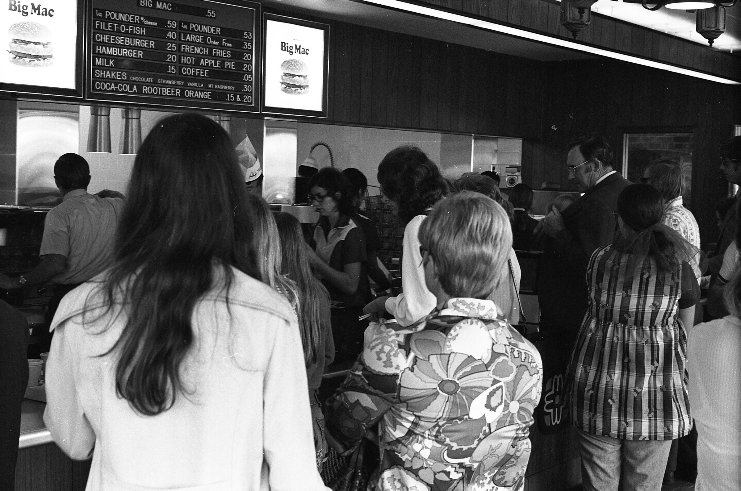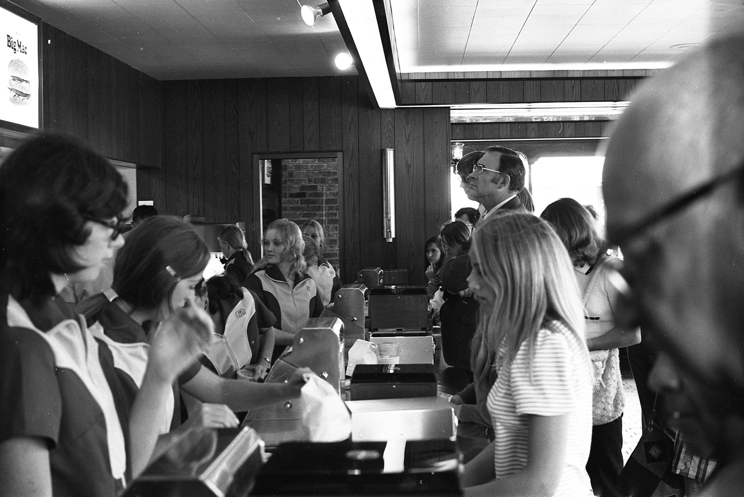 McDonalds and Phil Groff, Unknown Date. These two film negative strips were created for the Lacey Leader newspaper. These images show people waiting in line at a fast food restaurant, a man working a flat top grill at the restaurant, and a McDonald's sandwich board sign.Made/Created