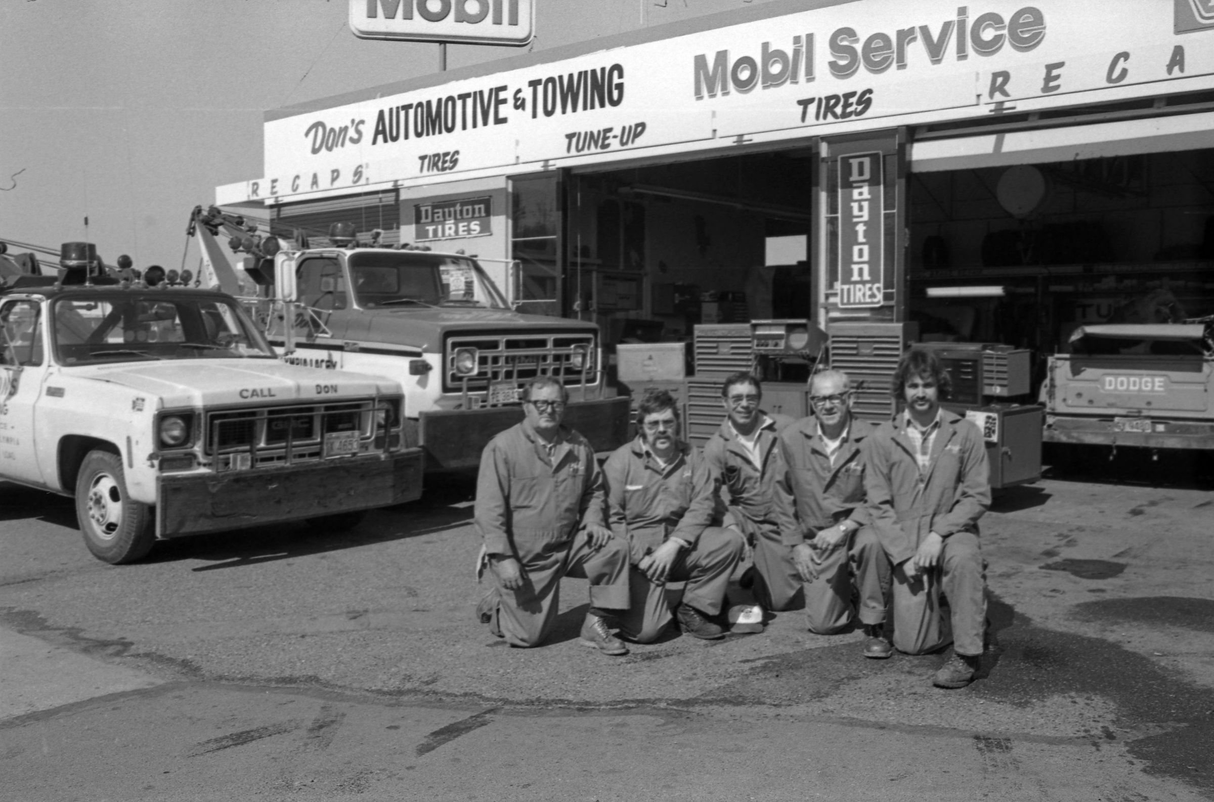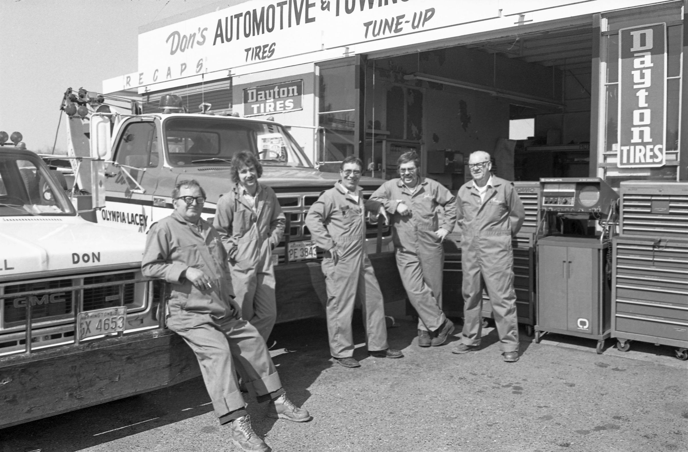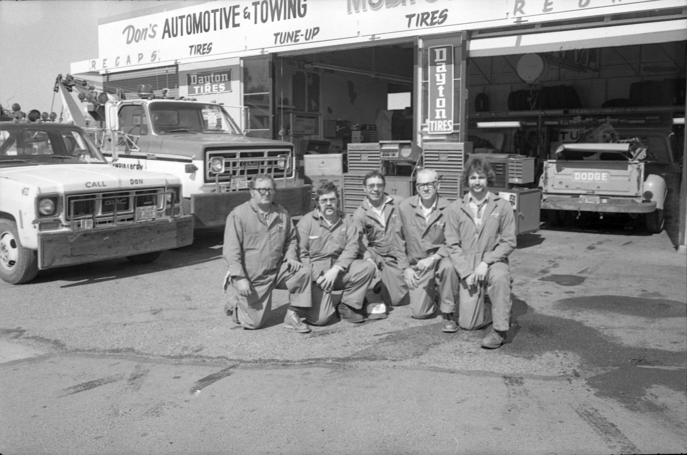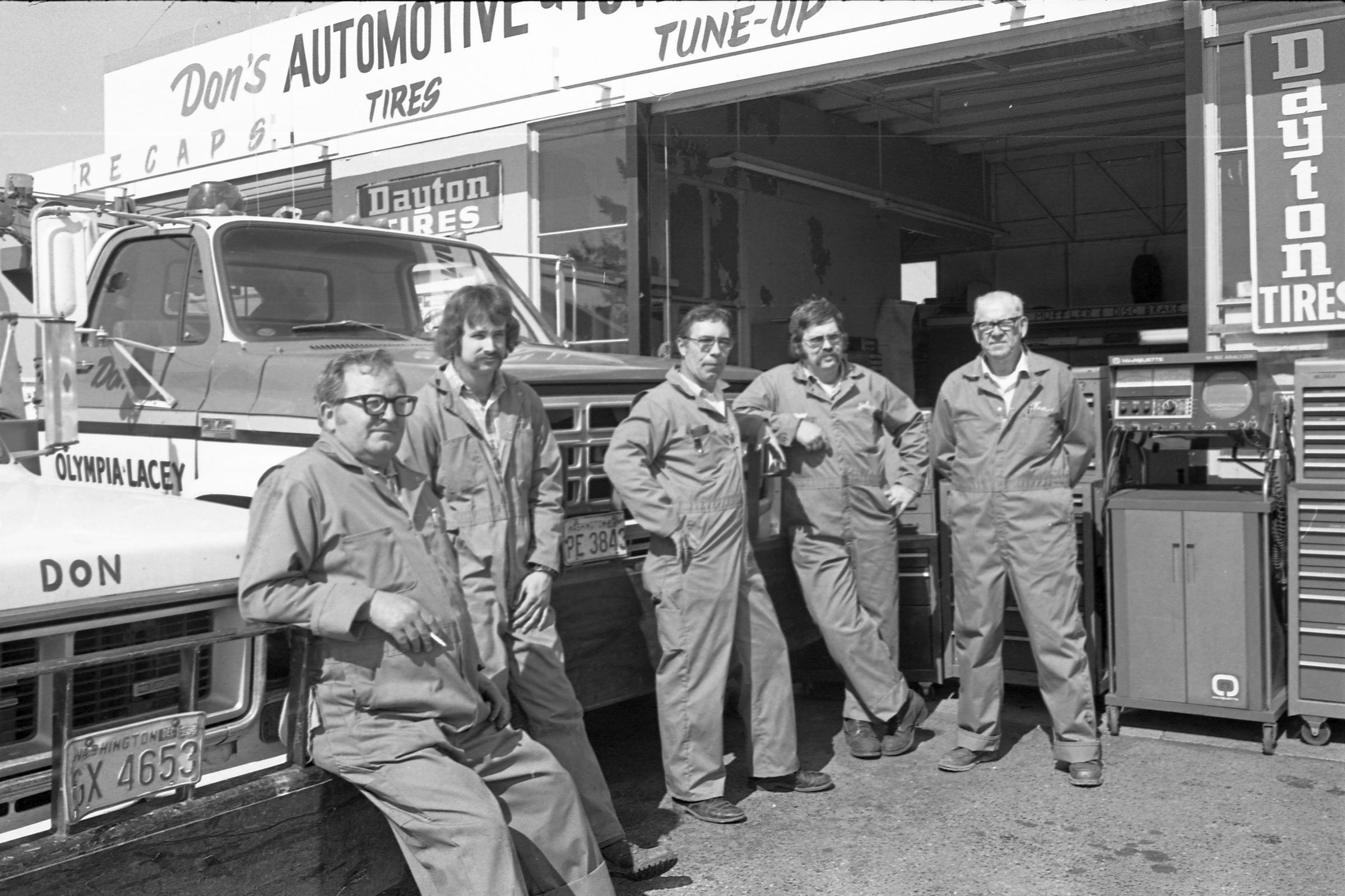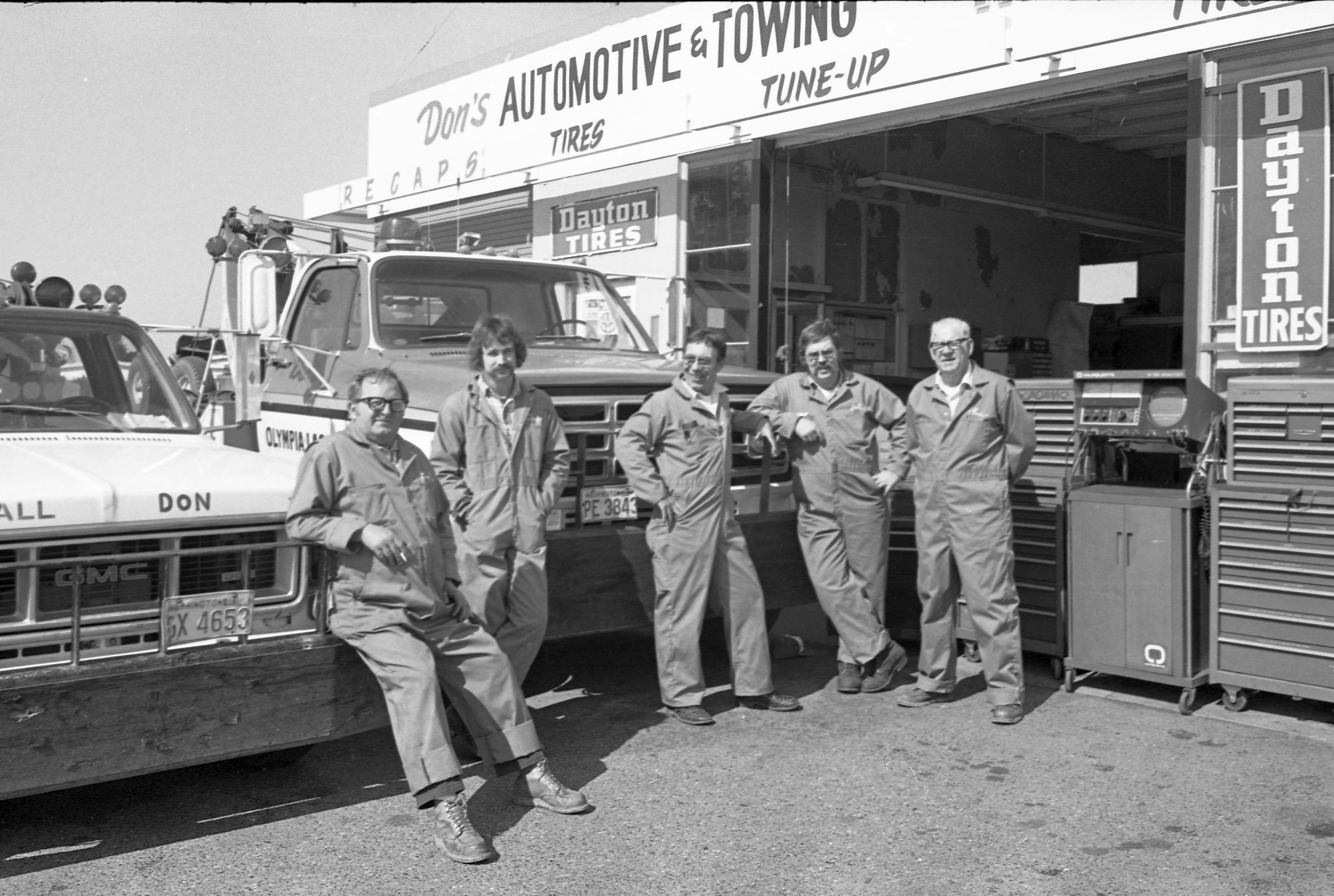 Business Progress, 3-20-1979. These 6 black and white negative strips were created for the Lacey Leader newspaper. They depict exteriors of a 76 gas station and Don's Automotive & Towing, featuring employees of Don's.