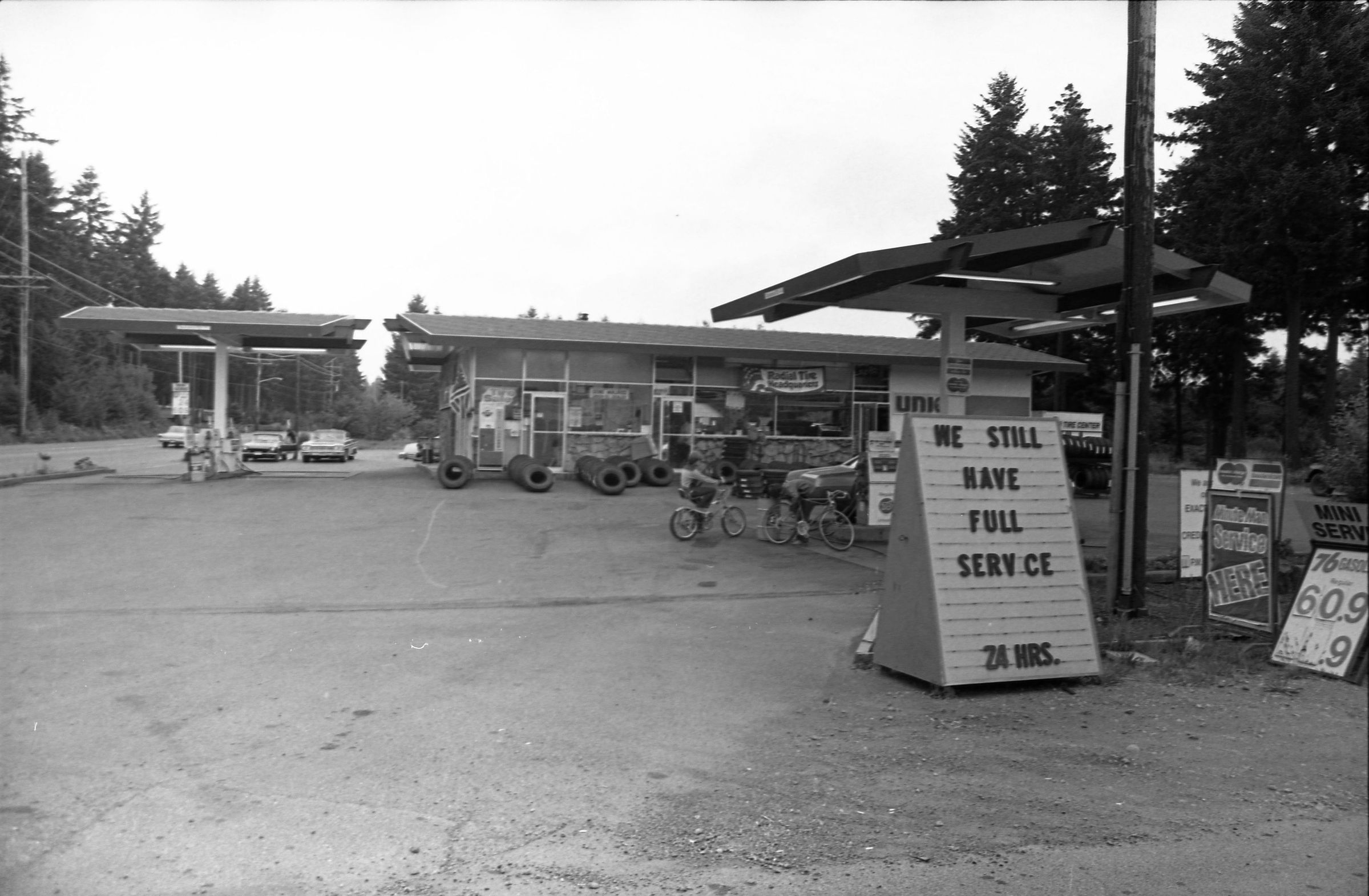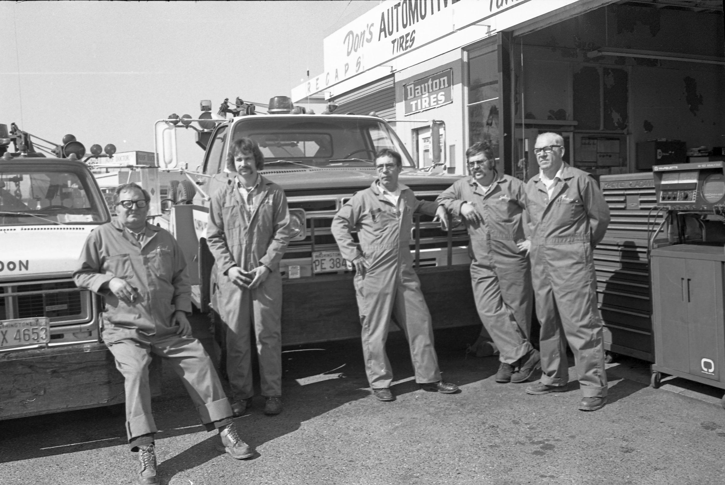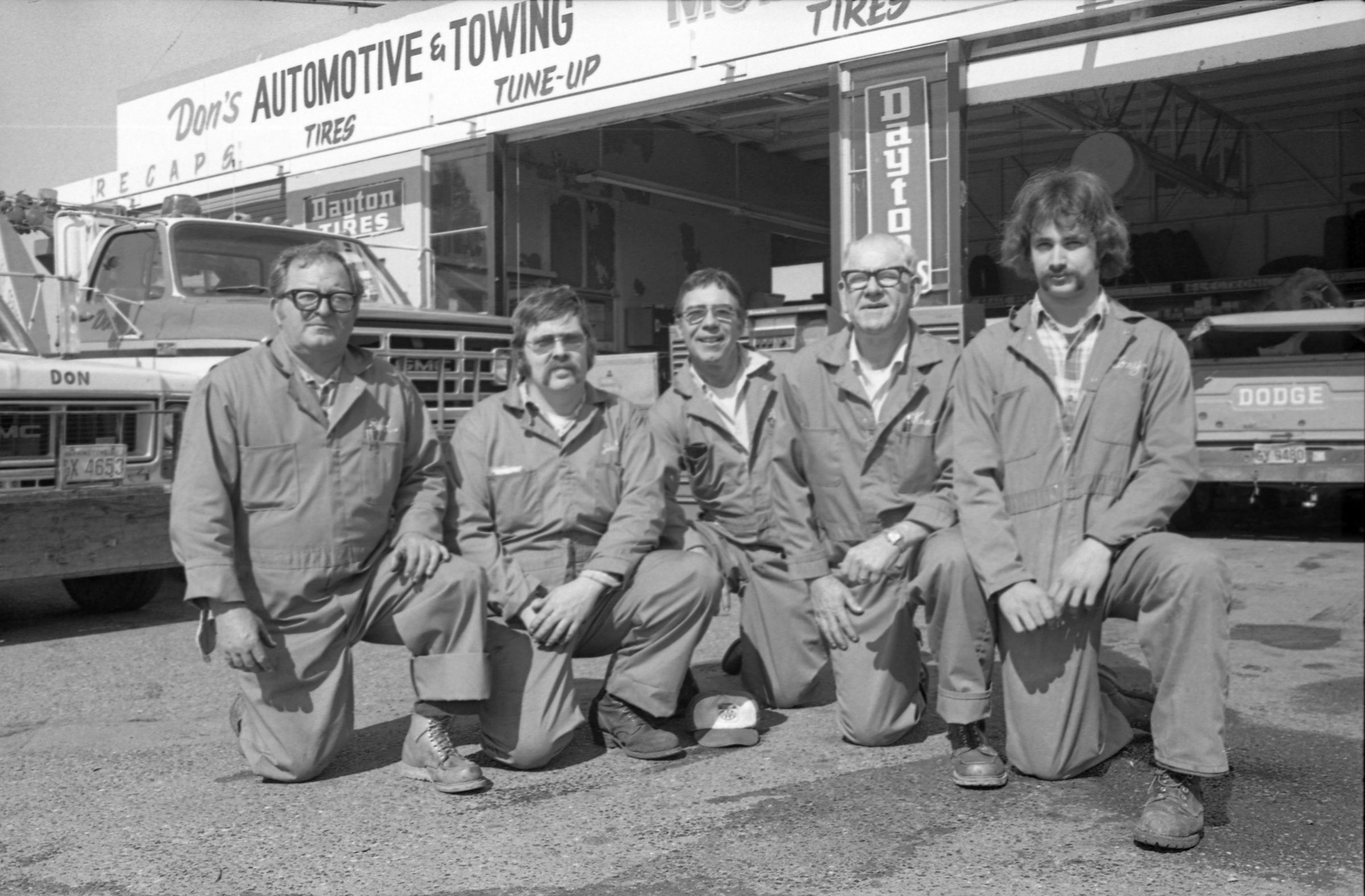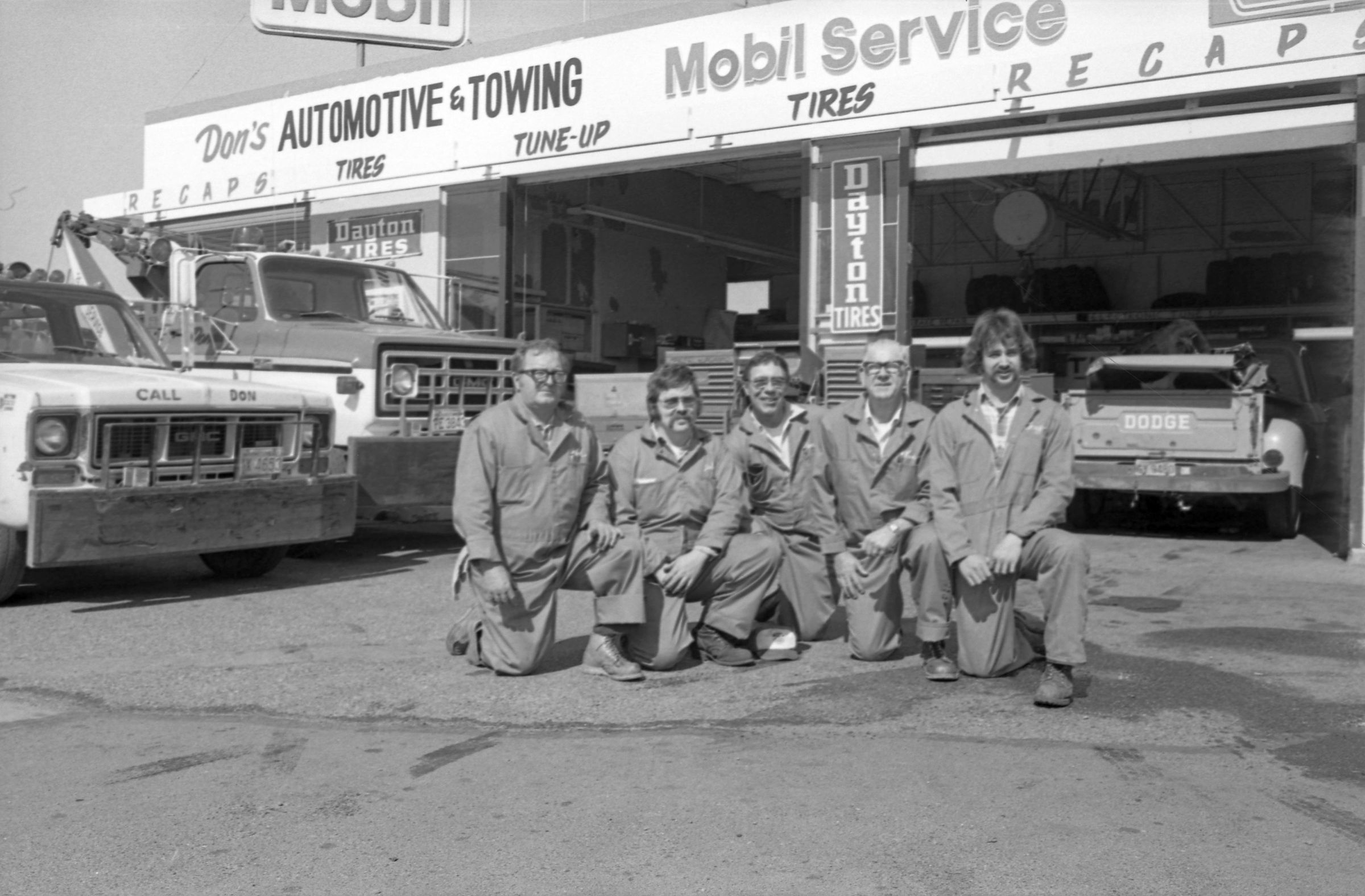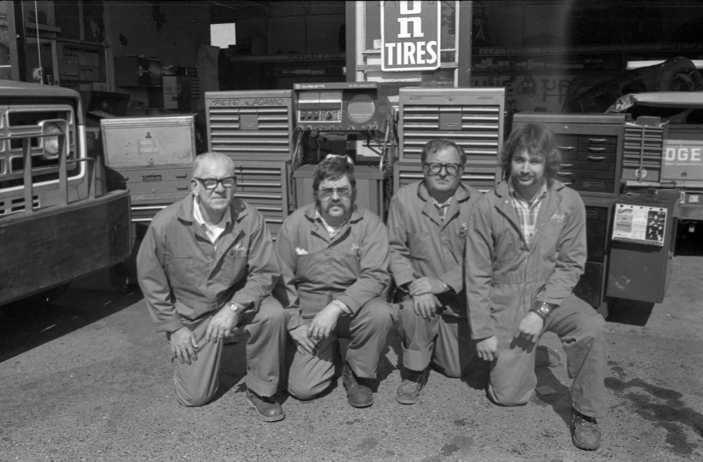 Business Progress, 3-20-1979. These 6 black and white negative strips were created for the Lacey Leader newspaper. They depict exteriors of a 76 gas station and Don's Automotive & Towing, featuring employees of Don's.