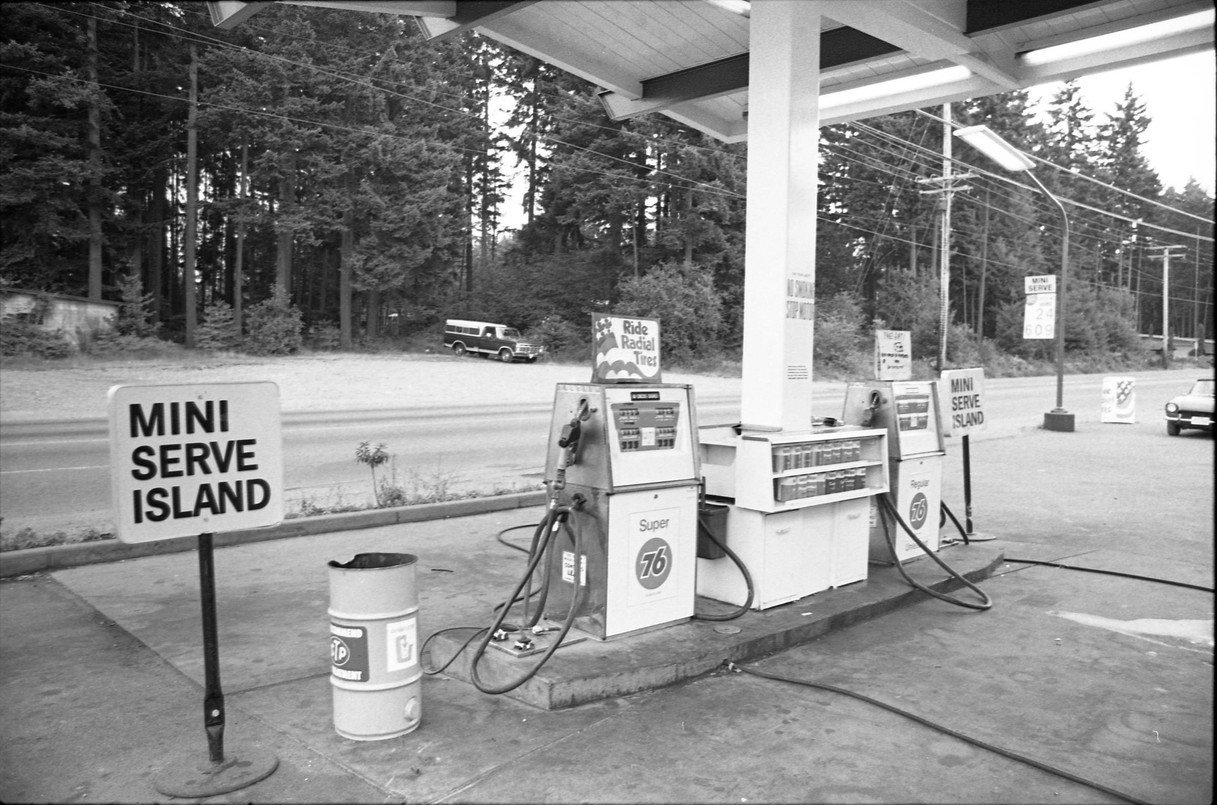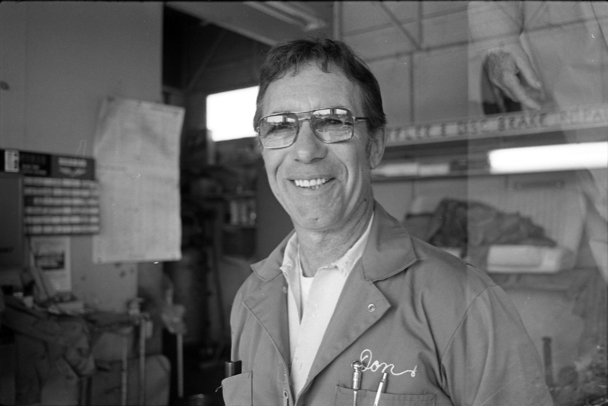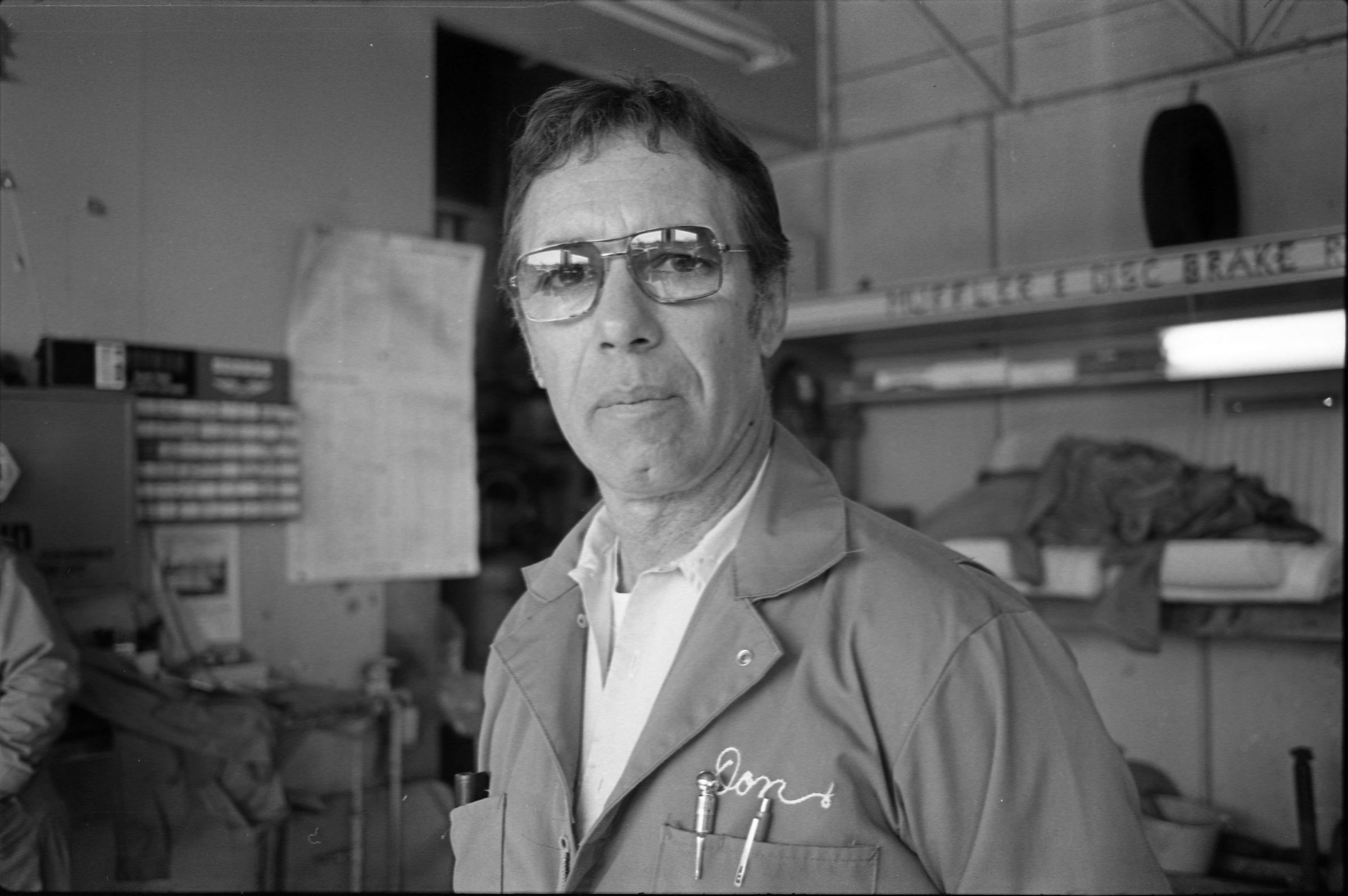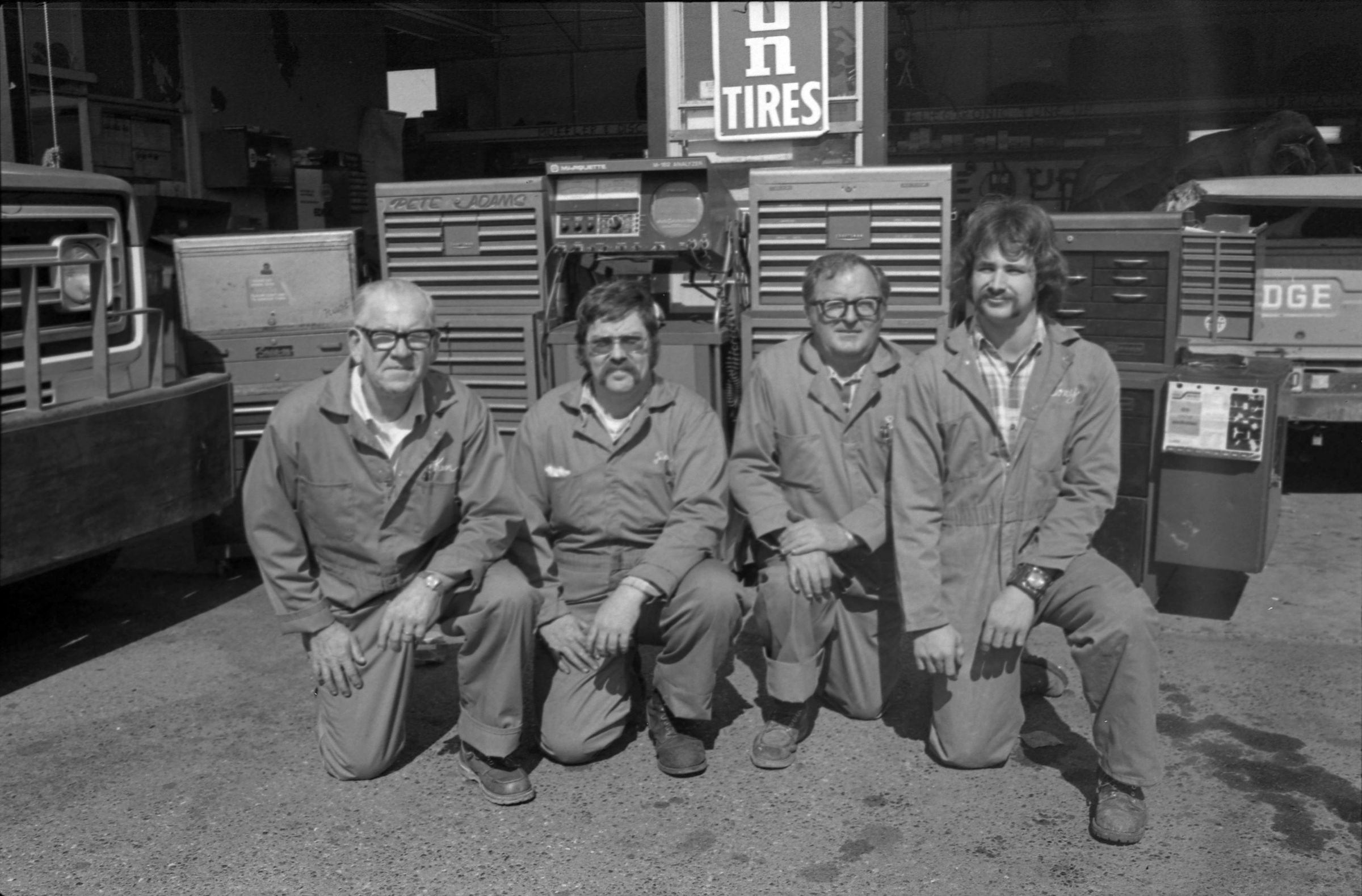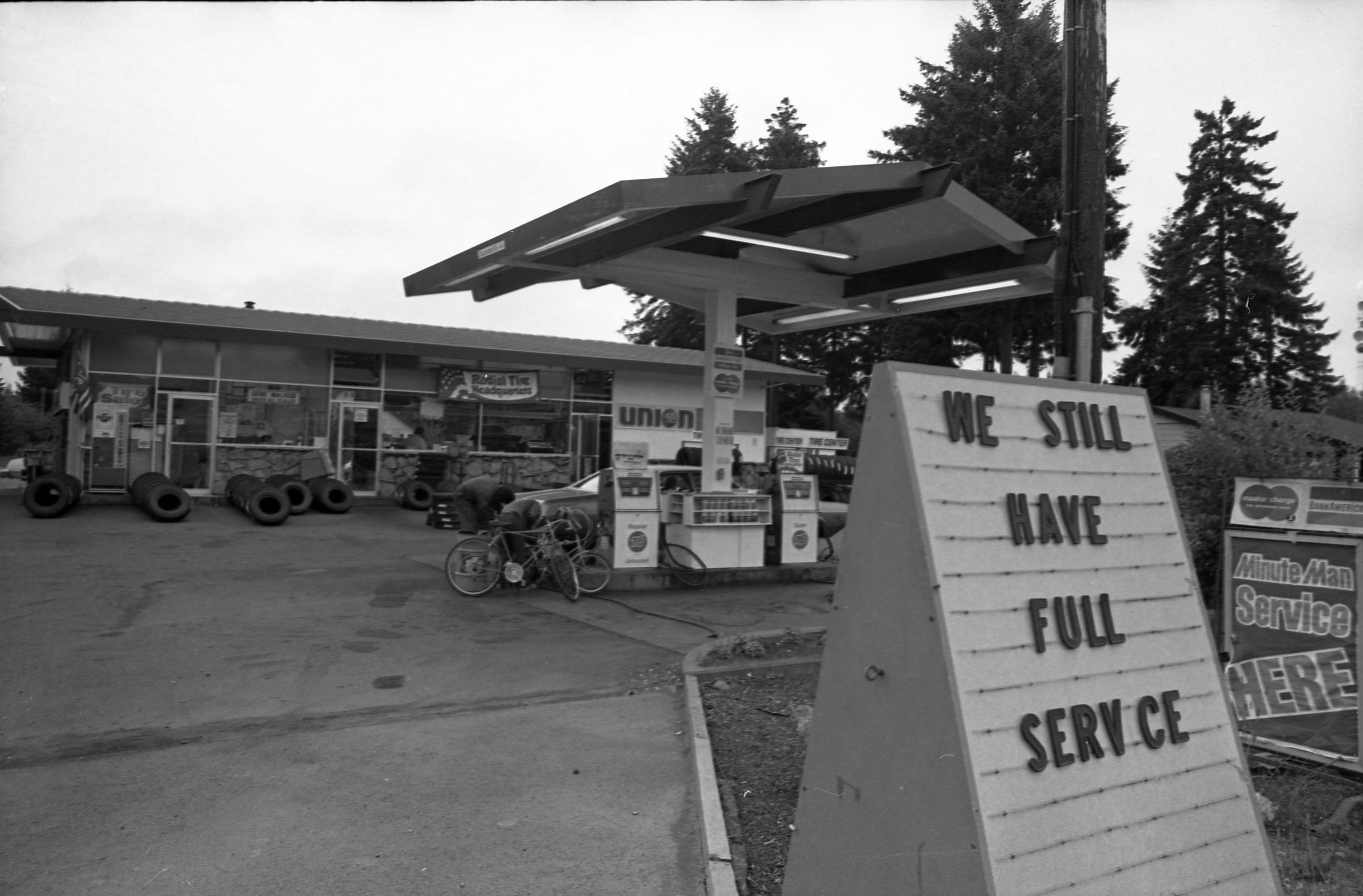 Business Progress, 3-20-1979. These 6 black and white negative strips were created for the Lacey Leader newspaper. They depict exteriors of a 76 gas station and Don's Automotive & Towing, featuring employees of Don's.