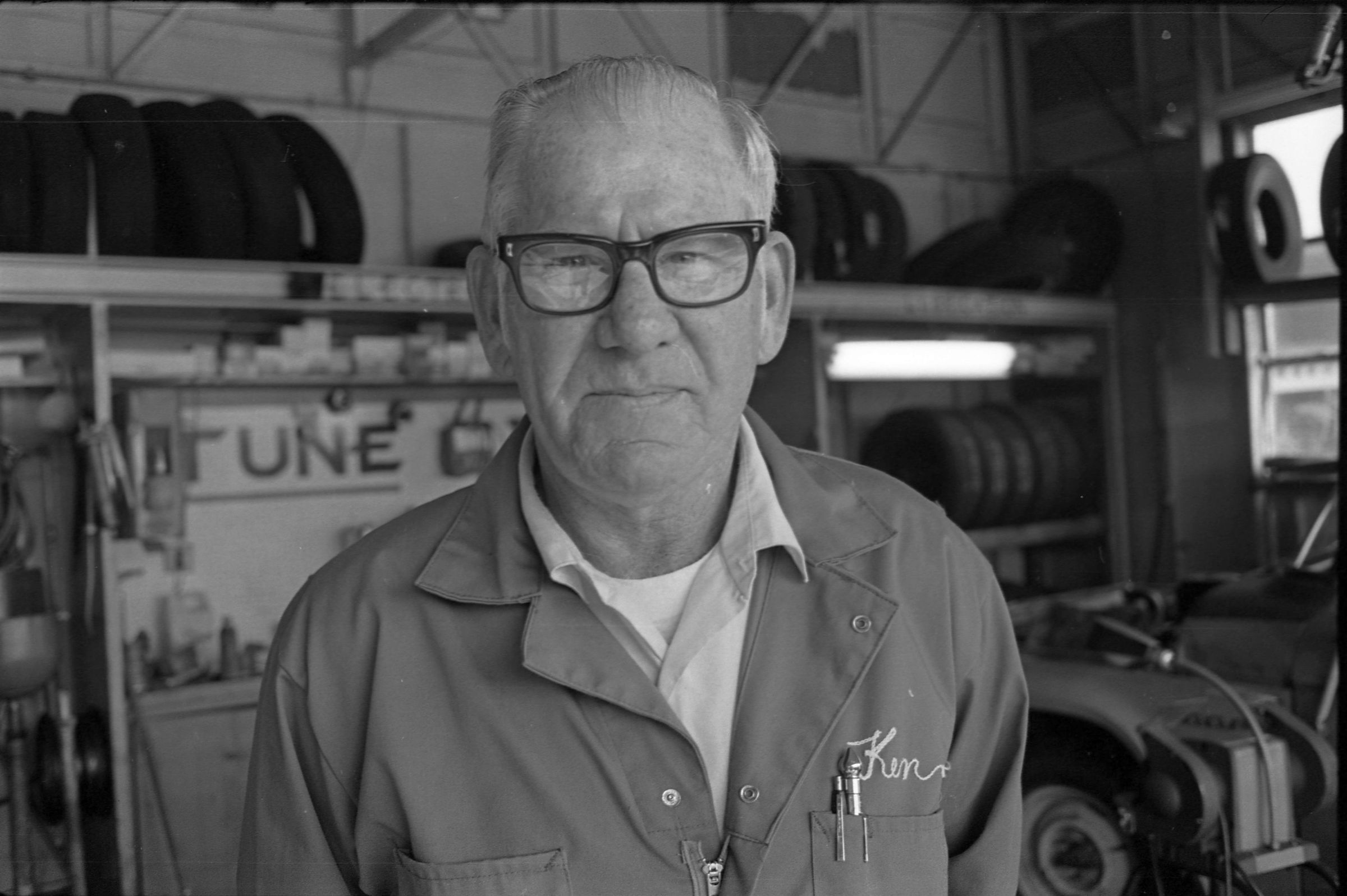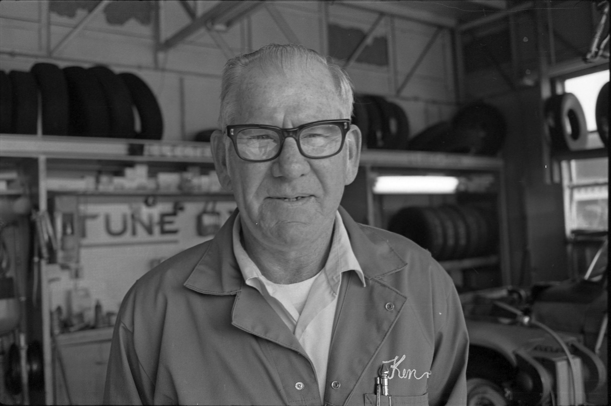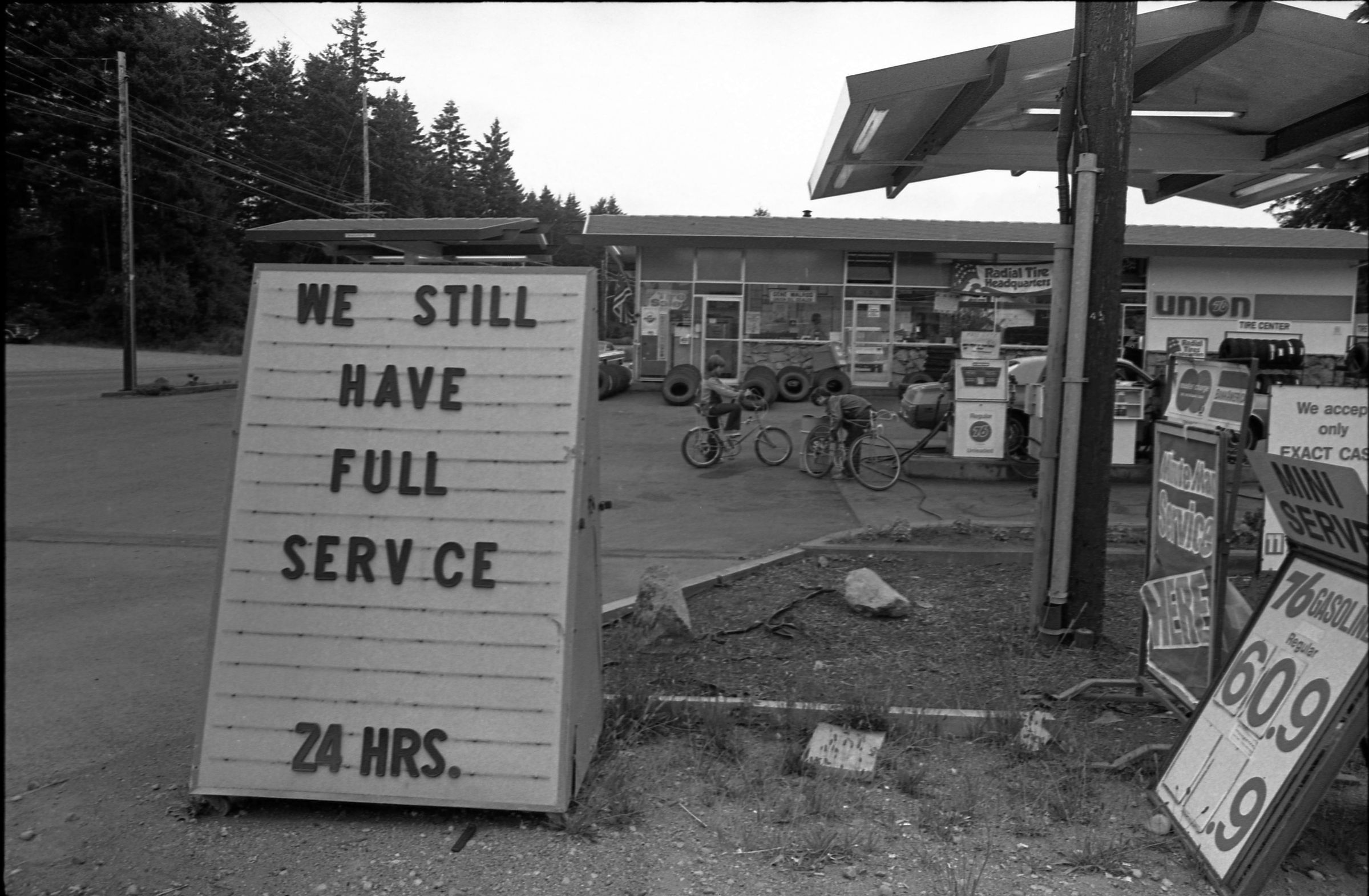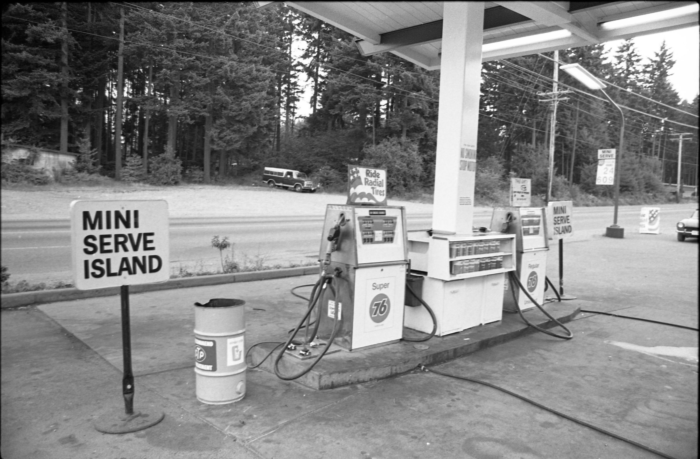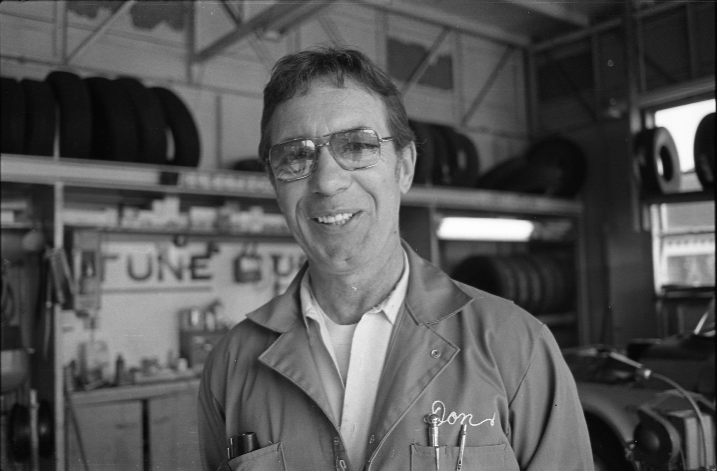 Business Progress, 3-20-1979. These 6 black and white negative strips were created for the Lacey Leader newspaper. They depict exteriors of a 76 gas station and Don's Automotive & Towing, featuring employees of Don's.