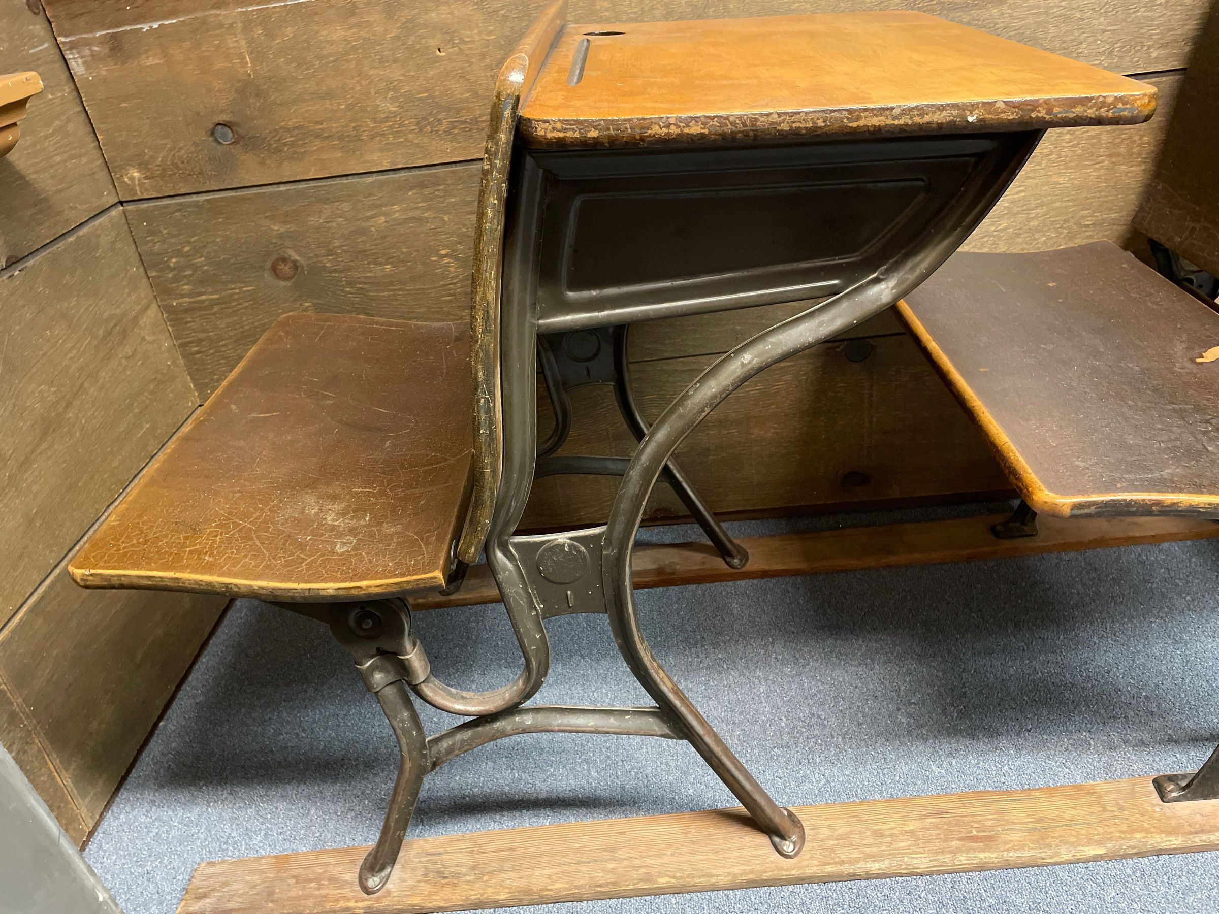 Old wooden school desk. Purchased by donor from Carol Nichols who used them as study desks for her children. Original owner unknown.