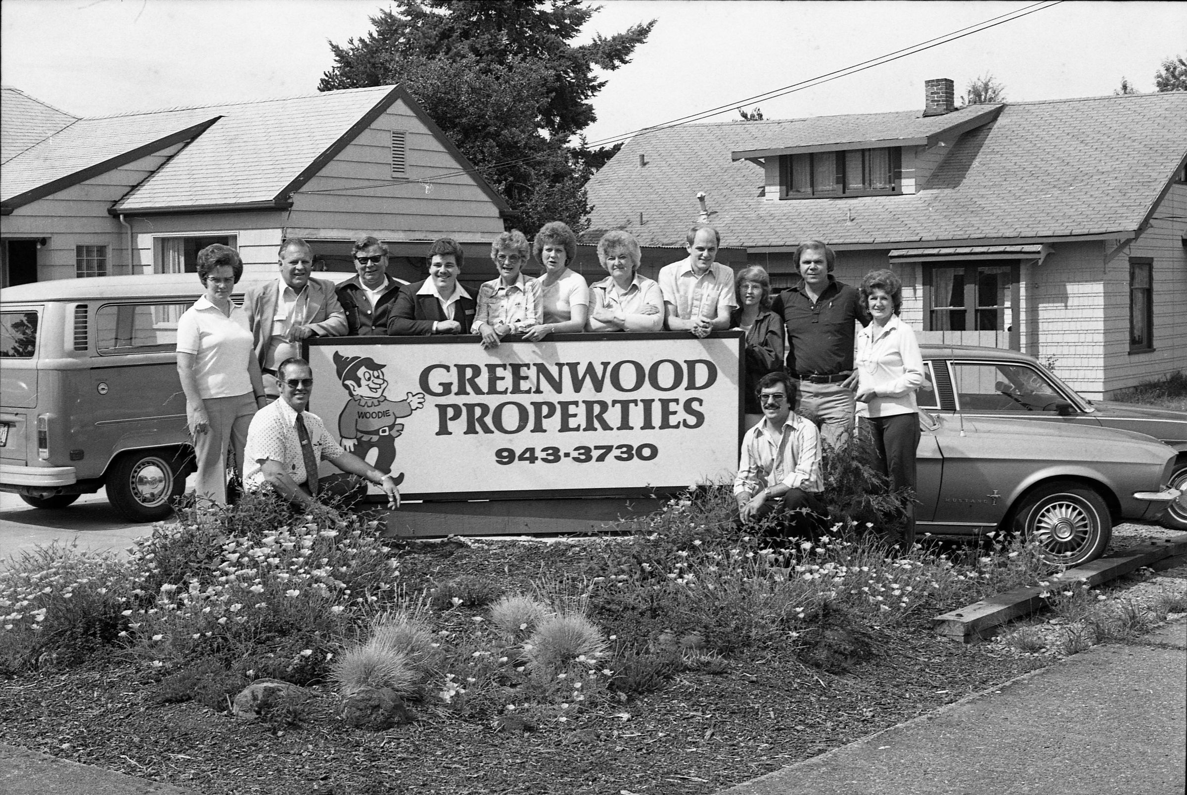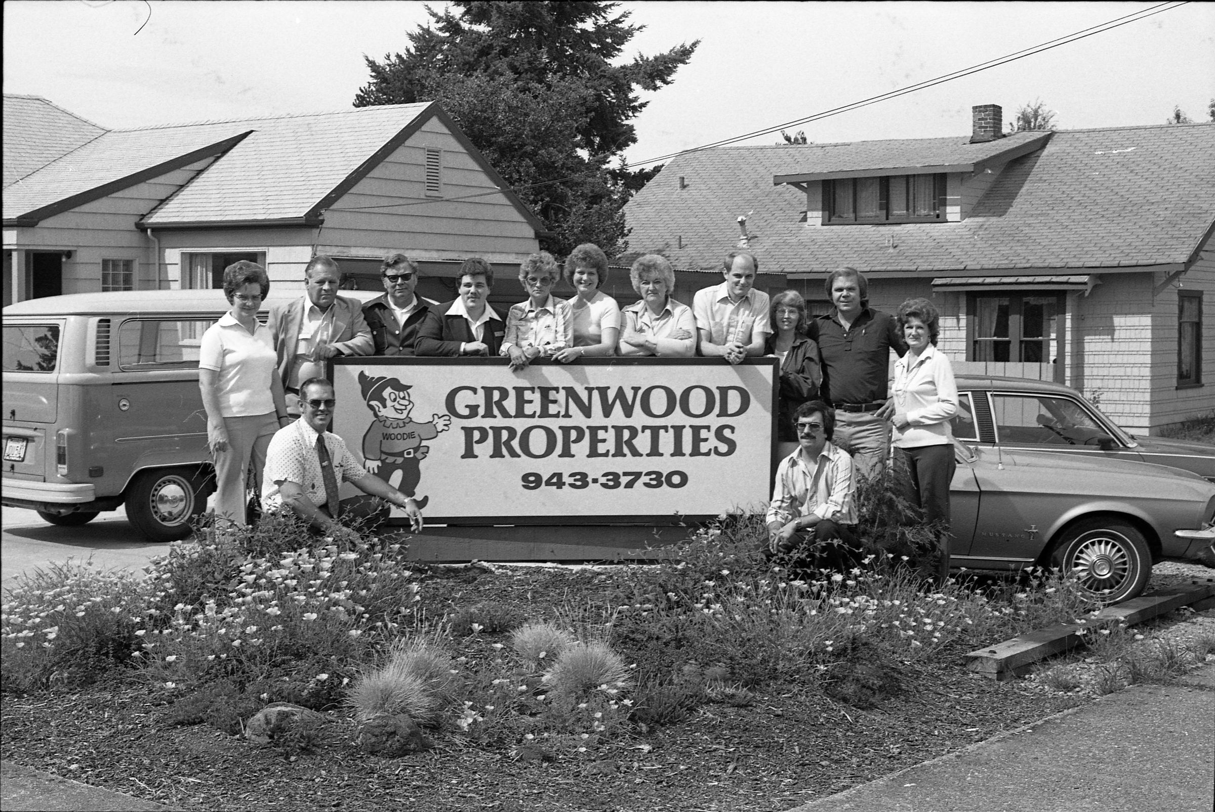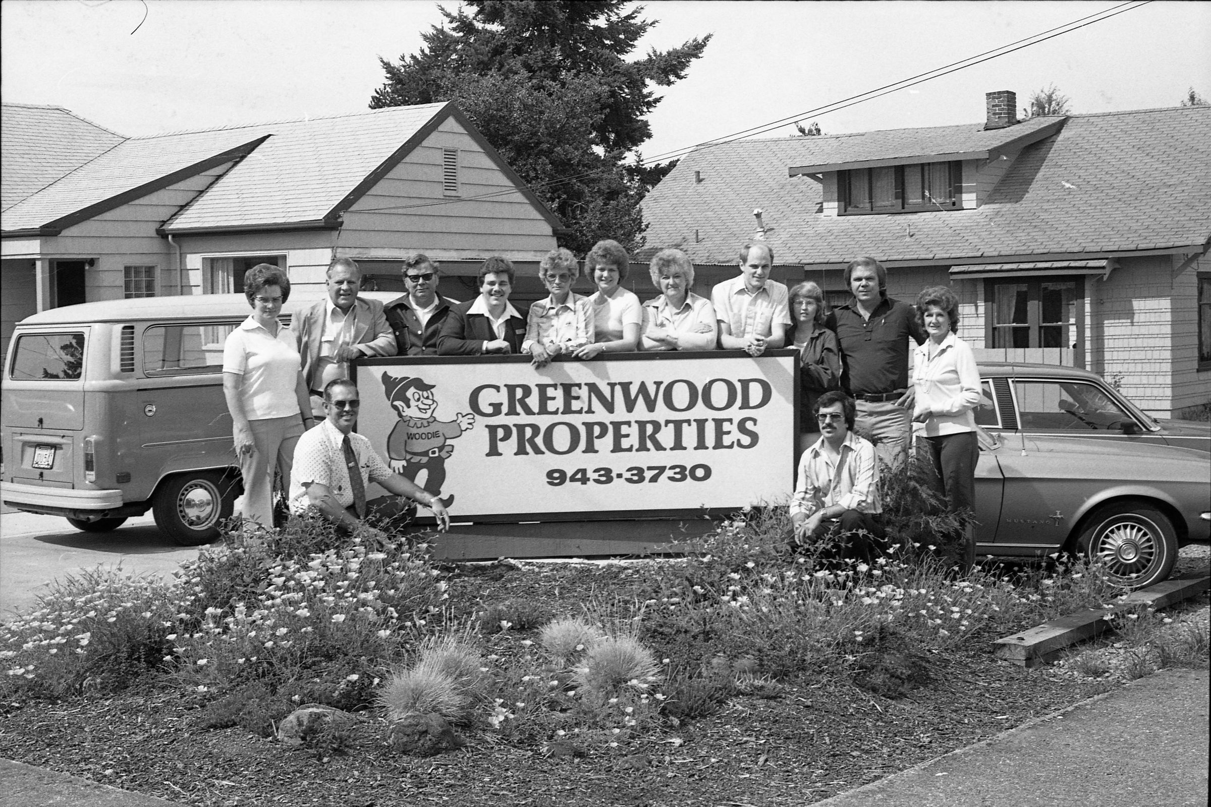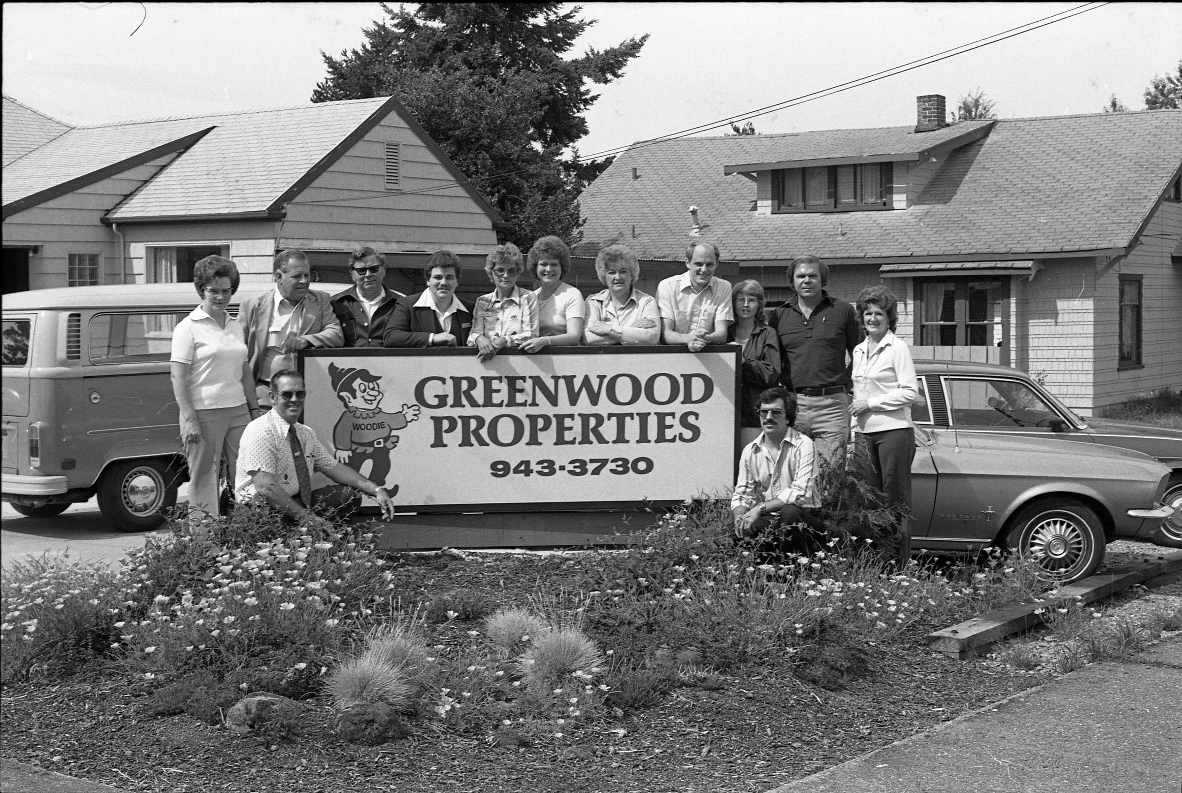 Greenwood Properties Staff, 1979. This single black and white film negative strip was created for the Lacey Leader newspaper. These images show thirteen people gathered around a sign which reads "GREENWOOD PROPERTIES." There are two houses in the background. Two automobiles are also partially visible parked in front of the houses.Made/Created