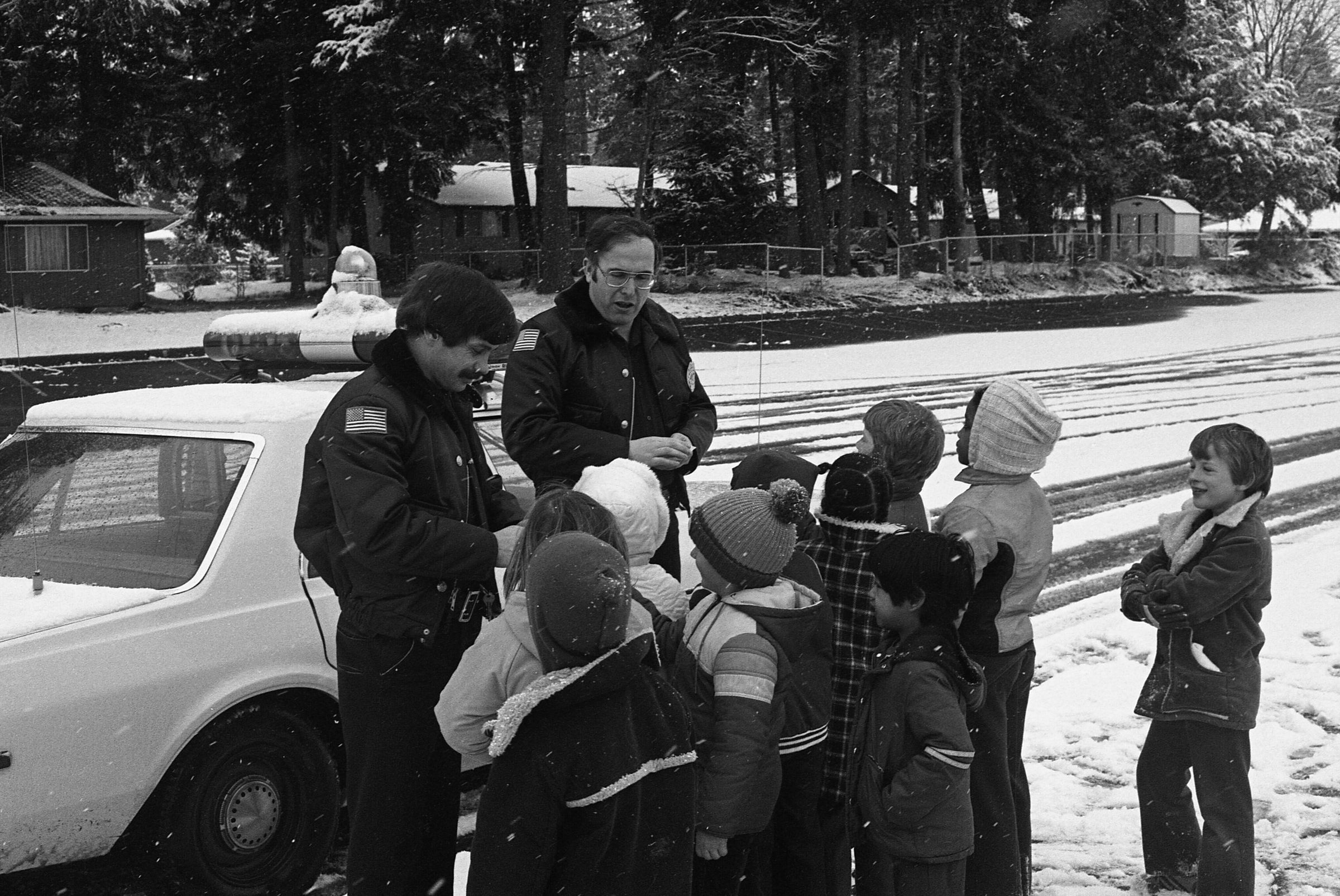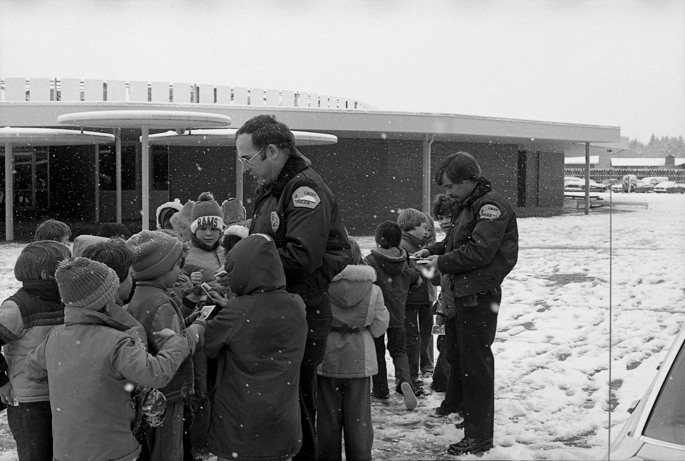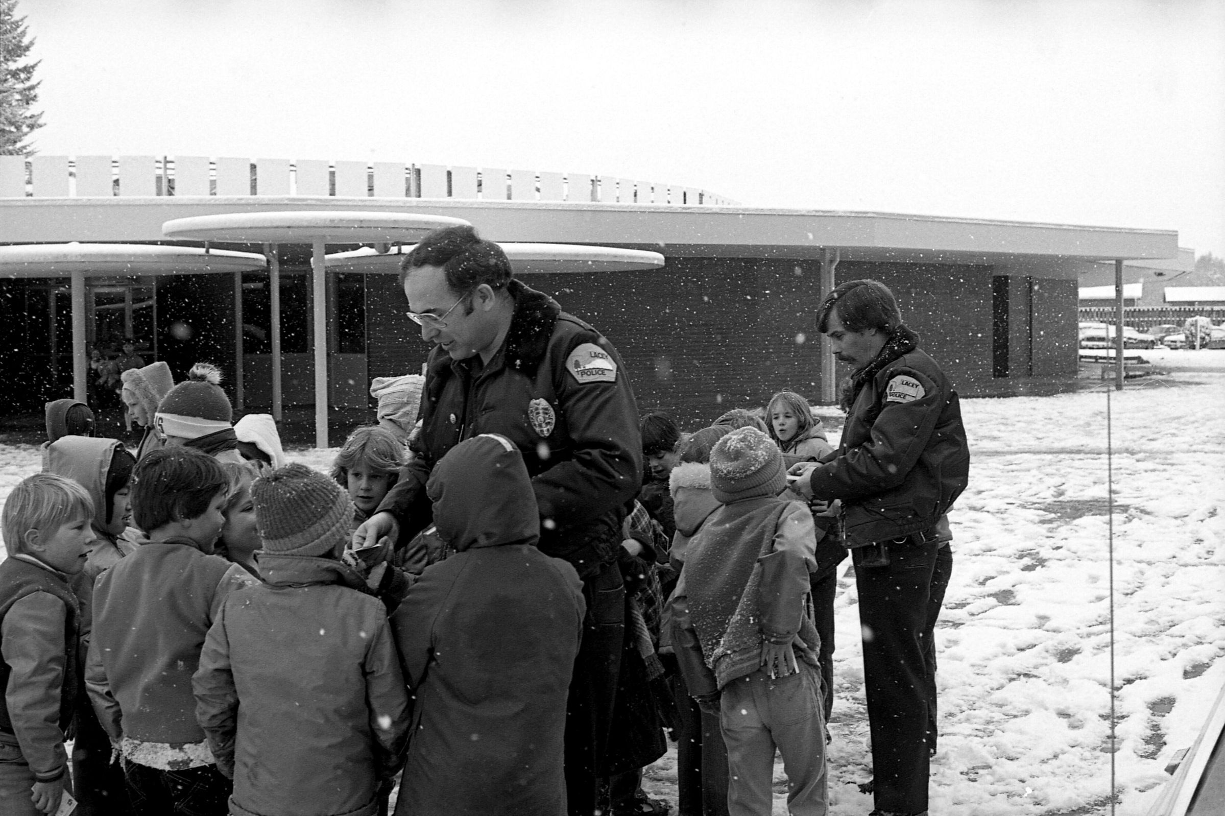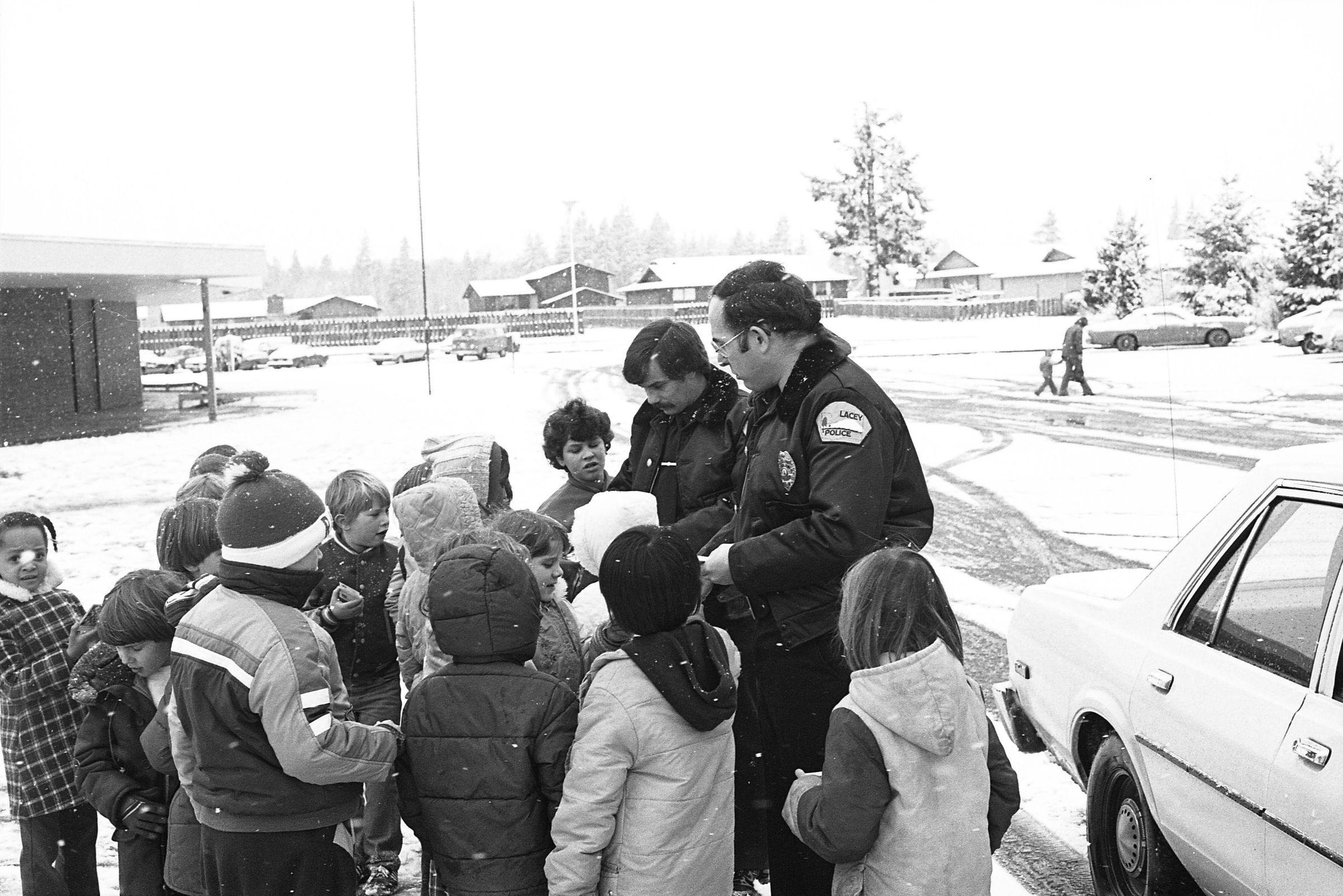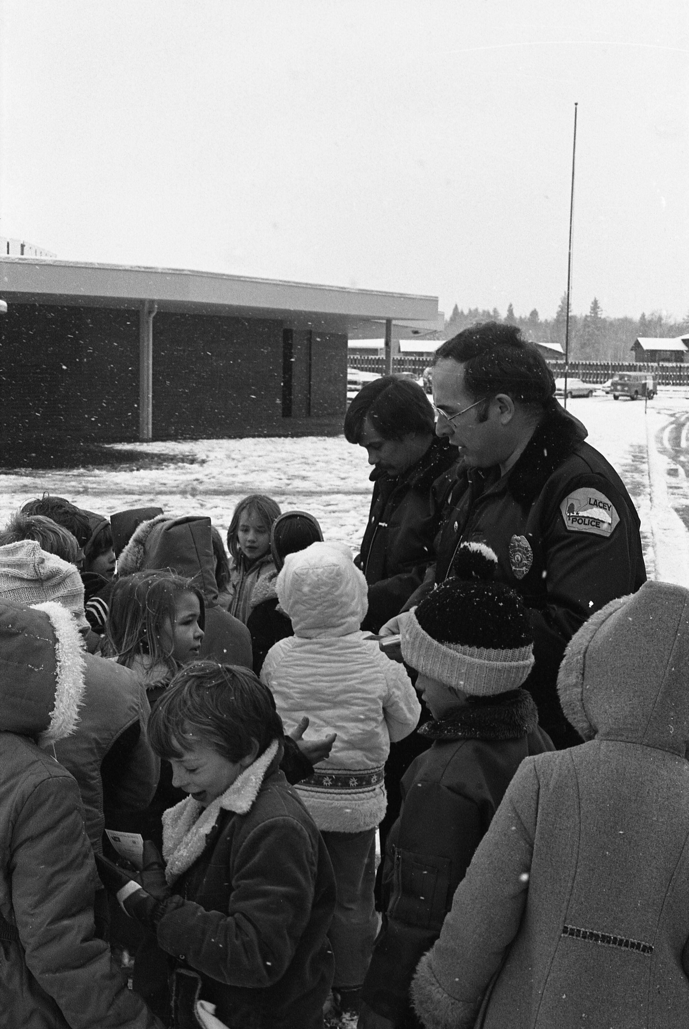 Tom Nelson and Dave Johnson at Lacey Elementary, Unknown Date. These two black and white film negative strips were created for the Lacey Leader newspaper. These images show two police officers giving out tickets to a Seattle Supersonics basketball game to students at Lacey Elementary.Made/Created