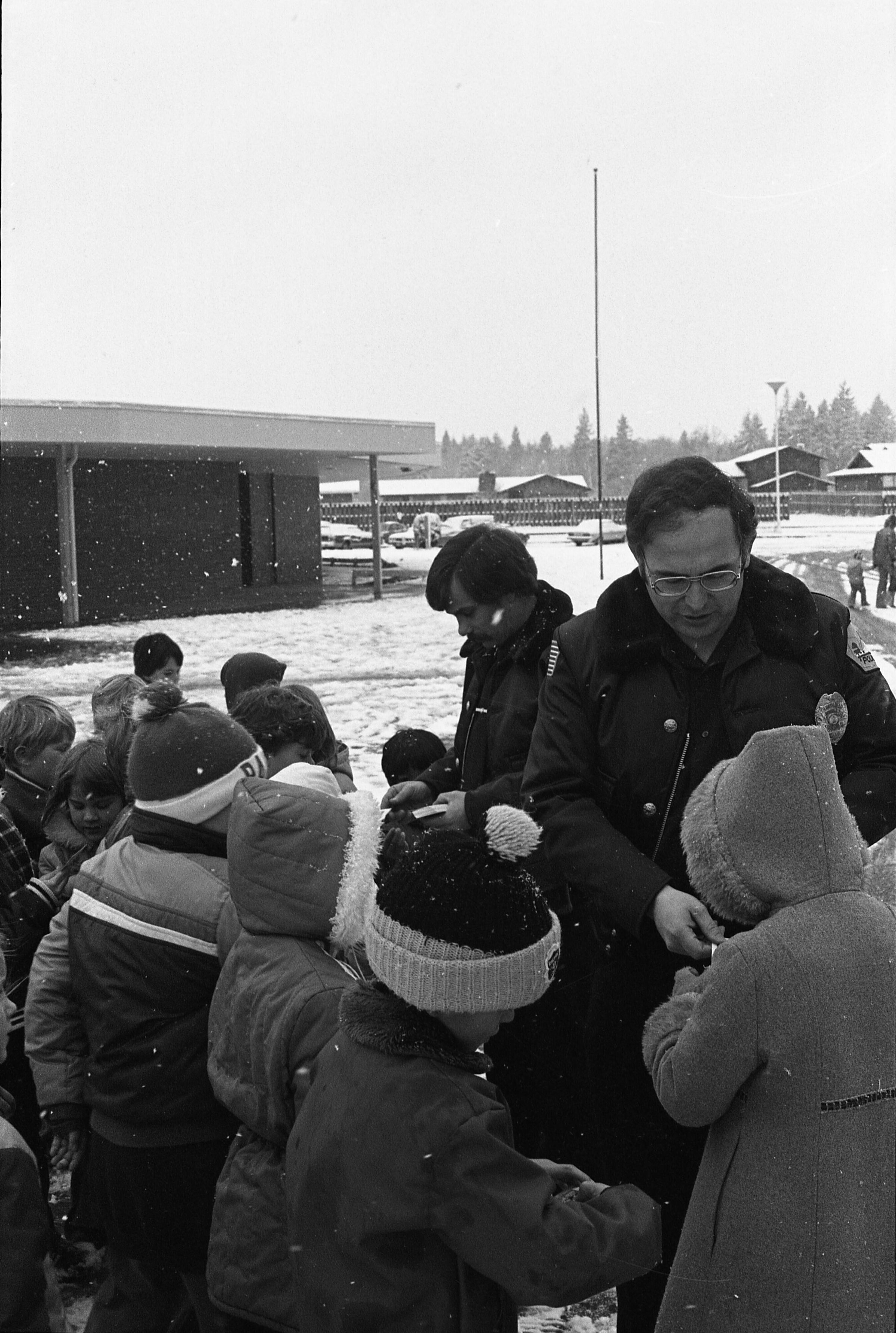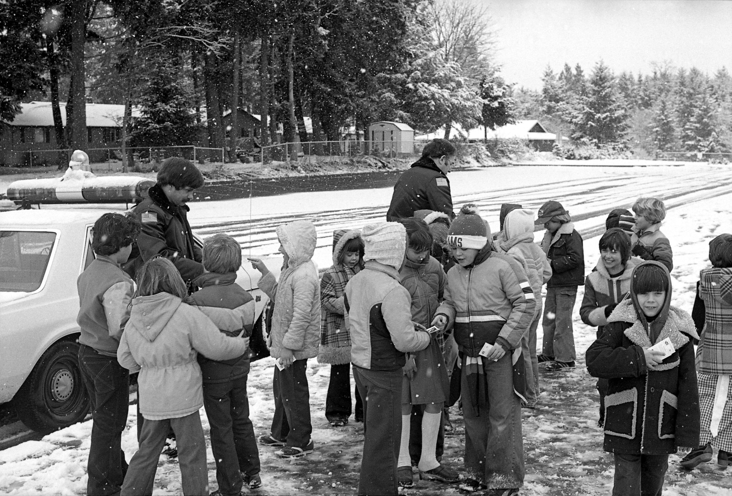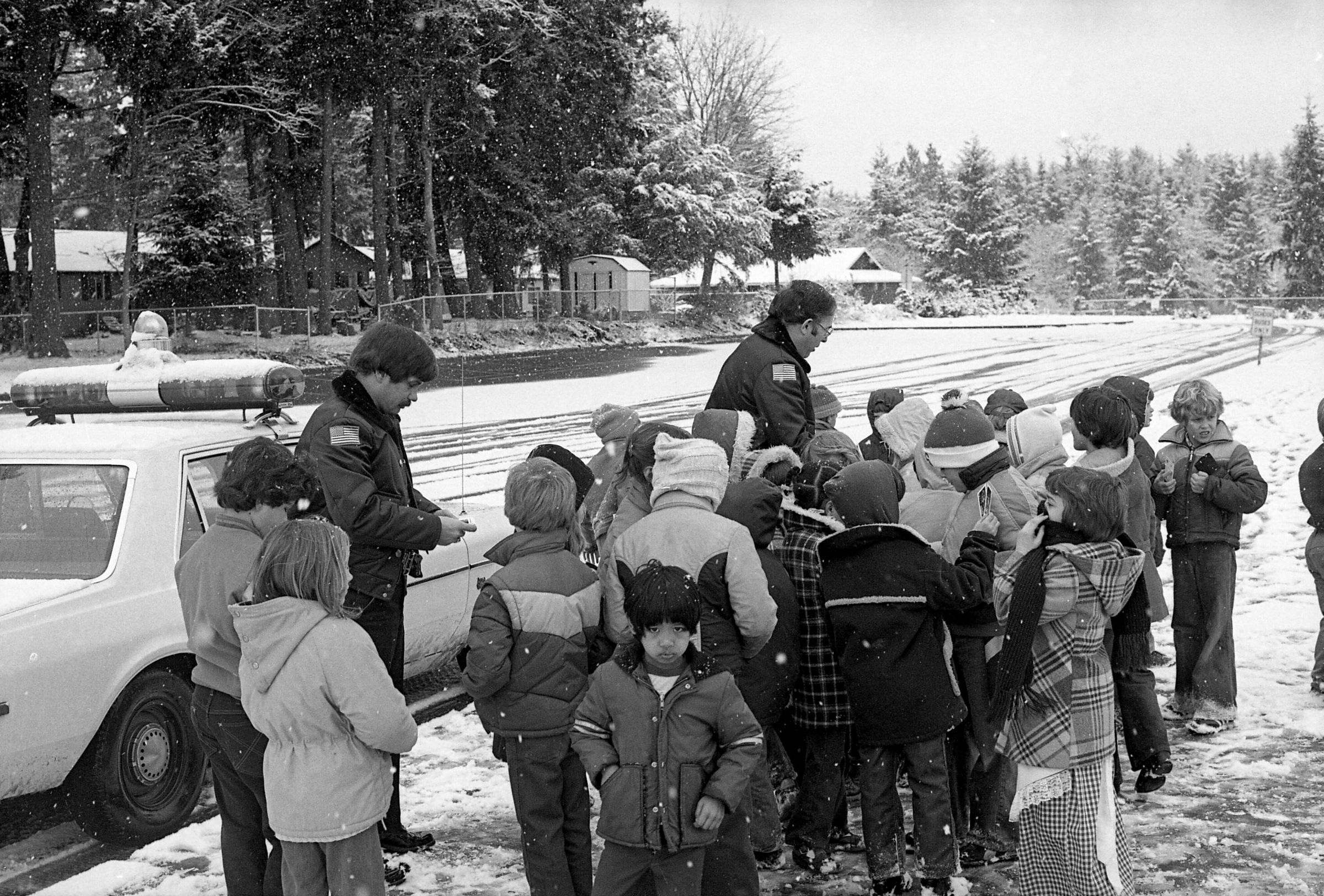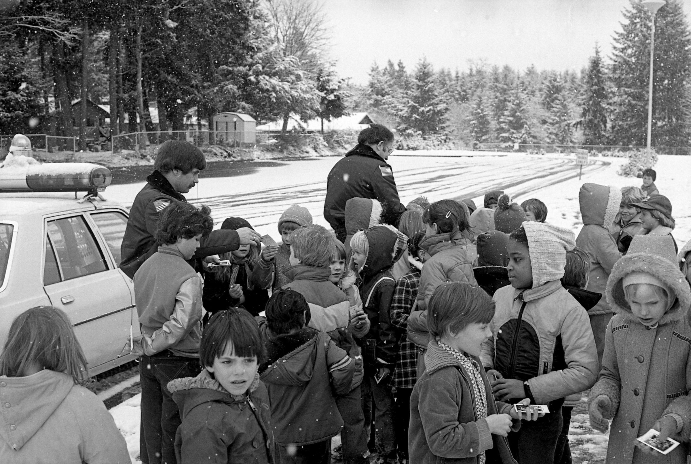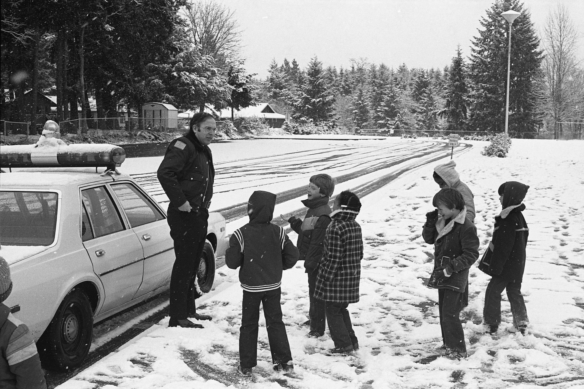 Tom Nelson and Dave Johnson at Lacey Elementary, Unknown Date. These two black and white film negative strips were created for the Lacey Leader newspaper. These images show two police officers giving out tickets to a Seattle Supersonics basketball game to students at Lacey Elementary.Made/Created