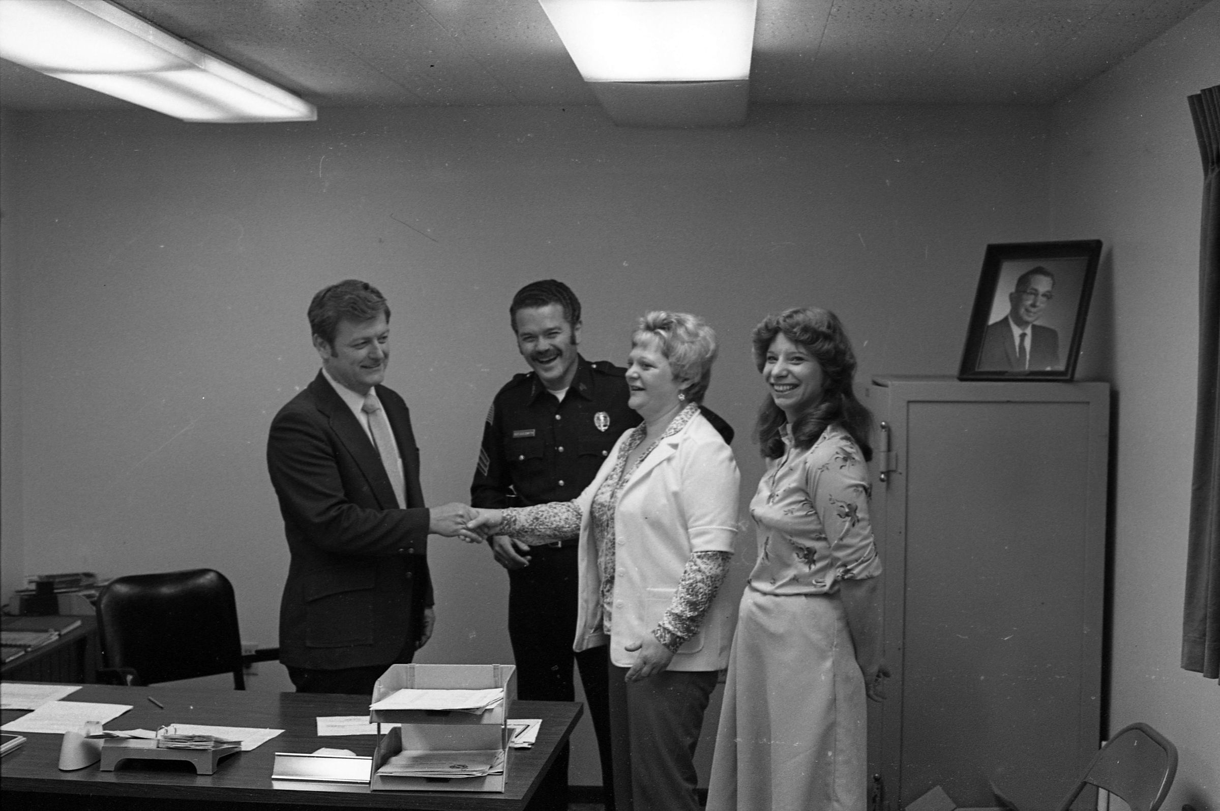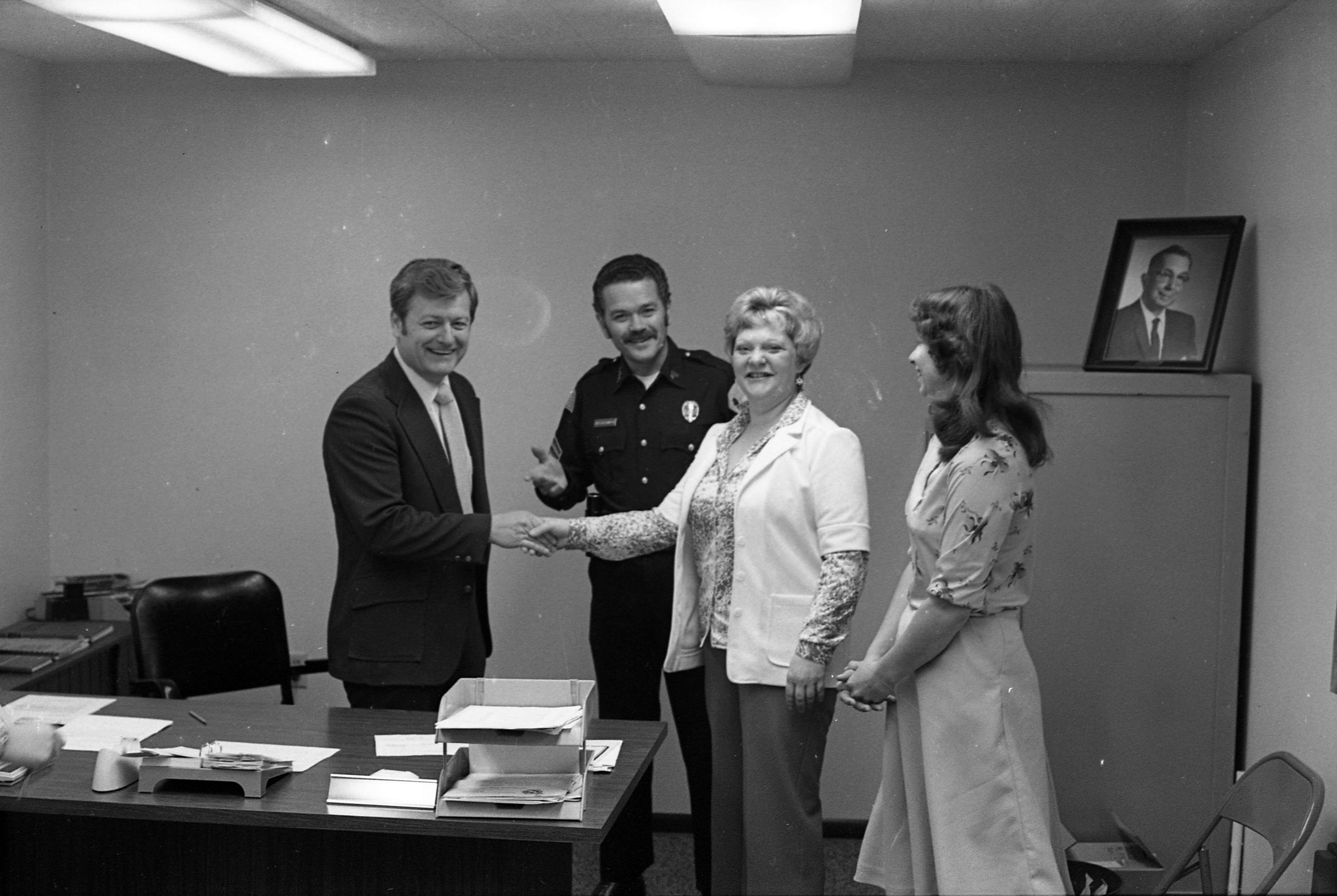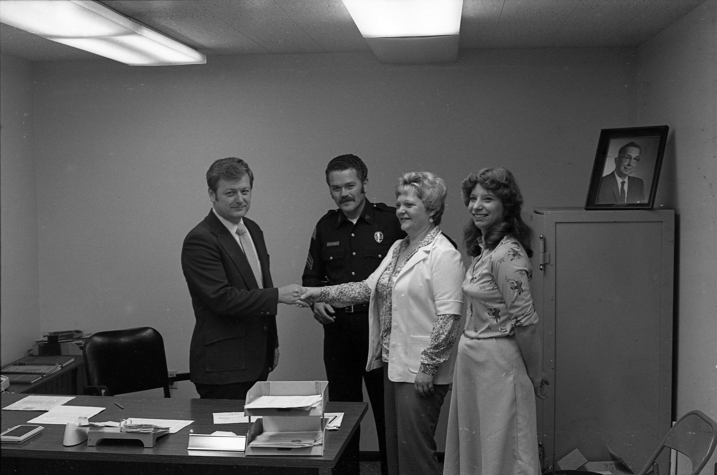 John Mansfield, Lacey Police Chief, Unknown Date. These two black and white film negative strips were created for the Lacey Leader newspaper. These images show a man (John Mansfield) posing individually, with a man in a police uniform, and with two women.Made/Created