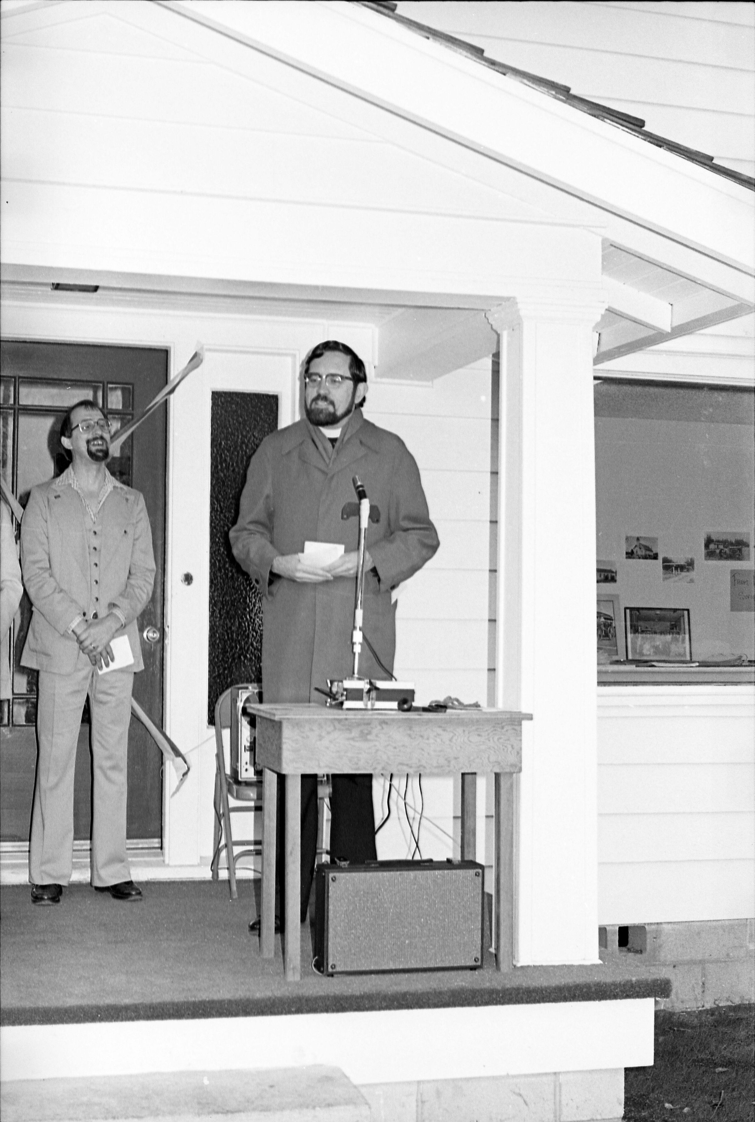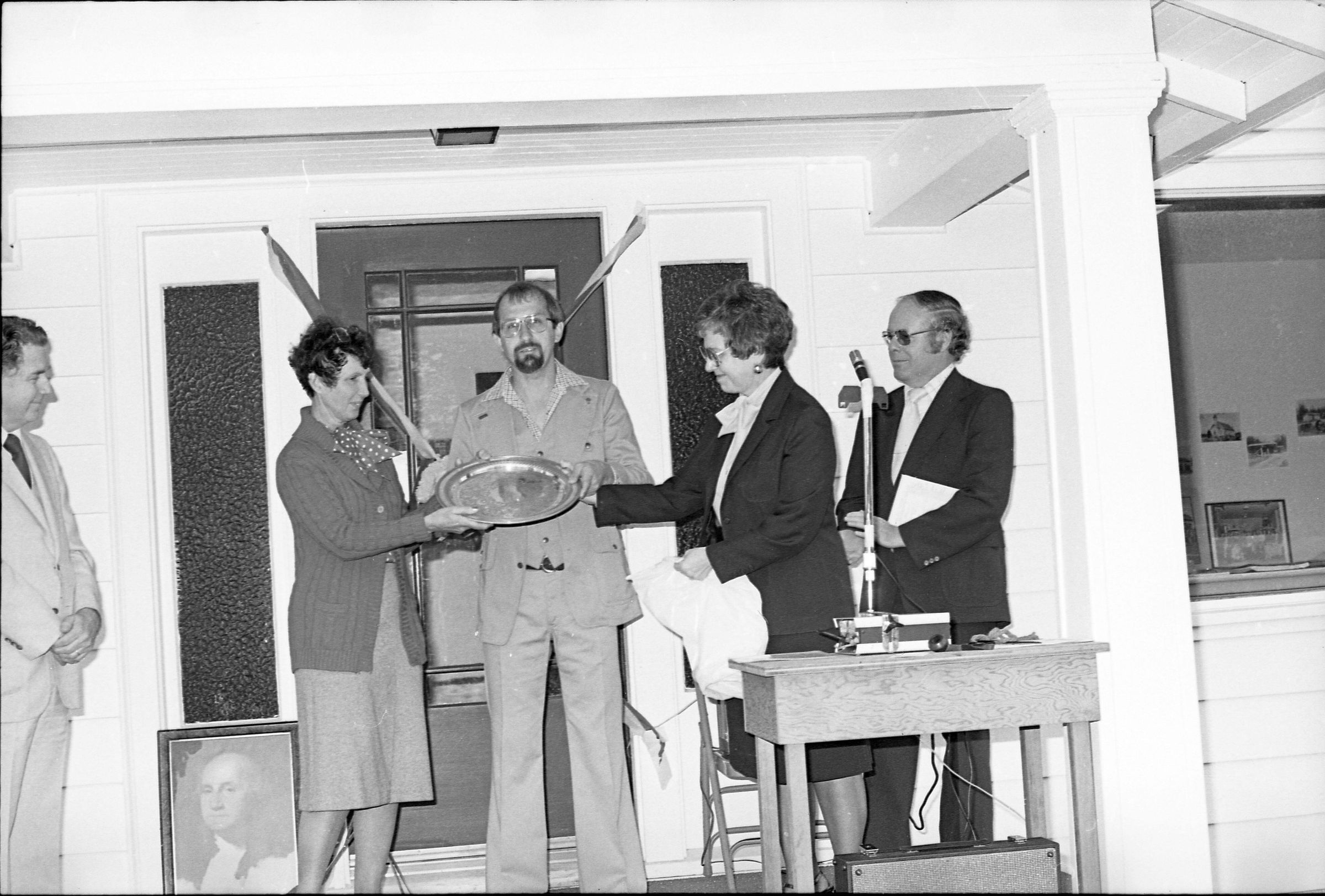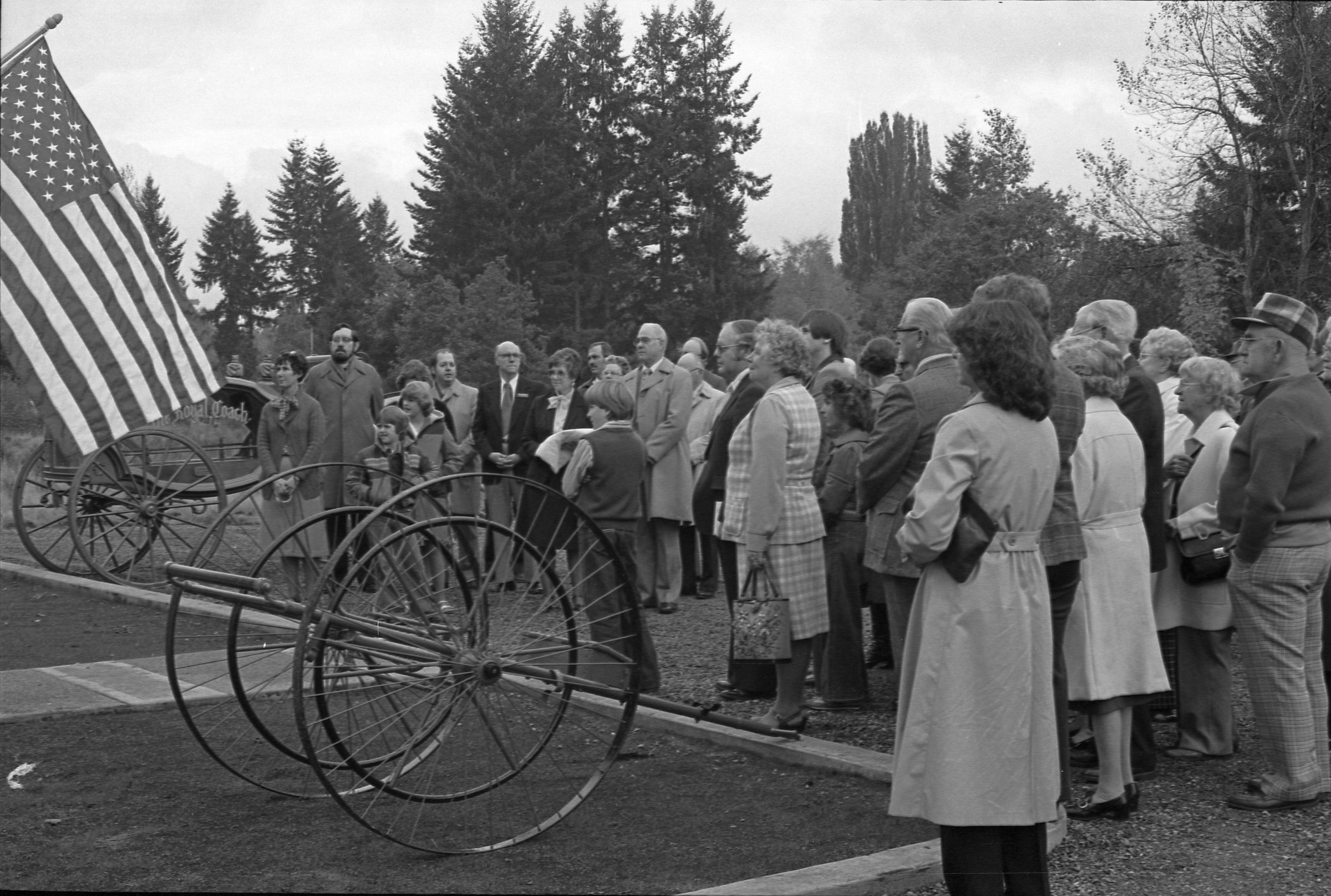 Unknown Event, Unknown Date. This single black and white film negative strip was created for the Lacey Leader newspaper. These images show a small crowd gathered near a wheeled object and several people standing on the porch of the Lacey Museum.Made/Created