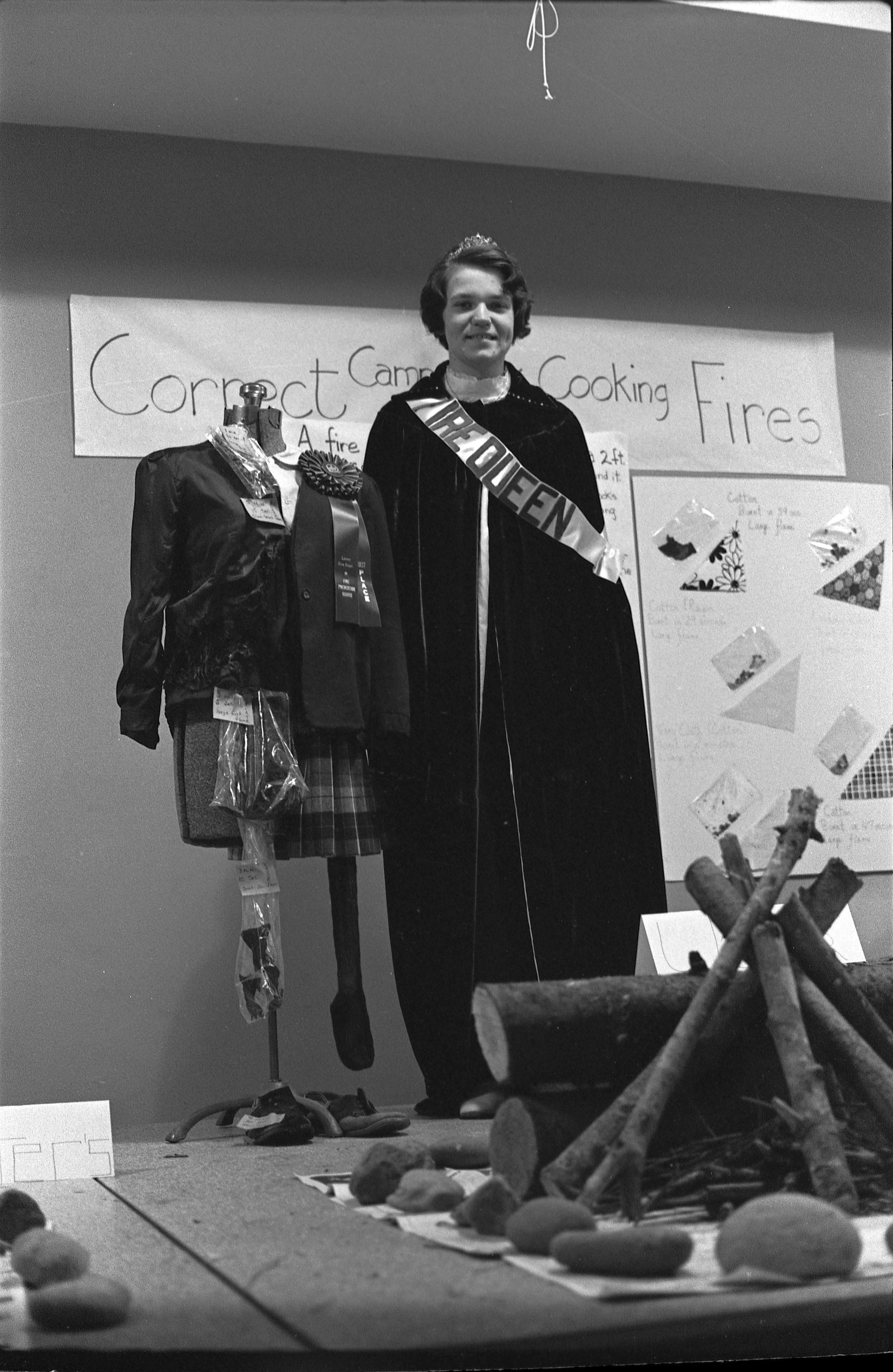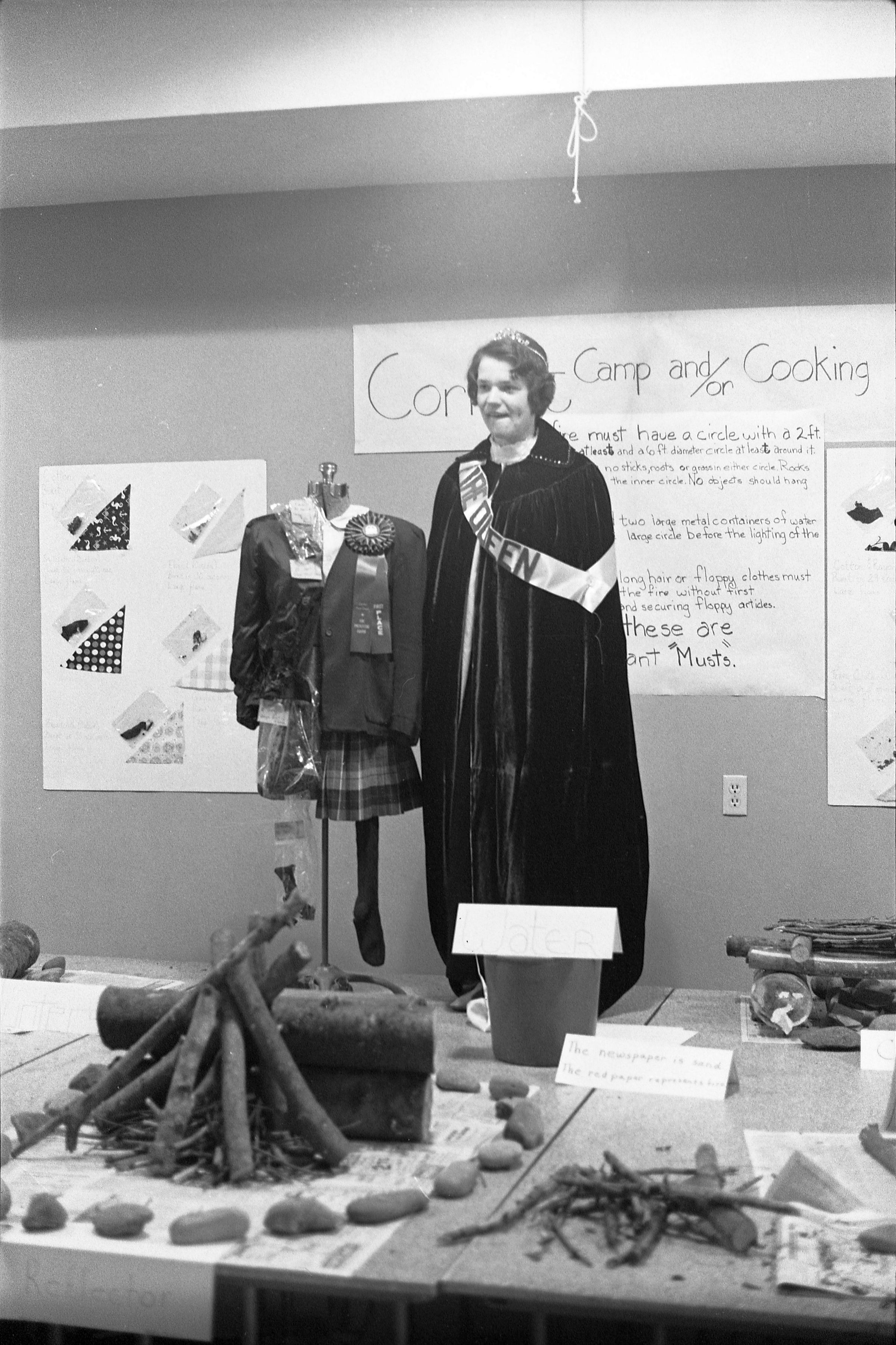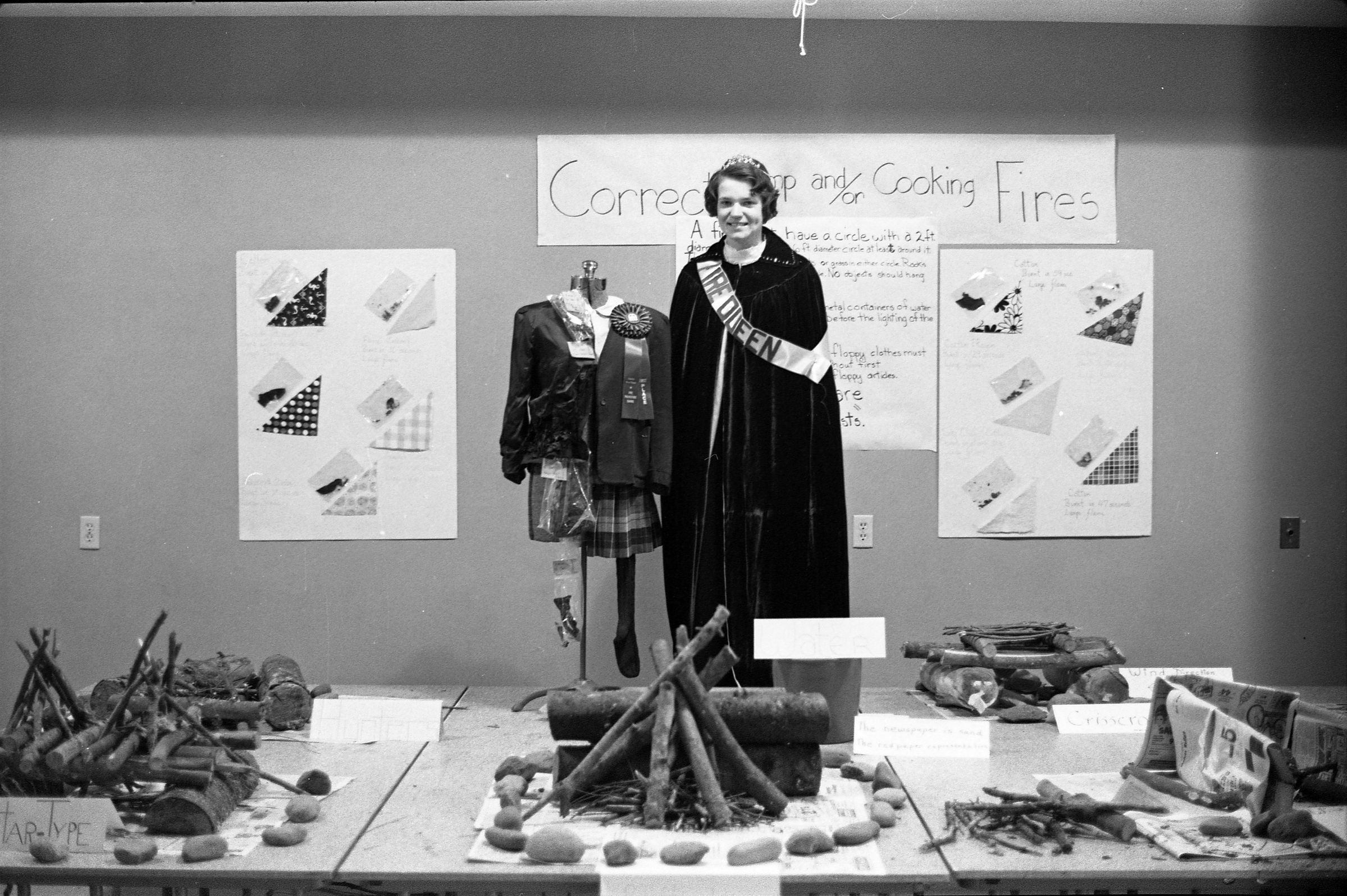 Fire Prevention Queen, 10-18-1972. This black and white negative strip was created for the Lacey Leader newspaper. All three images of are the same woman. She is wearing a floor-length robe and crown. There is a sash over the robe which reads "Fire Queen". She has been posed in the middle of a diorama of various types of campfires. A sign behind her head reads "Correct Camp and/or Cooking Fires". Next to her is a dress-form with uniforms two different uniforms on it.Made/Created