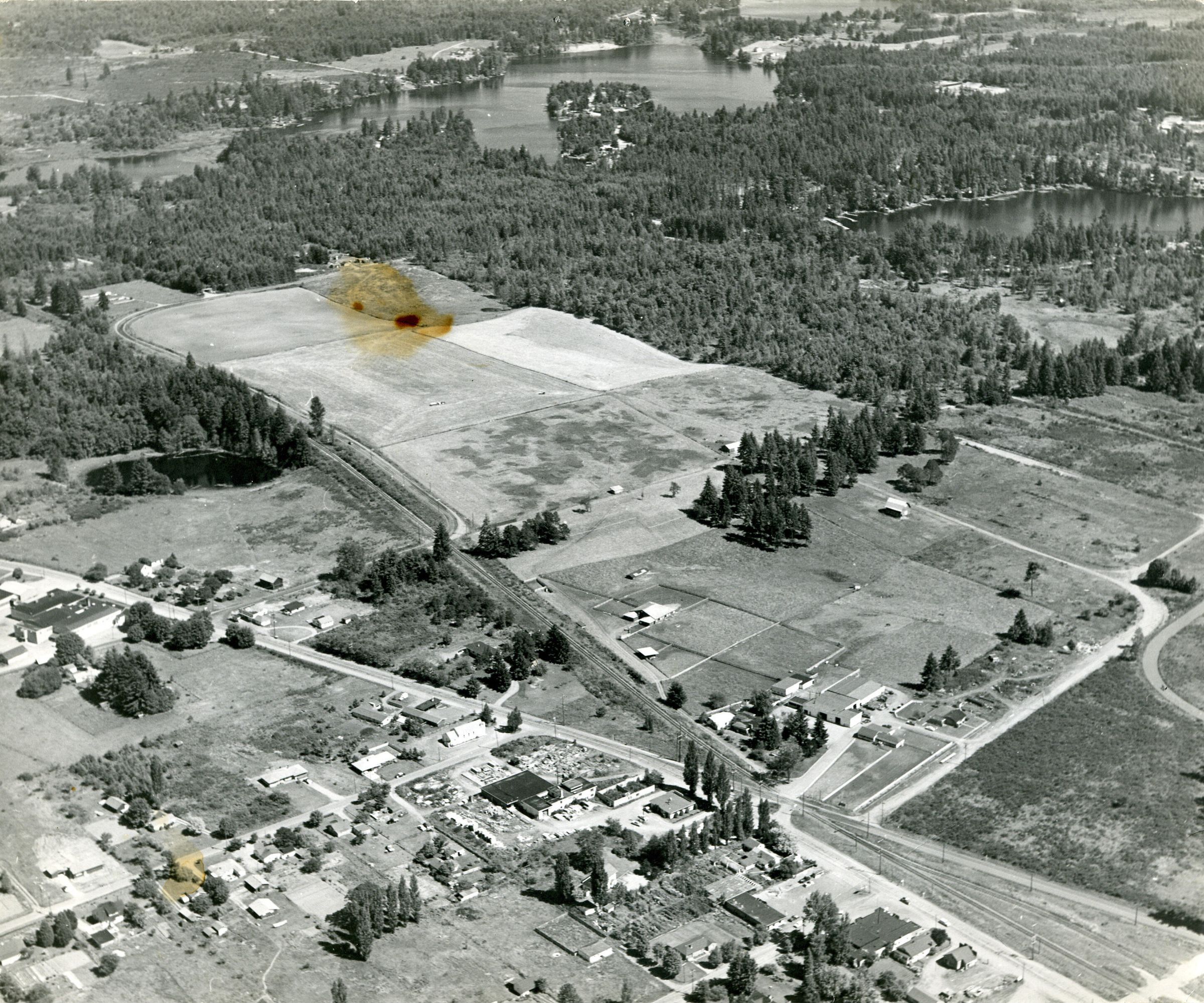 Black and white aerial photograph (scanned copy) of Carpenter Road, looking southeast over Lacey. As of 2021, the is where the North Thurston Public School Bus Barn is located. The railroad runs diagonally through this image and Pacific Avenue along the bottom. At the top of the photo is Long Lake and Hicks Lake to the right. At the bottom is A. G. Homann Construction and the Fire Hall.Made/Created