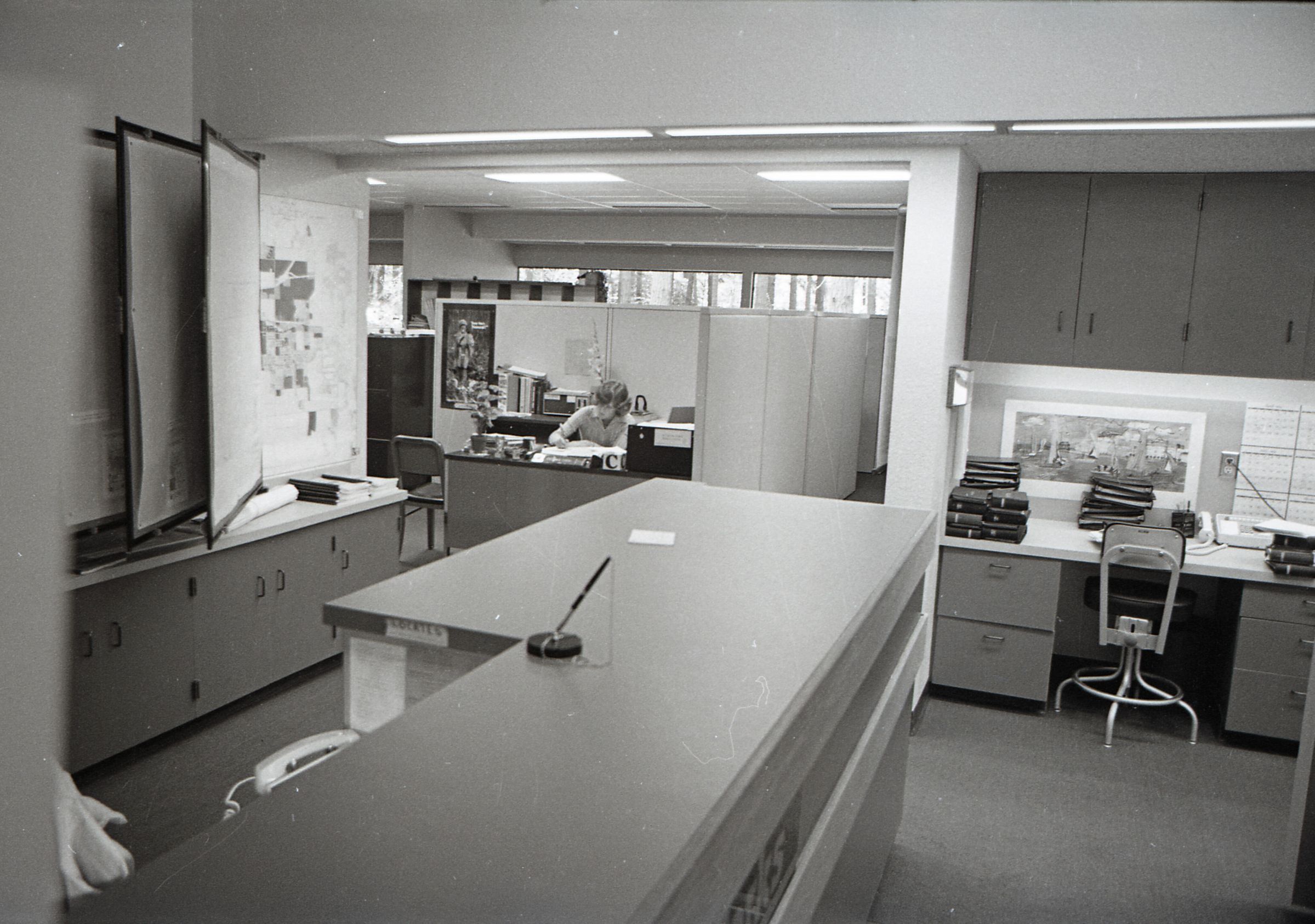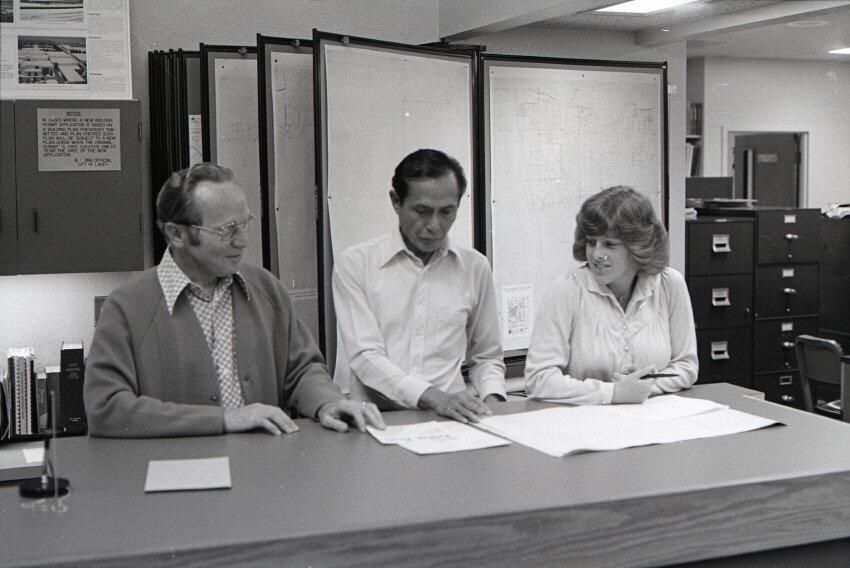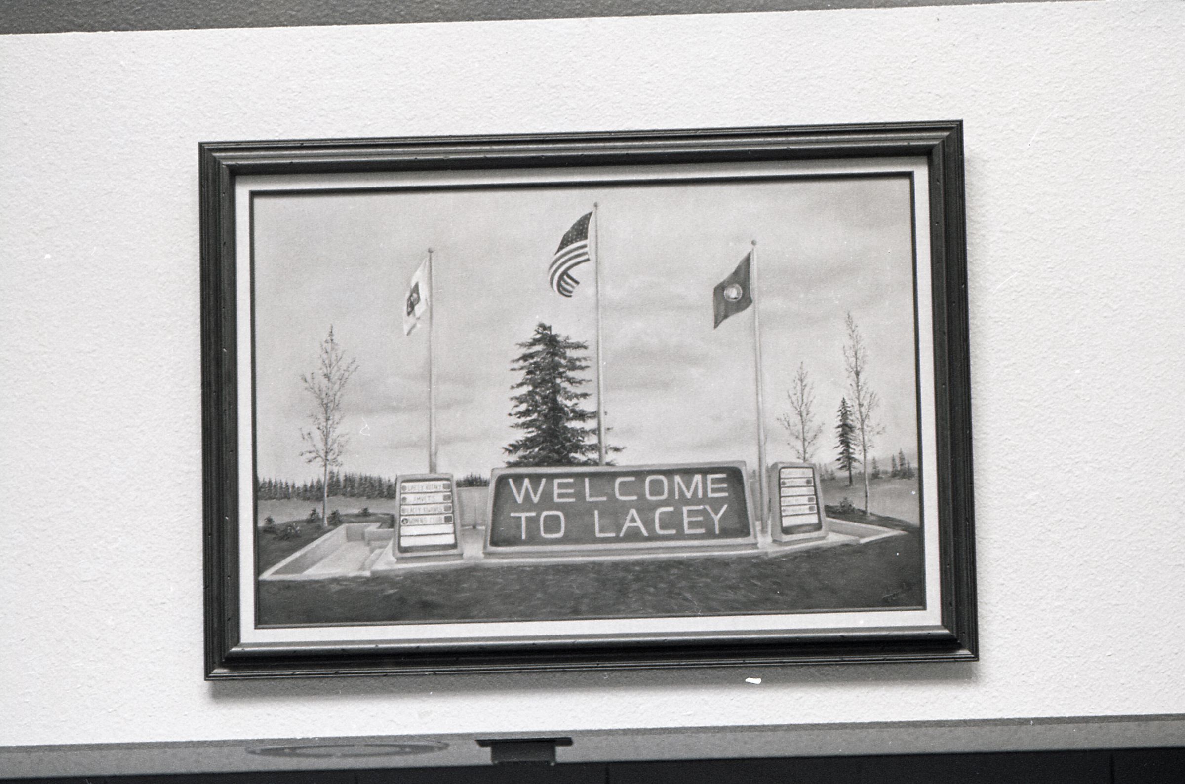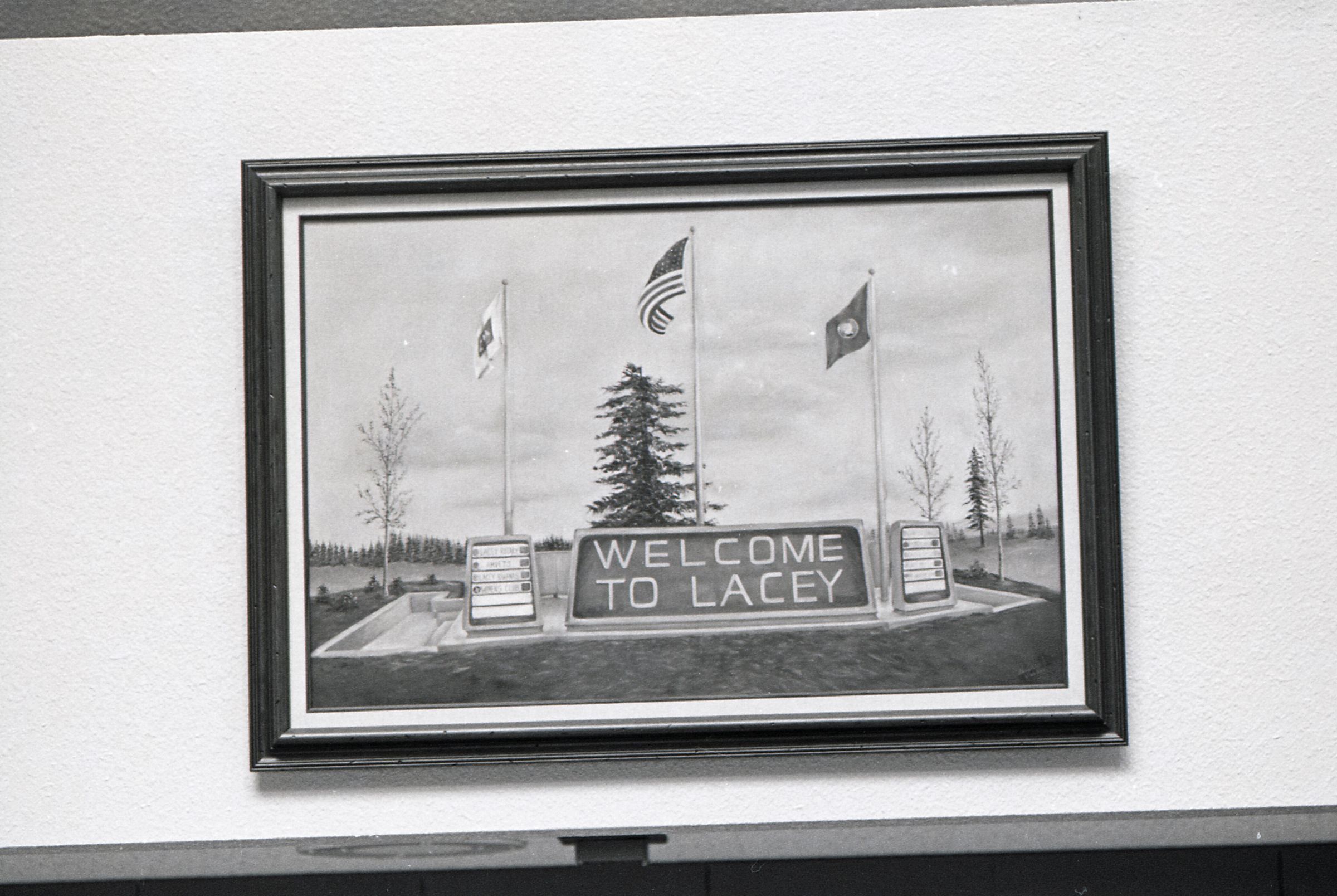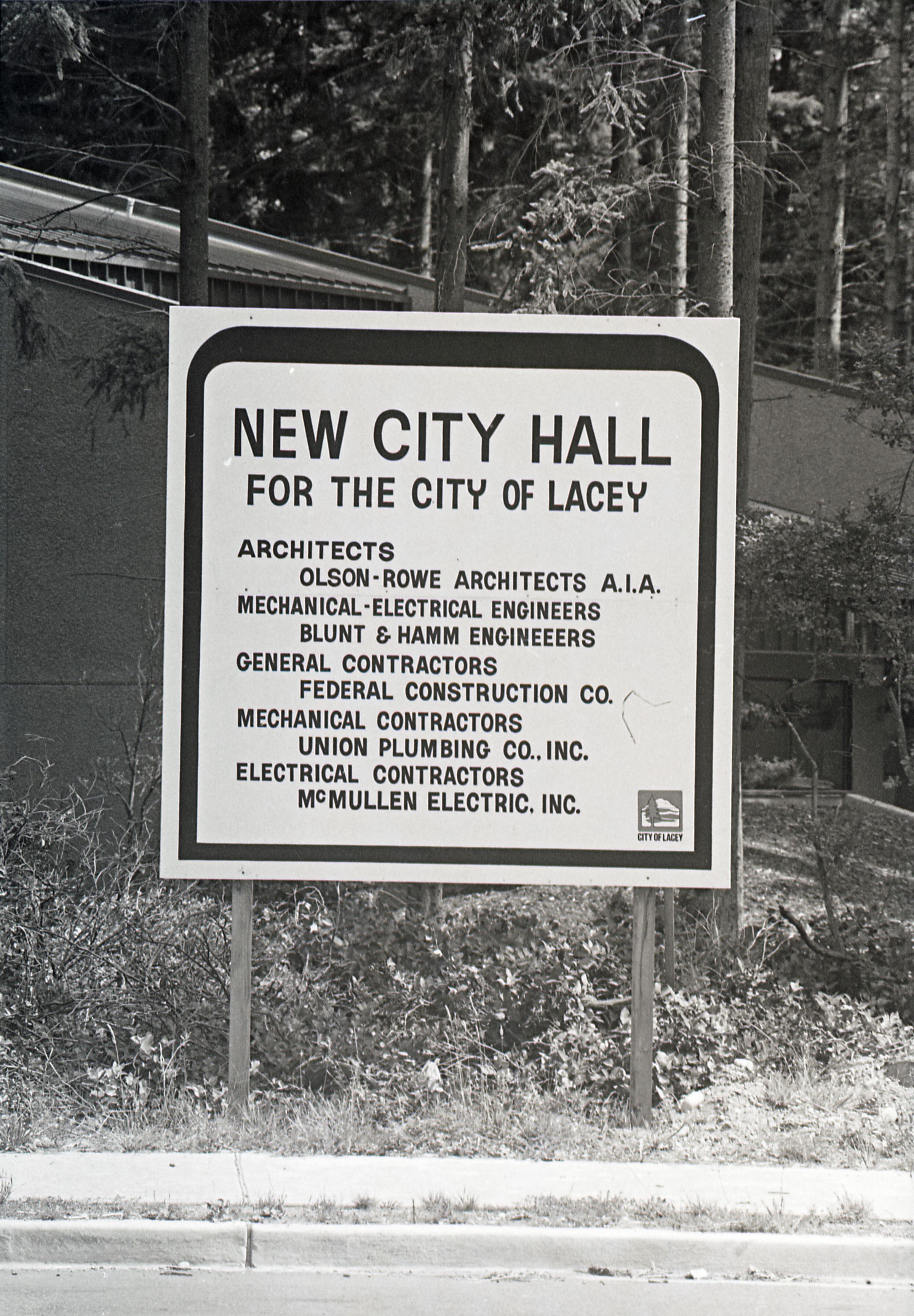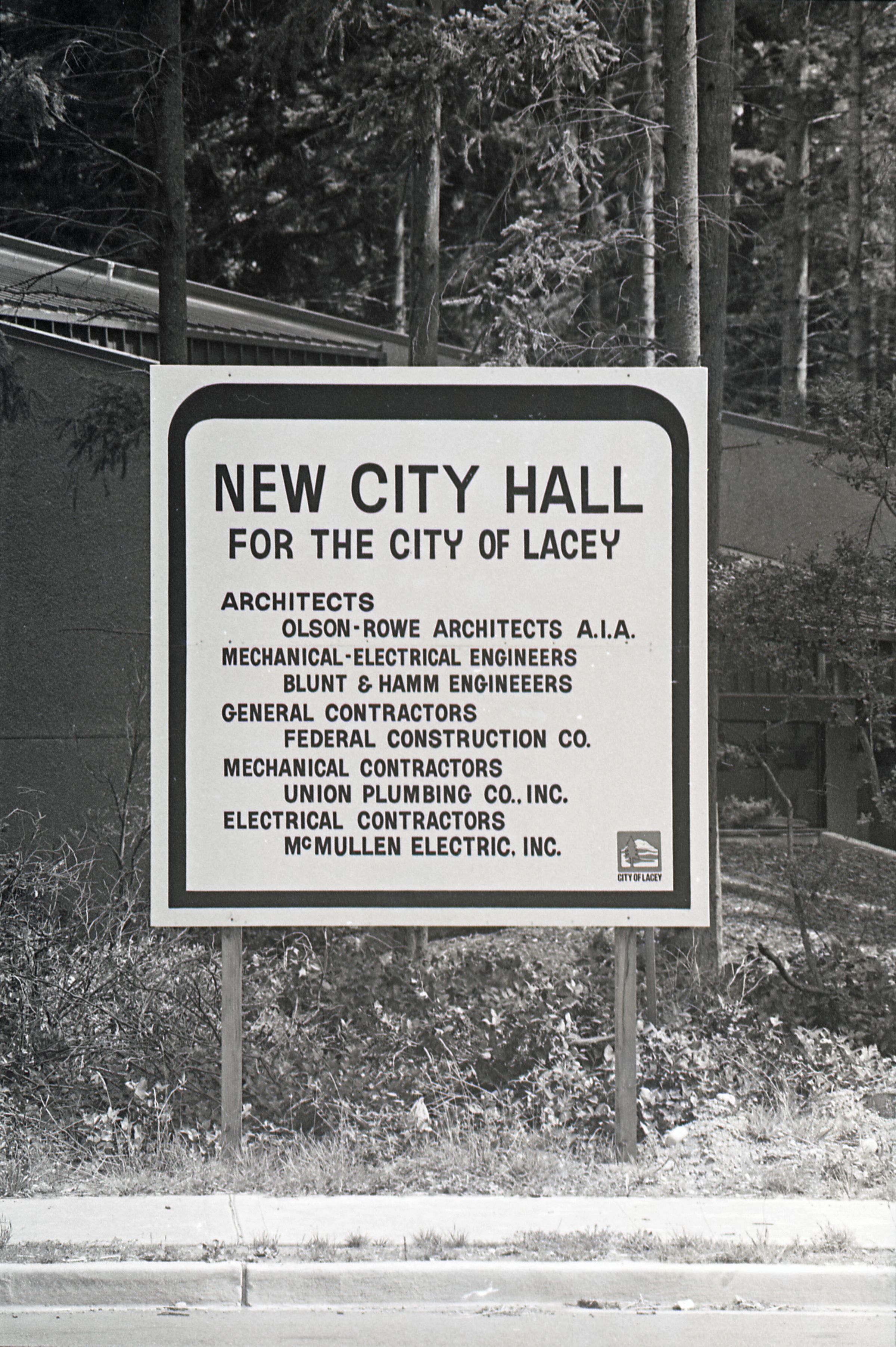 Lacey City Hall and City Council Members, 1979. These twelve black and white film negative strips were created for the Lacey Leader newspaper. These images were created using three separate film rolls, so some of the physical numbers on the strips are repeated. For the purposes of this description, these strips will be grouped according to the film roll from which they originally came. Each group will be assigned a lower-case letter to go along with the physical numbers on the strips (ex: 1a, 2a, 3a, 1b, 2b, 3b, etc.) to help differentiate between images. The images of city hall within this sleeve show the Lacey city hall building completed in 1979. That building is now (as of 2019) the Lacey Police Department section of the current city hall building.