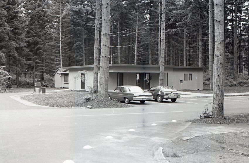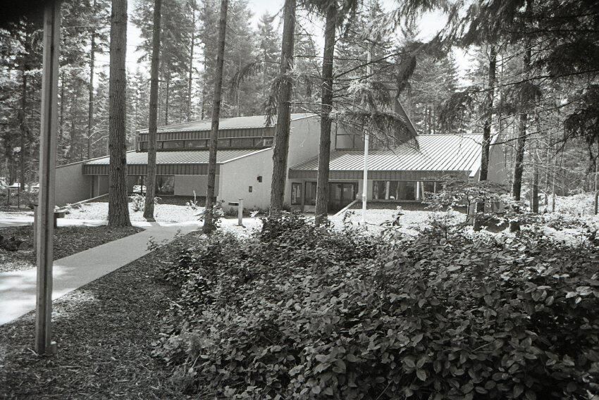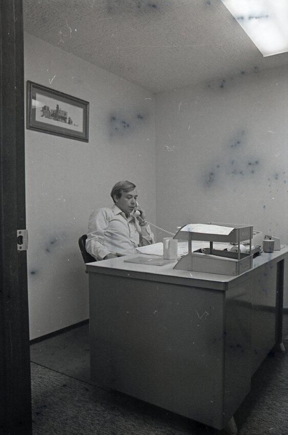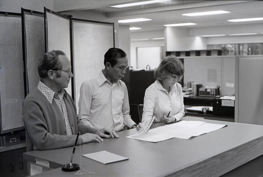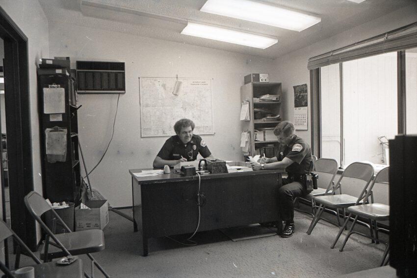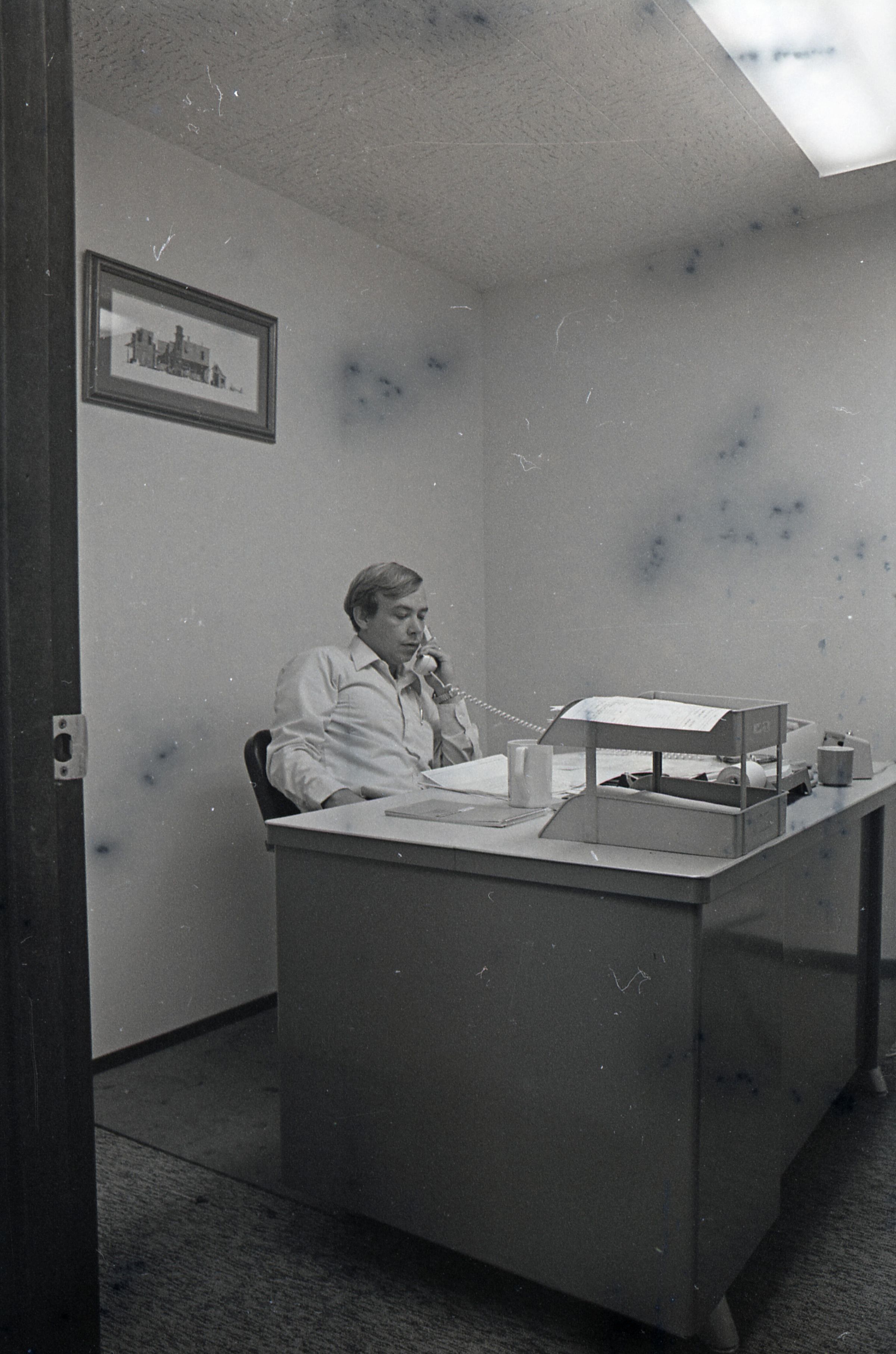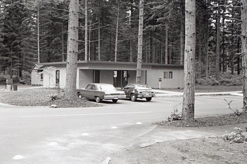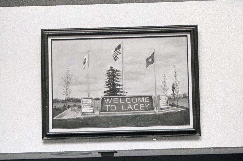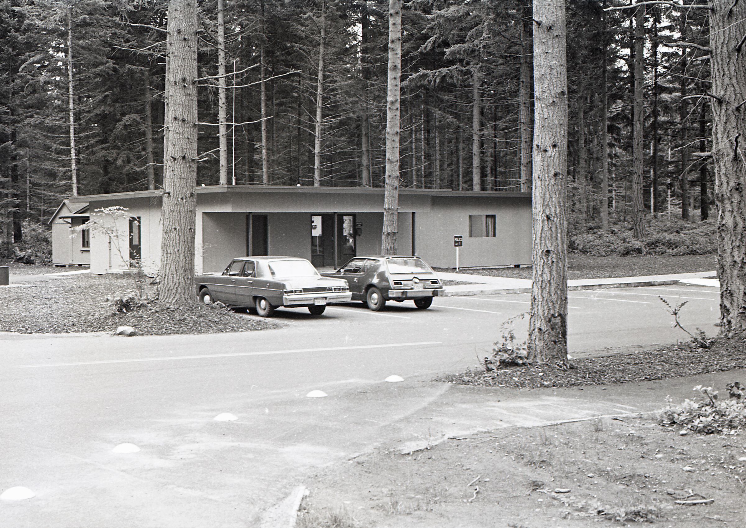 Lacey City Hall and City Council Members, 1979. These twelve black and white film negative strips were created for the Lacey Leader newspaper. These images were created using three separate film rolls, so some of the physical numbers on the strips are repeated. For the purposes of this description, these strips will be grouped according to the film roll from which they originally came. Each group will be assigned a lower-case letter to go along with the physical numbers on the strips (ex: 1a, 2a, 3a, 1b, 2b, 3b, etc.) to help differentiate between images. The images of city hall within this sleeve show the Lacey city hall building completed in 1979. That building is now (as of 2019) the Lacey Police Department section of the current city hall building.