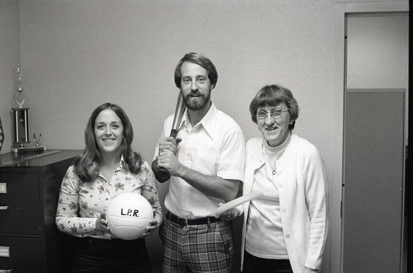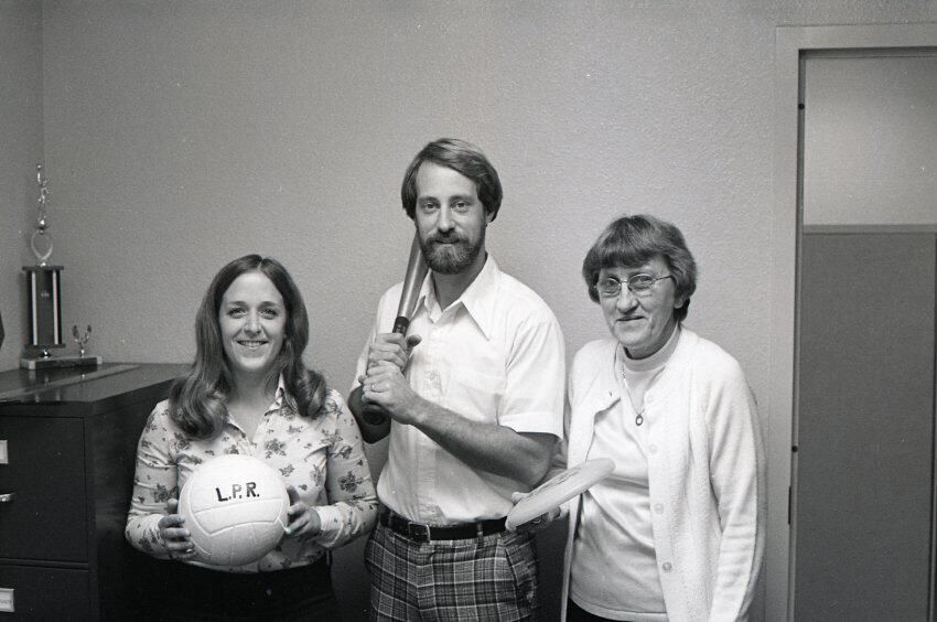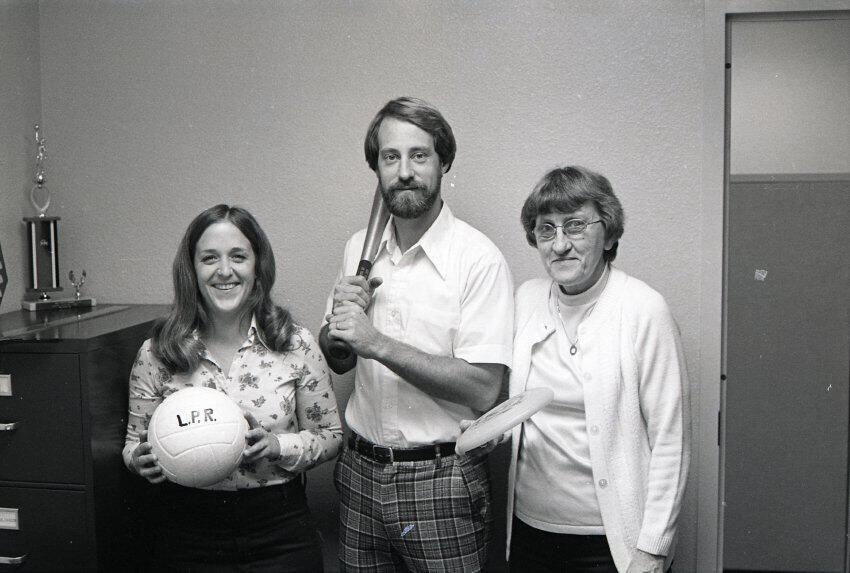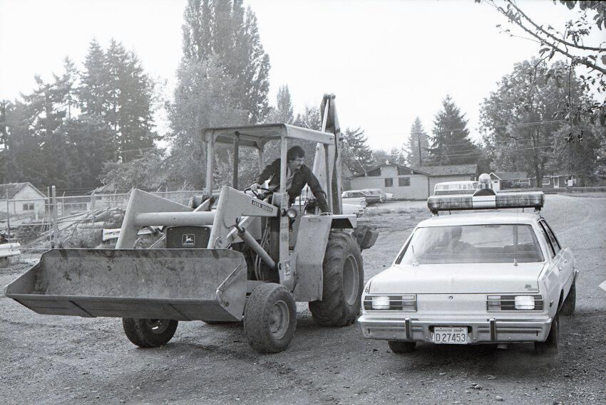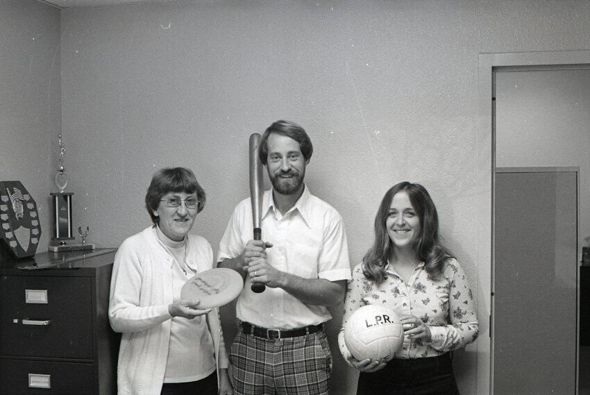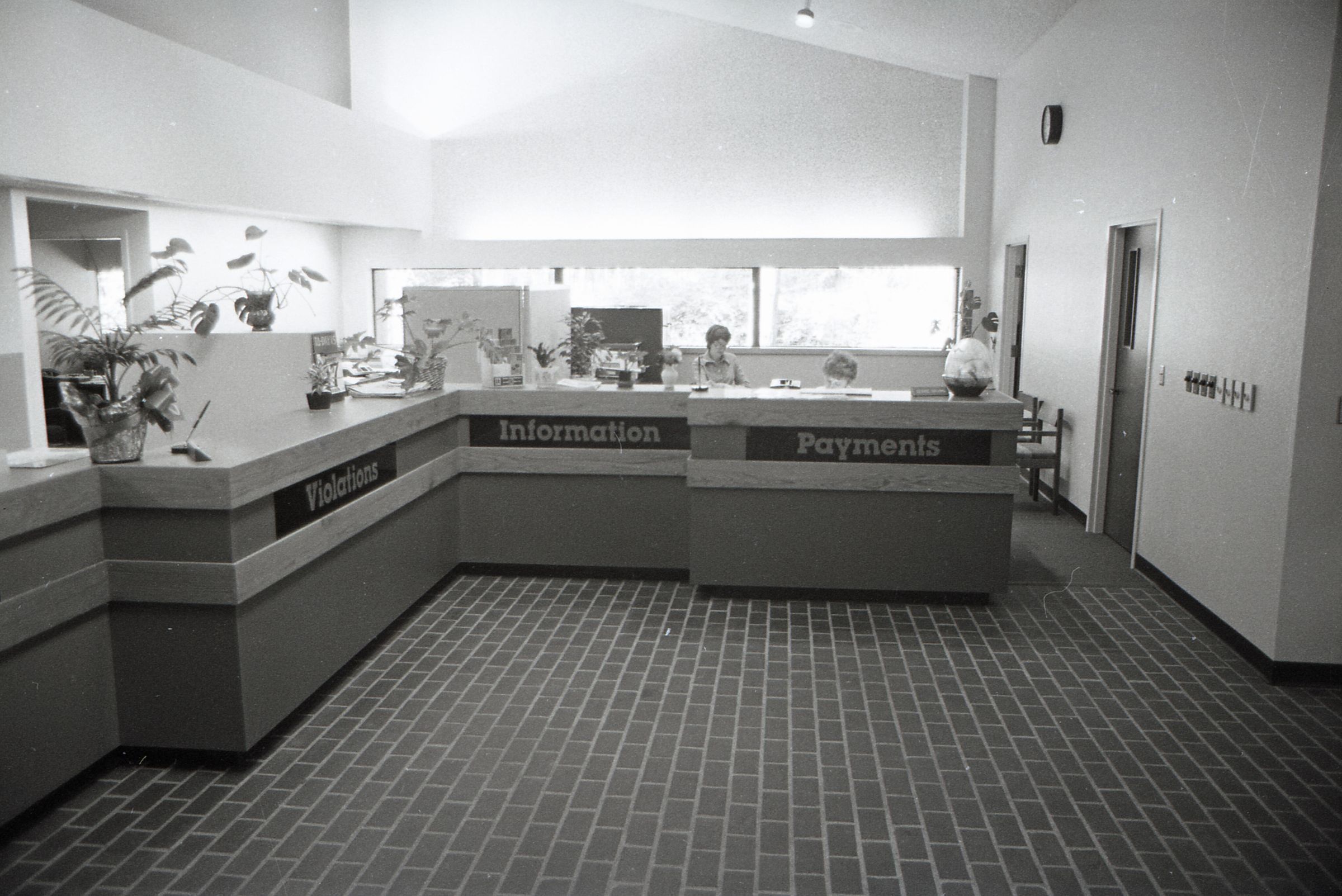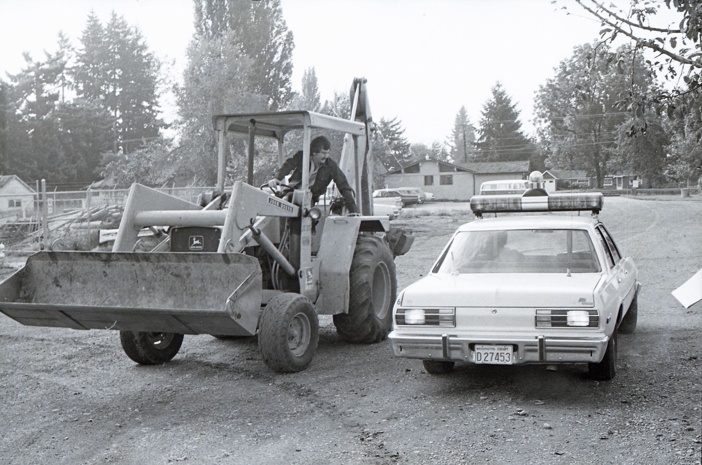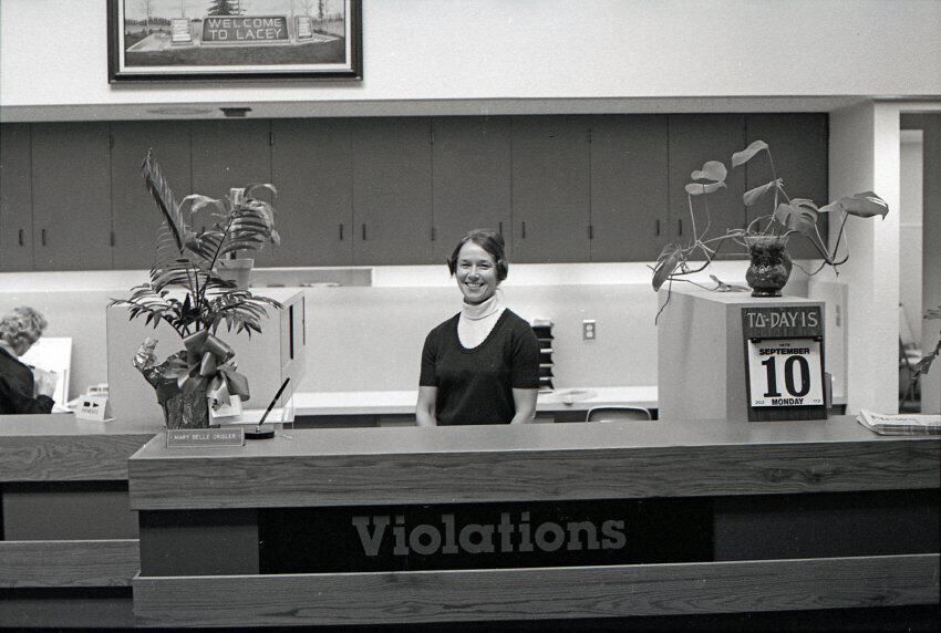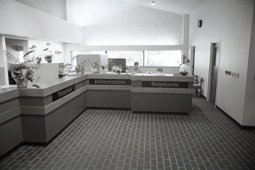 The images in group "a" show Lacey city employees, Lacey City Council members, a small building, and a backhoe. Image 11a shows two men and one woman standing at a service desk in the city hall. Image 12a is effectively identical to the previous image. Image 13a shows a woman standing behind a desk with a sign on the front which reads "Violations." Image 14a is nearly identical to the previous image. Image 15a shows a woman standing behind a service desk with a sign on the front which reads "Payments." Image 16a is nearly identical to the previous image. Image 17a shows a woman standing behind a service desk which reads "Utilities." Image 18a is nearly identical to the previous image. Image 19a shows (l to r) Pat Clark, Jim "J. D." Fouts, and Carol (last name unknown) posing for a photo. Pat is holding a frisbee, J. D. is holding a baseball bat, and Carol is holding a basketball with "LPR" (presumably standing for "Lacey Parks and Recreation") written on it. Images 20a and 21a are nearly identical to image 19a. Image 32a shows a small, single-story building which was a temporary city structure situated in the parking lot near the new City Hall building. Two cars are parked in front of the building. Images 33a and 34a are nearly identical to image 32a. Image 37a is very similar to images 19a through 21a, but here Carol is on the left-hand side of the image and Pat Clark is on the right. Images 38a and 39a are nearly identical to image 37a. Images 40a and 41a show a framed painting of Lacey Civic Plaza (this painting is now in the museum collection). Image 42a shows Bob Williams seated at his desk. Bernie Main and a man are standing on the left-hand side of the image. Images 43a and 44a are nearly identical to image 42a. Image 1a shows a backhoe parked next to a police cruiser. Image 2a is nearly identical to the previous image. Image 3a shows the backhoe and police car from a different angle. Image 4a and 5a show a City of Lacey maintenance employee loosening or tightening a lug nut on a backhoe with an air wrench. Two other employees are standing behind him.