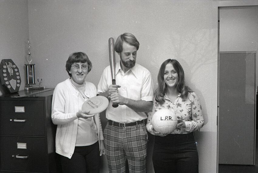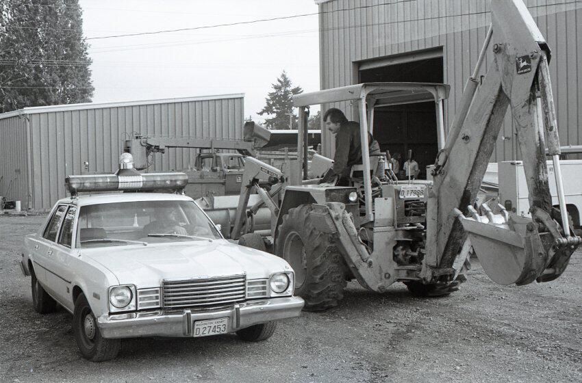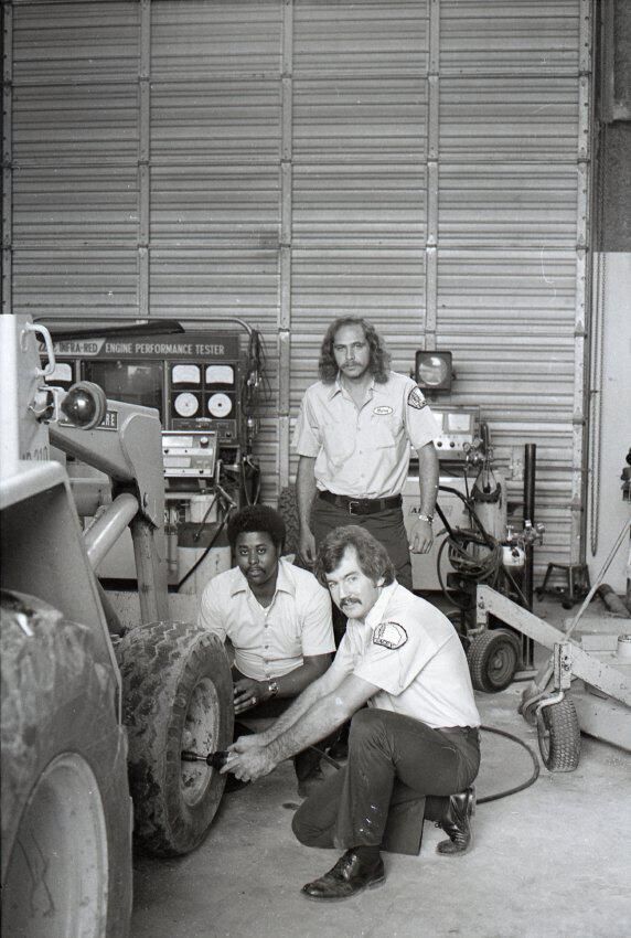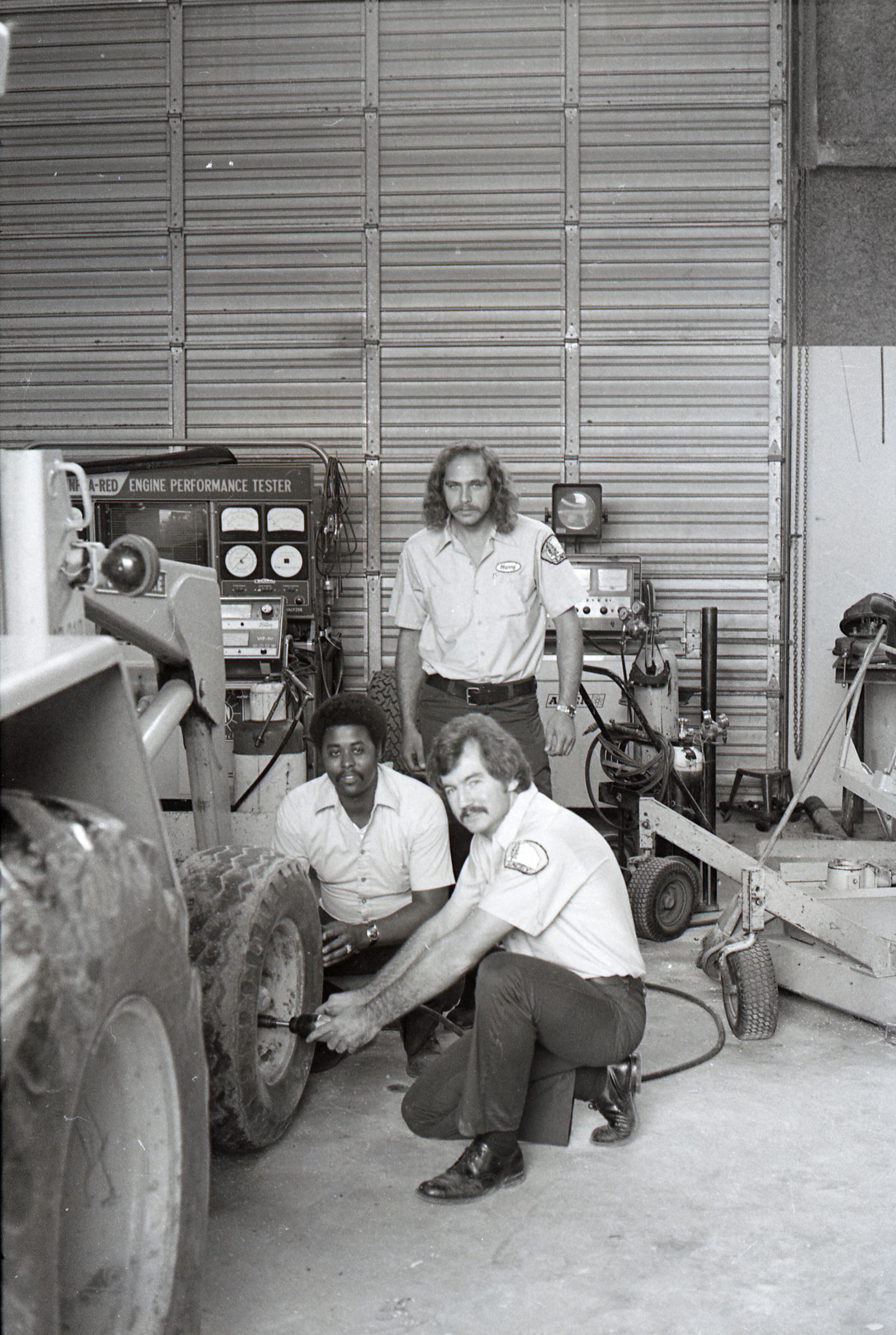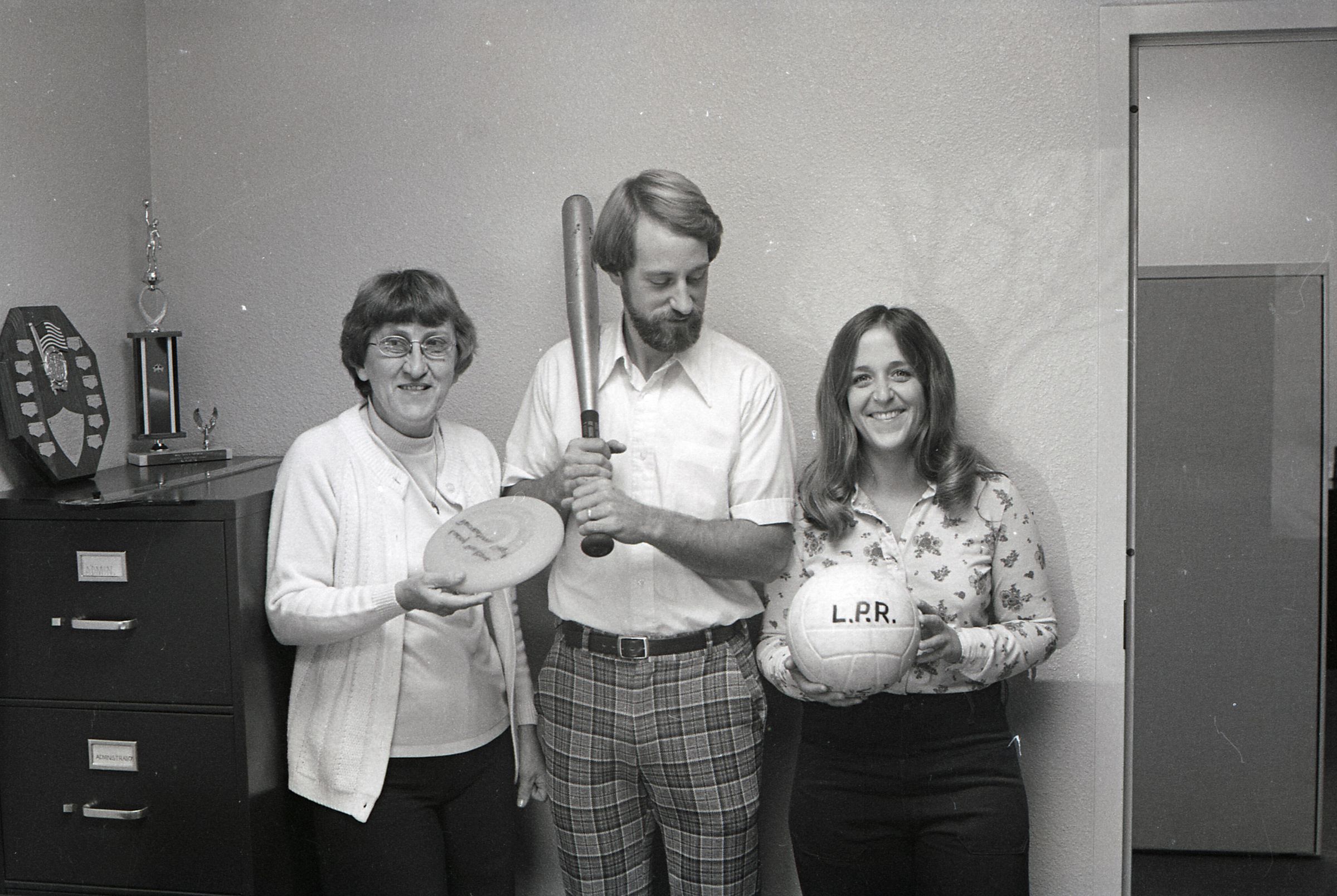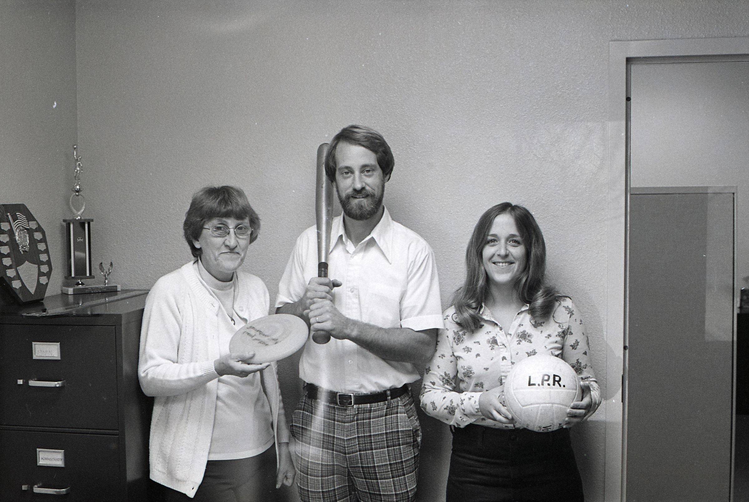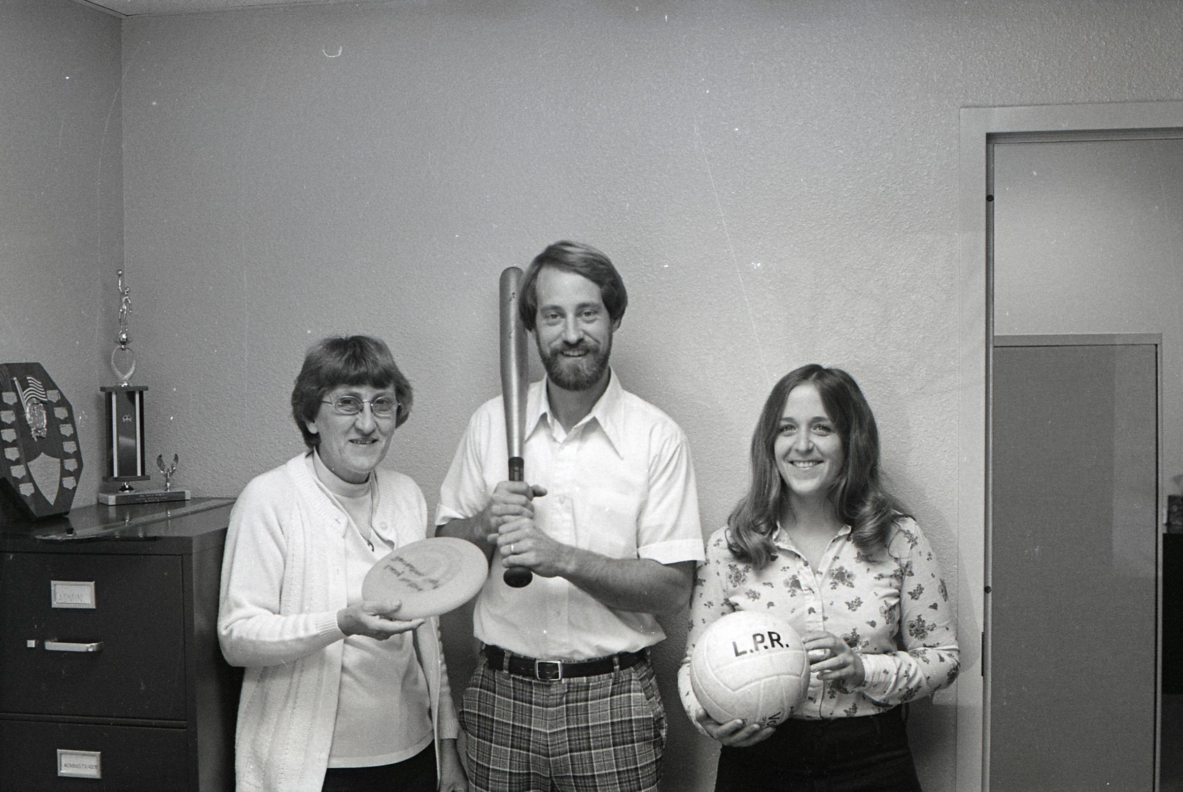 The images in group "a" show Lacey city employees, Lacey City Council members, a small building, and a backhoe. Image 11a shows two men and one woman standing at a service desk in the city hall. Image 12a is effectively identical to the previous image. Image 13a shows a woman standing behind a desk with a sign on the front which reads "Violations." Image 14a is nearly identical to the previous image. Image 15a shows a woman standing behind a service desk with a sign on the front which reads "Payments." Image 16a is nearly identical to the previous image. Image 17a shows a woman standing behind a service desk which reads "Utilities." Image 18a is nearly identical to the previous image. Image 19a shows (l to r) Pat Clark, Jim "J. D." Fouts, and Carol (last name unknown) posing for a photo. Pat is holding a frisbee, J. D. is holding a baseball bat, and Carol is holding a basketball with "LPR" (presumably standing for "Lacey Parks and Recreation") written on it. Images 20a and 21a are nearly identical to image 19a. Image 32a shows a small, single-story building which was a temporary city structure situated in the parking lot near the new City Hall building. Two cars are parked in front of the building. Images 33a and 34a are nearly identical to image 32a. Image 37a is very similar to images 19a through 21a, but here Carol is on the left-hand side of the image and Pat Clark is on the right. Images 38a and 39a are nearly identical to image 37a. Images 40a and 41a show a framed painting of Lacey Civic Plaza (this painting is now in the museum collection). Image 42a shows Bob Williams seated at his desk. Bernie Main and a man are standing on the left-hand side of the image. Images 43a and 44a are nearly identical to image 42a. Image 1a shows a backhoe parked next to a police cruiser. Image 2a is nearly identical to the previous image. Image 3a shows the backhoe and police car from a different angle. Image 4a and 5a show a City of Lacey maintenance employee loosening or tightening a lug nut on a backhoe with an air wrench. Two other employees are standing behind him.